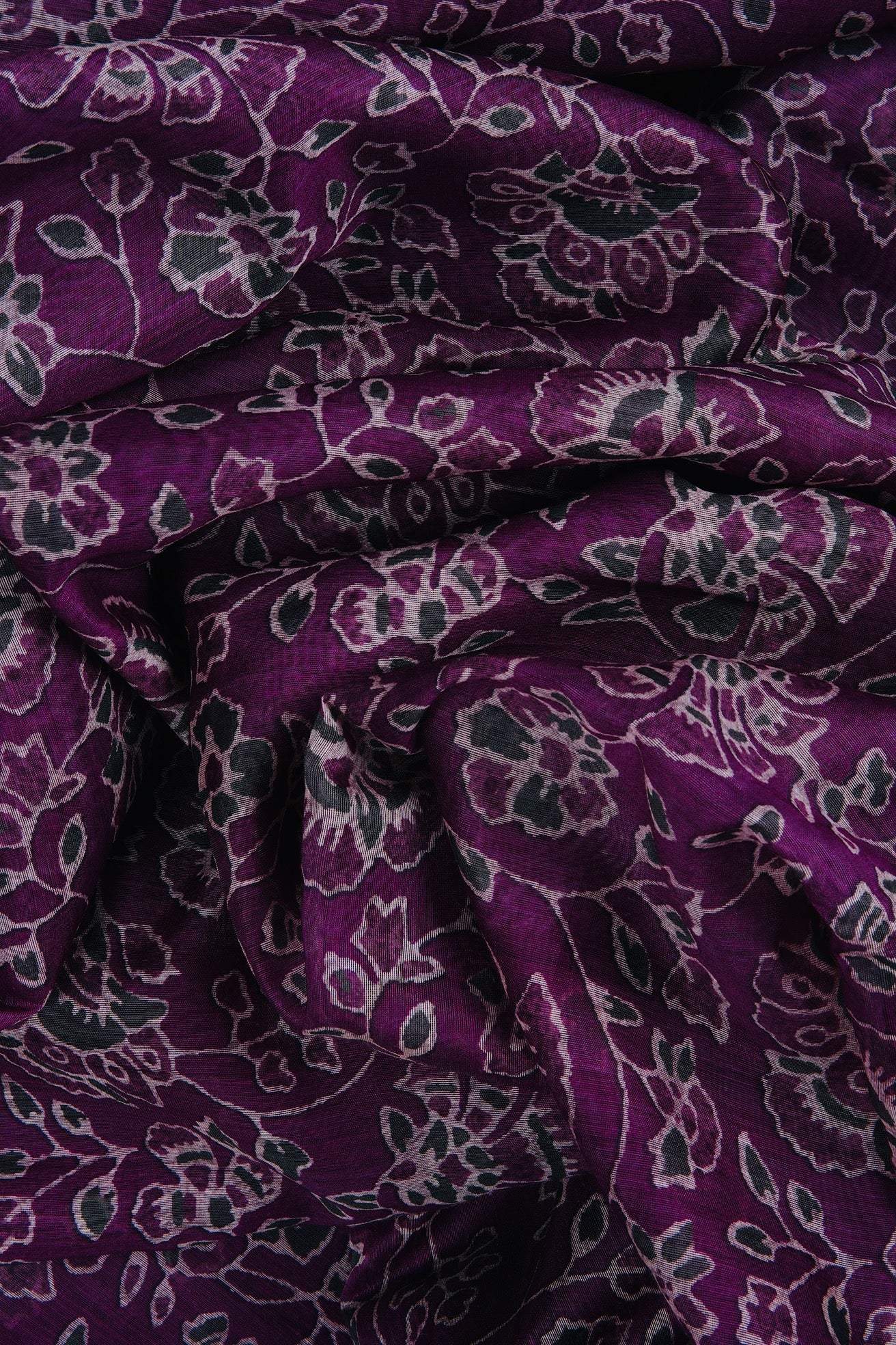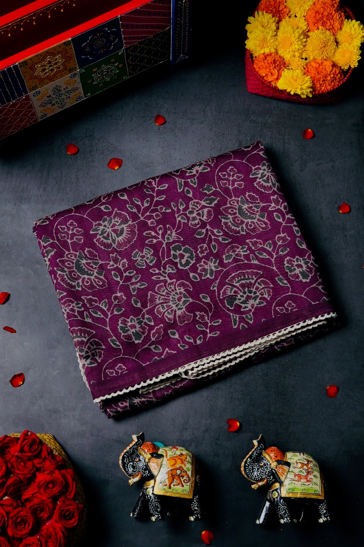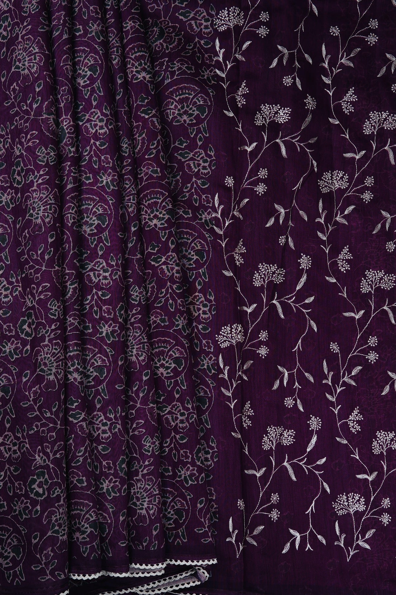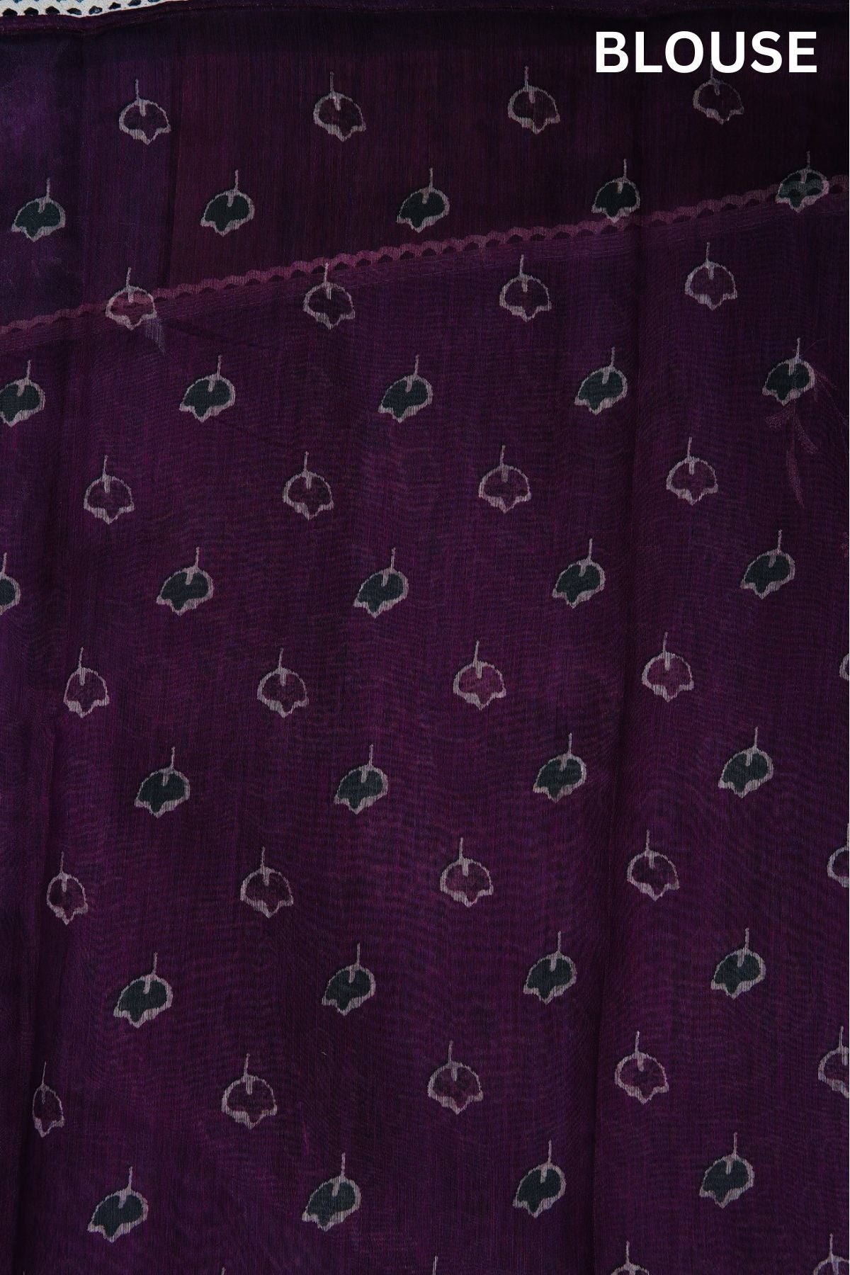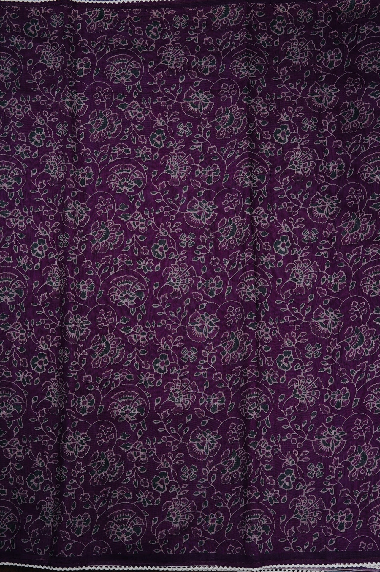 NextDark purple semi silk cotton saree with kodi pattern woven in white and green with floral motifs throughout the body, with a thin wavy white border, The pallu has a dark purple base with intricate kodi pattern woven in white threads. The saree has a dark purple blouse with inverted alternating flowers in green and purple.
