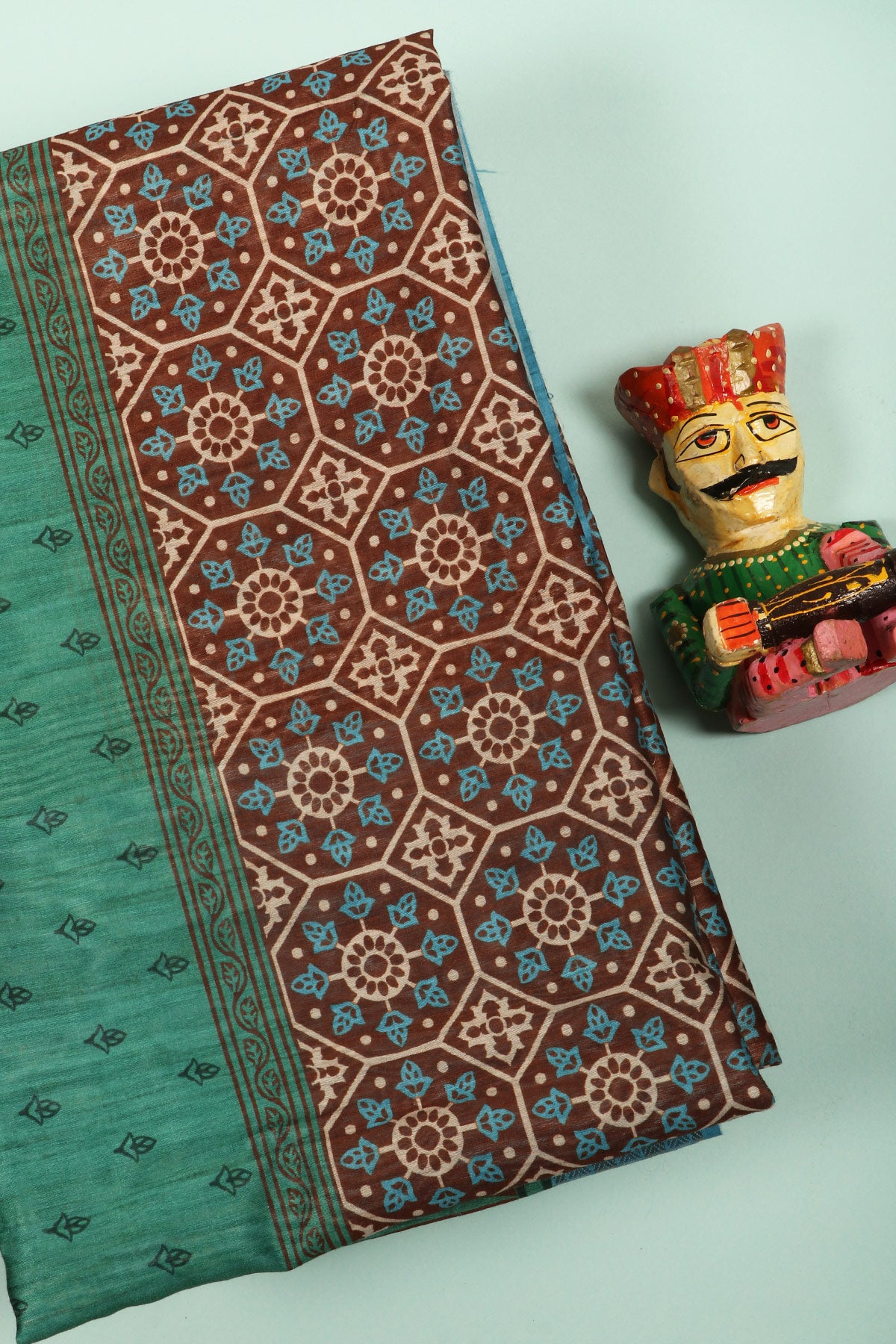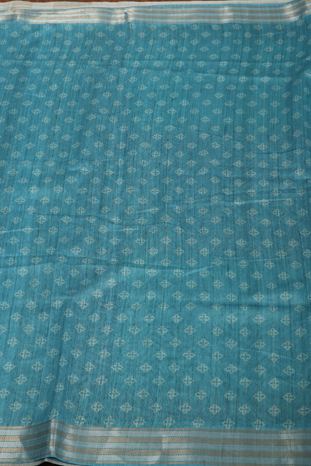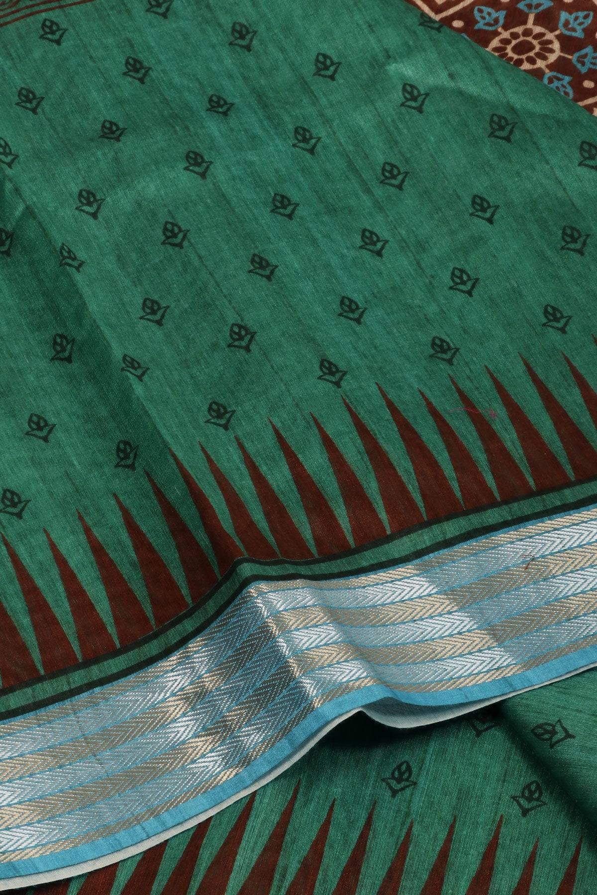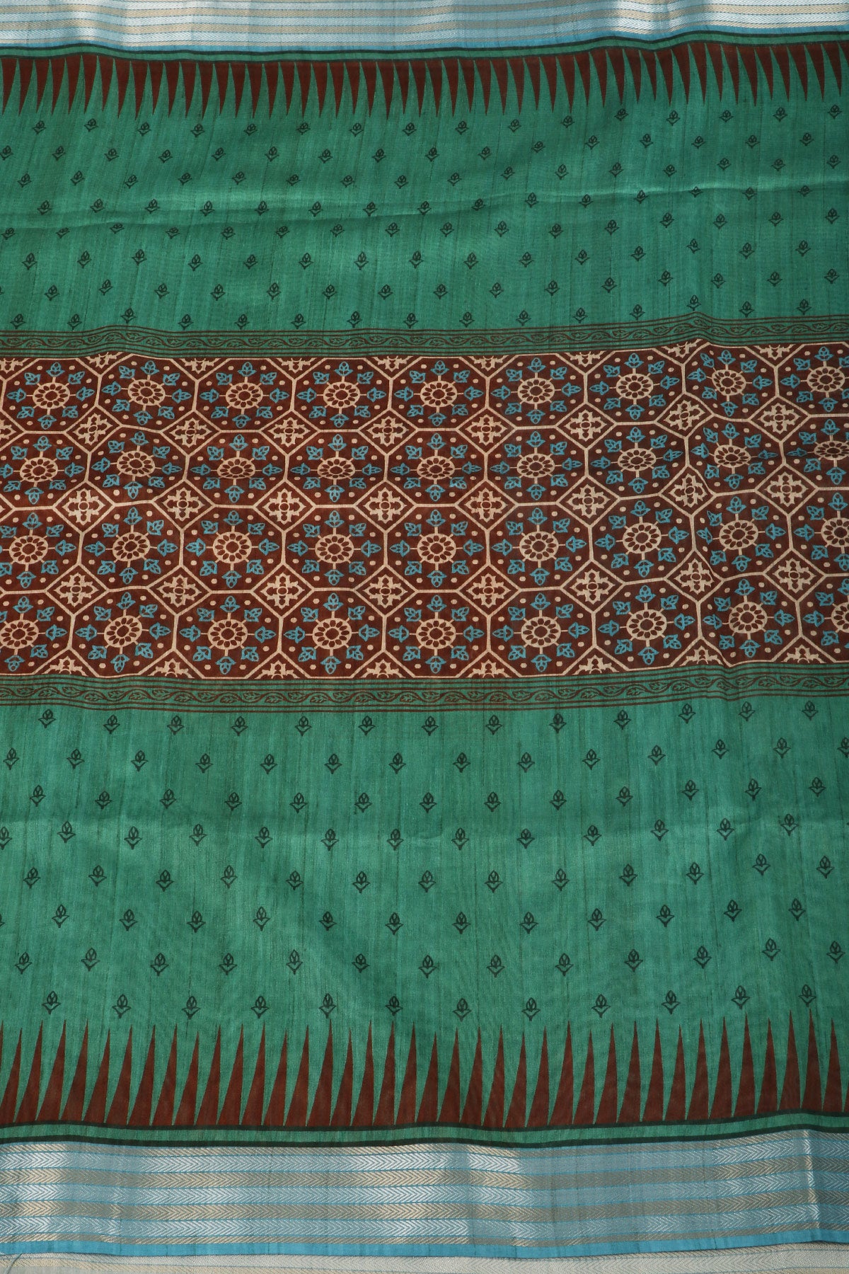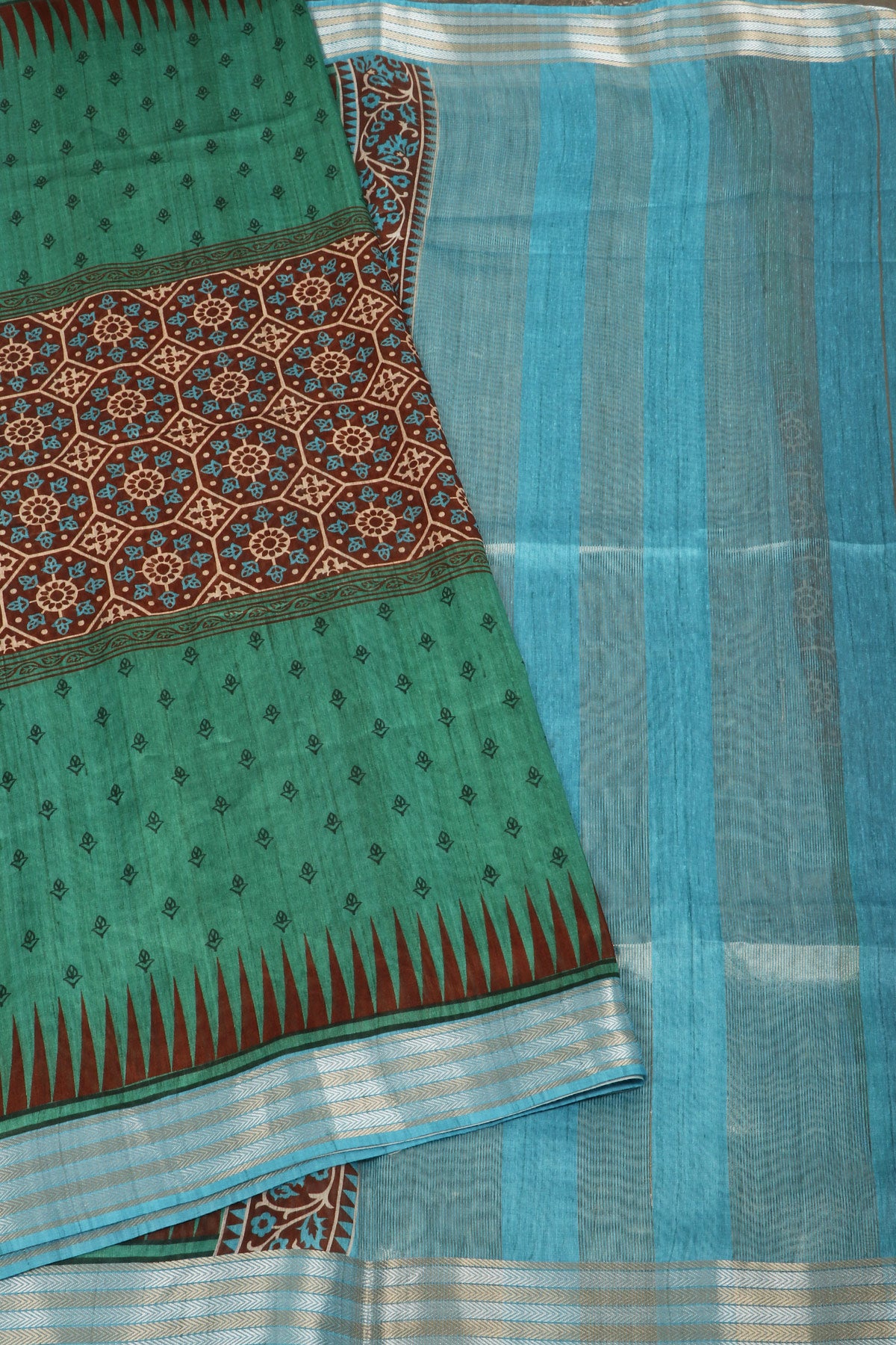 Previous NextSage green semi tussar saree with cobalt blue border with gold and silver zari. The body carries Patola inspired column prints taking over the body