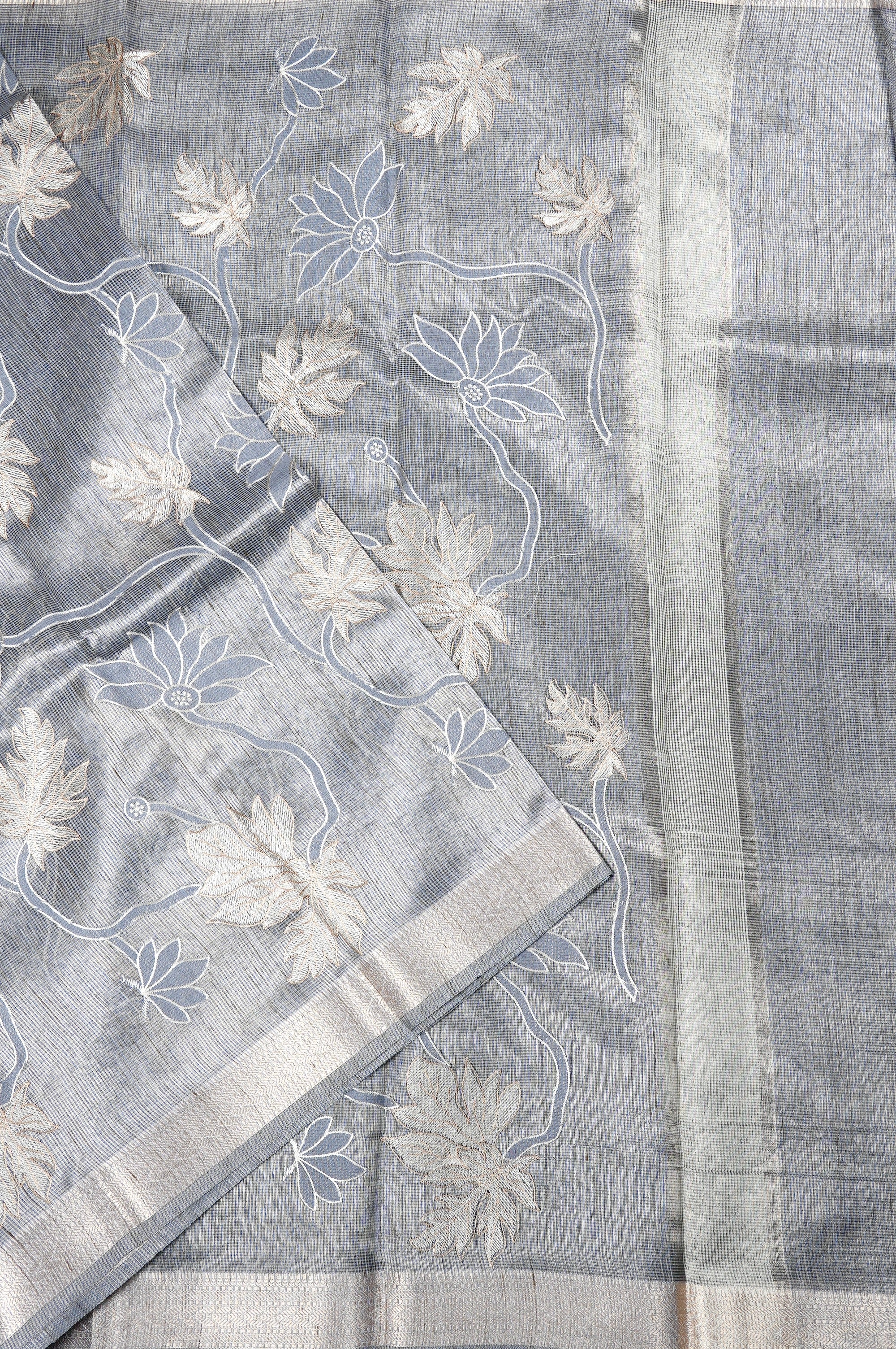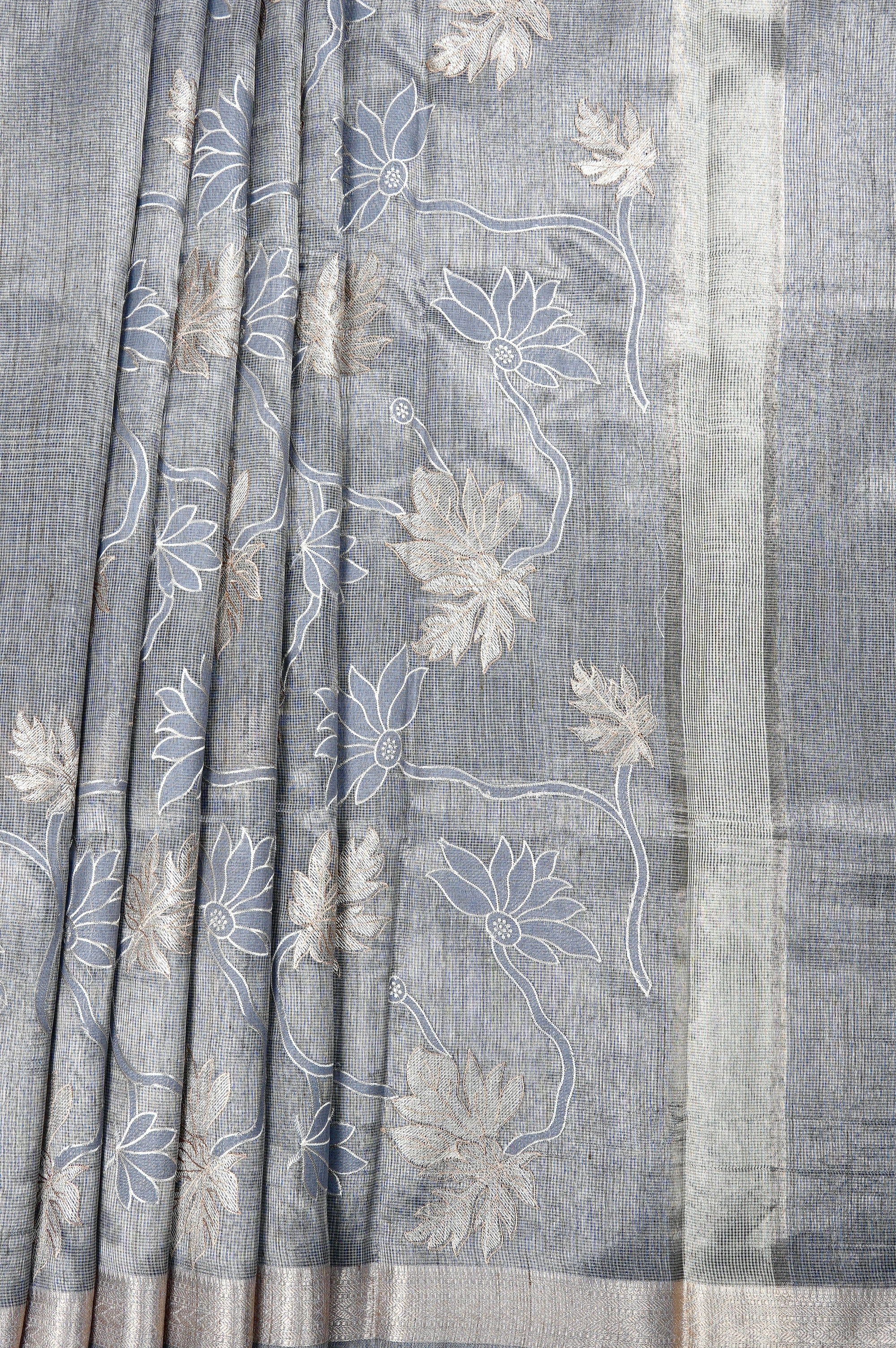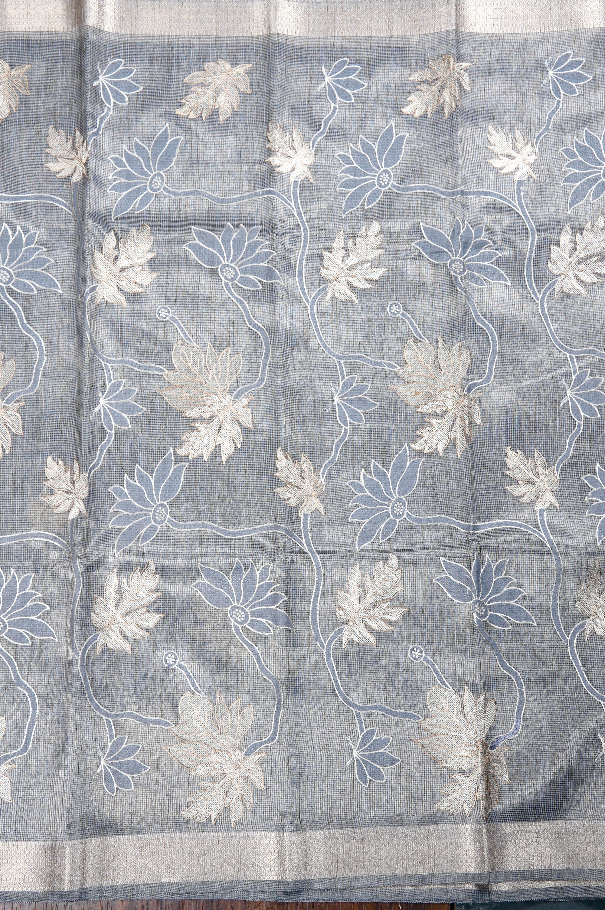 Previous NextThis pale slate grey semi tussar saree is richly embroidered with broad leaves and florals in shade of slate blue, grey and silver zari. The border is a simple band of silver zari. Following the simplicity of the saree, the pallu is an extension of the body, ending with a rich frame in silver zari.
