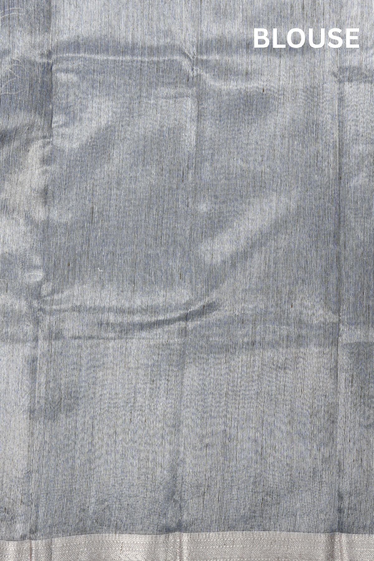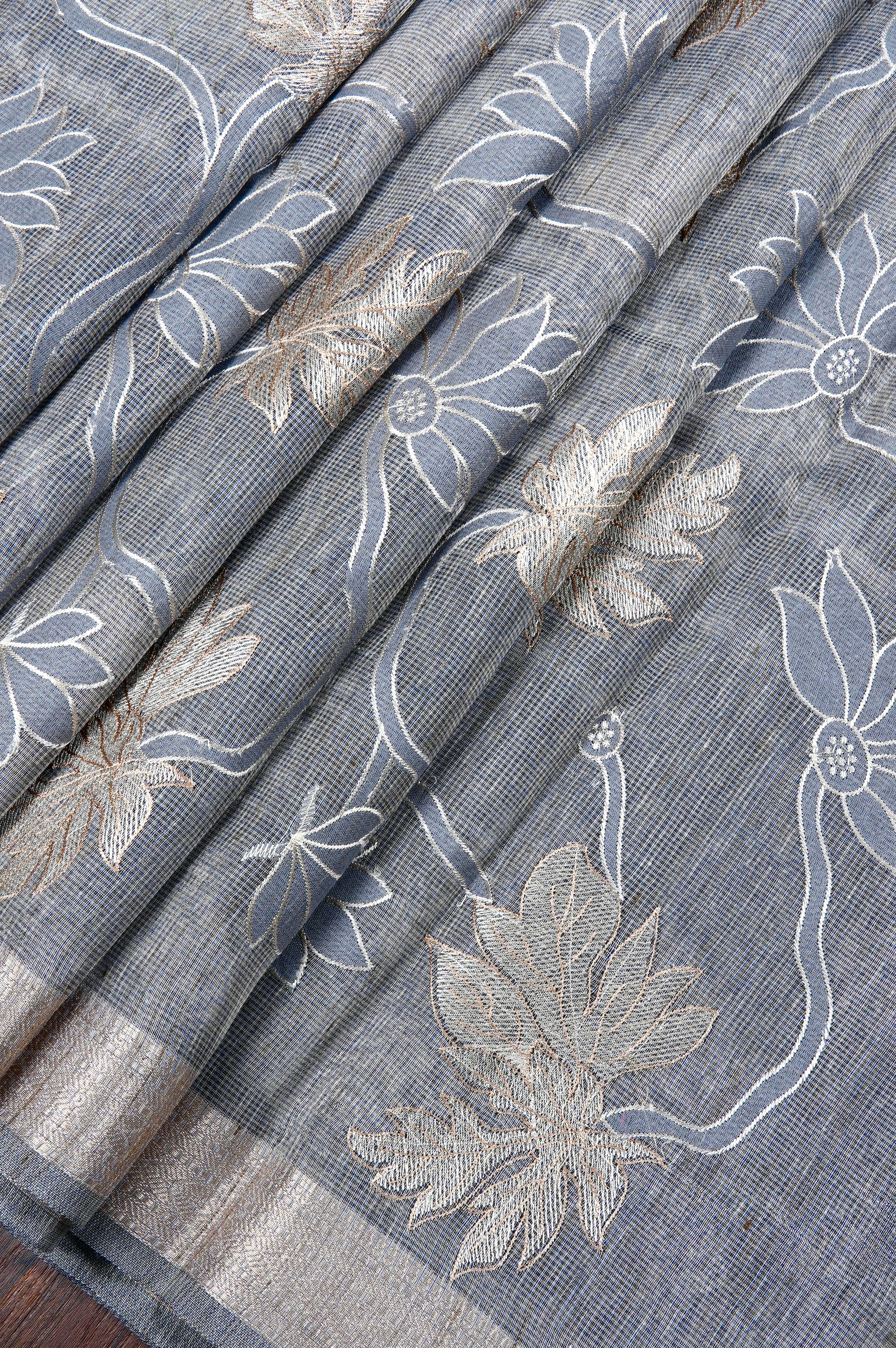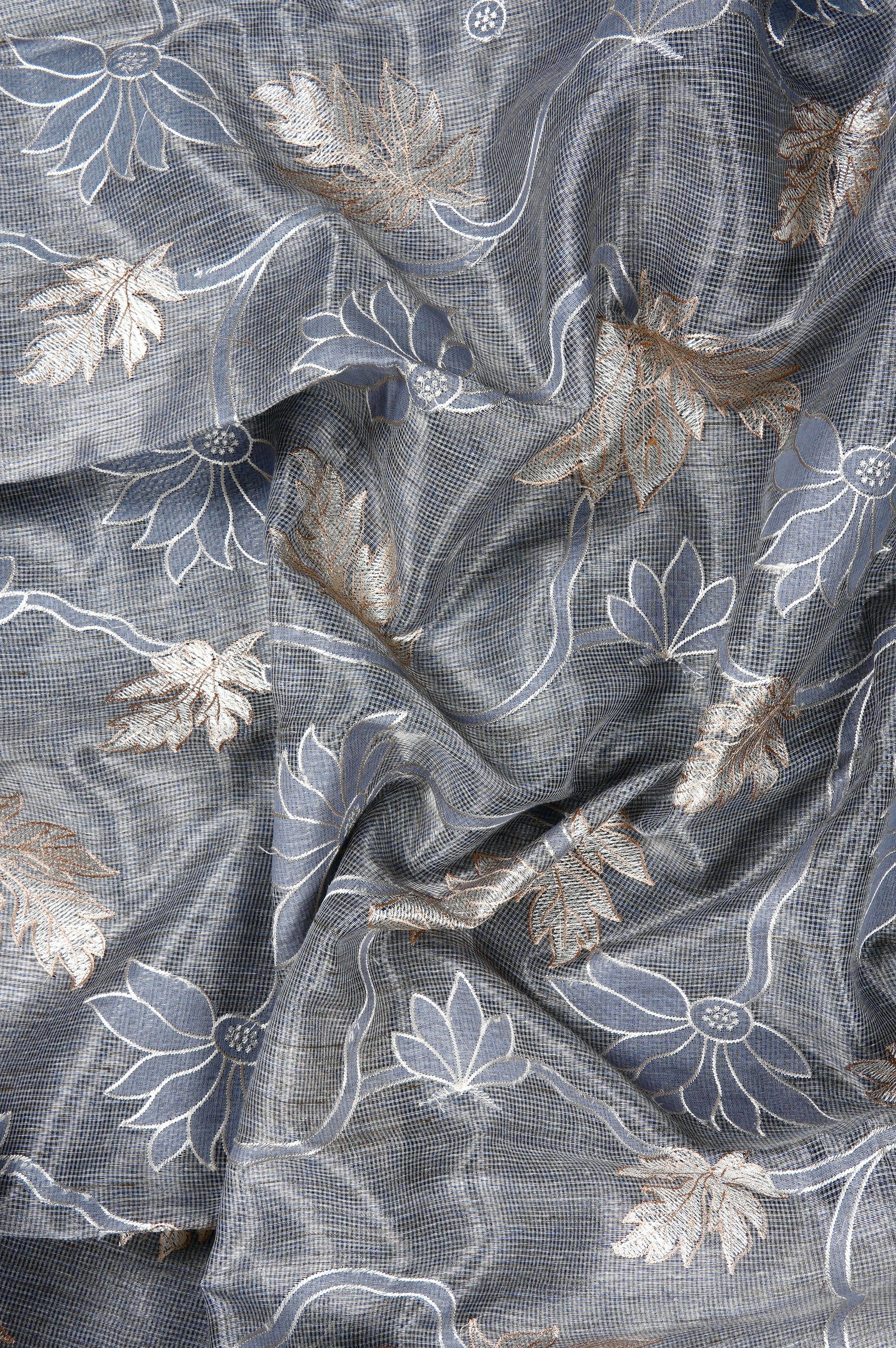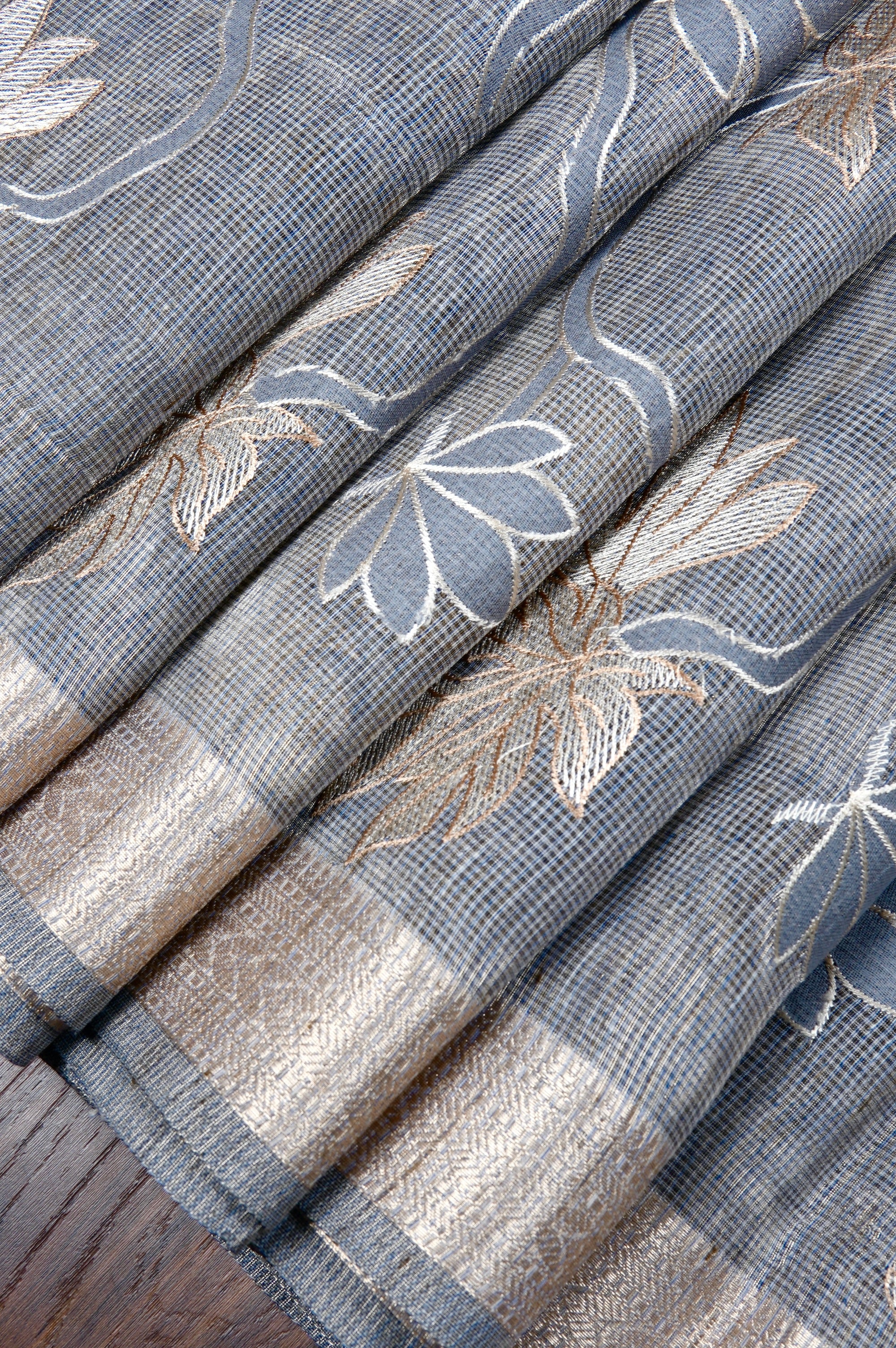 Previous NextThis pale slate grey semi tussar saree is richly embroidered with broad leaves and florals in shade of slate blue, grey and silver zari. The border is a simple band of silver zari. Following the simplicity of the saree, the pallu is an extension of the body, ending with a rich frame in silver zari.