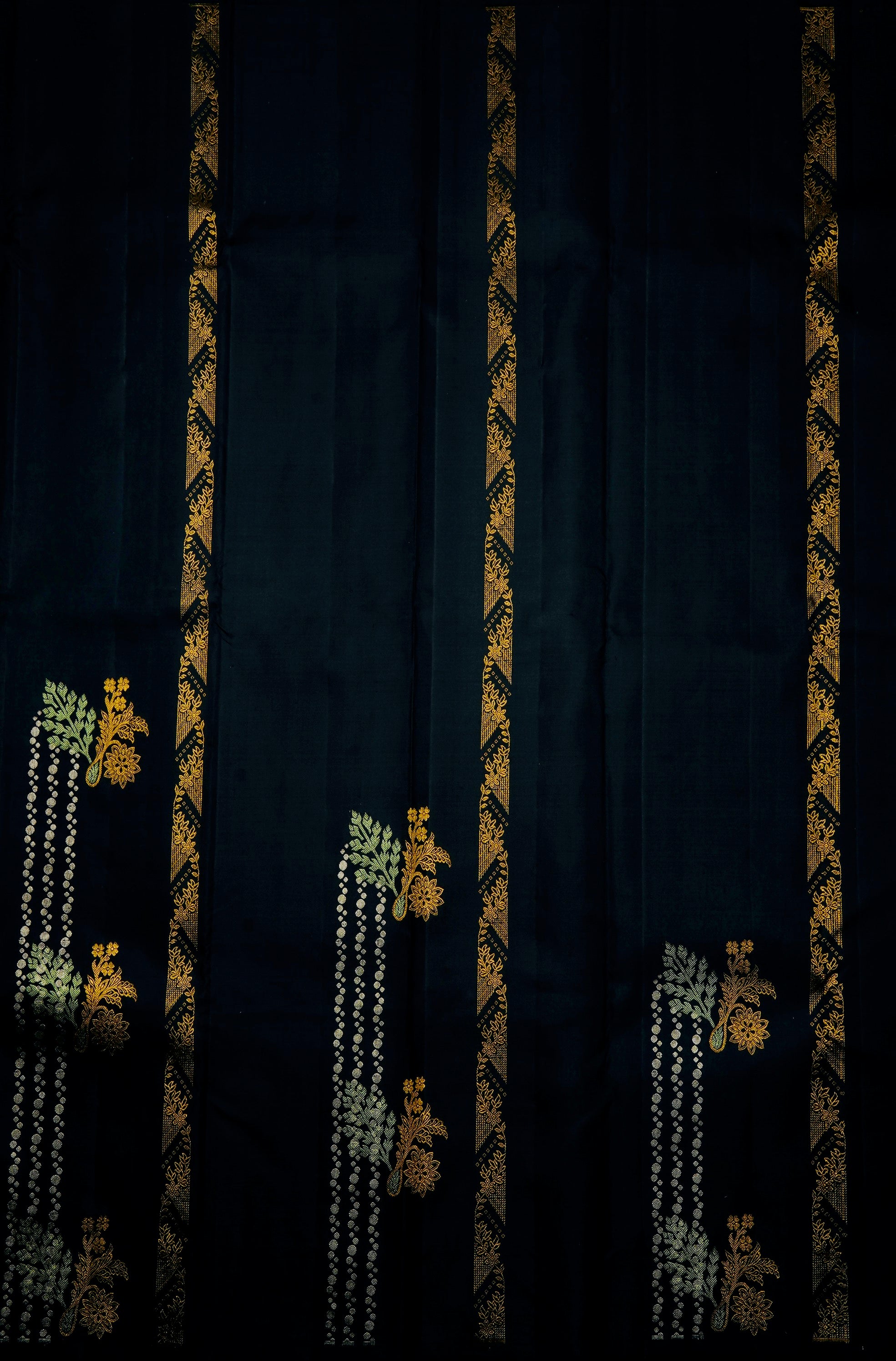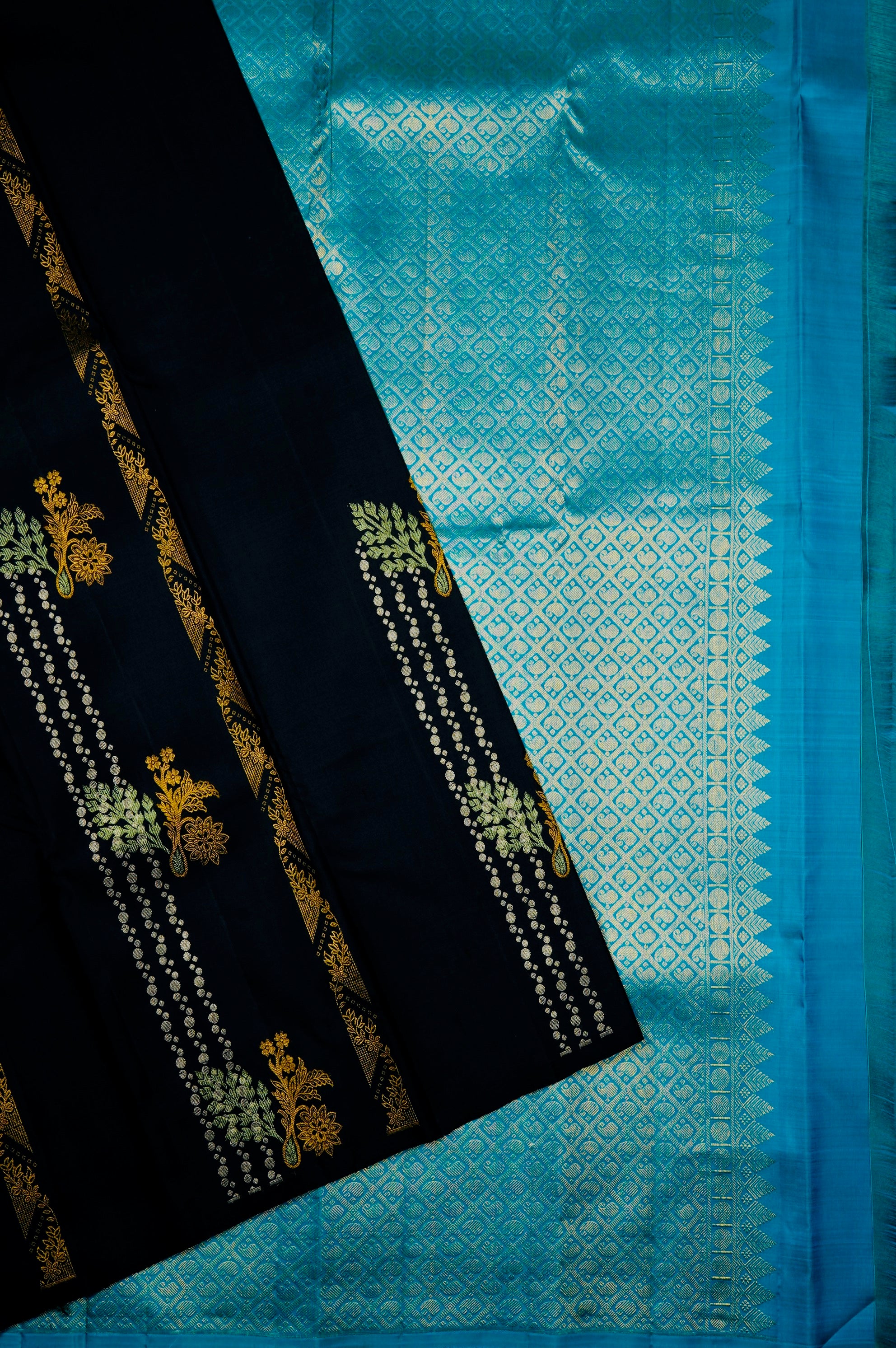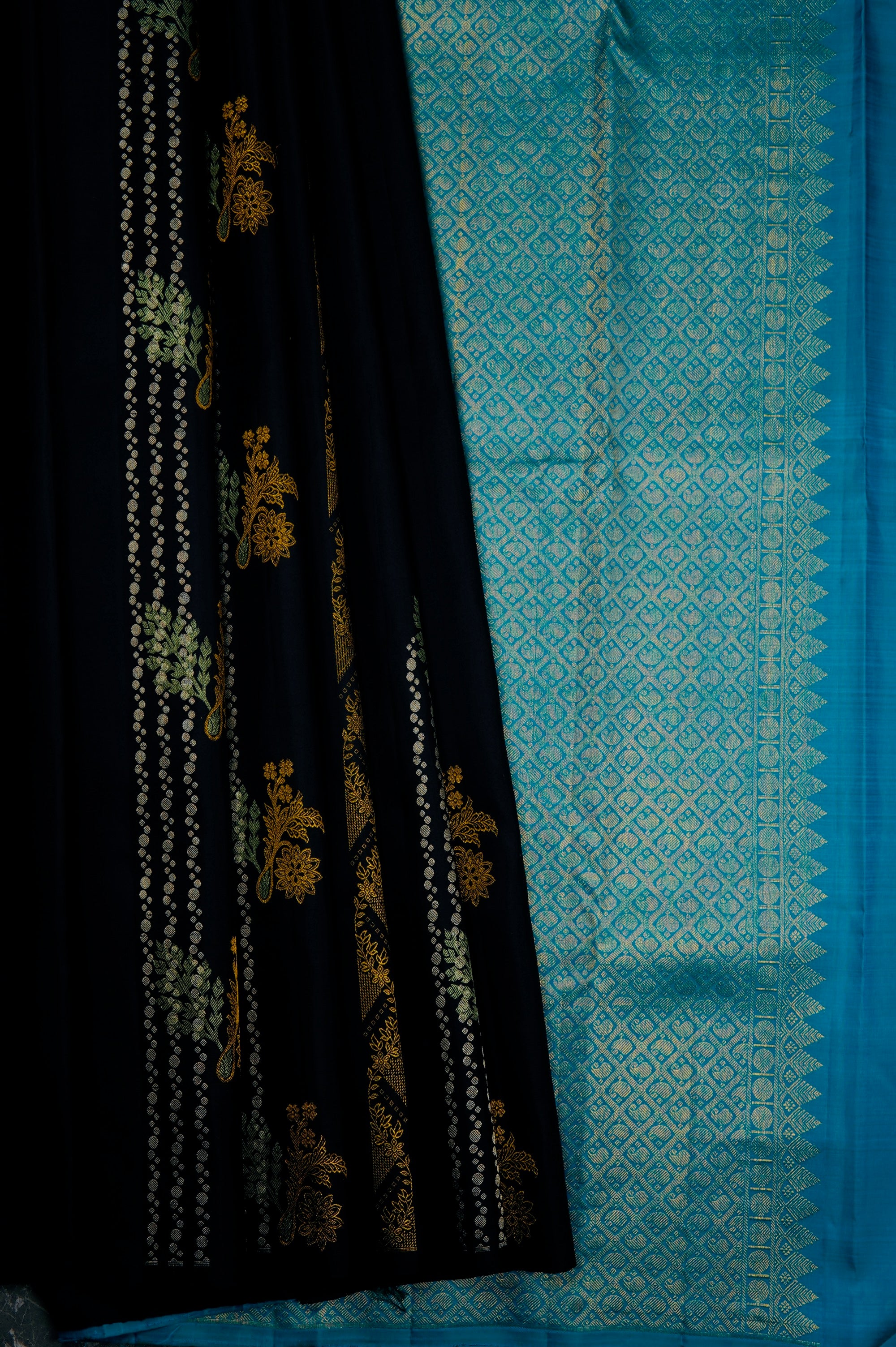 NextBlack kanchipuram silk saree with vertical triangular strips interlocked with kodi pattern woven in gold zari with floral motifs in between continued by lines of dots resembling vines woven in gold and silver zari. The pallu has a light blue base with an elaborate diamond grid with mango bhutta filling each square woven in gold zari. The saree has a plain light blue blouse.