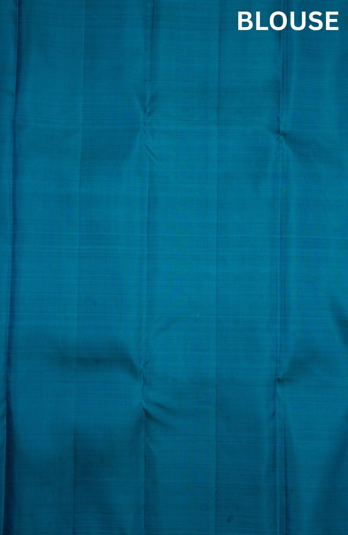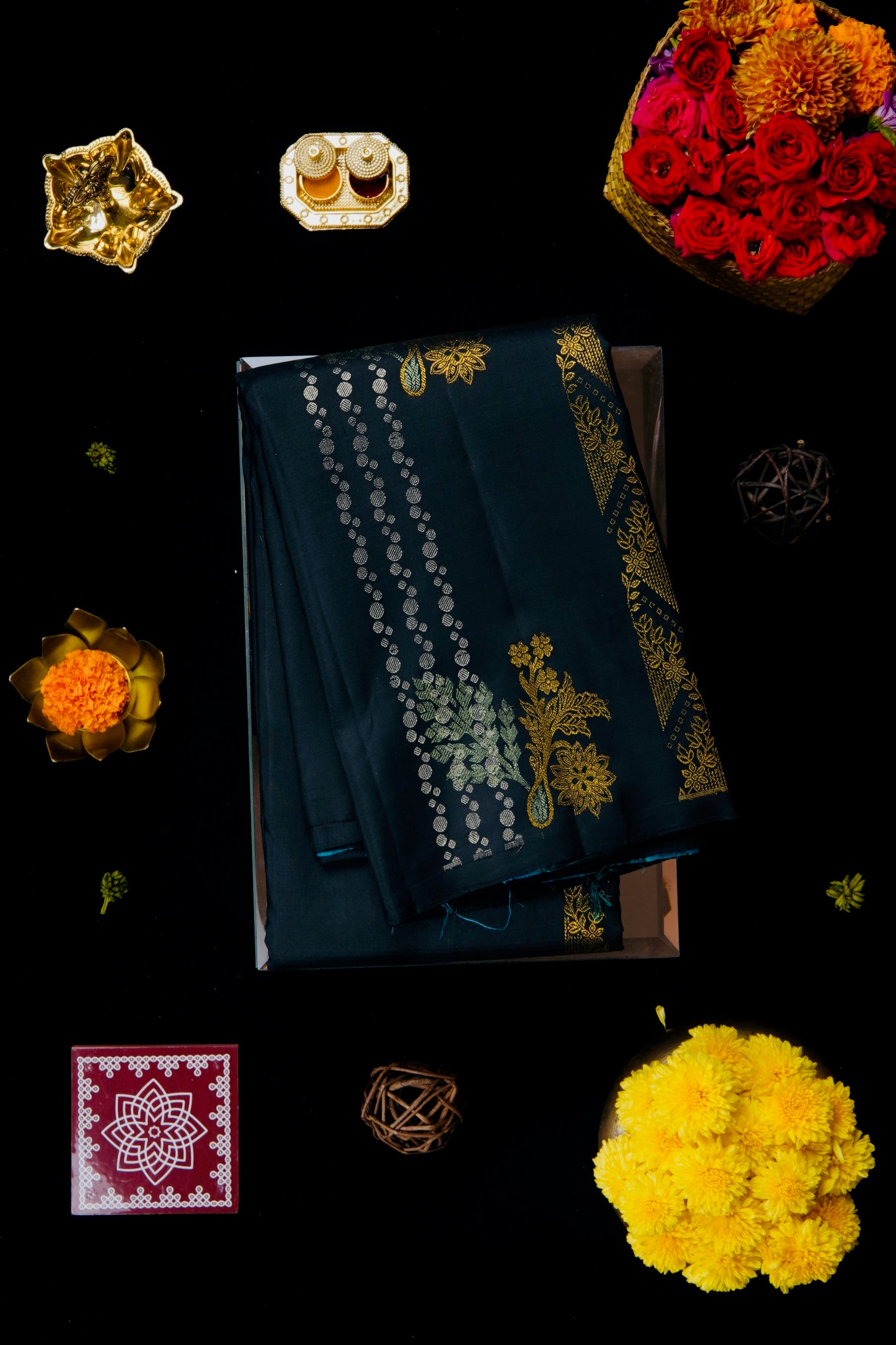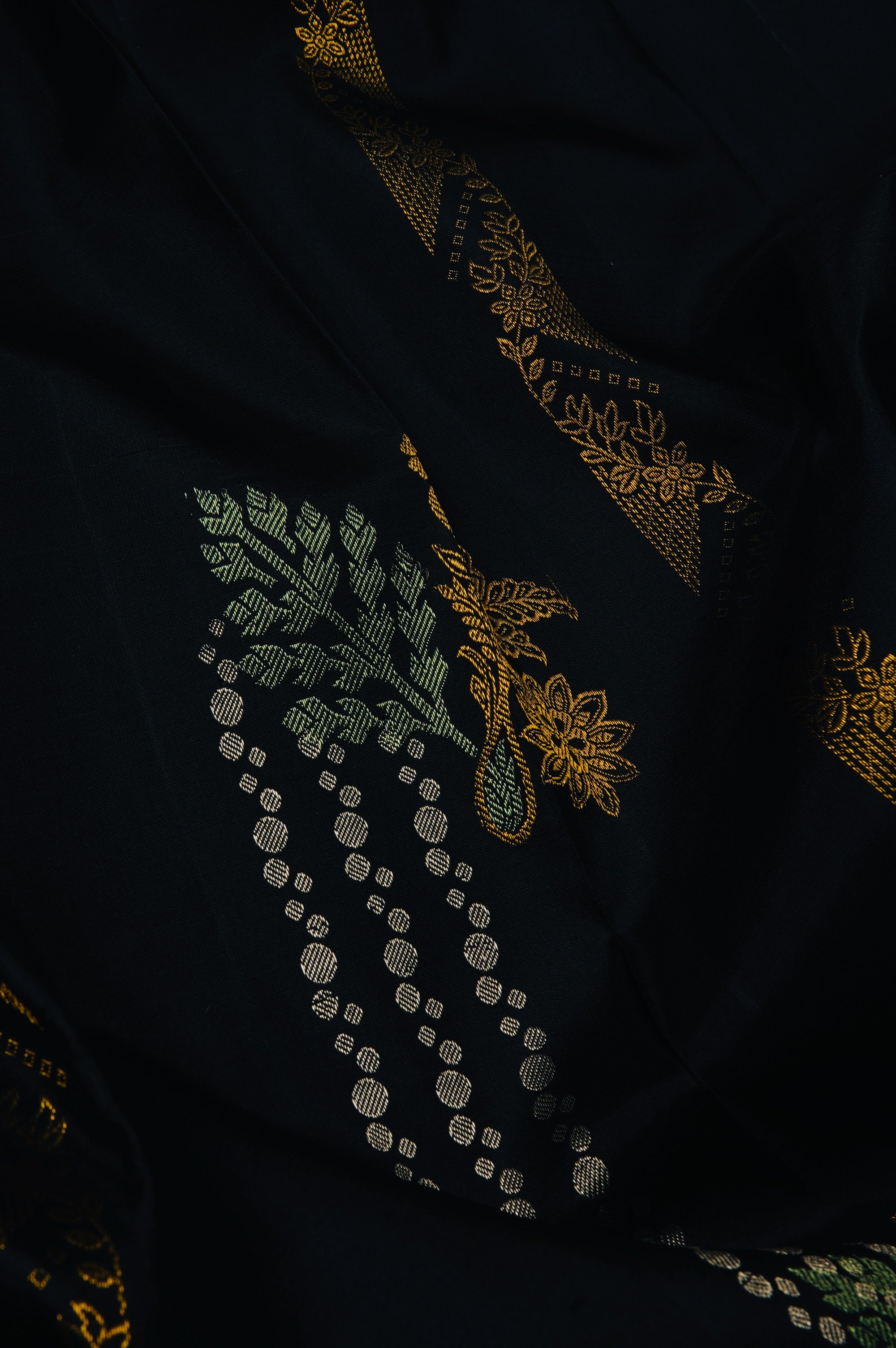 NextBlack kanchipuram silk saree with vertical triangular strips interlocked with kodi pattern woven in gold zari with floral motifs in between continued by lines of dots resembling vines woven in gold and silver zari. The pallu has a light blue base with an elaborate diamond grid with mango bhutta filling each square woven in gold zari. The saree has a plain light blue blouse.