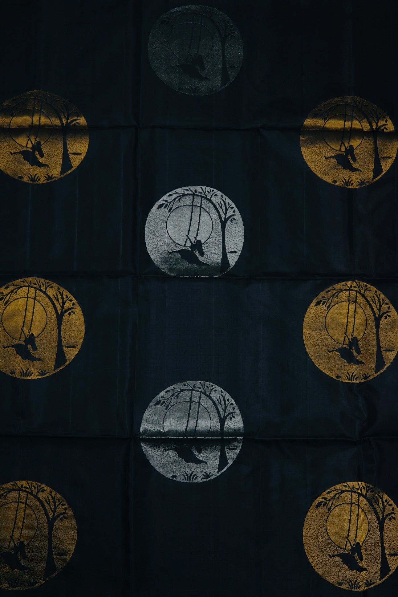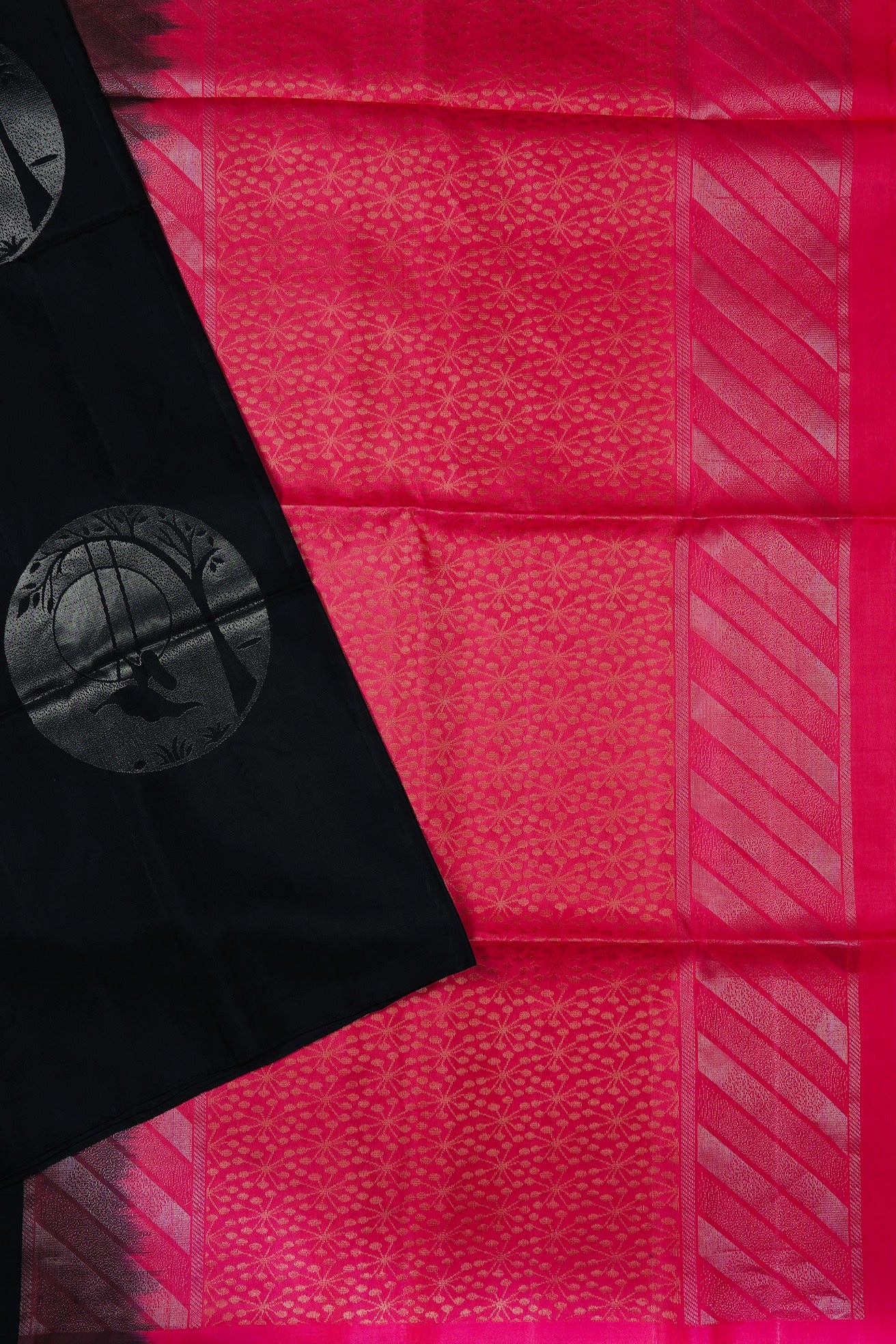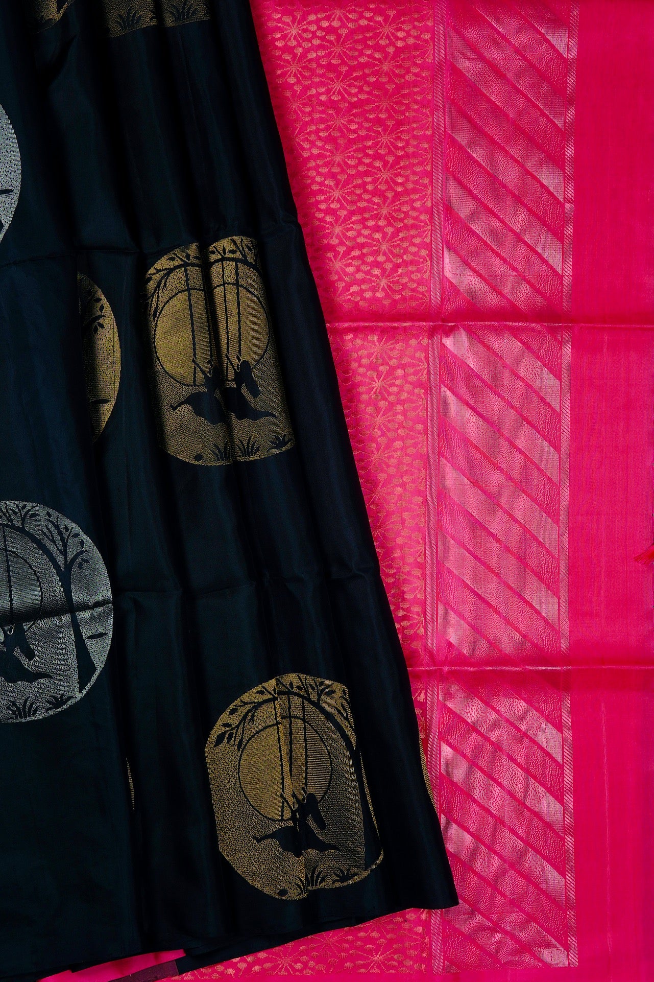 Previous NextBlack soft silk saree that connects with a whimsical emotion portraying a girl on a swing hanging from a tree under the moon woven in broad and elegant circles, in gold and silver zari. The pallu has a deep pink base filled with small motifs extending to dots, resembling dandelions in gold zari, followed by a band of smaller diagonal bands of solid and gradient silver zari work. The saree has a plain deep pink blouse.