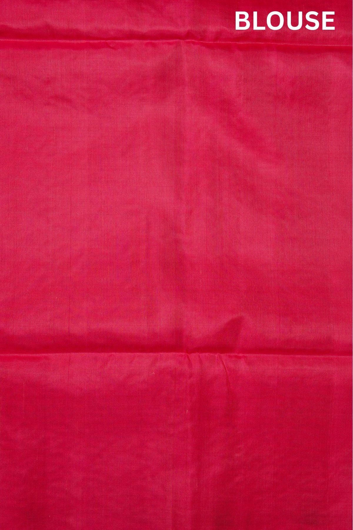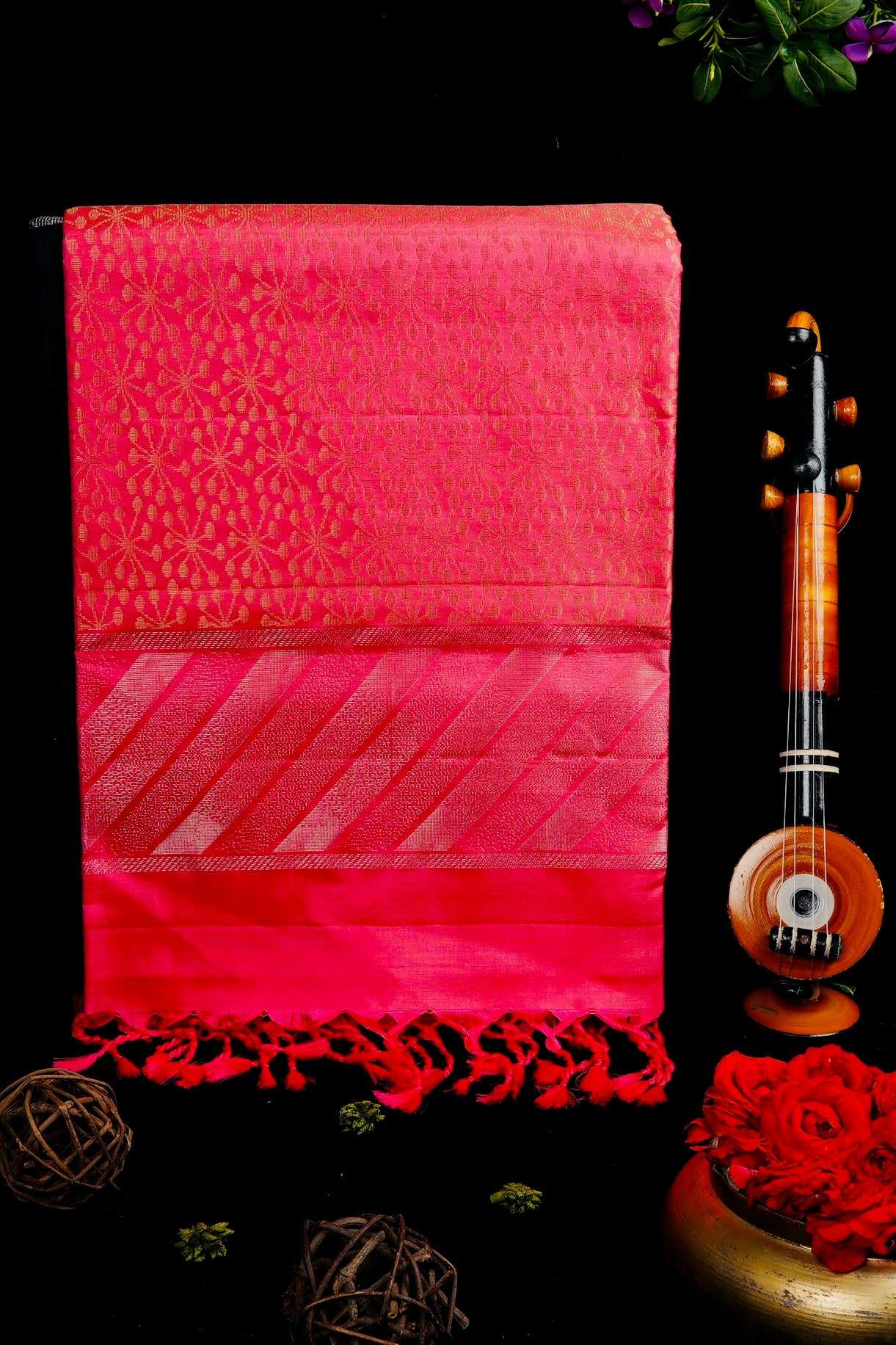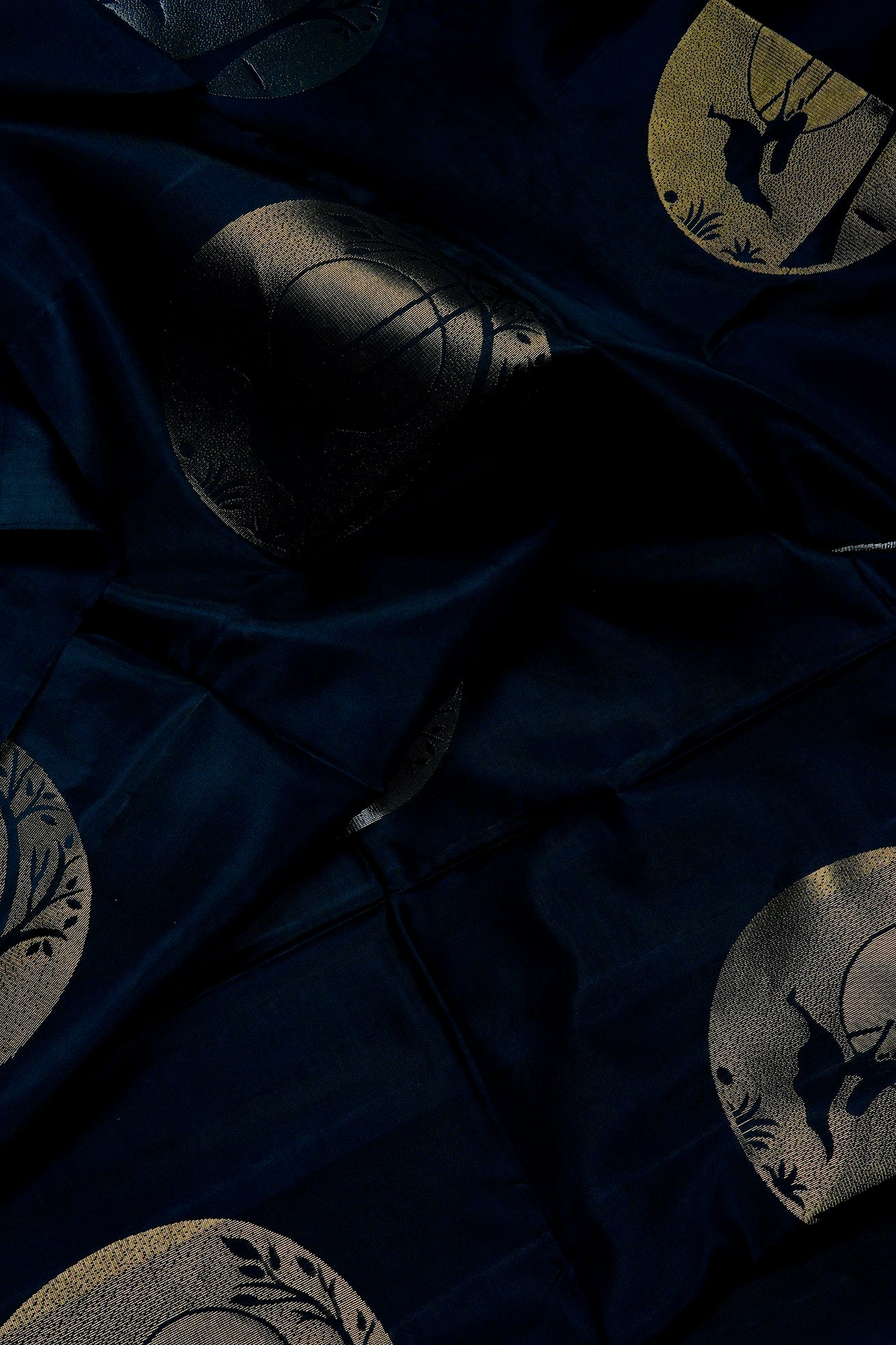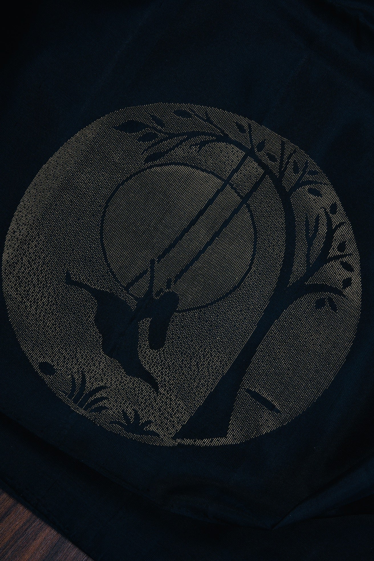 Previous NextBlack soft silk saree that connects with a whimsical emotion portraying a girl on a swing hanging from a tree under the moon woven in broad and elegant circles, in gold and silver zari. The pallu has a deep pink base filled with small motifs extending to dots, resembling dandelions in gold zari, followed by a band of smaller diagonal bands of solid and gradient silver zari work. The saree has a plain deep pink blouse.