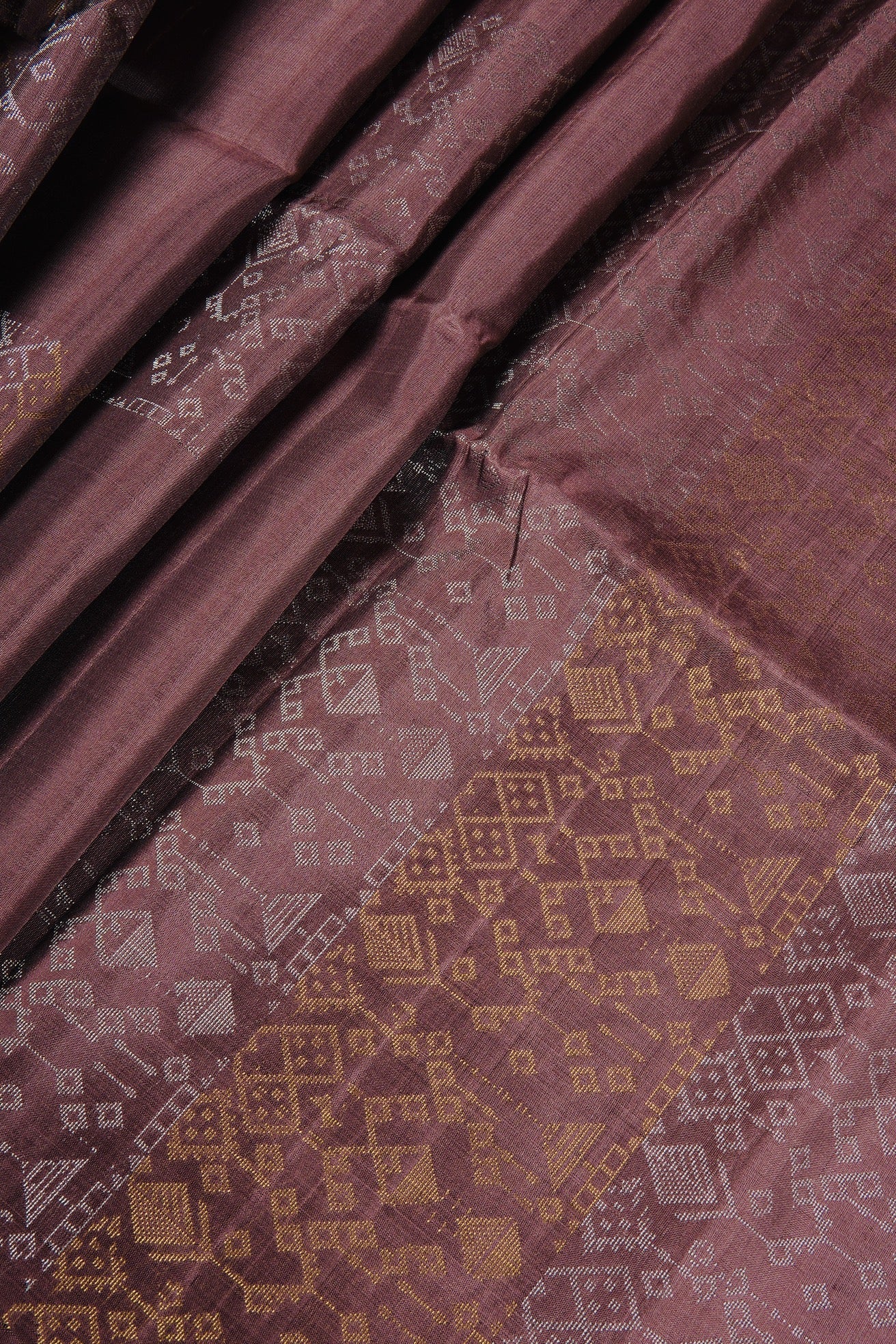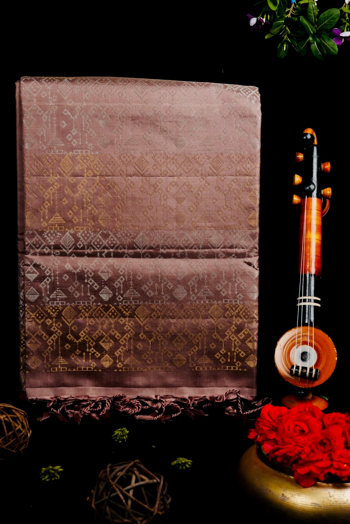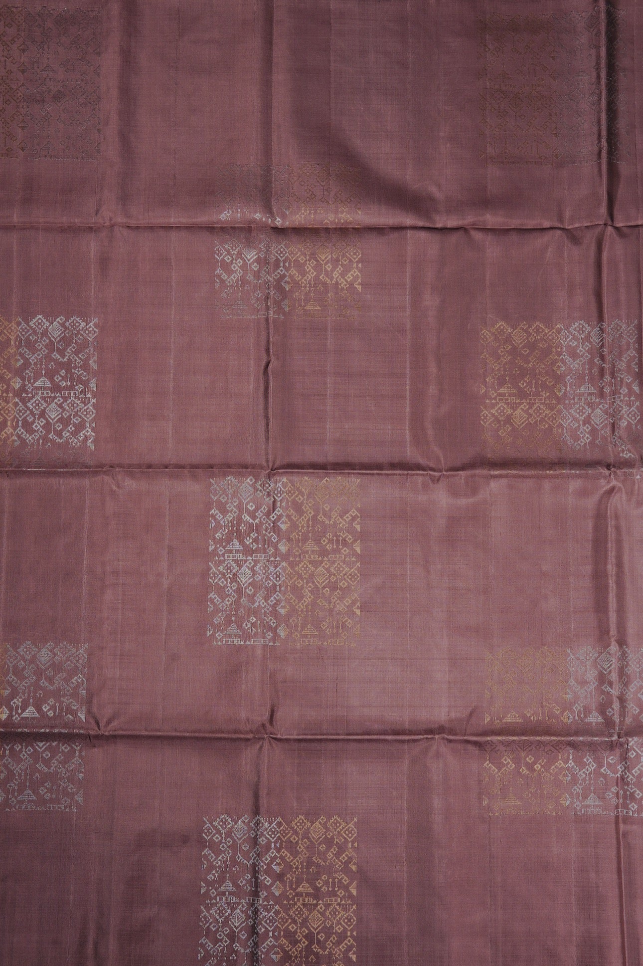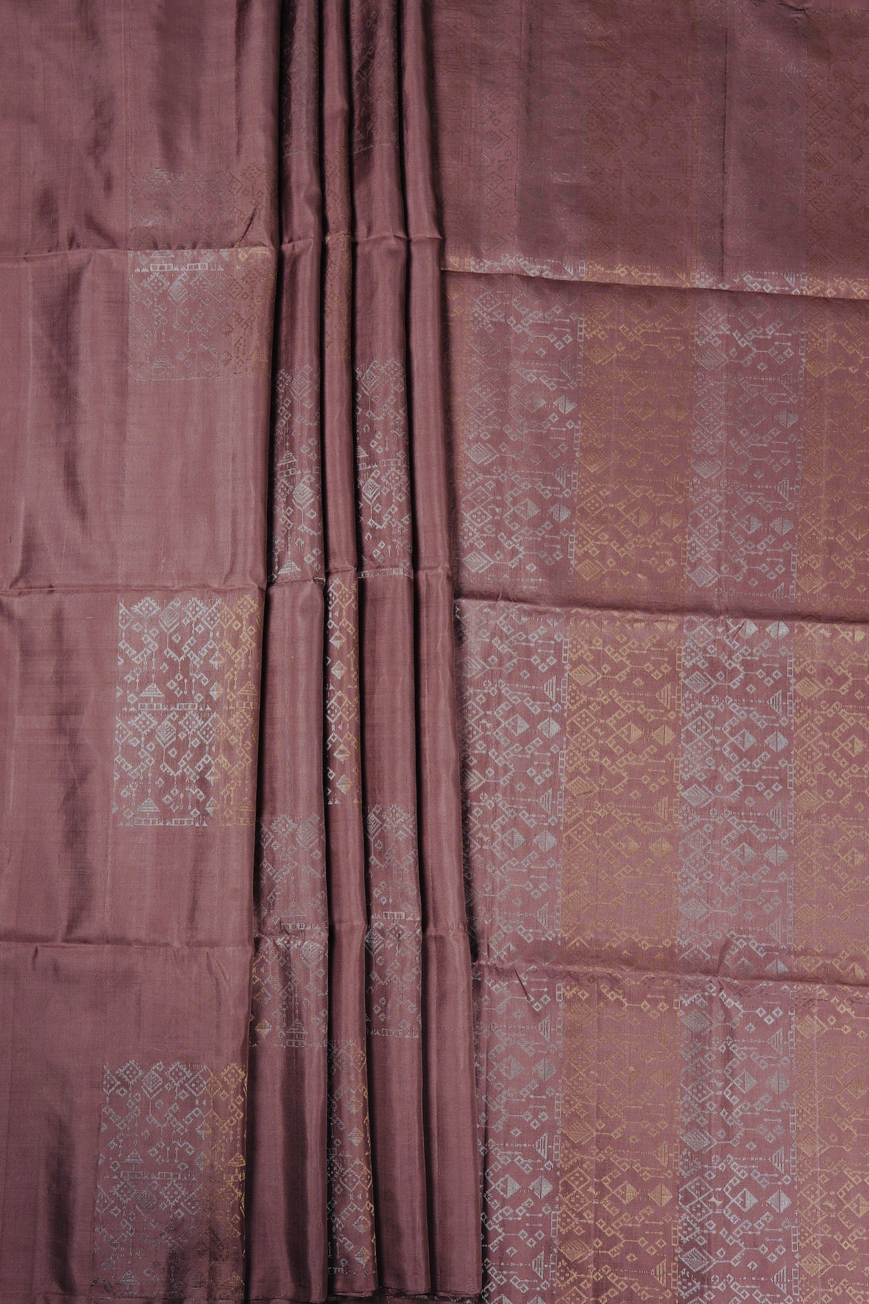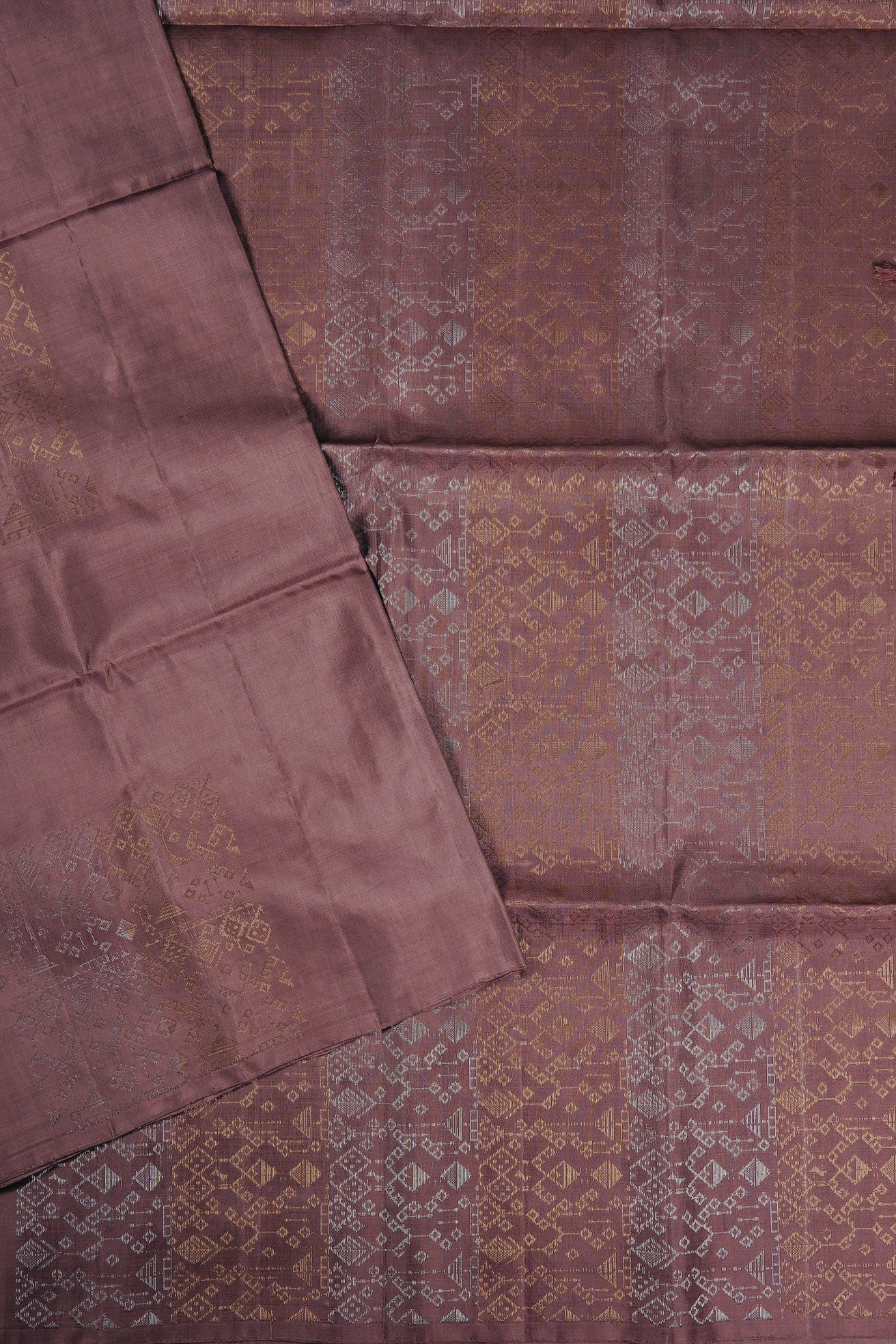 Previous NextMauve taupe soft silk saree with ethnic framed portraying grandeur through geometric diamonds with motifs resembling hanging lamps woven in gold and silver zari throughout the body. The pallu has the replications of these designs in bands of silver and gold zari alternatively. The saree has a plain mauve taupe blouse.
