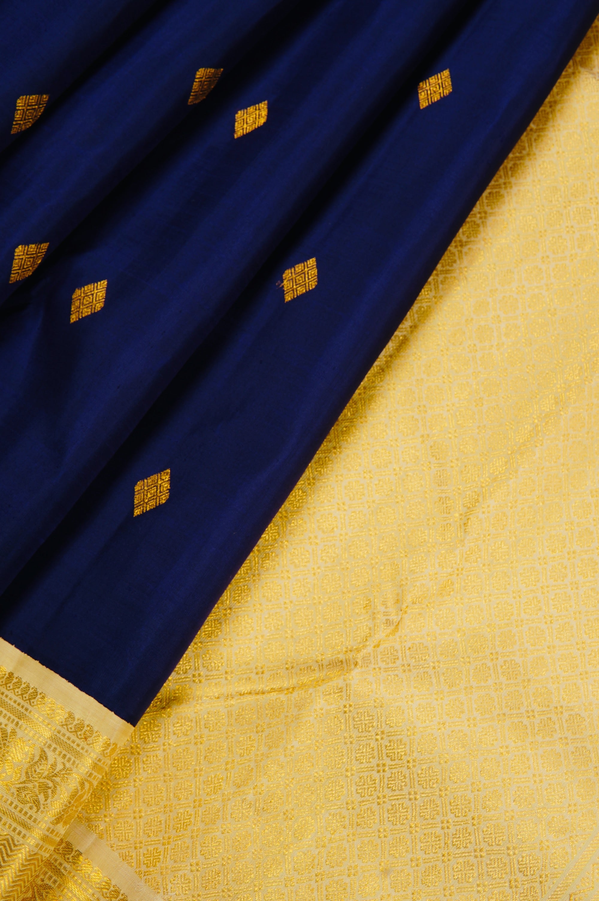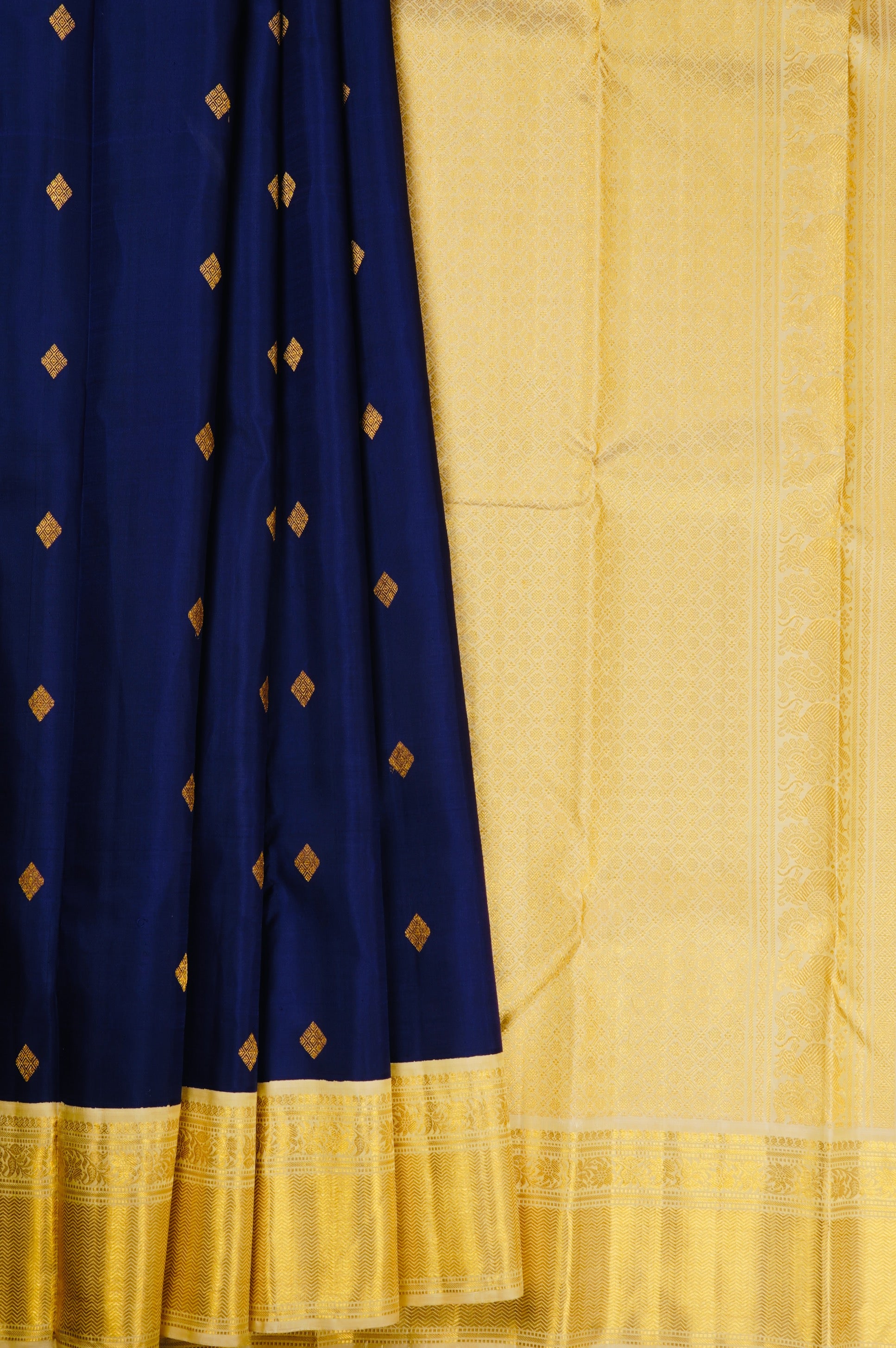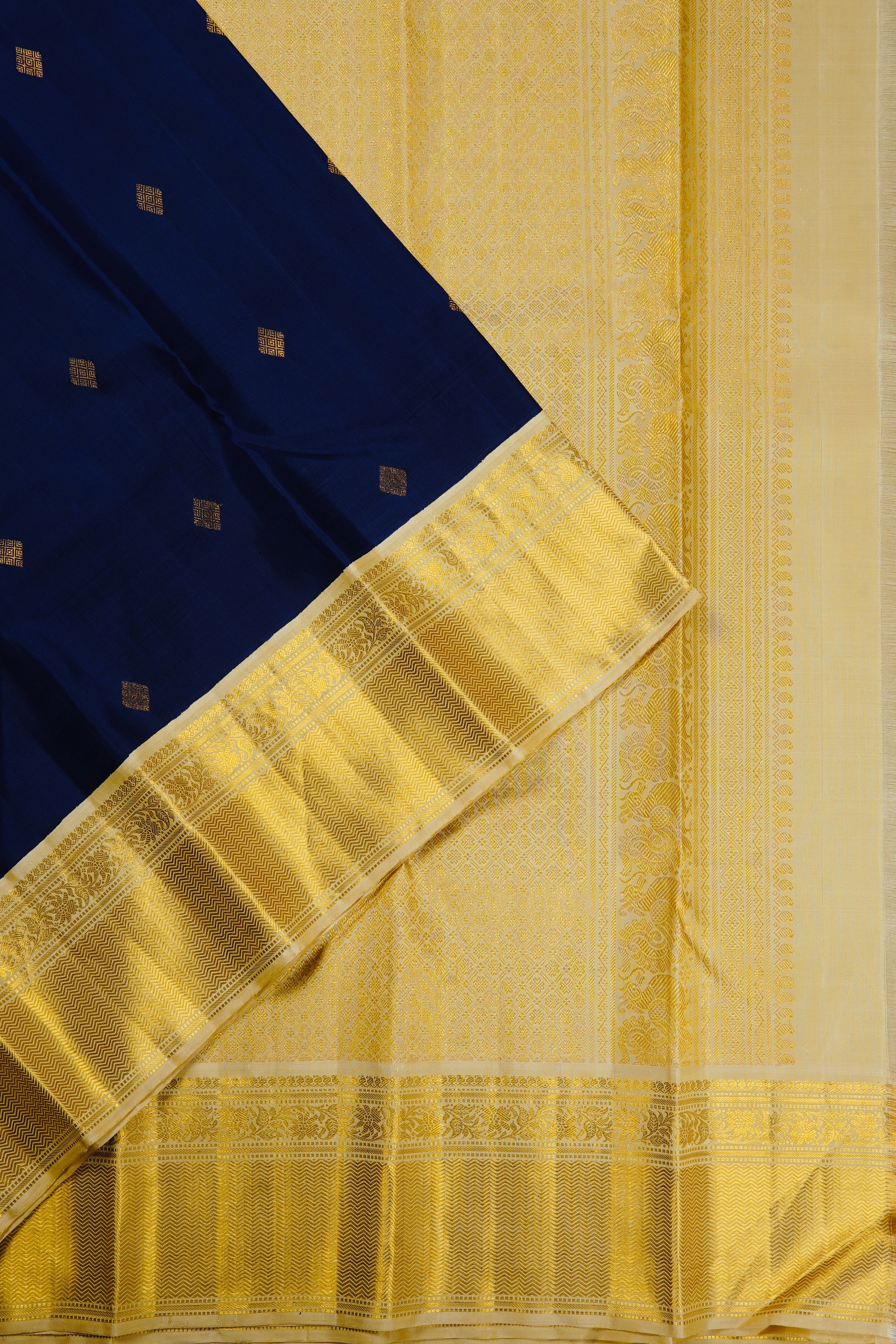 Previous NextMidnight blue kanchipuram silk saree with small diamond bhuttas consisting inner concentric diamonds woven in gold zari. The border has an ivory base and has bands of mango bhuttas, floral vines and a wide expanse of neli patterns woven in gold zari. The pallu has an ivory base and starts off with diamond grids, followed by a band of peacock motifs woven in gold zari. the saree has a plain ivory blouse with the same border.