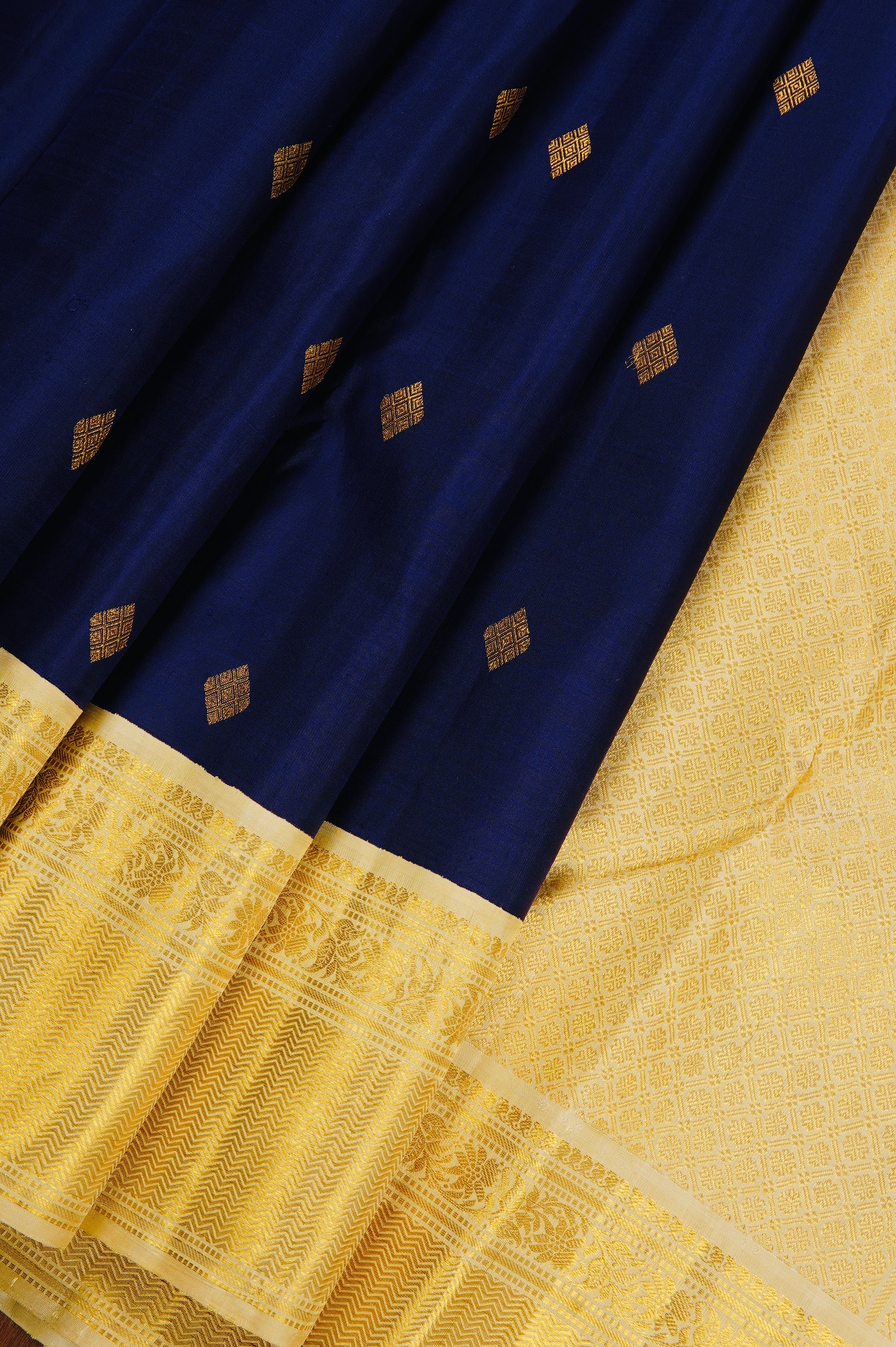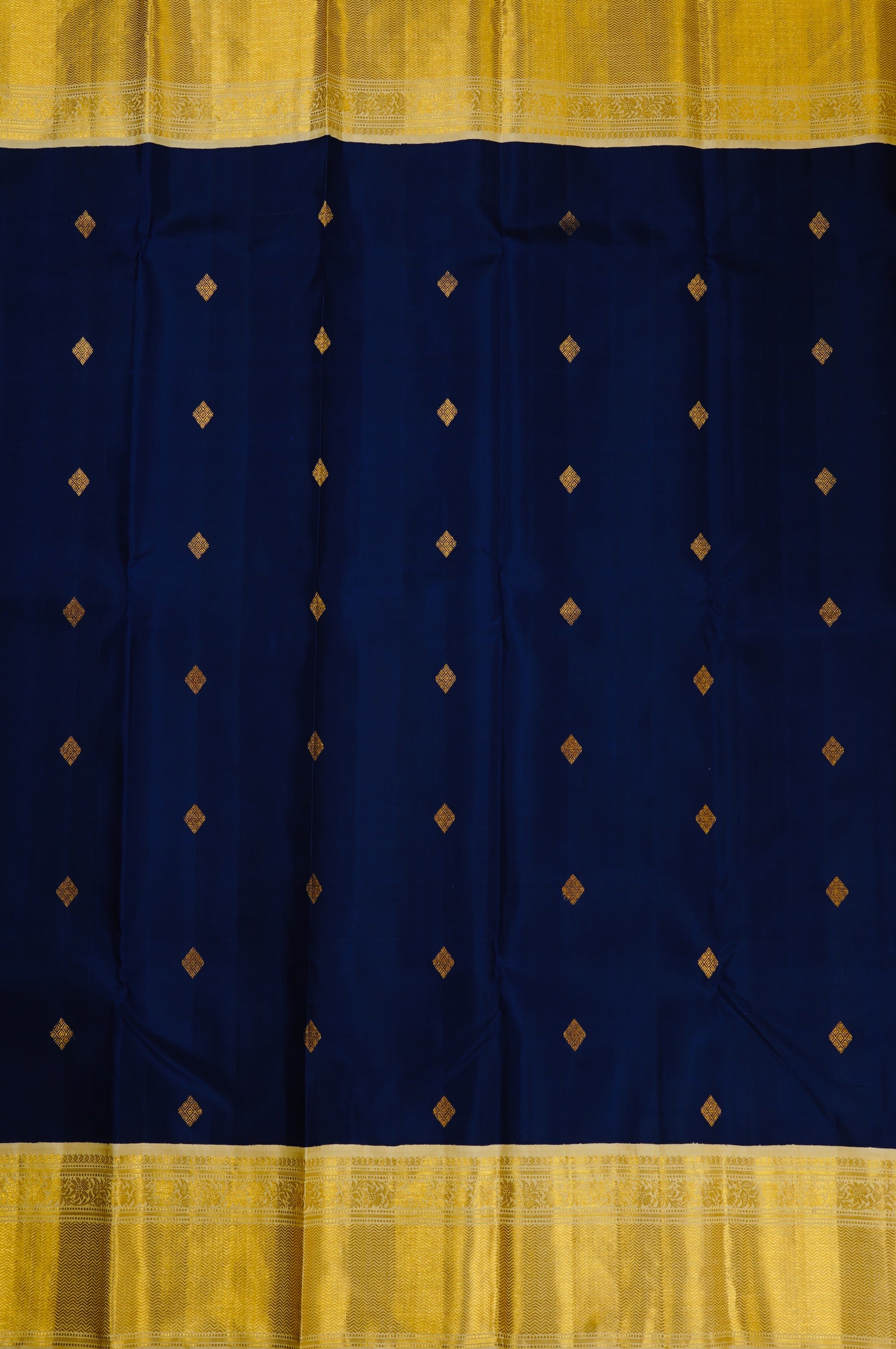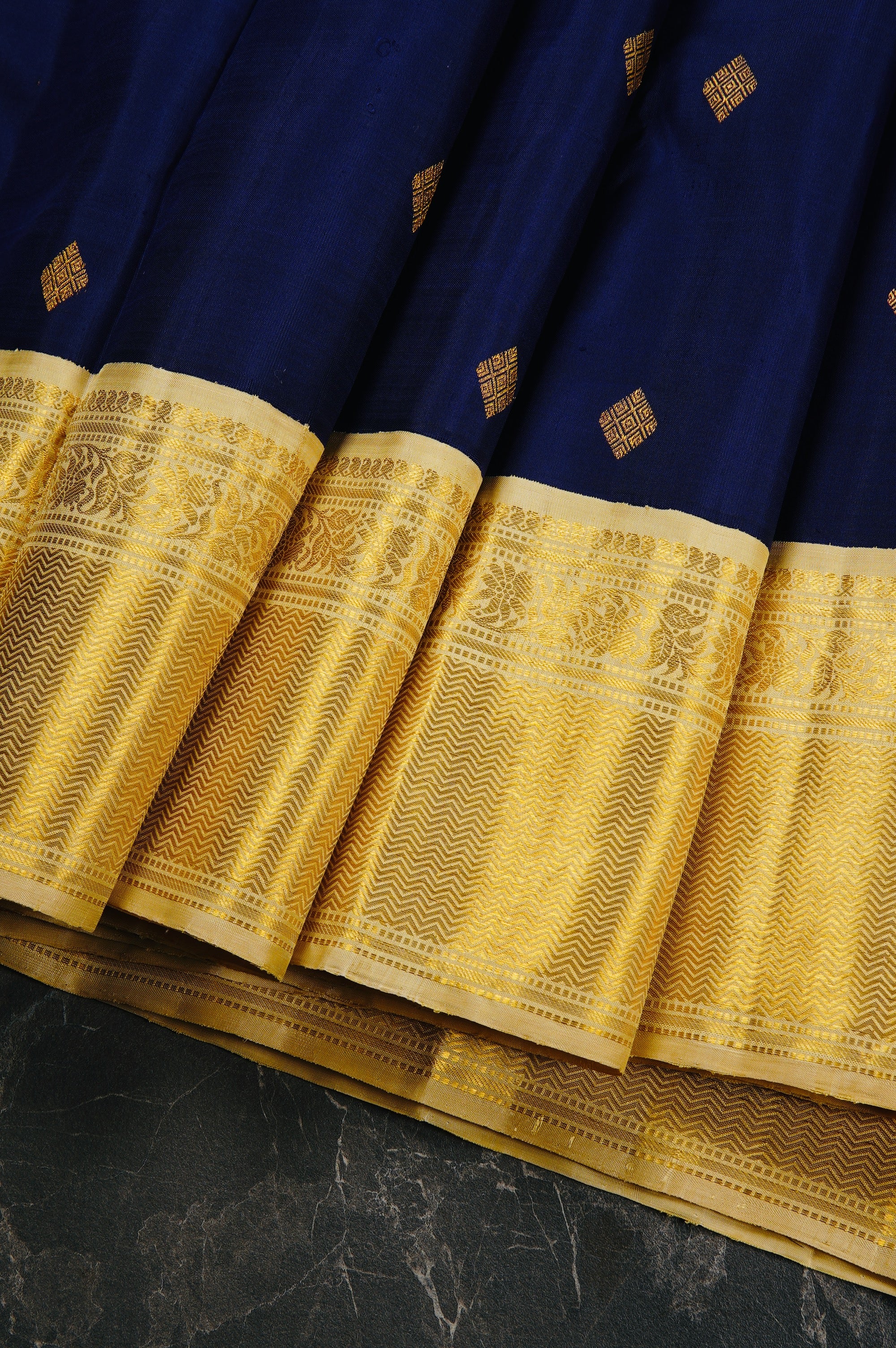 Previous NextMidnight blue kanchipuram silk saree with small diamond bhuttas consisting inner concentric diamonds woven in gold zari. The border has an ivory base and has bands of mango bhuttas, floral vines and a wide expanse of neli patterns woven in gold zari. The pallu has an ivory base and starts off with diamond grids, followed by a band of peacock motifs woven in gold zari. the saree has a plain ivory blouse with the same border.