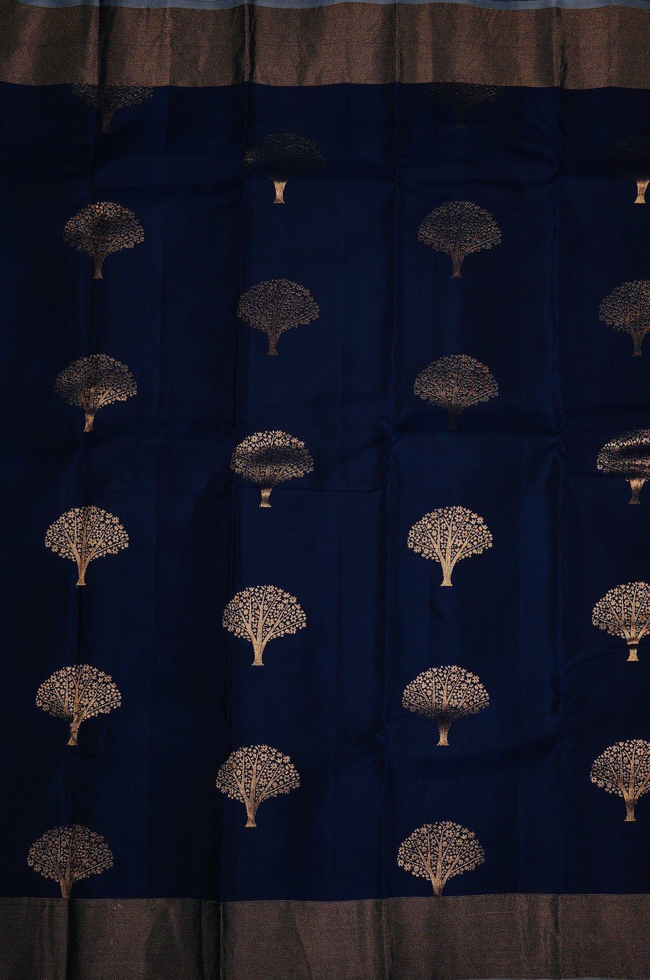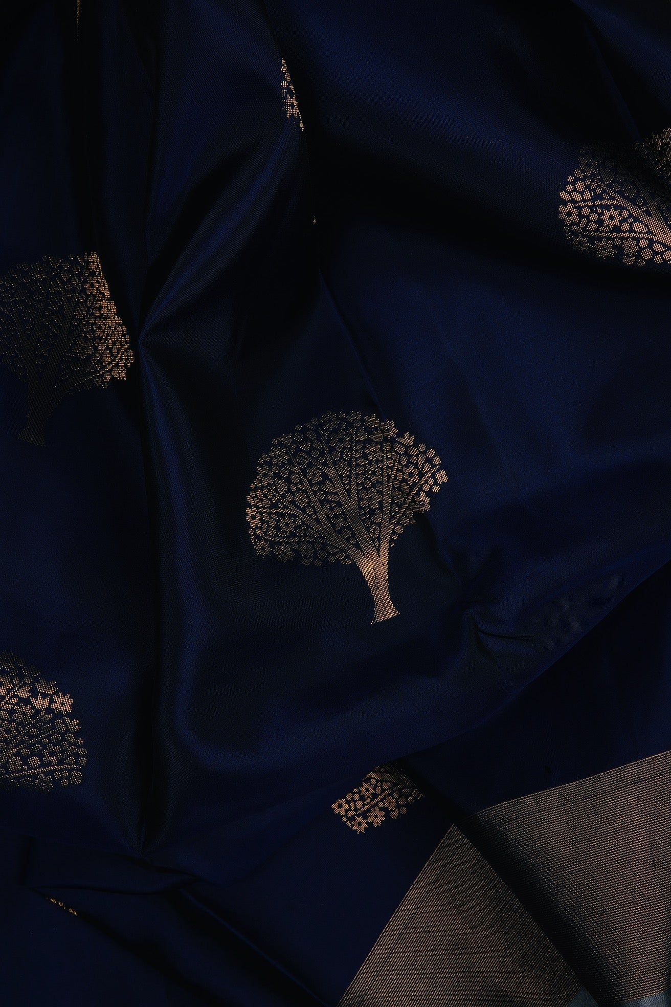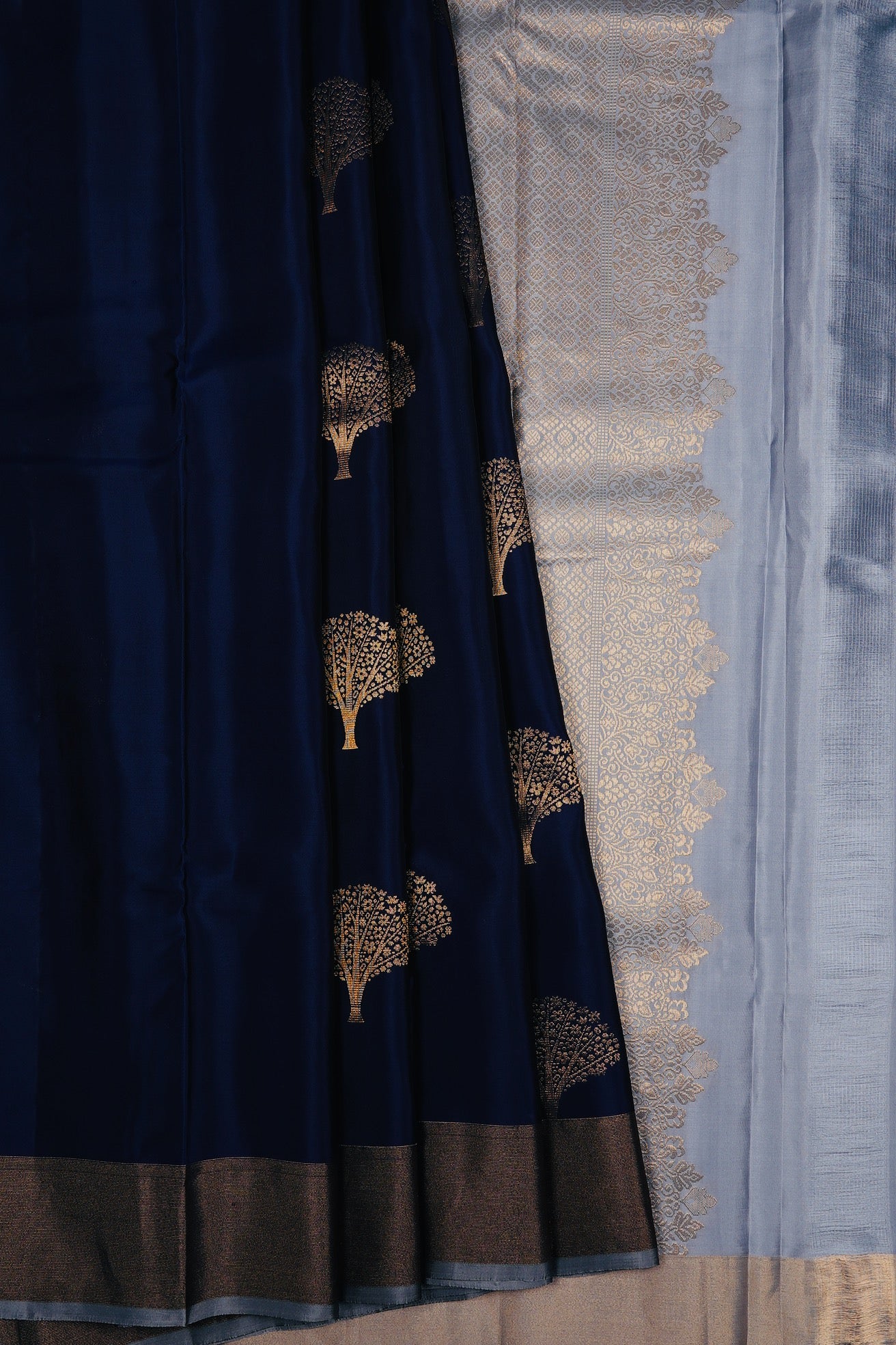 Previous NextMidnight blue silk mix saree with elegant tree motifs woven with intricate details in gold zari throughout the body and a simple bands of gold zari as its border followed by a thin bad of dusty blue. The pallu has a slate blue base with an expanse of diamond lattice pattern enclosing diamond and rudraksham bhuttas woven in gold zari, followed by a rich space of intricate kodi and floral motifs woven in gold zari. The saree has a plain dusty blue blouse with the same border.