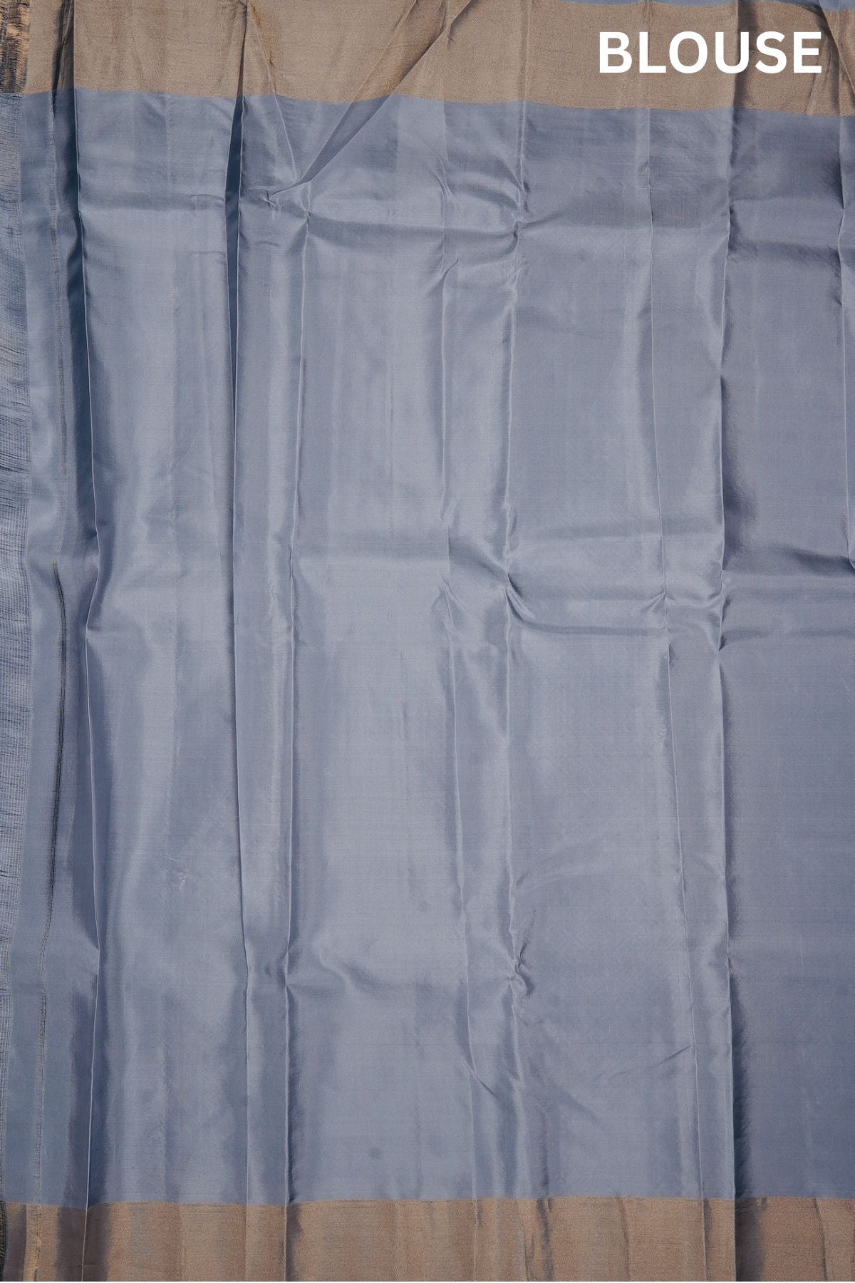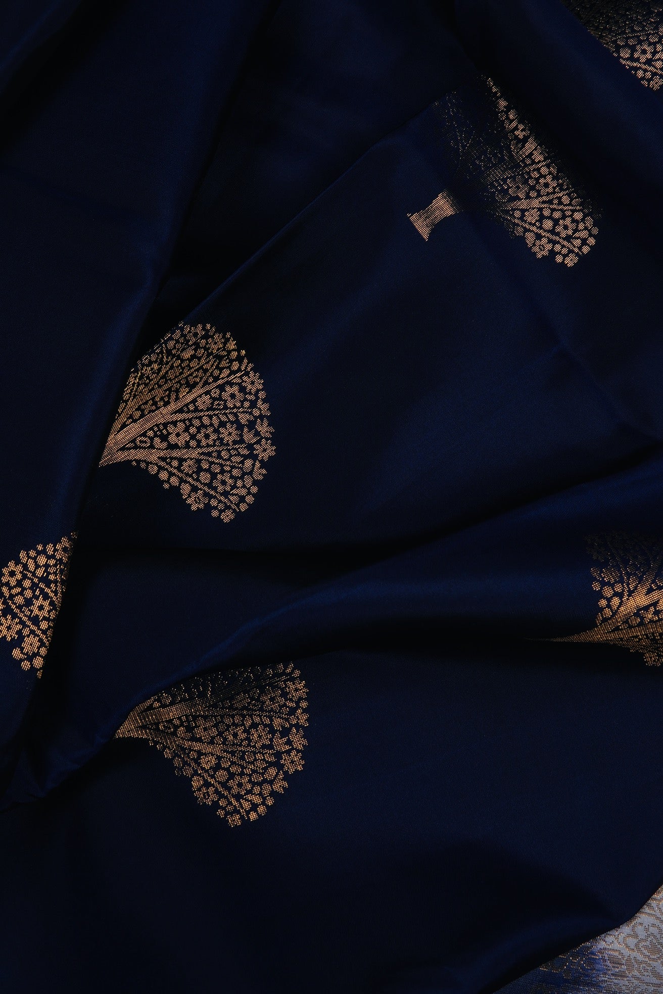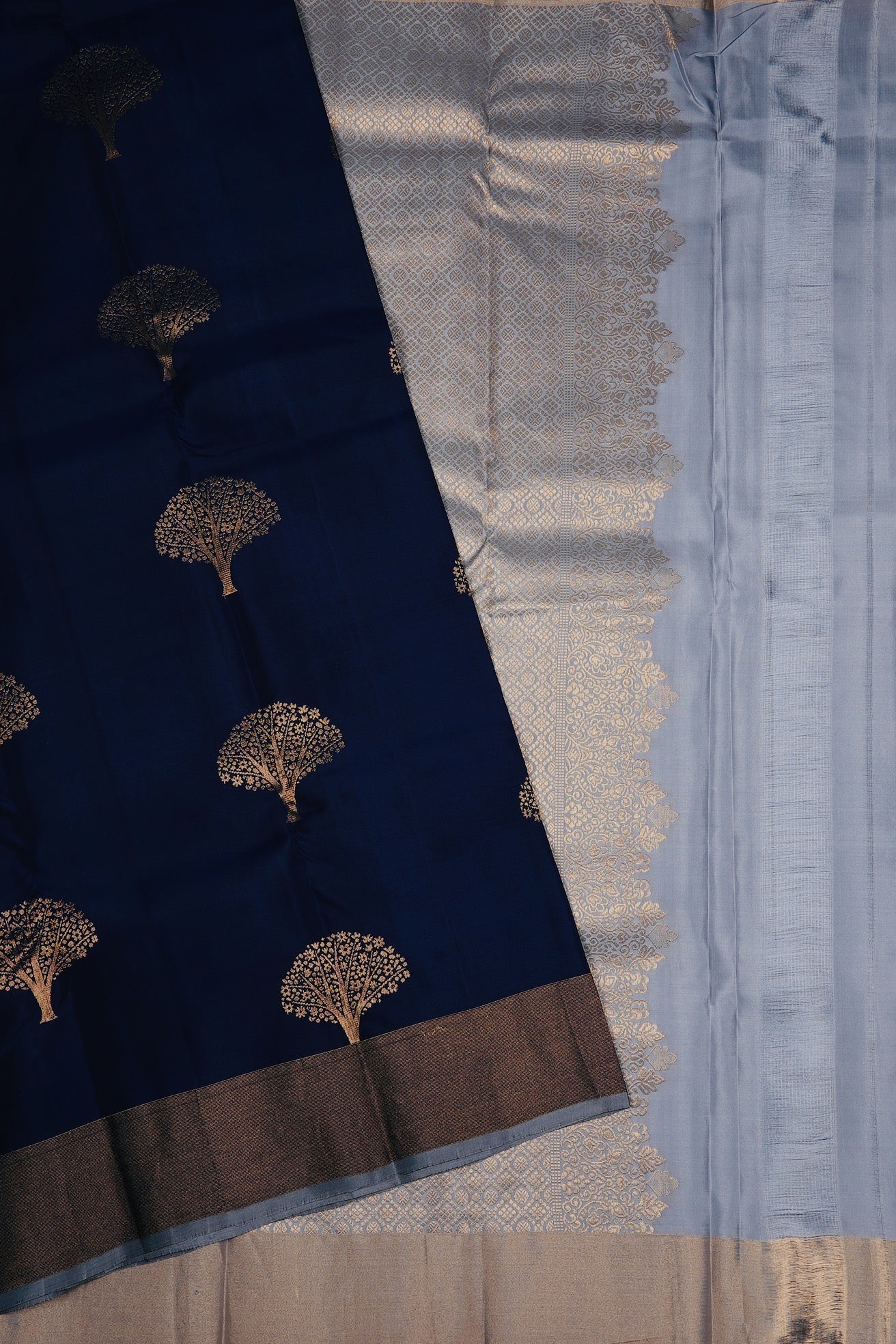 Previous NextMidnight blue silk mix saree with elegant tree motifs woven with intricate details in gold zari throughout the body and a simple bands of gold zari as its border followed by a thin bad of dusty blue. The pallu has a slate blue base with an expanse of diamond lattice pattern enclosing diamond and rudraksham bhuttas woven in gold zari, followed by a rich space of intricate kodi and floral motifs woven in gold zari. The saree has a plain dusty blue blouse with the same border.
