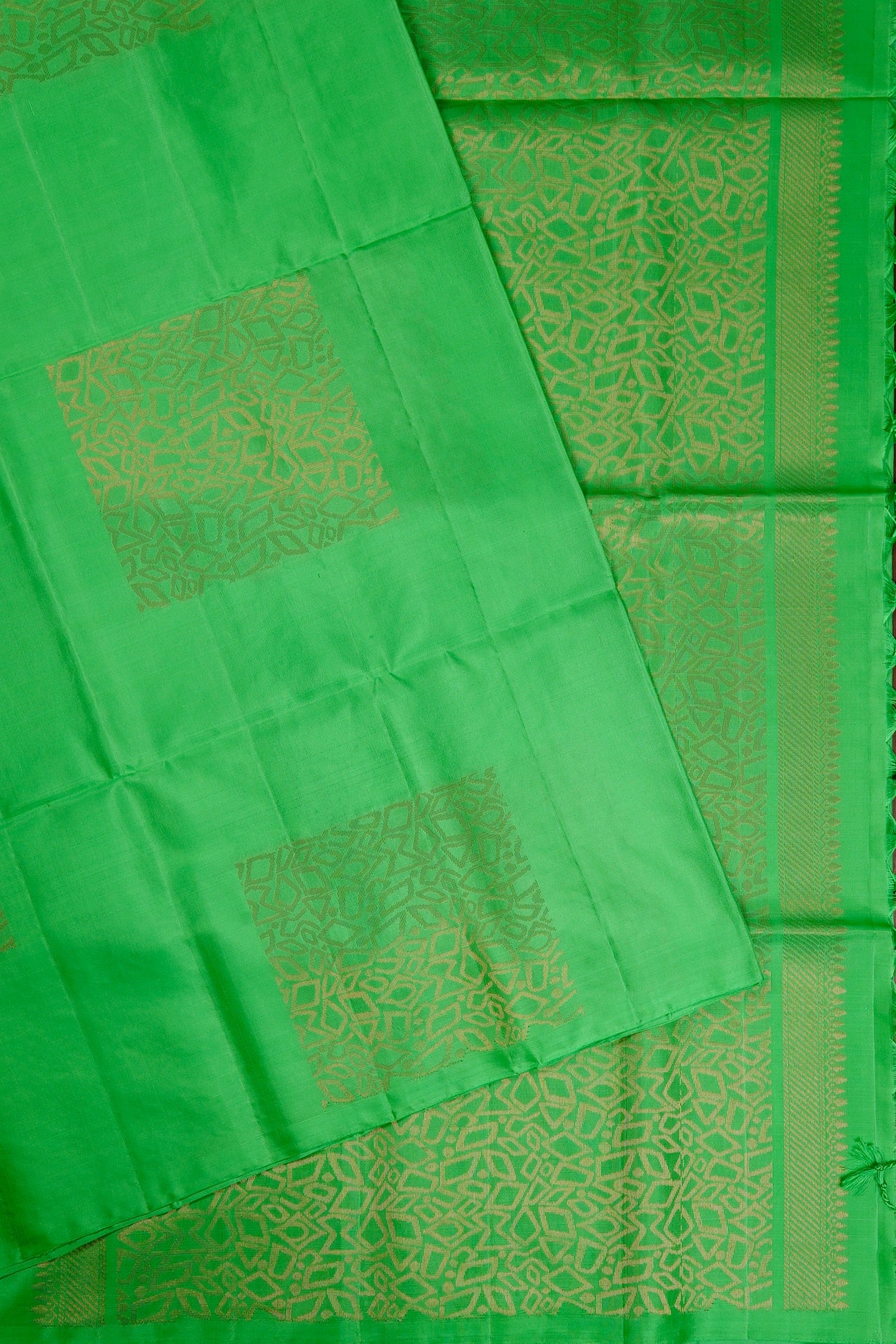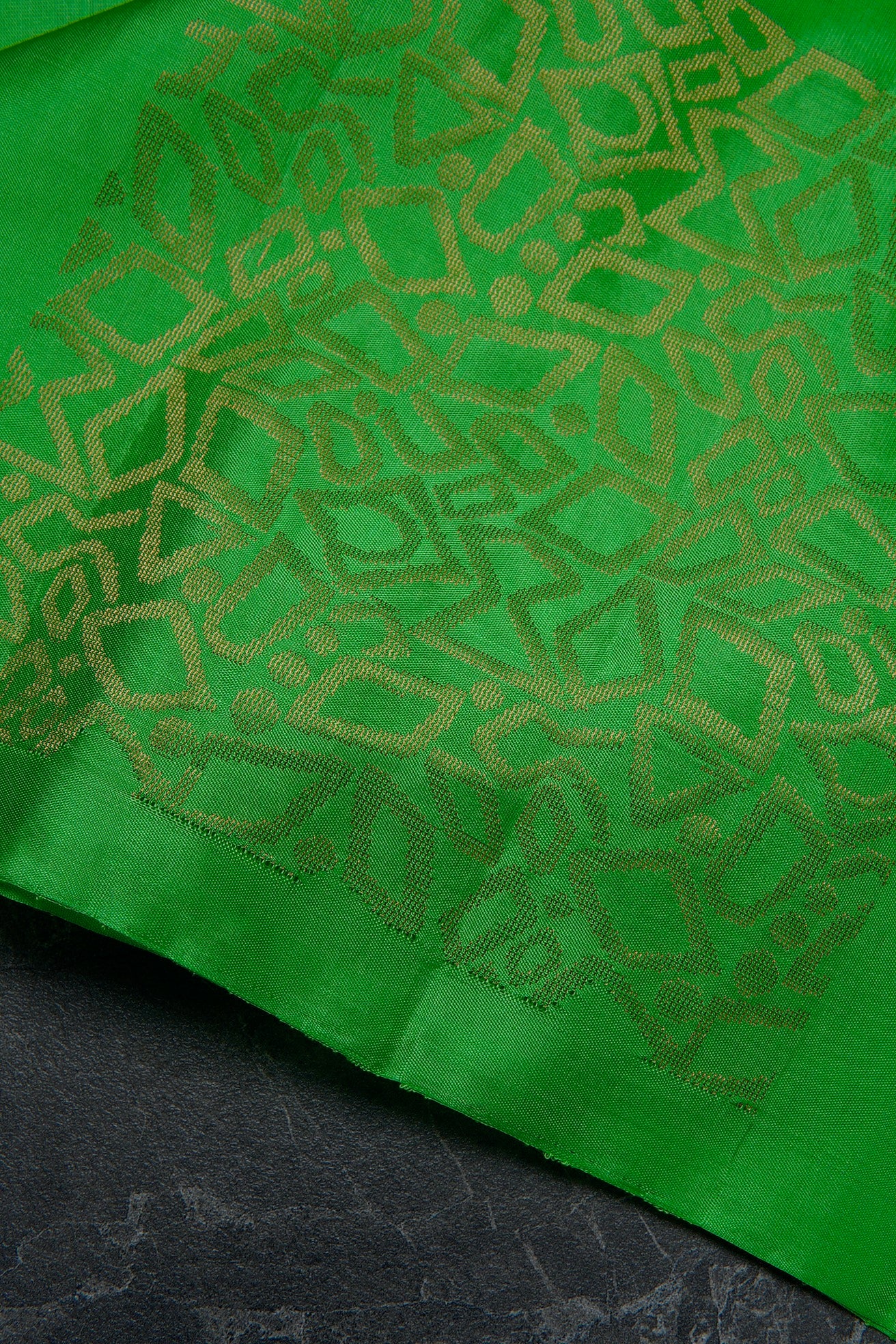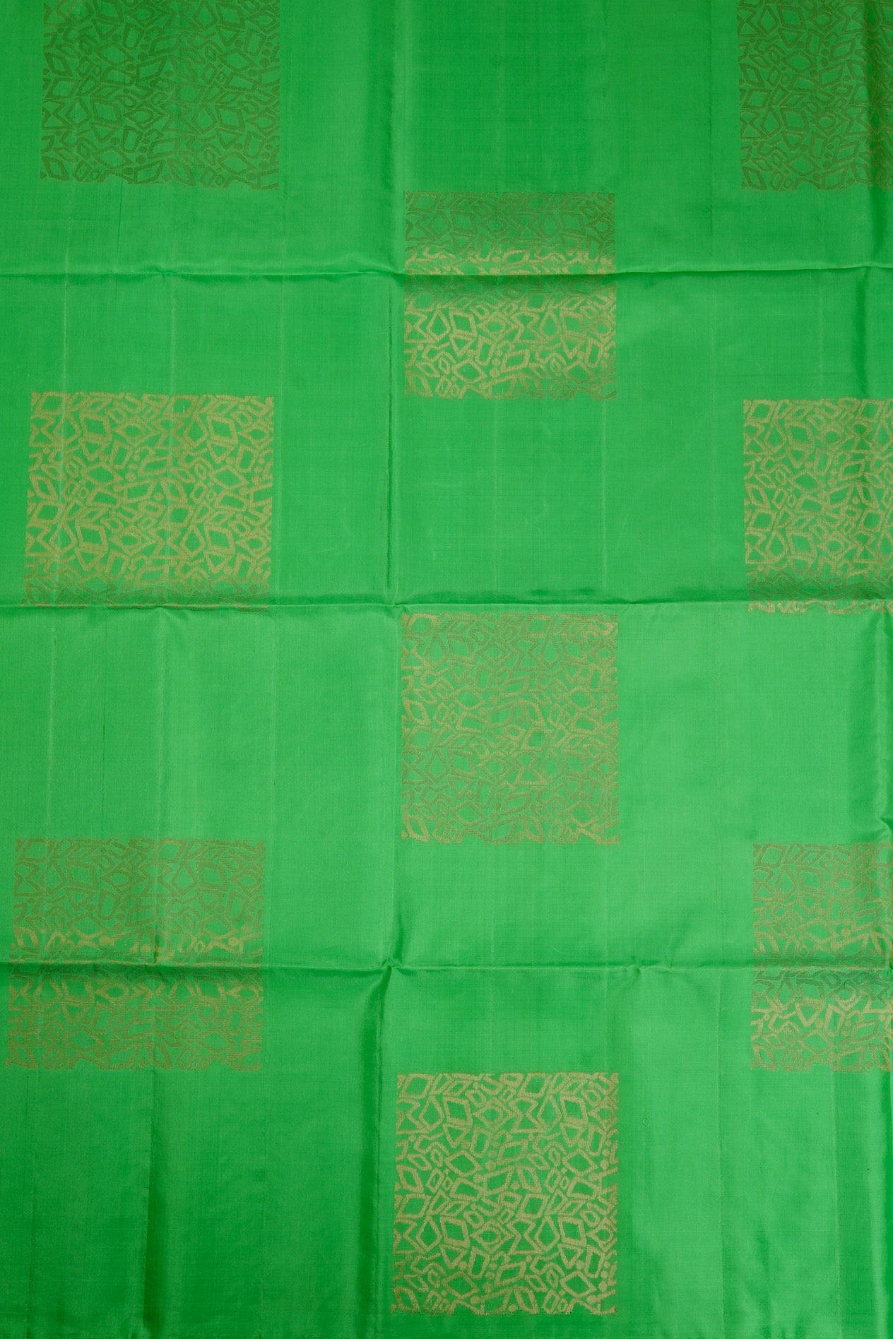 Previous NextParrot green soft silk saree with square frames filled with abstract mosaic patterns woven in gold zari. The pallu is a wide filled with these mosaic patterns, bordered by bands of diagonal zari lines woven in gold zari. The saree has a plain parrot green blouse.