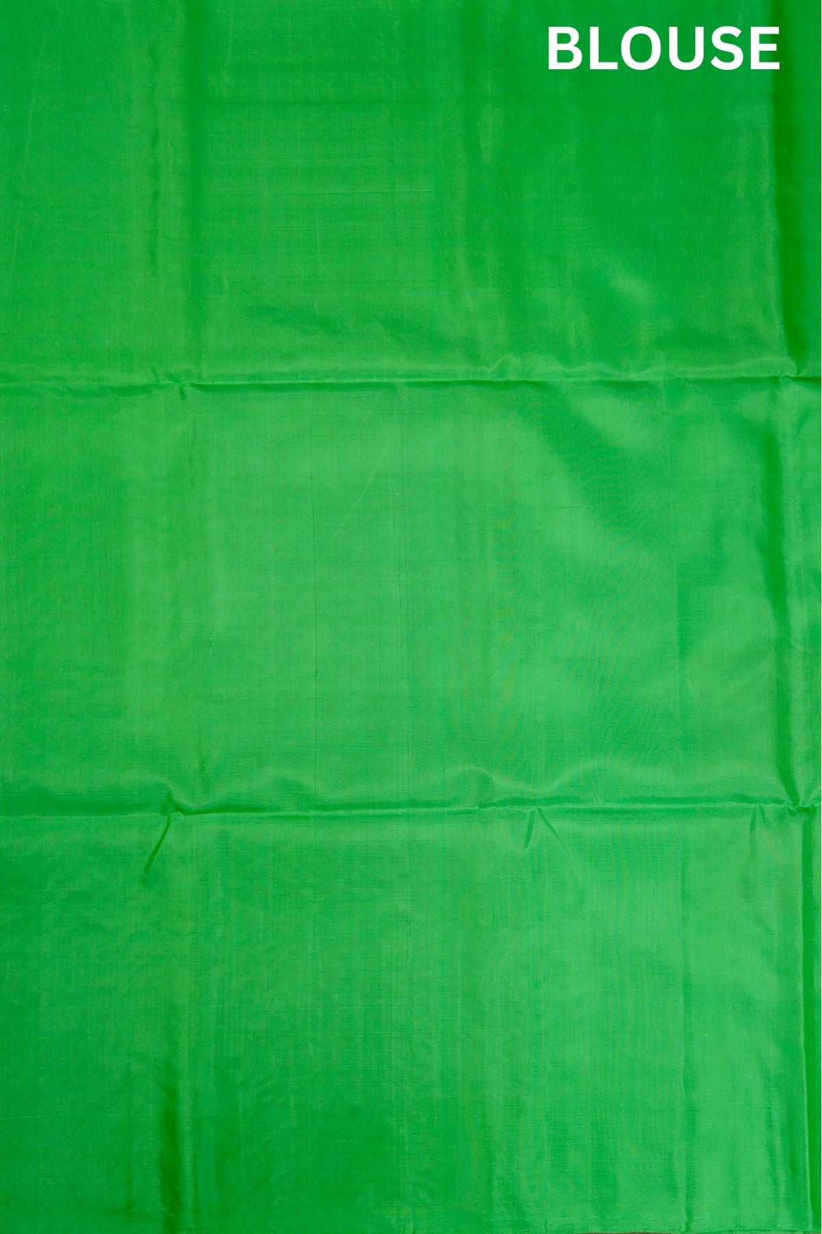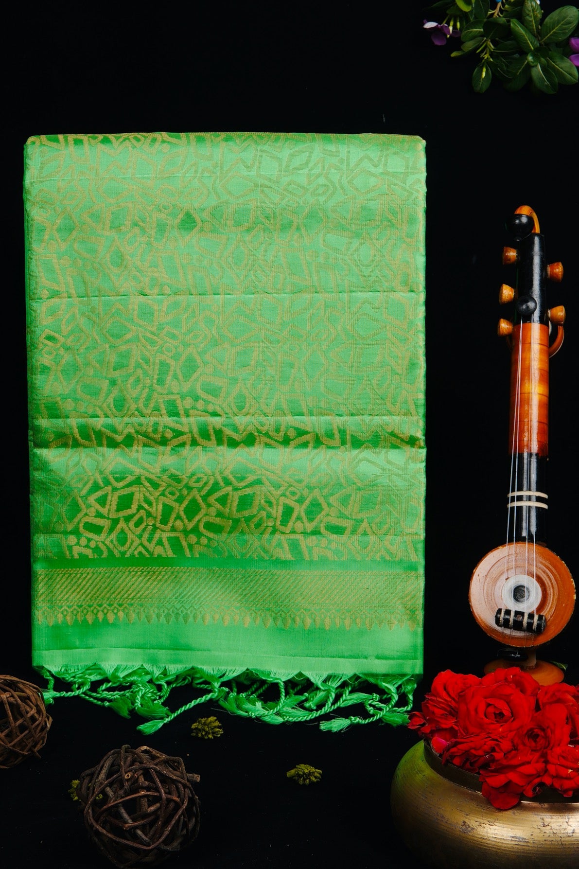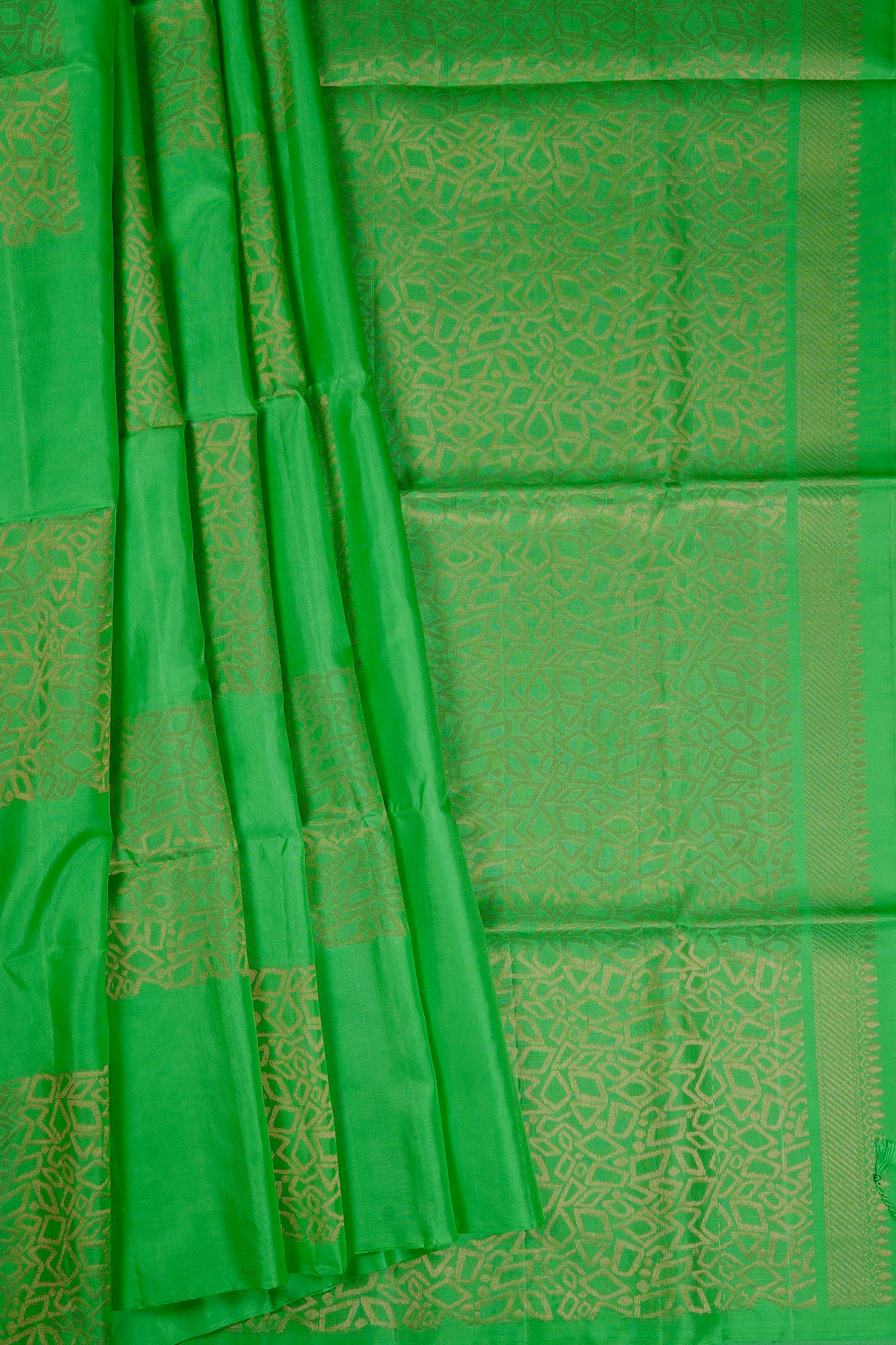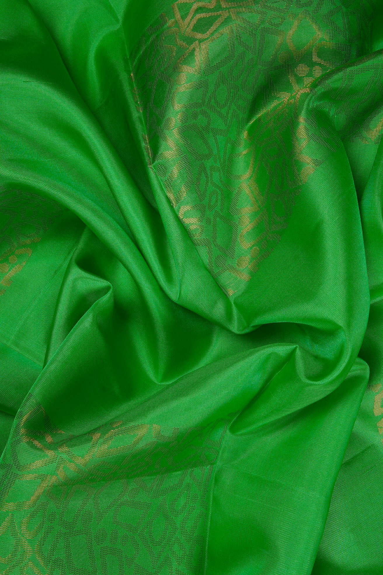 Previous NextParrot green soft silk saree with square frames filled with abstract mosaic patterns woven in gold zari. The pallu is a wide filled with these mosaic patterns, bordered by bands of diagonal zari lines woven in gold zari. The saree has a plain parrot green blouse.
