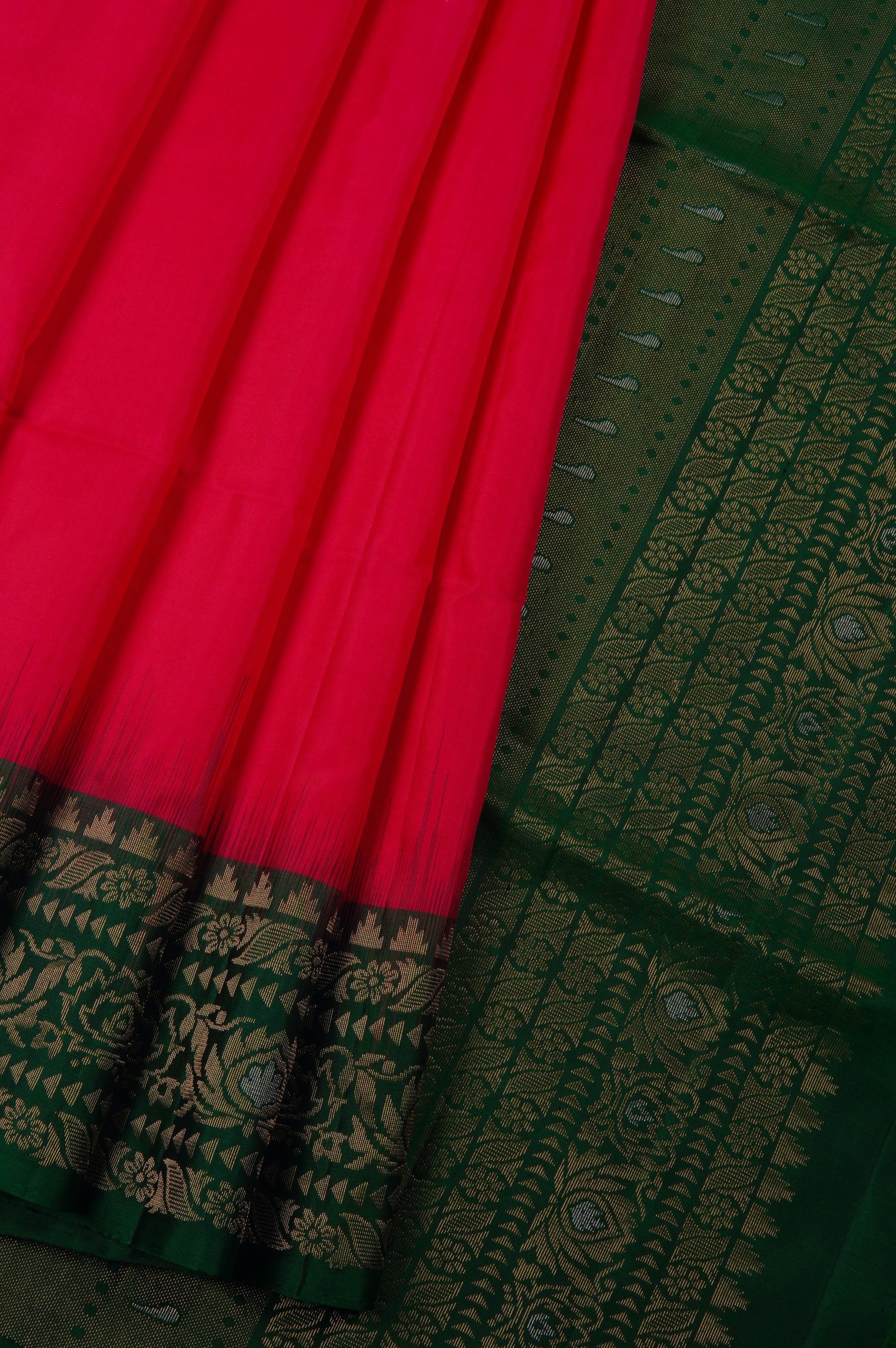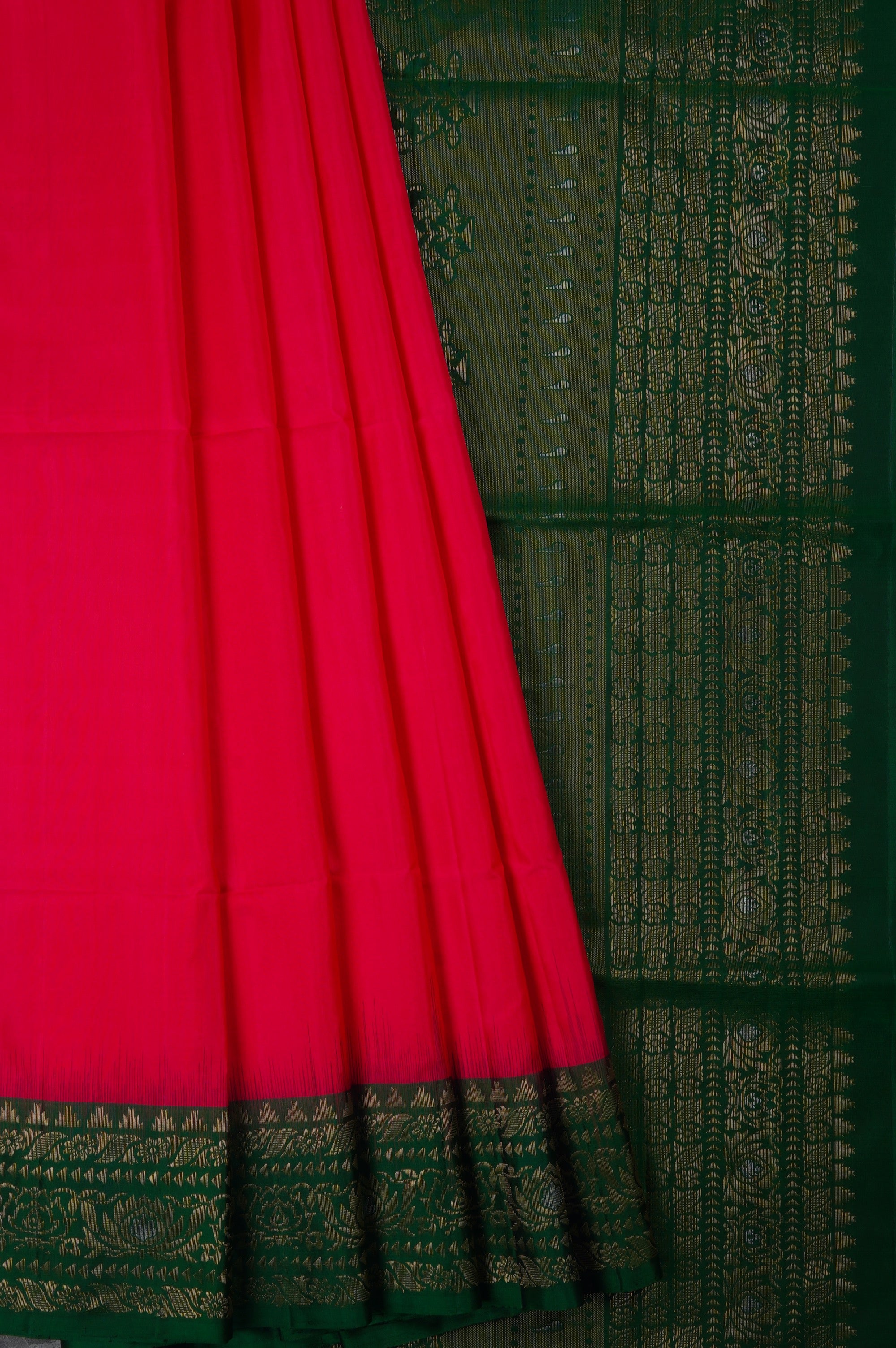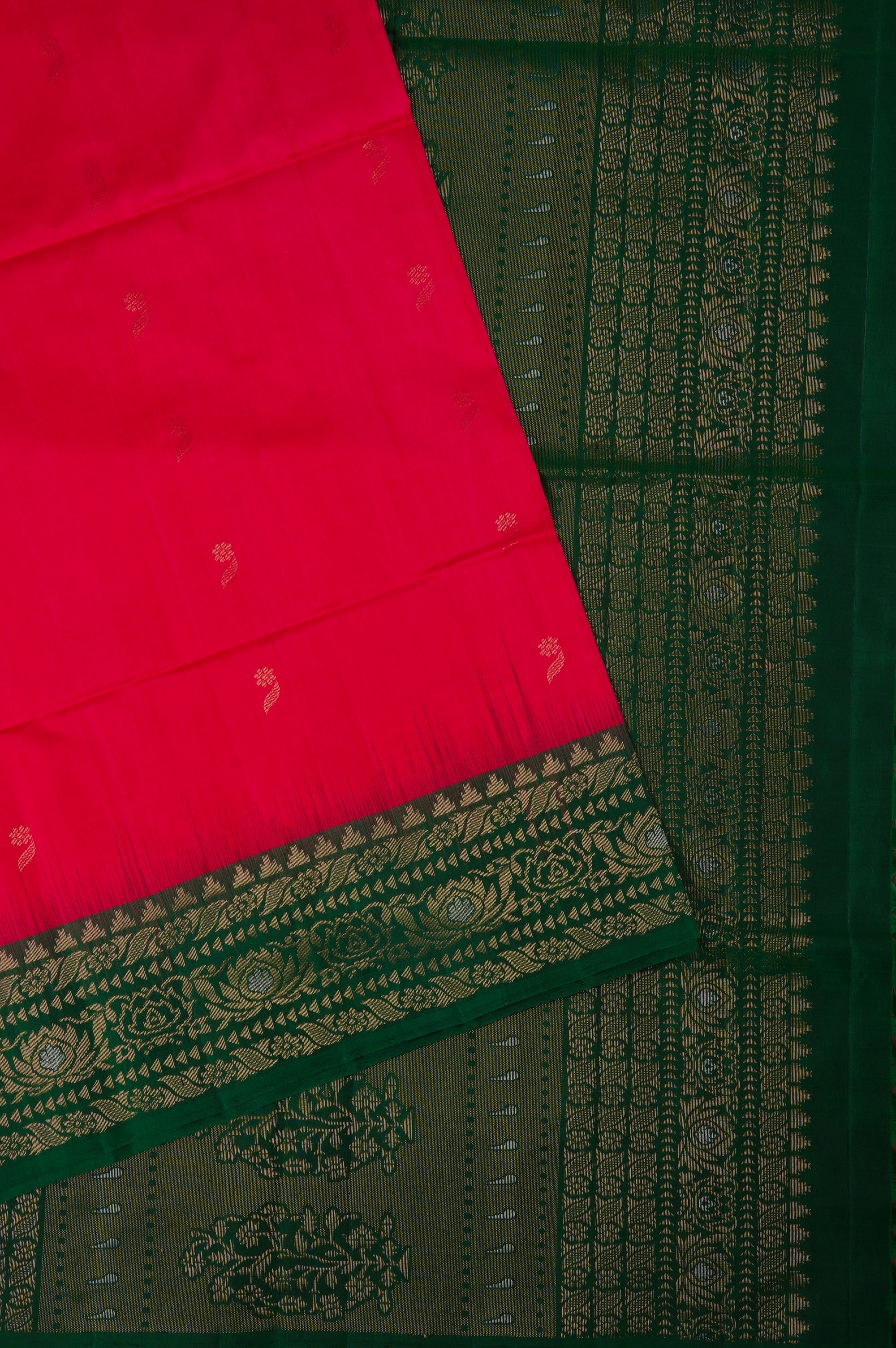 Previous NextRose red soft silk saree with small flower motifs accompanied by a single leaf woven in gold zari woven throughout the body. The border has a dark green base, starting with temple reks pattern and includes broad florals woven in gold and silver zari. The pallu has a dark green base with a double shade of gold, portraying elegant and bold plant motifs, followed by bands of floral motifs from the border woven in gold and silver zari. The saree has a solid dark green blouse.