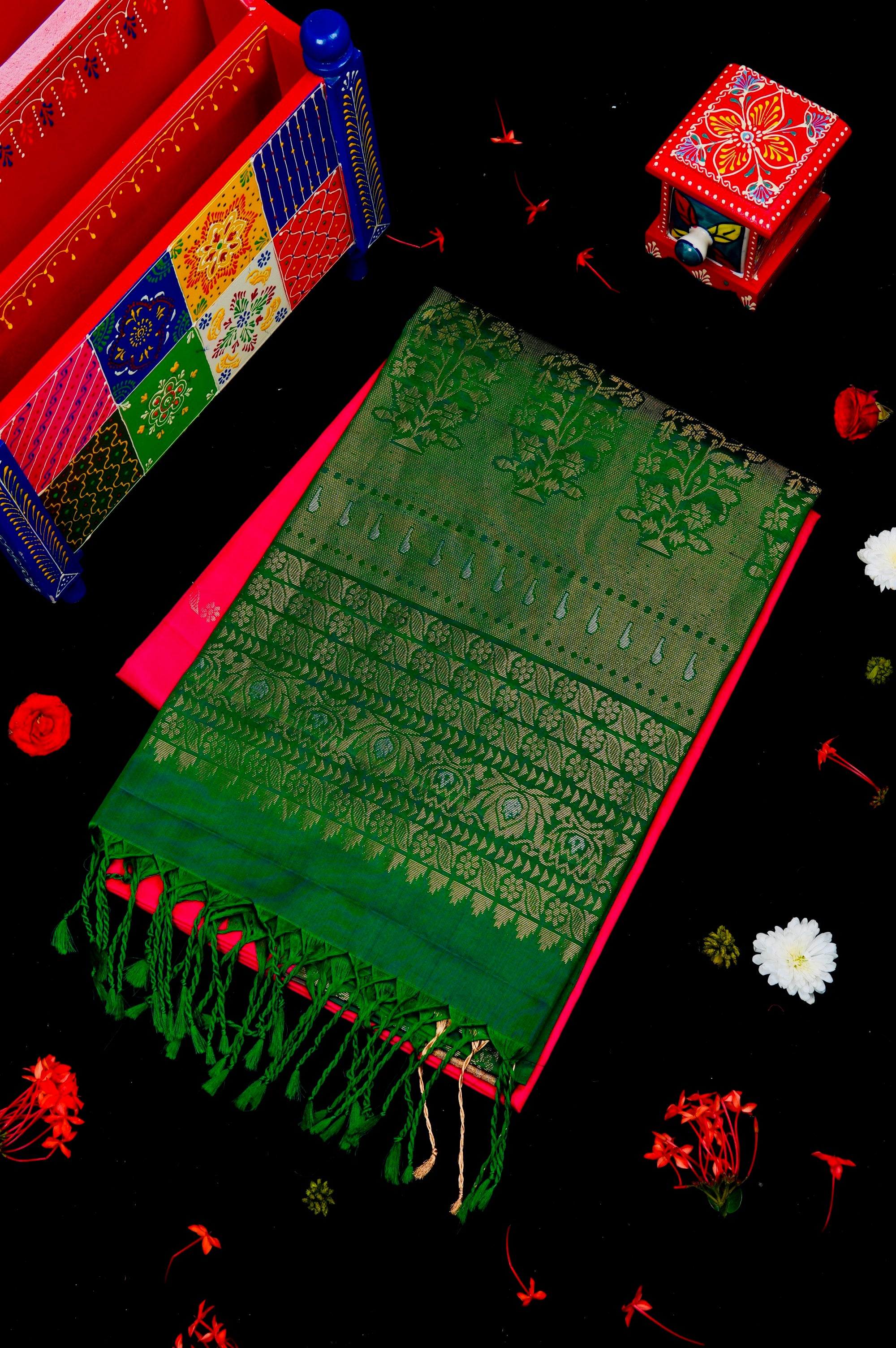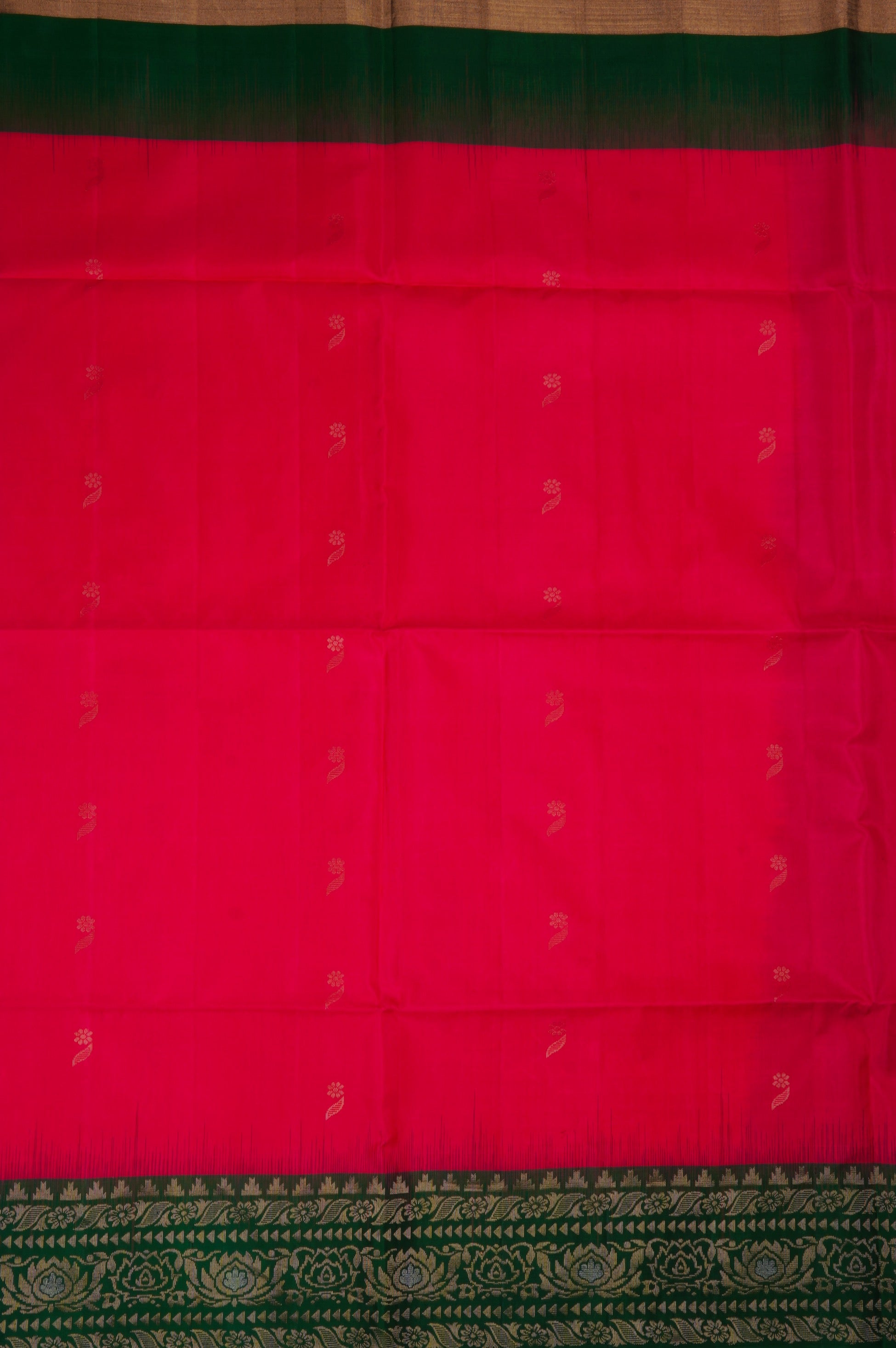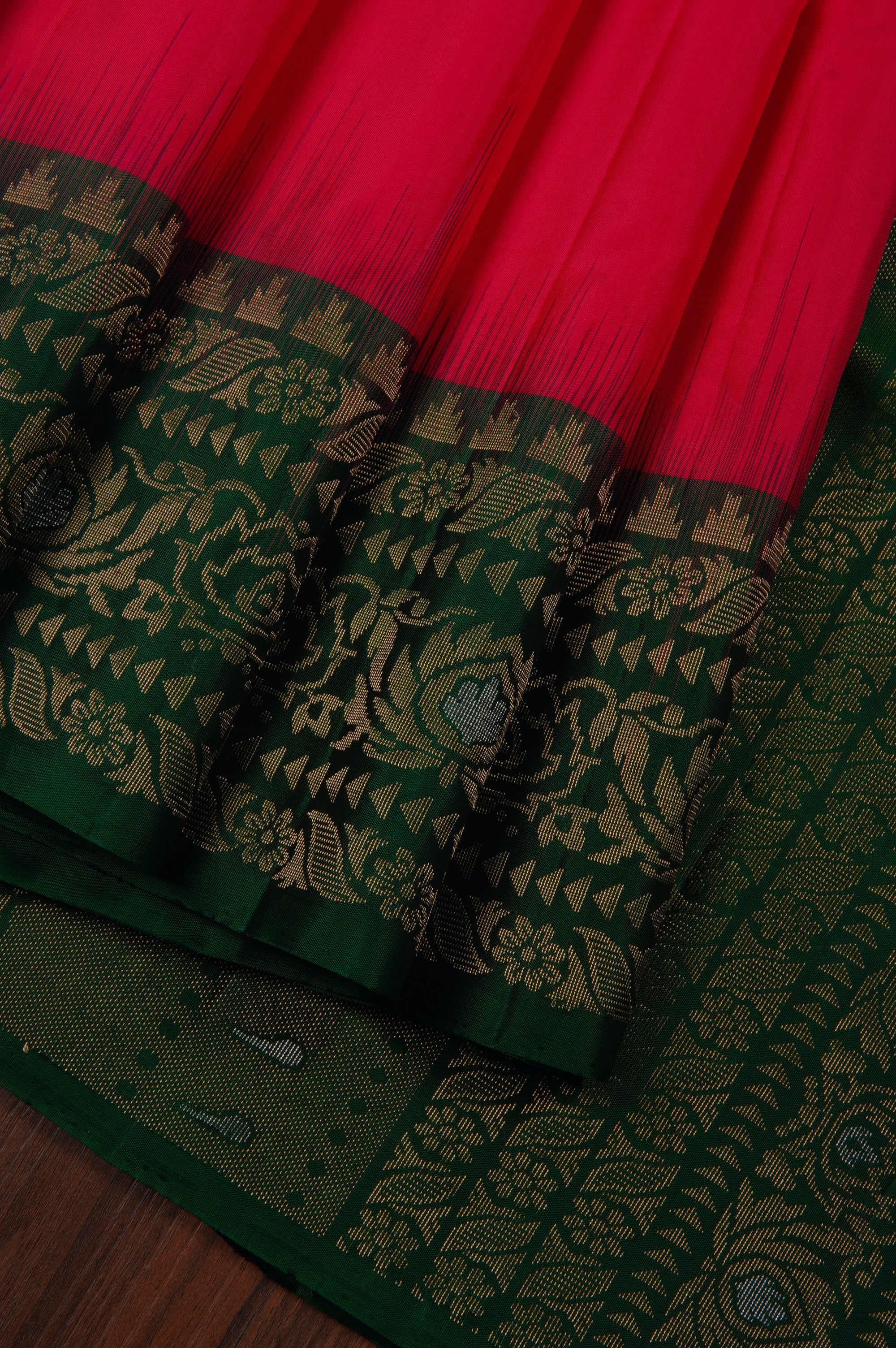 Previous NextRose red soft silk saree with small flower motifs accompanied by a single leaf woven in gold zari woven throughout the body. The border has a dark green base, starting with temple reks pattern and includes broad florals woven in gold and silver zari. The pallu has a dark green base with a double shade of gold, portraying elegant and bold plant motifs, followed by bands of floral motifs from the border woven in gold and silver zari. The saree has a solid dark green blouse.