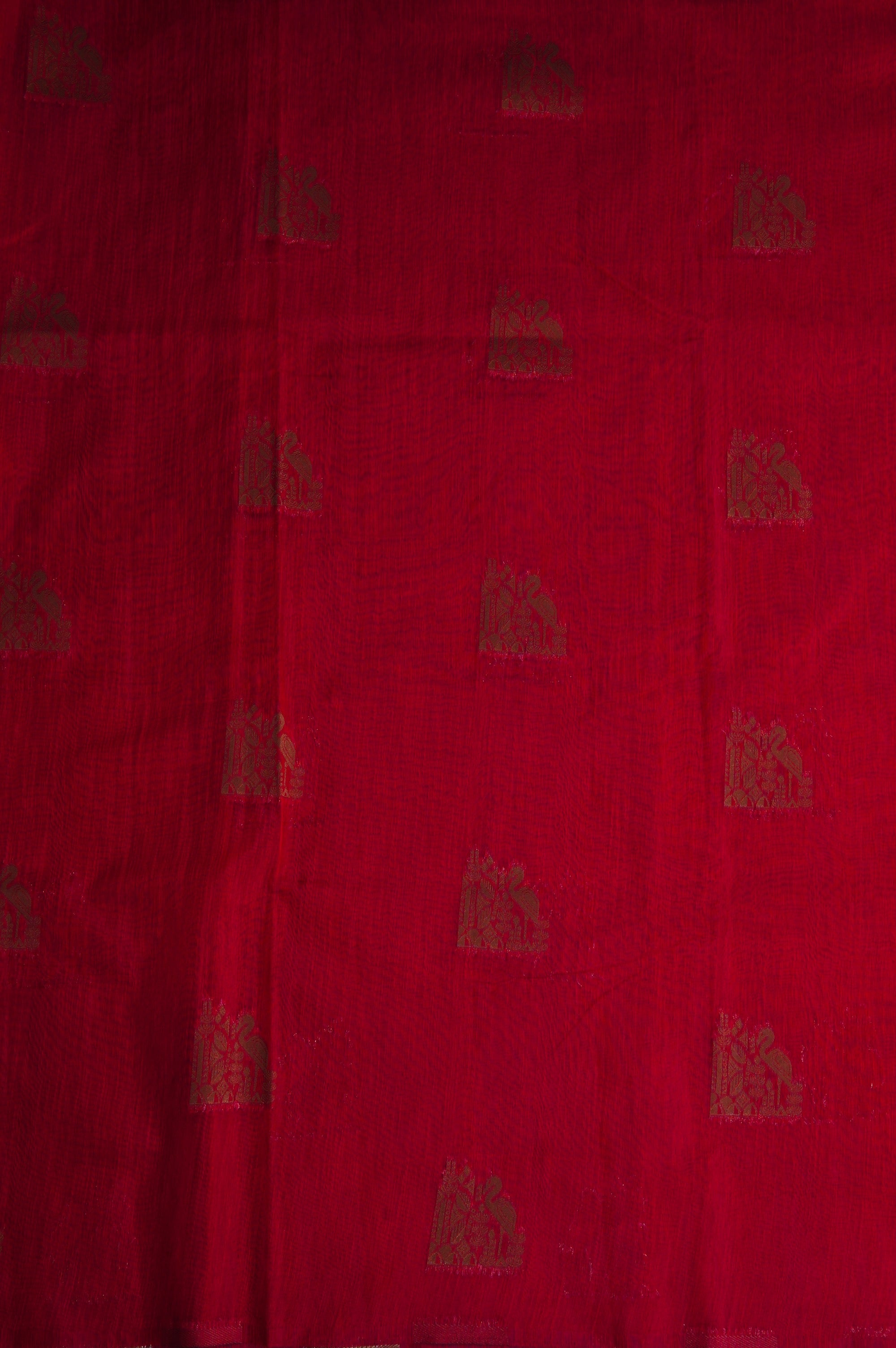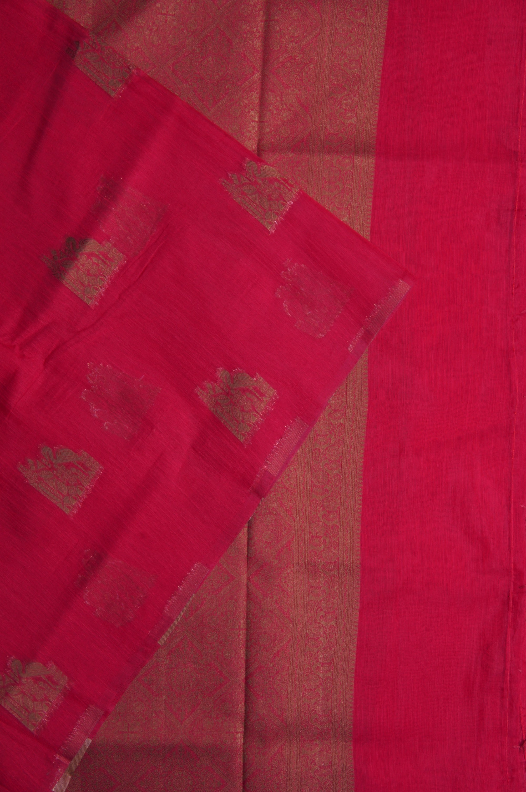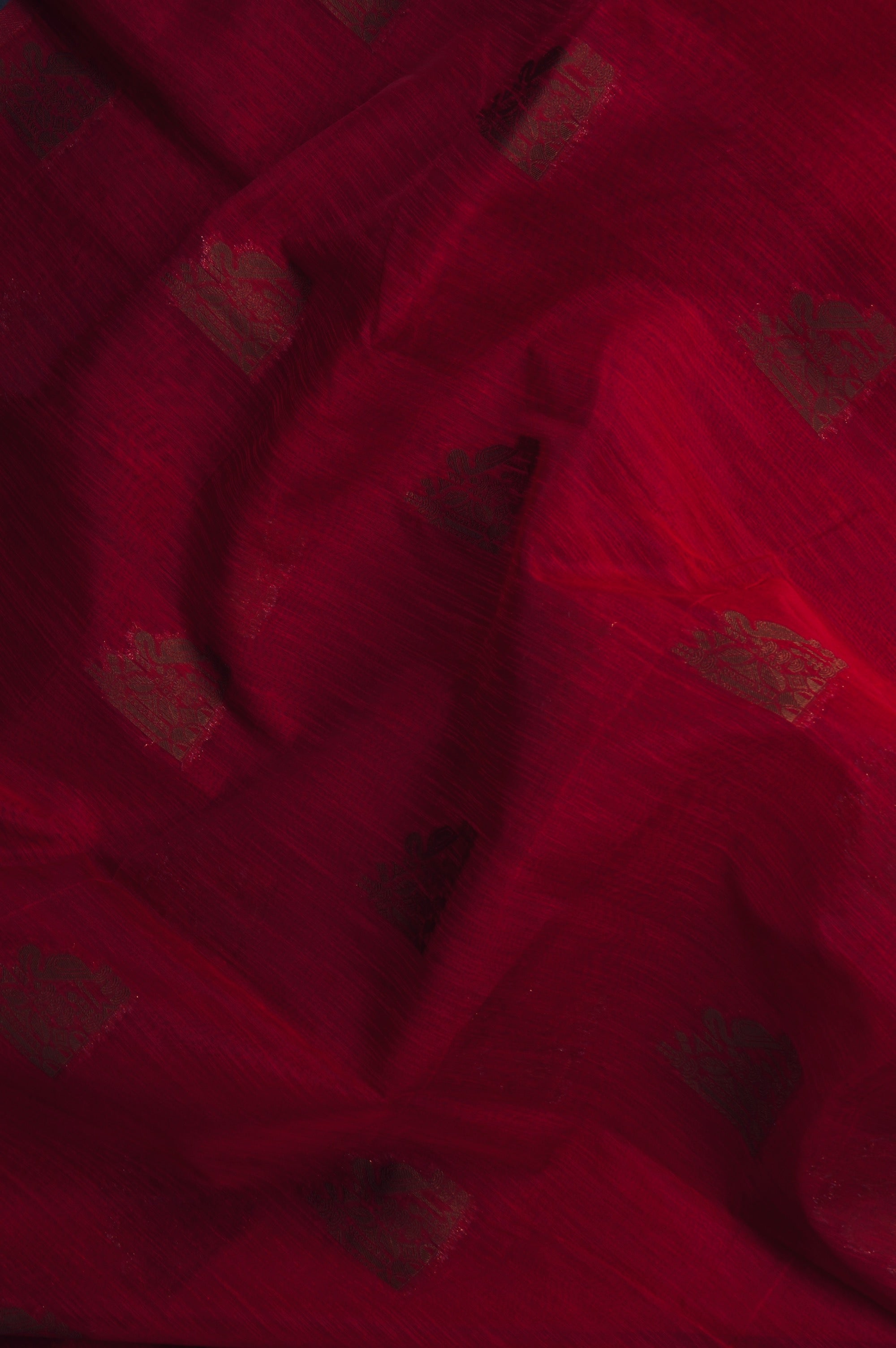 NextVivid burgundy semi linen saree with motifs resembling an egret in a field of grass and nature woven in gold zari throughout the body. The pallu has a continuous pattern of diamond frames with smaller diamonds filling them alternatively along with floral patterns, ending with a band of Kodi pattern, all woven in zari. The saree has a solid vivid burgundy blouse with the same border.