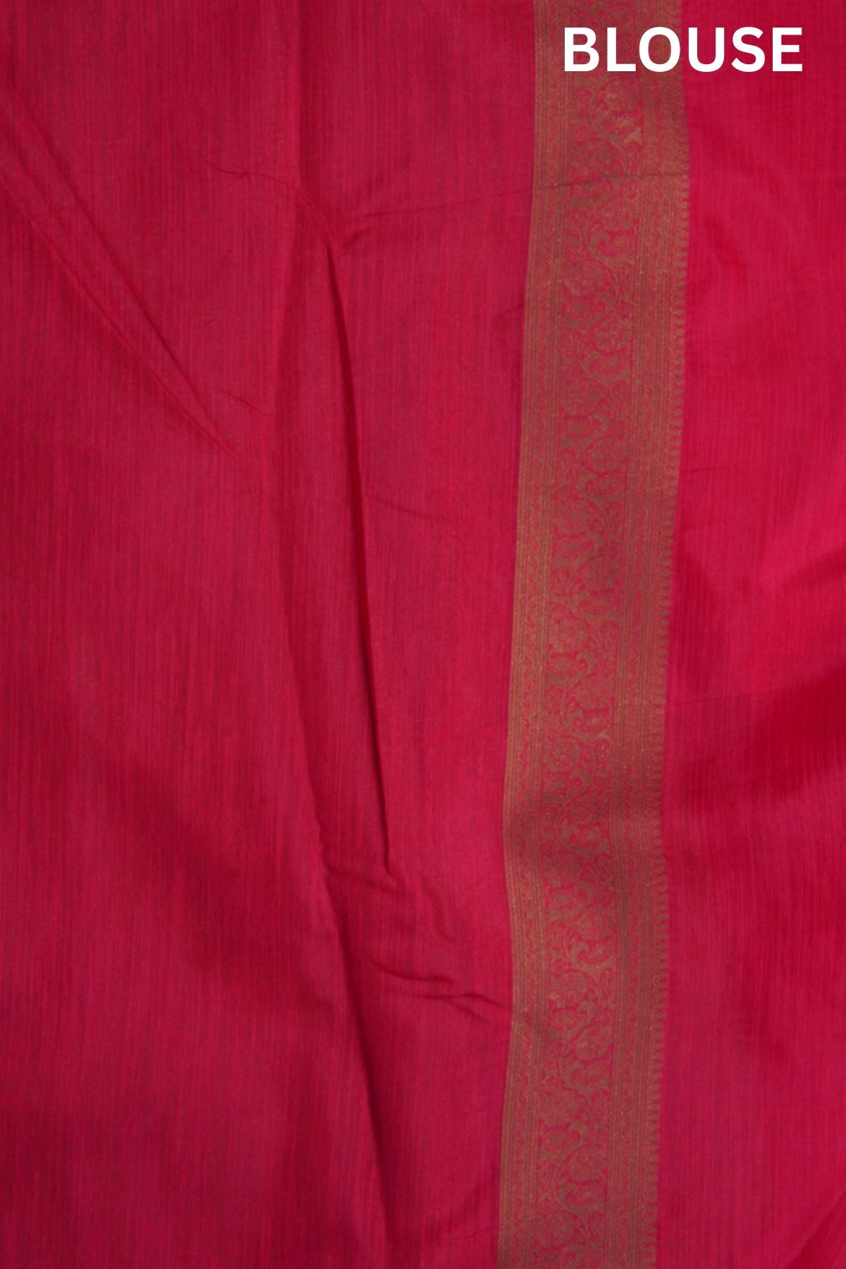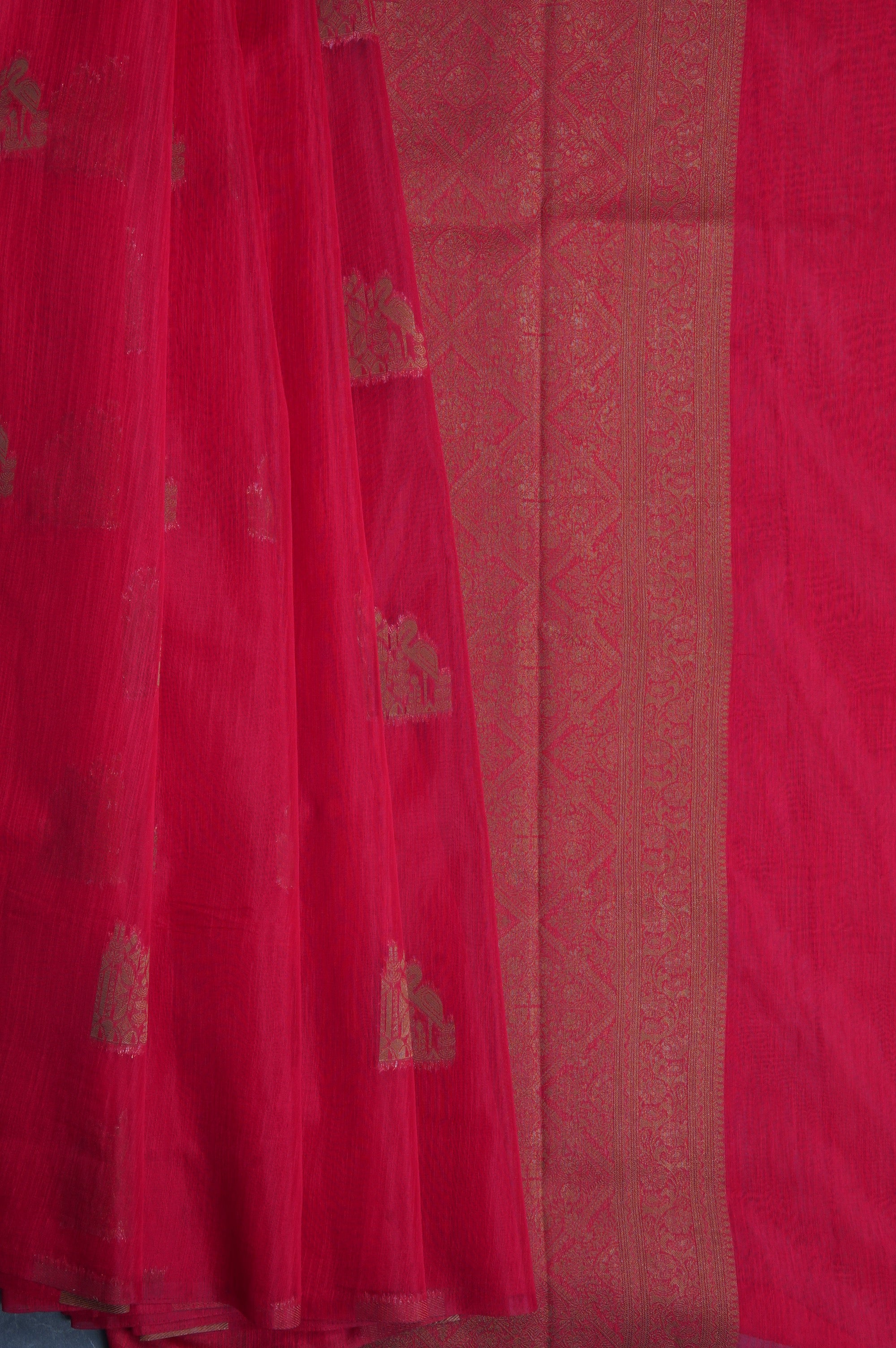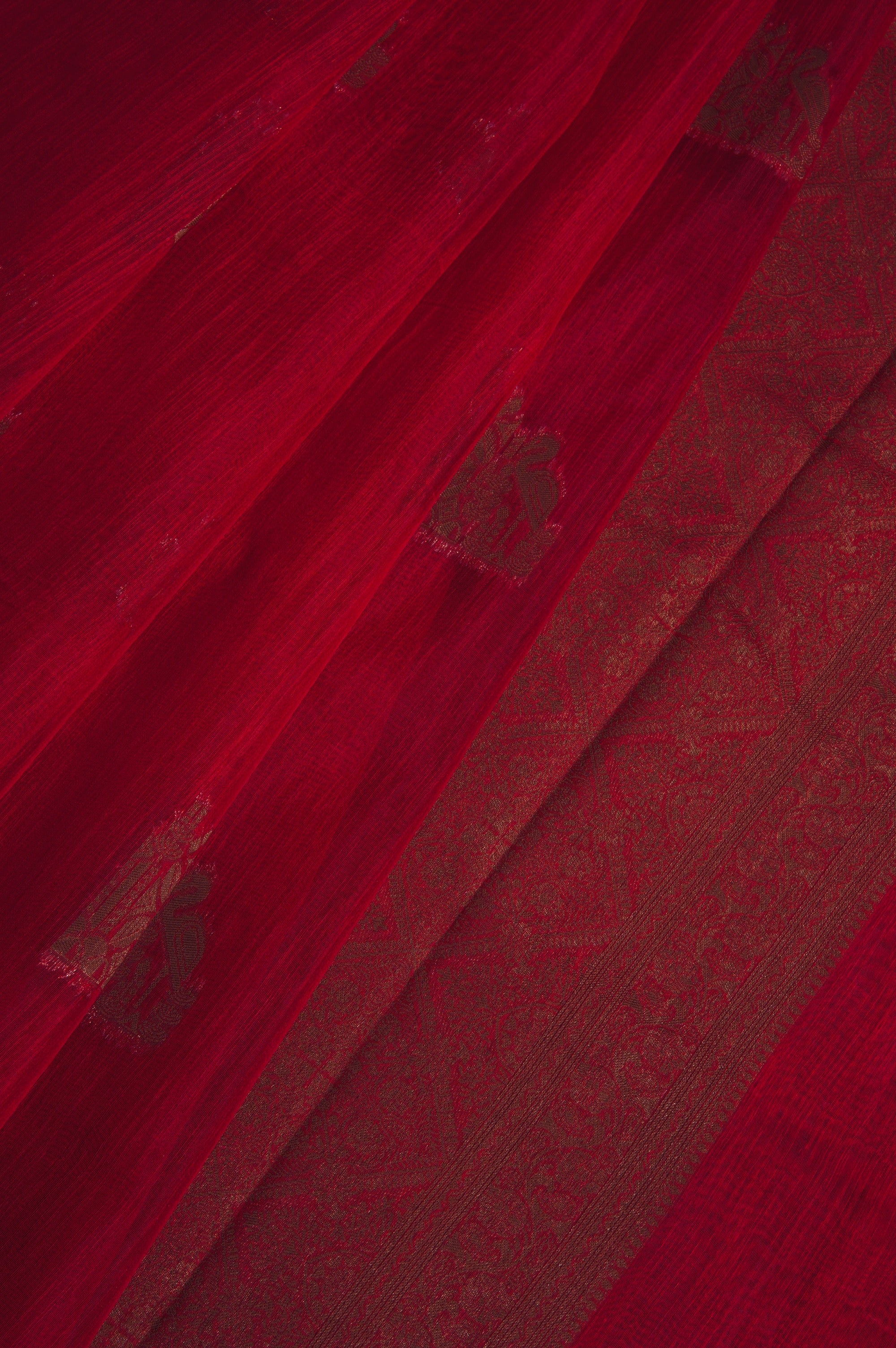 NextVivid burgundy semi linen saree with motifs resembling an egret in a field of grass and nature woven in gold zari throughout the body. The pallu has a continuous pattern of diamond frames with smaller diamonds filling them alternatively along with floral patterns, ending with a band of Kodi pattern, all woven in zari. The saree has a solid vivid burgundy blouse with the same border.