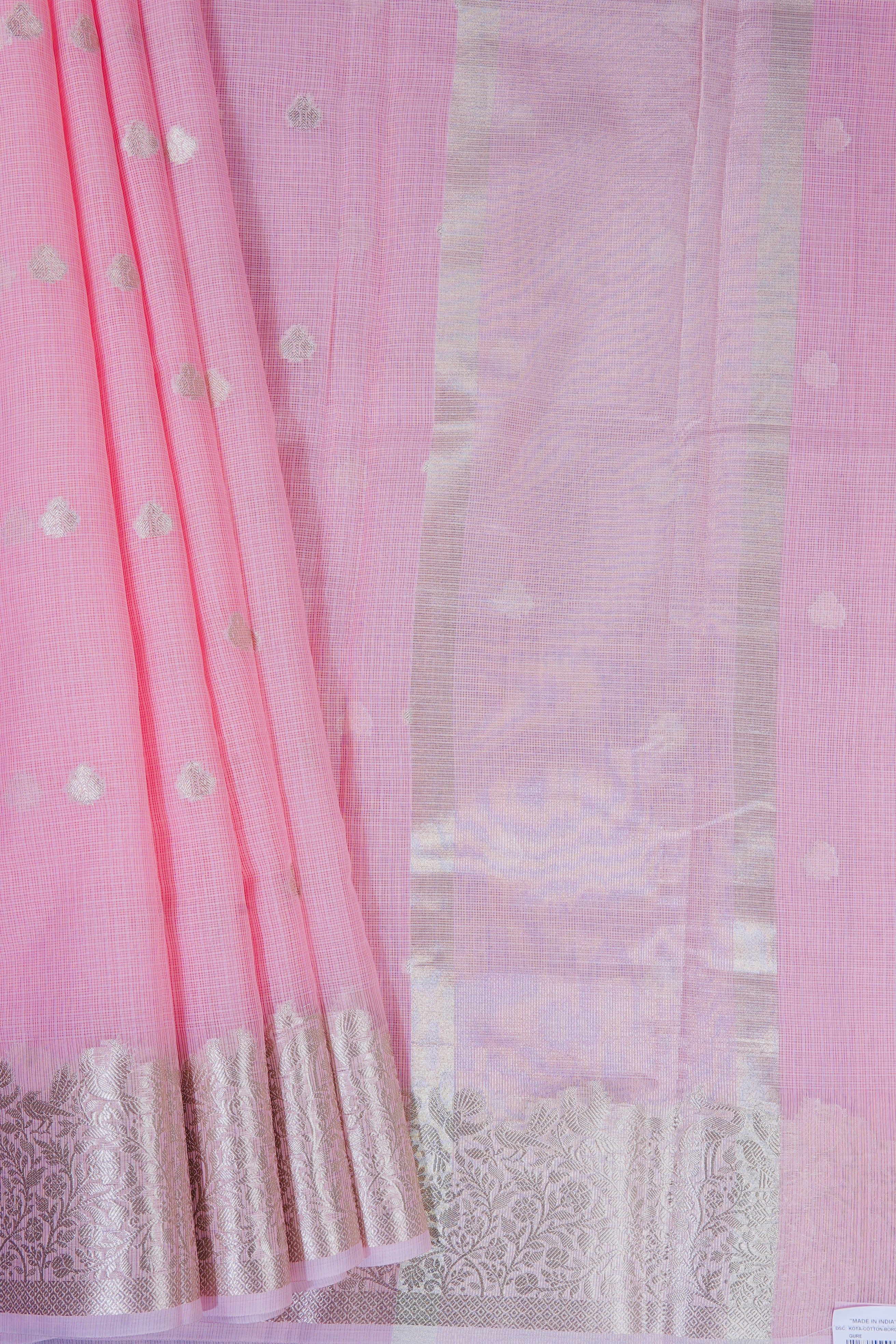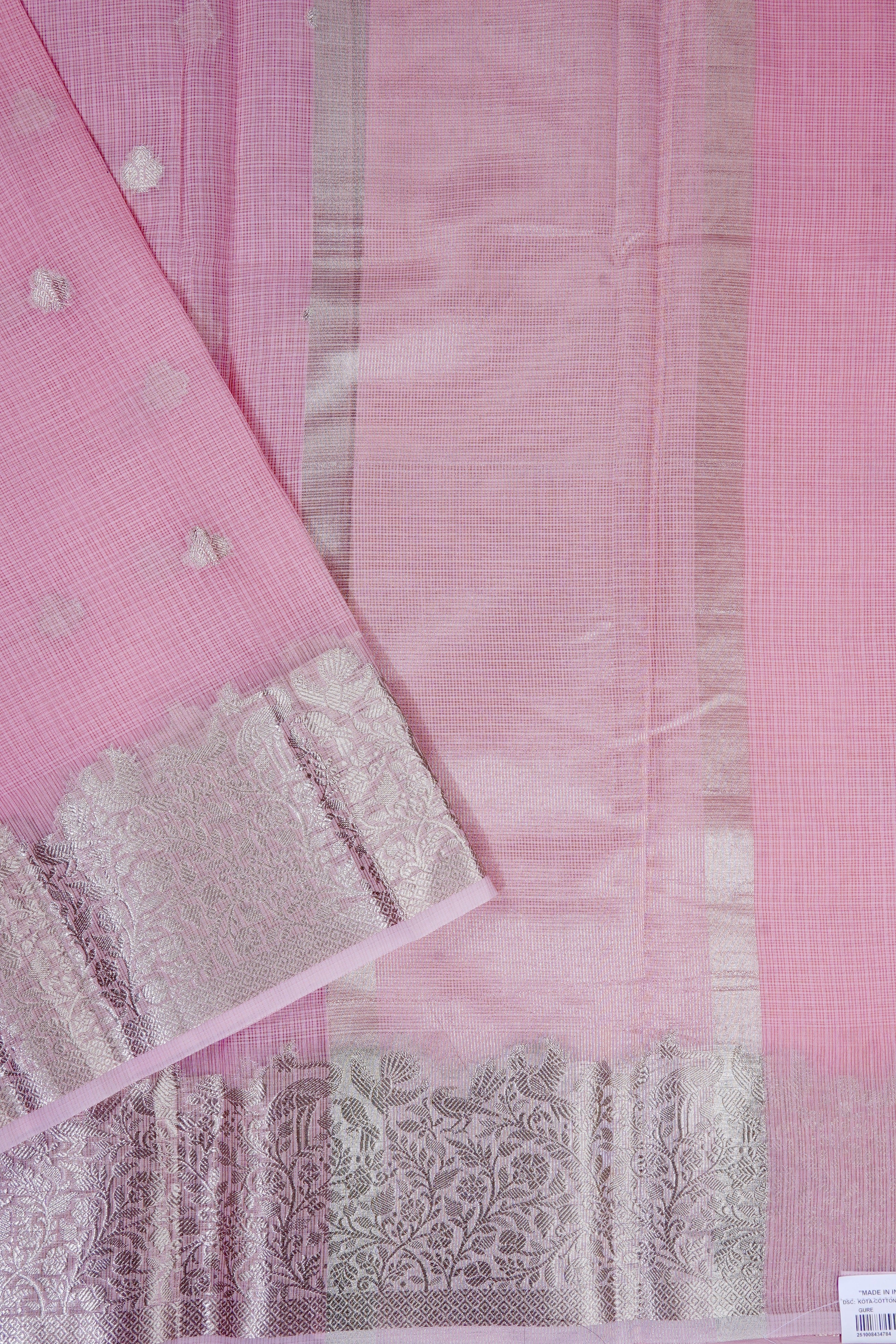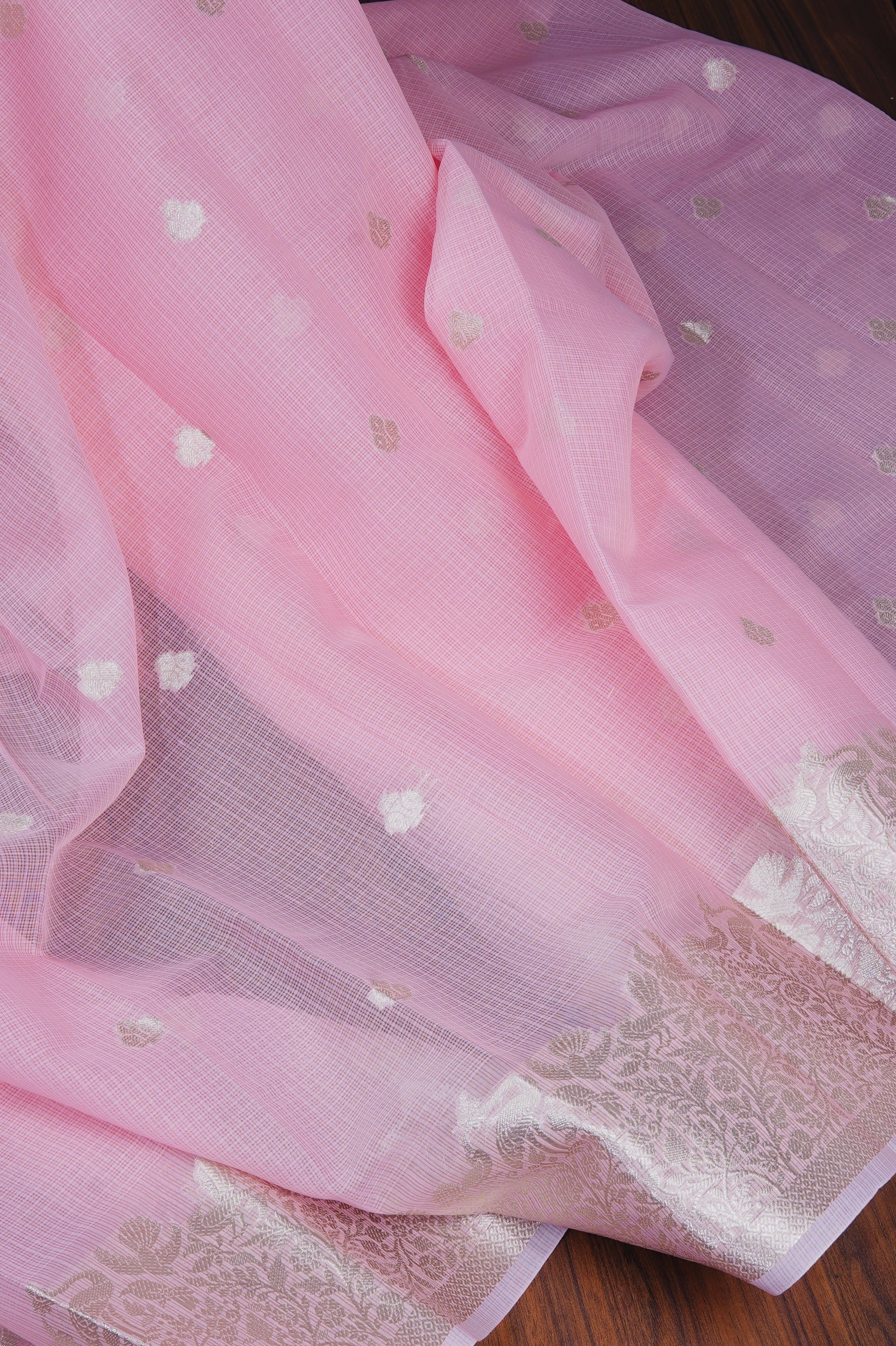 Baby pink supernet saree with small floral bhuttas woven in silver zari on the body. The border is an expanse of floral and tree motifs with birds resting on the top, bordered by a thin band of diamond lattice pattern woven in silver zari. The saree has a short pallu with thin silver zari stripes bordered by bands of silver zari. The blouse is solid baby pink with the same border.
