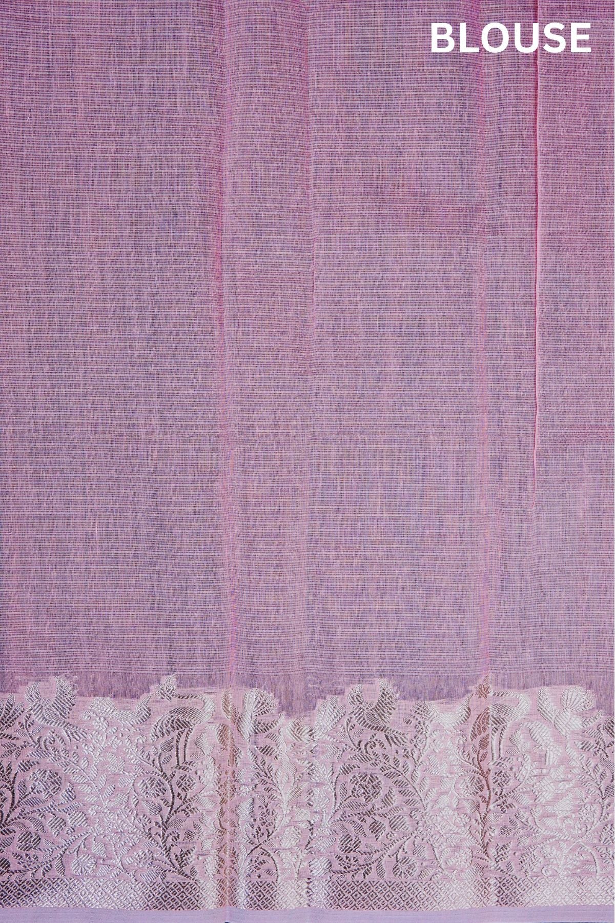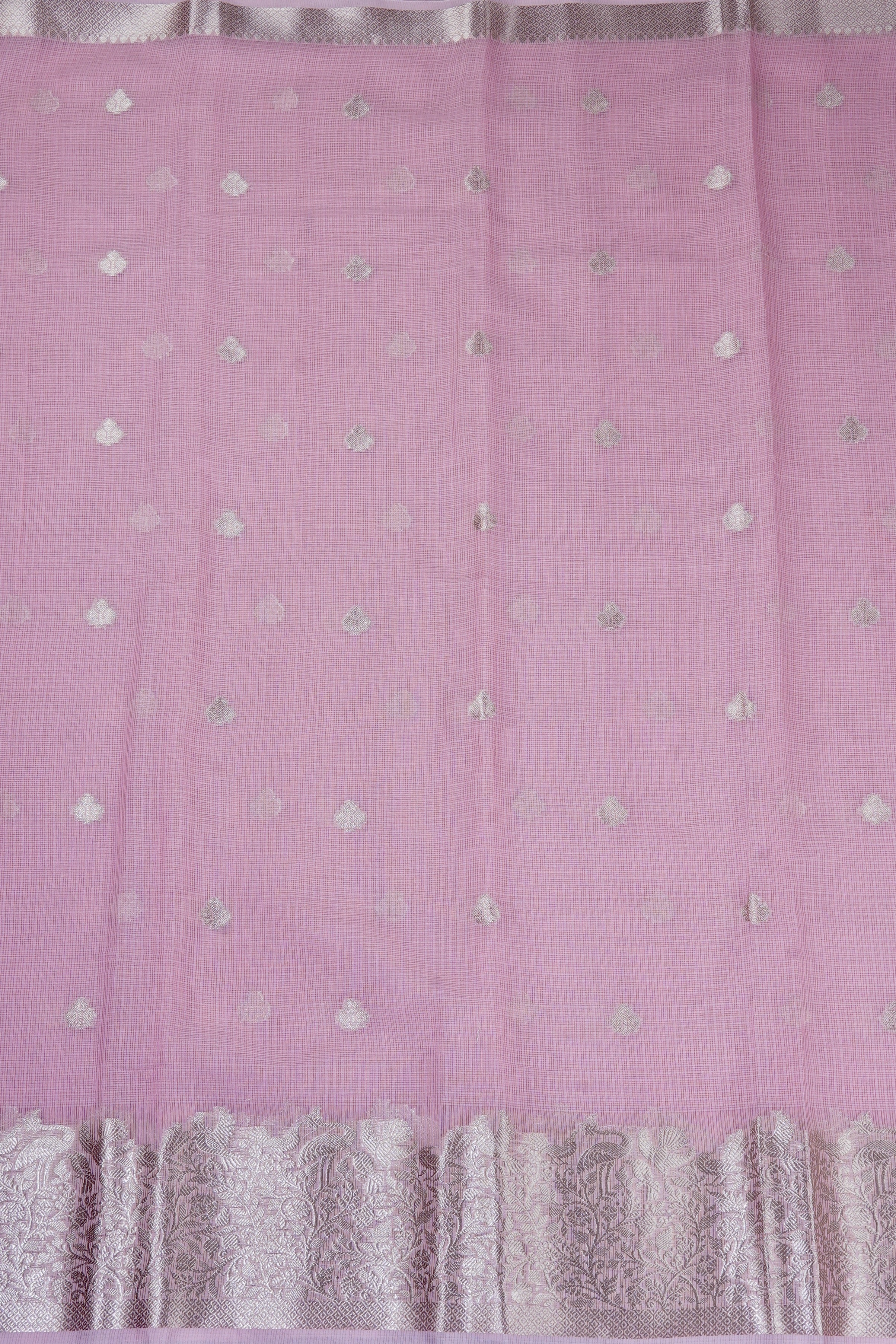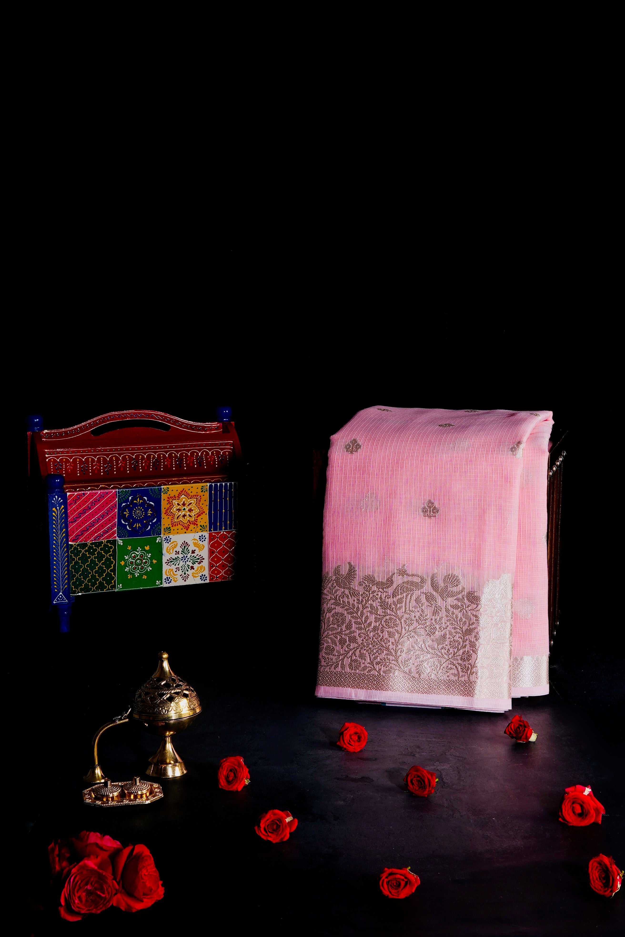 Baby pink supernet saree with small floral bhuttas woven in silver zari on the body. The border is an expanse of floral and tree motifs with birds resting on the top, bordered by a thin band of diamond lattice pattern woven in silver zari. The saree has a short pallu with thin silver zari stripes bordered by bands of silver zari. The blouse is solid baby pink with the same border.