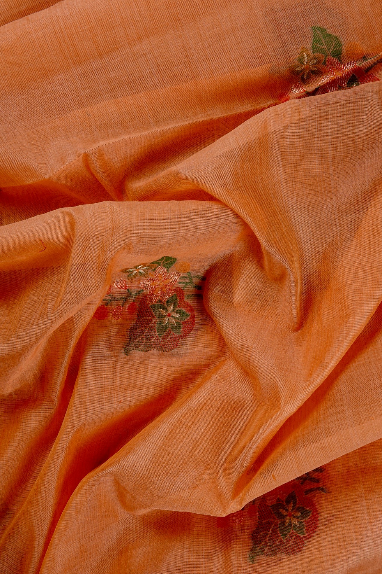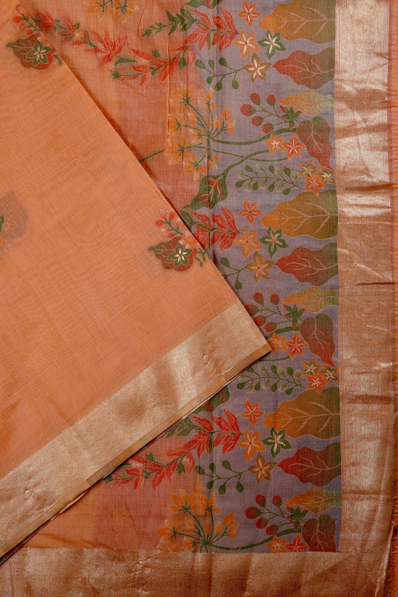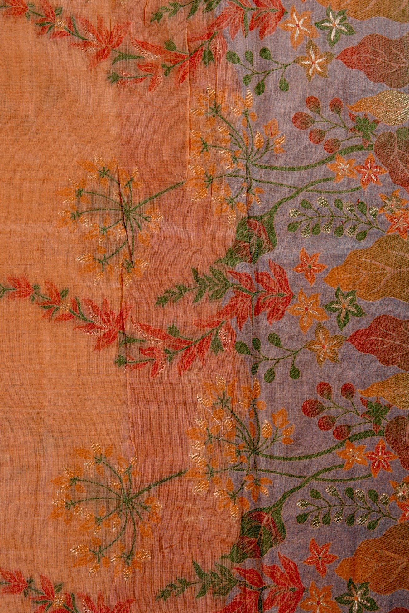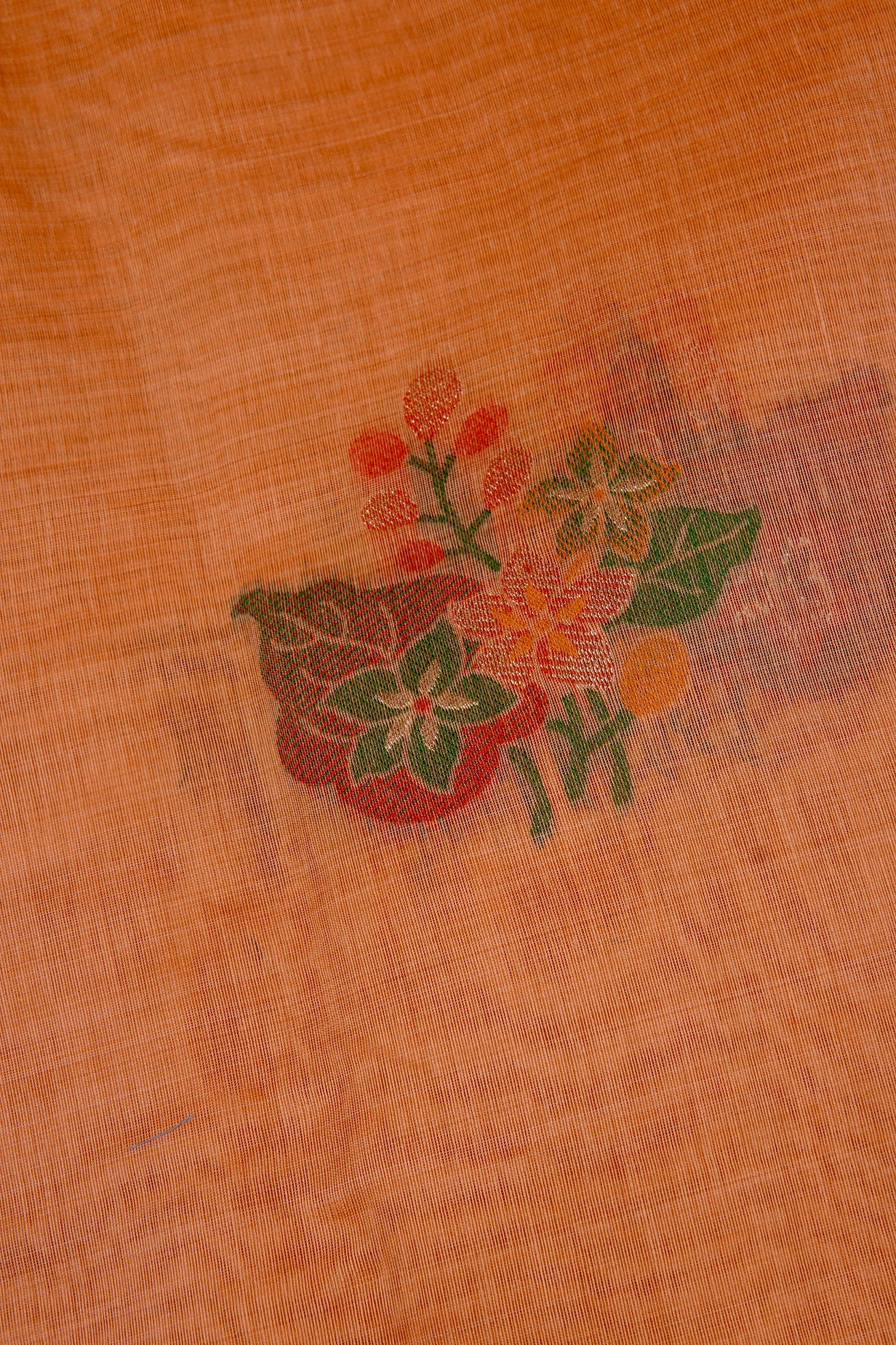 Previous NextCantaloupe Semi Silk Cotton Saree with a naturistic touch of small plat inspired motifs woven in red, green and gold threads throughout the body, the look ending with a simple gold zari border. The pallu looks like the destination from the body with a detailed portrayal of greenery, nature and flowers woven in vivid threads with a subtle touch. The saree has a bright red blouse contrasting with the saree.