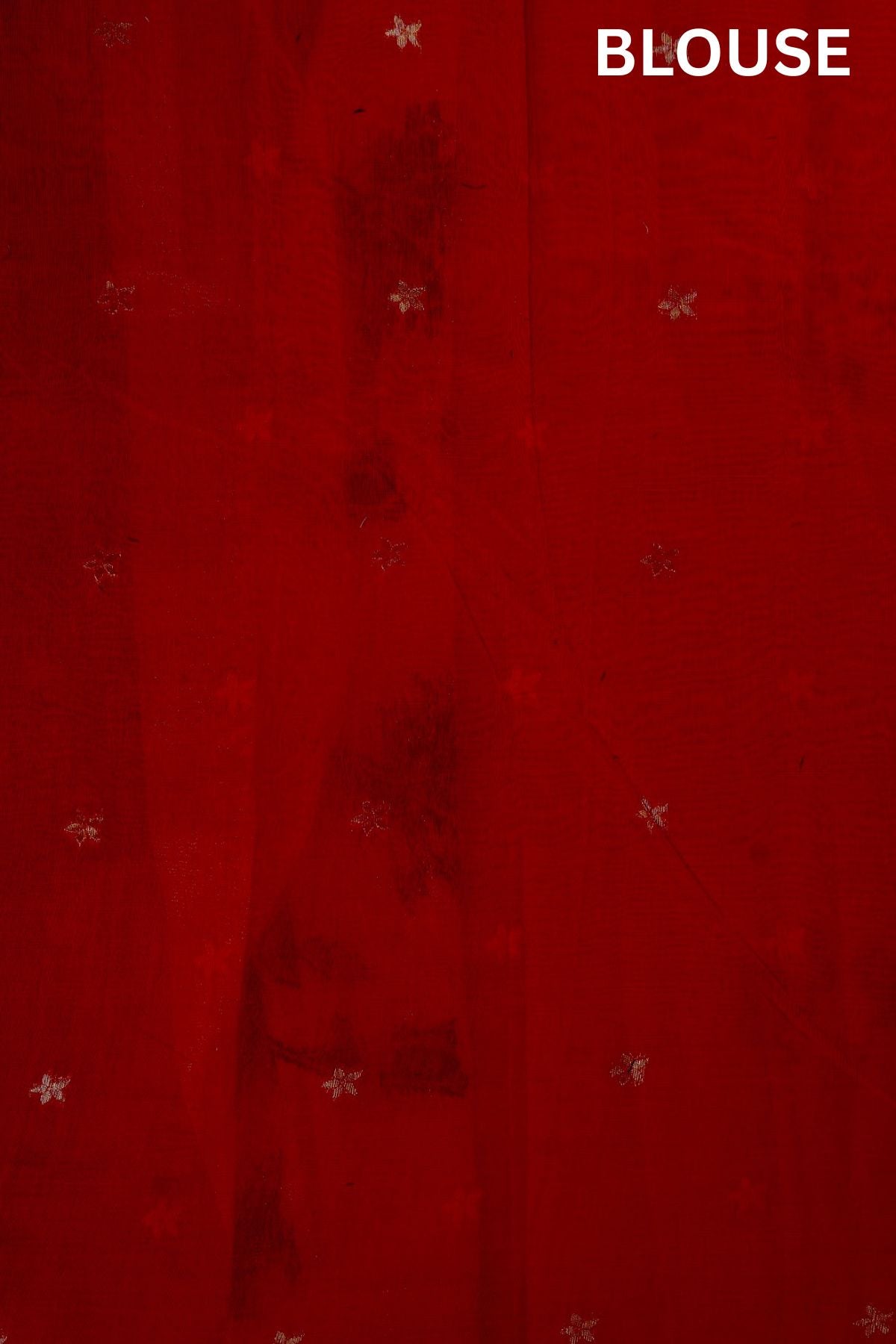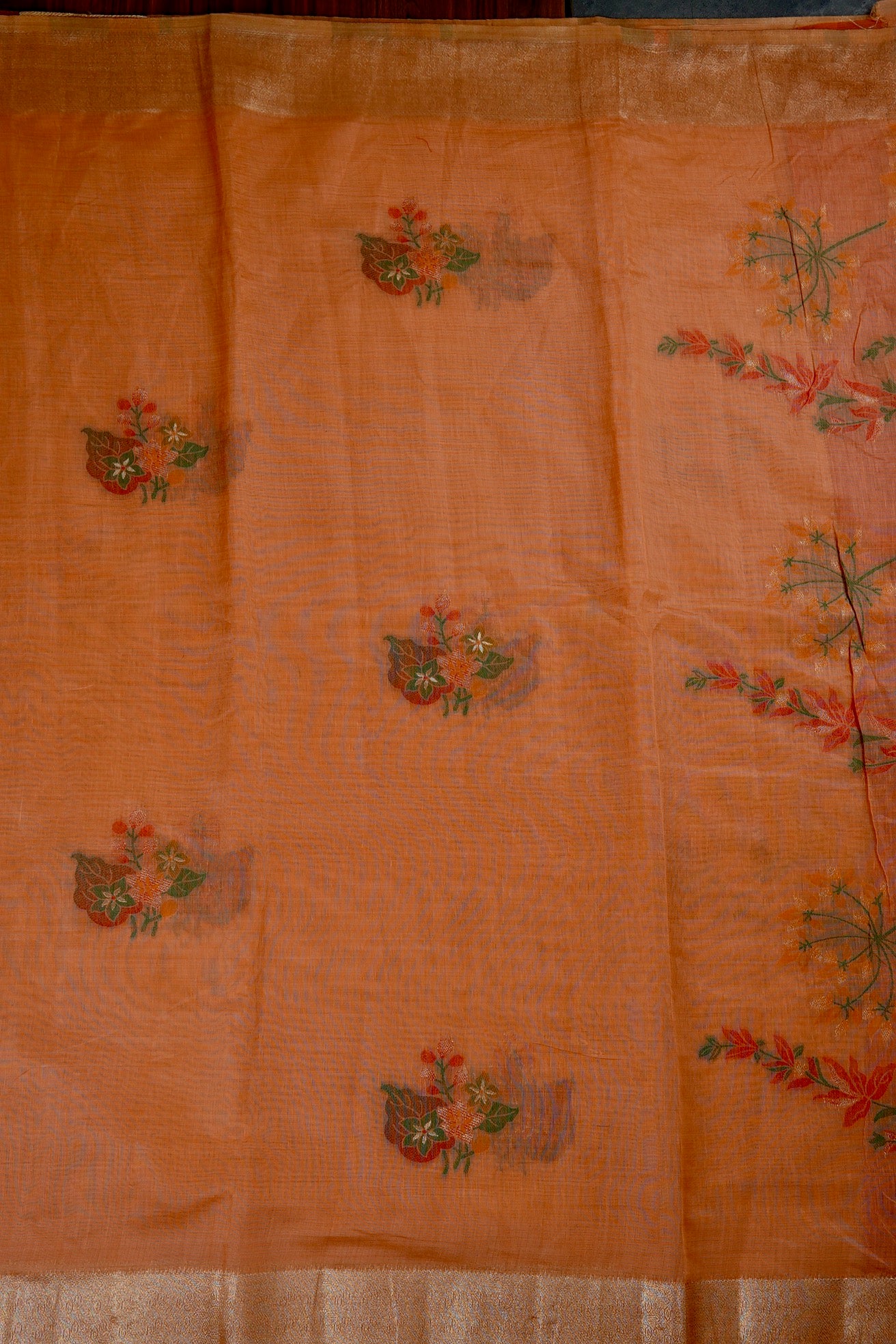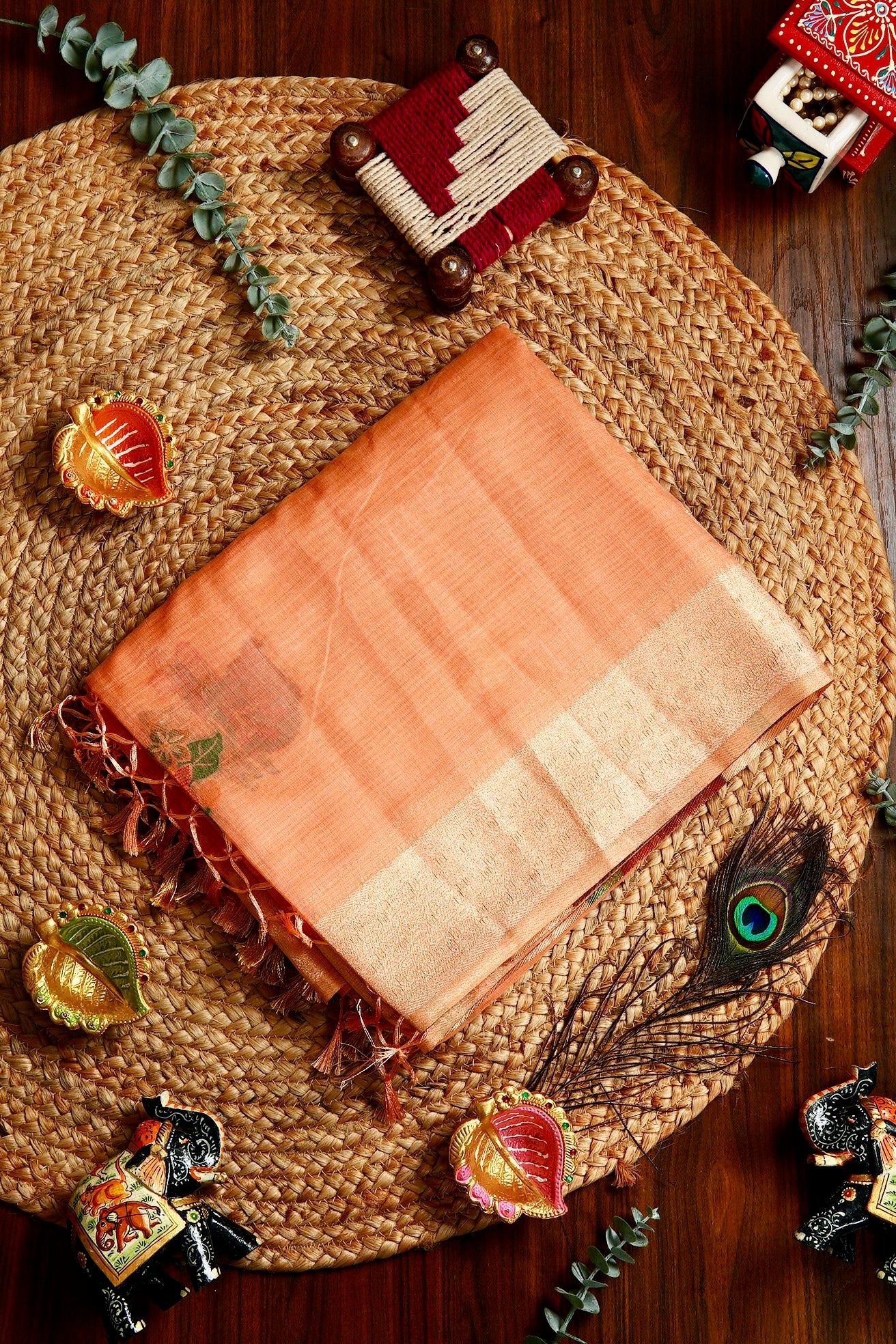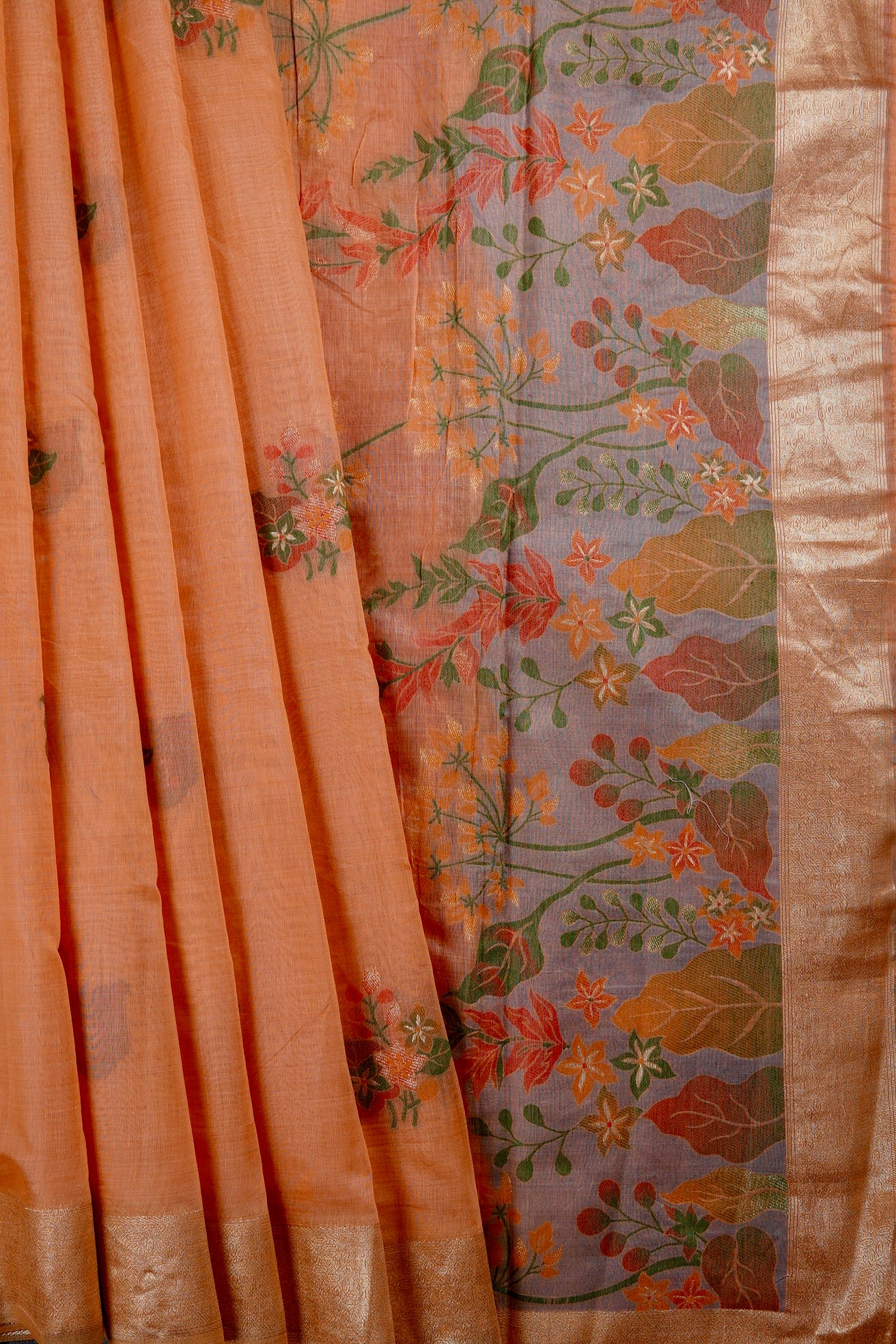 Previous NextCantaloupe Semi Silk Cotton Saree with a naturistic touch of small plat inspired motifs woven in red, green and gold threads throughout the body, the look ending with a simple gold zari border. The pallu looks like the destination from the body with a detailed portrayal of greenery, nature and flowers woven in vivid threads with a subtle touch. The saree has a bright red blouse contrasting with the saree.