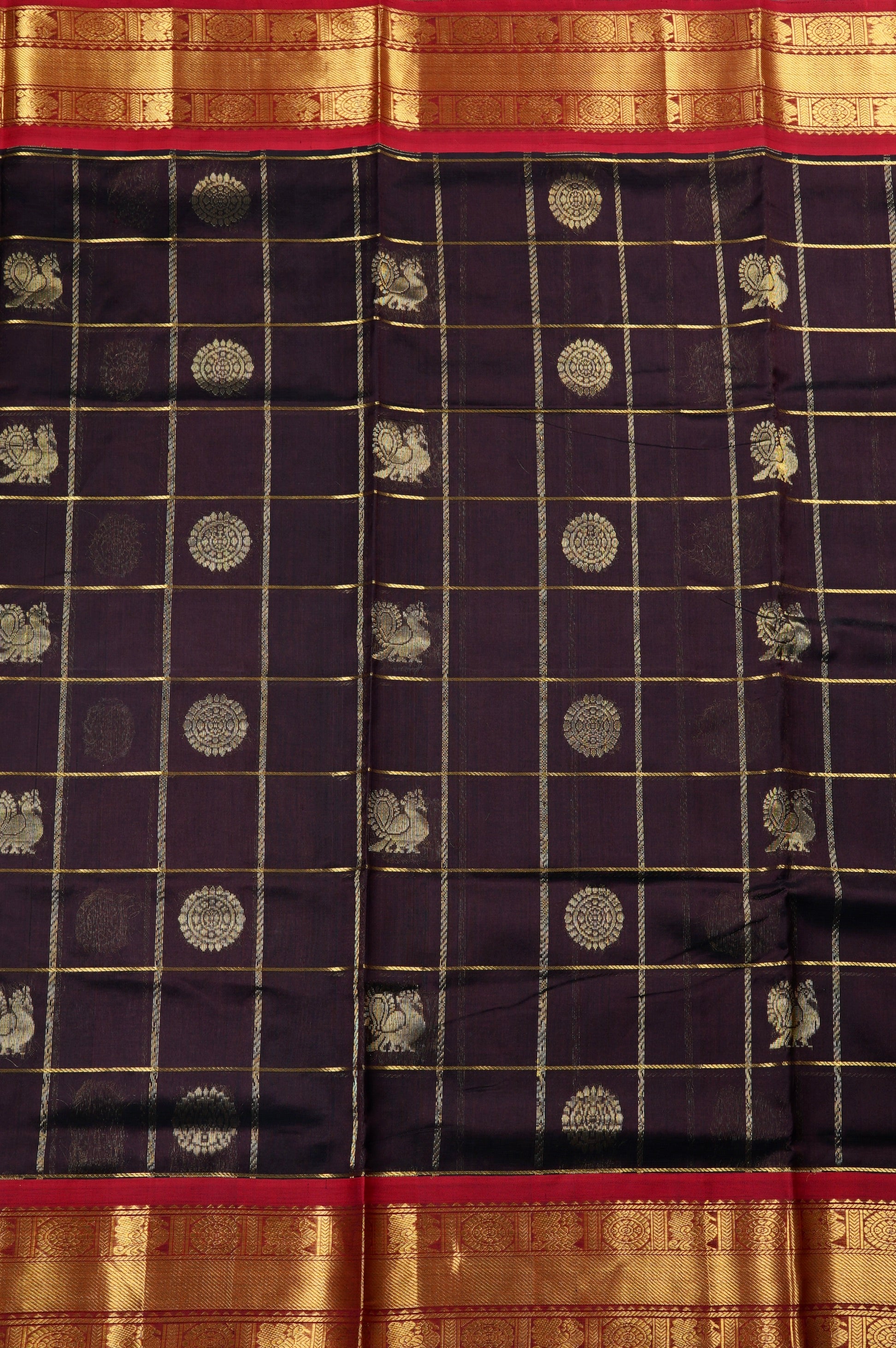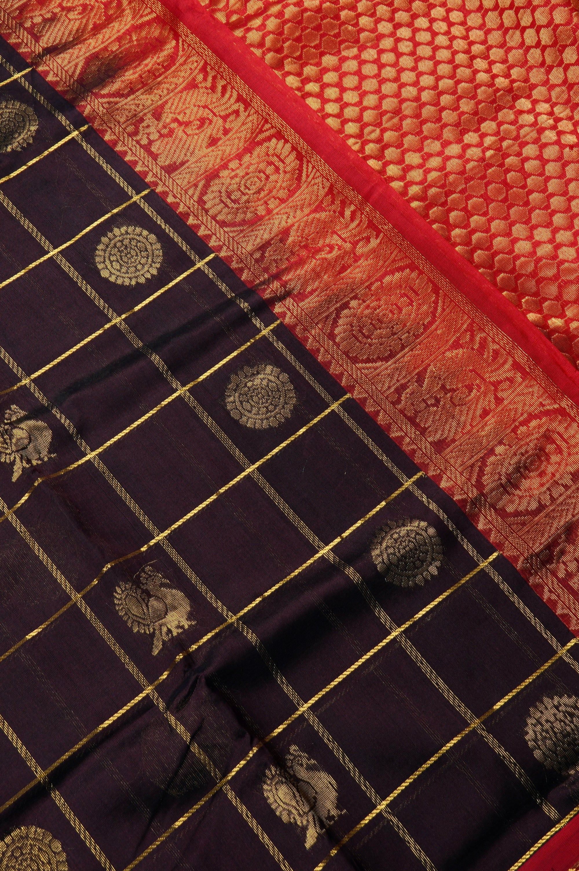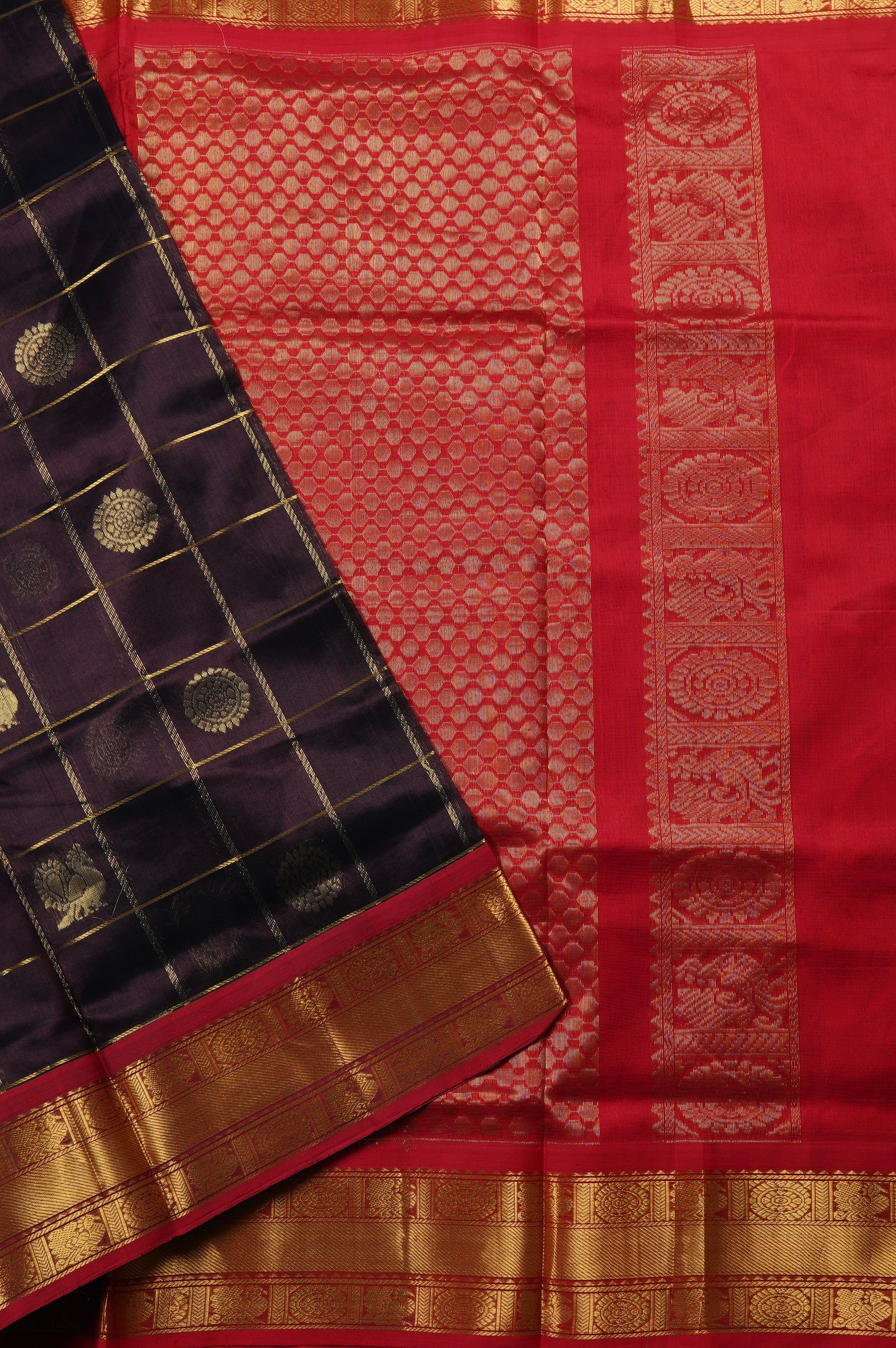Previous NextExude traditional grandeur with this luxurious dark purple plum silk cotton saree. The rich, dark canvas is elegantly patterned with a classic gold zari check design, with the woven grid beautifully showcasing alternating gold floral chakram bhuttas and classic peacock bhuttas. This deep, regal body is strikingly framed by a contrasting bright red border that is heavily laden with intricate, traditional gold zari brocade work. The vibrant contrast continues seamlessly into the stunning red pallu, which features dense, opulent gold zari weaving, with a rich geometric lattice band alongside majestic peacock and floral band.