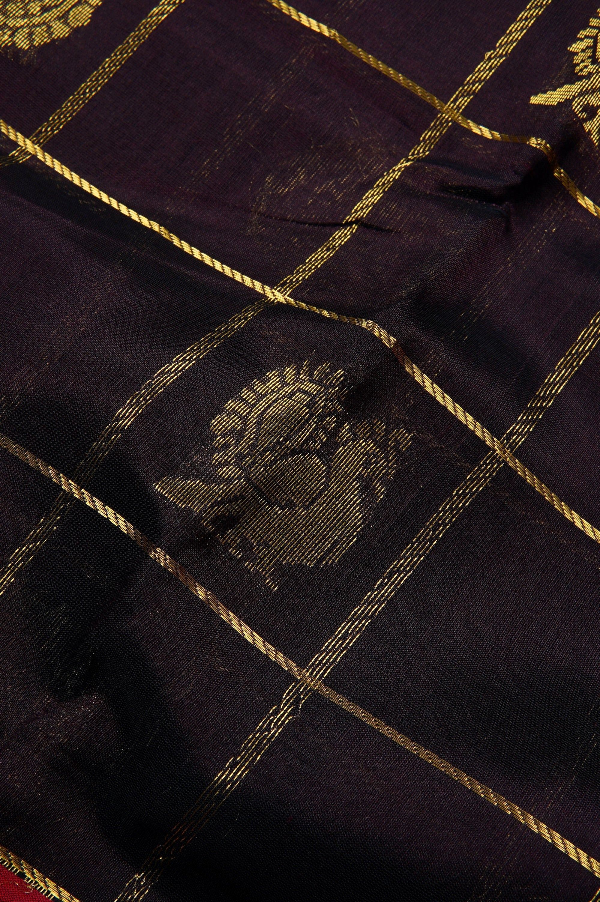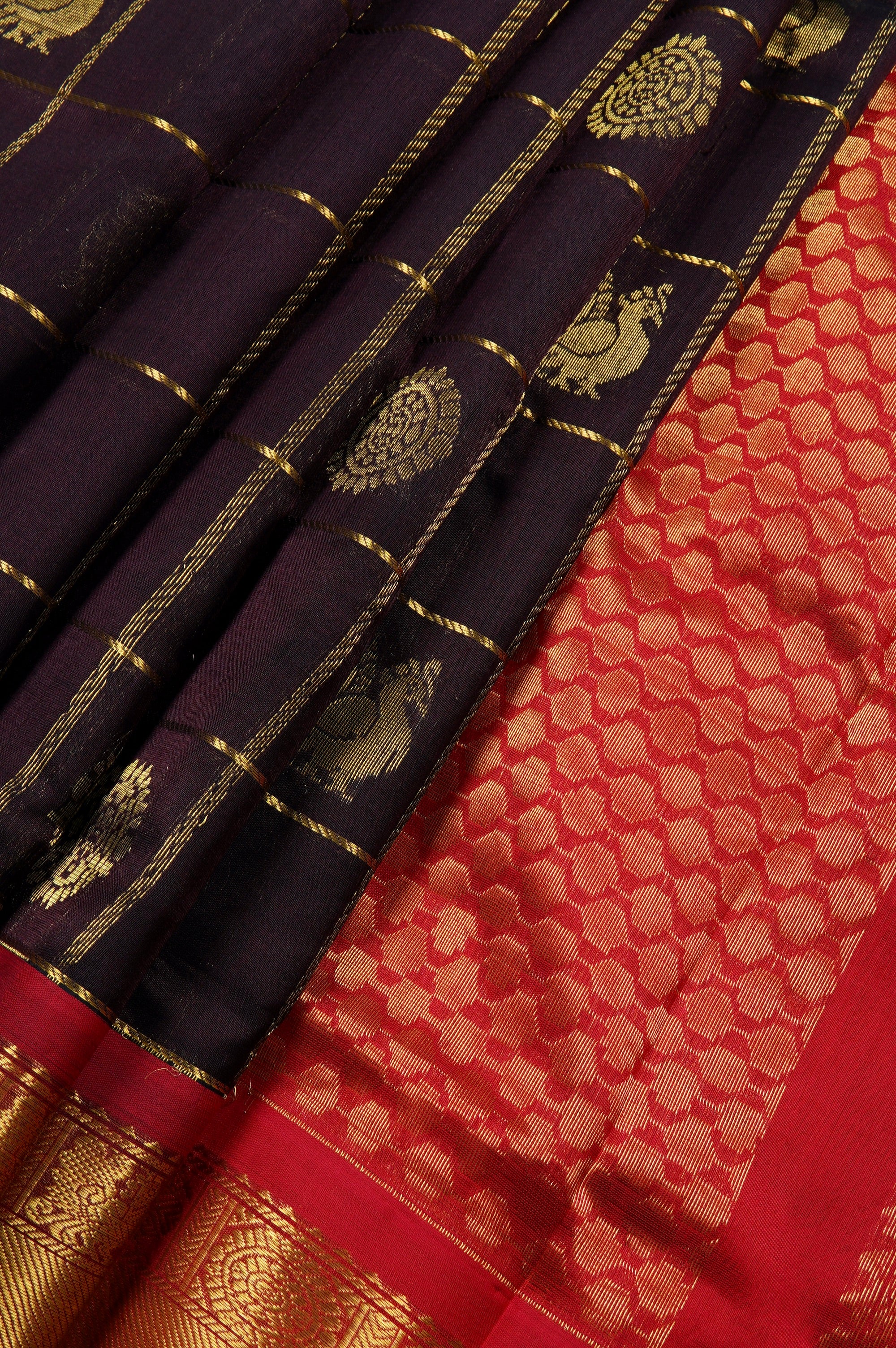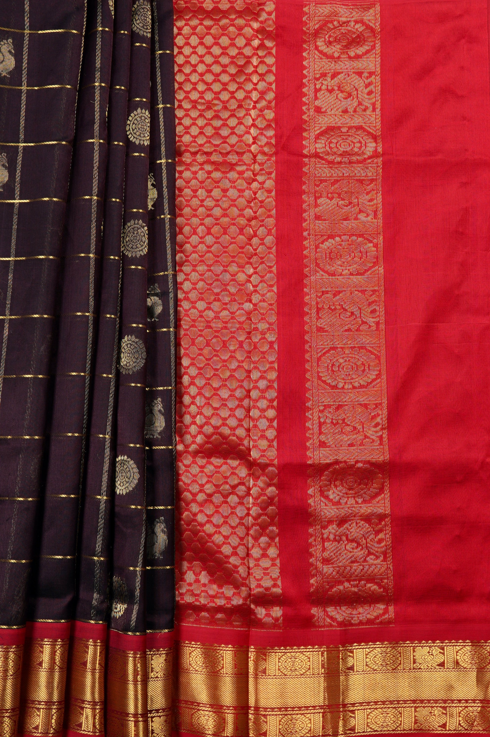 Previous NextExude traditional grandeur with this luxurious dark purple plum silk cotton saree. The rich, dark canvas is elegantly patterned with a classic gold zari check design, with the woven grid beautifully showcasing alternating gold floral chakram bhuttas and classic peacock bhuttas. This deep, regal body is strikingly framed by a contrasting bright red border that is heavily laden with intricate, traditional gold zari brocade work. The vibrant contrast continues seamlessly into the stunning red pallu, which features dense, opulent gold zari weaving, with a rich geometric lattice band alongside majestic peacock and floral band.