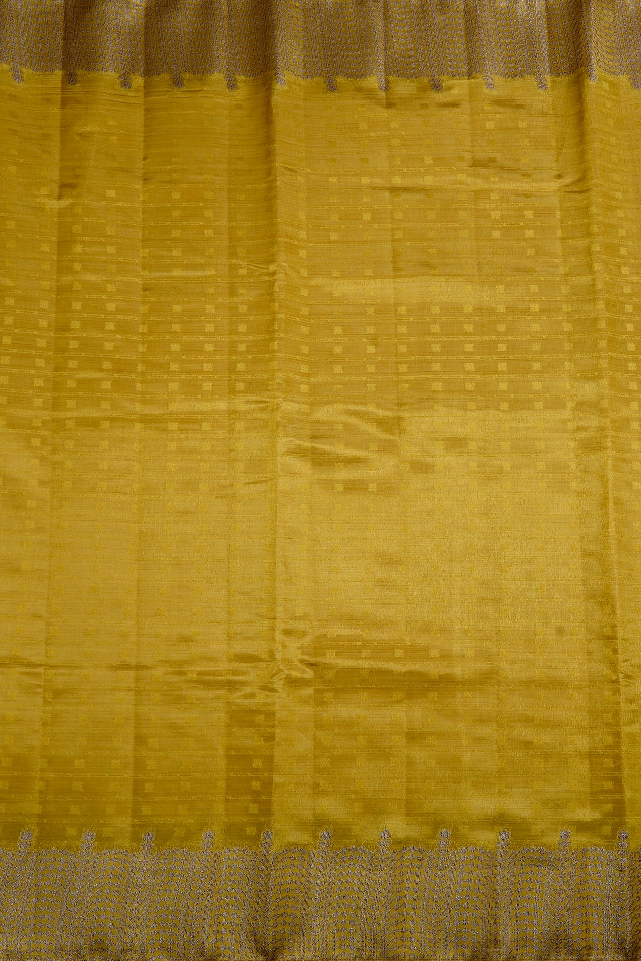 Previous NextA radiant golden yellow semi tussar saree featuring a subtle, all-over pattern of miniature square buttas woven in silver zari. The saree is framed by an intricate silver zari border showcasing a repeating vine and leaf motif with a delicate scalloped edge. This leads to a stunning pallu detailed with broad vertical panels of dense, shimmering zari in ornate geometric and floral designs. Completing the look is a matching golden yellow blouse adorned with scattered silver floral buttas and a coordinated zari border.