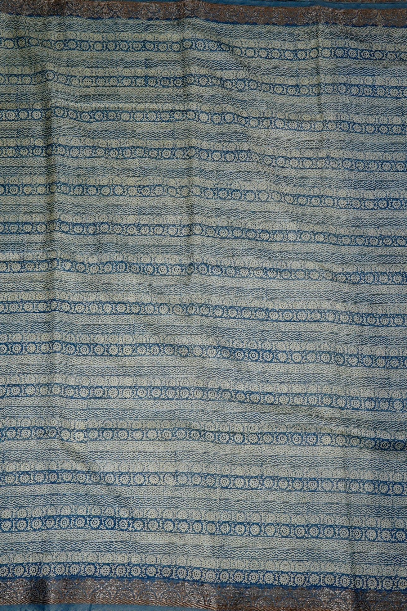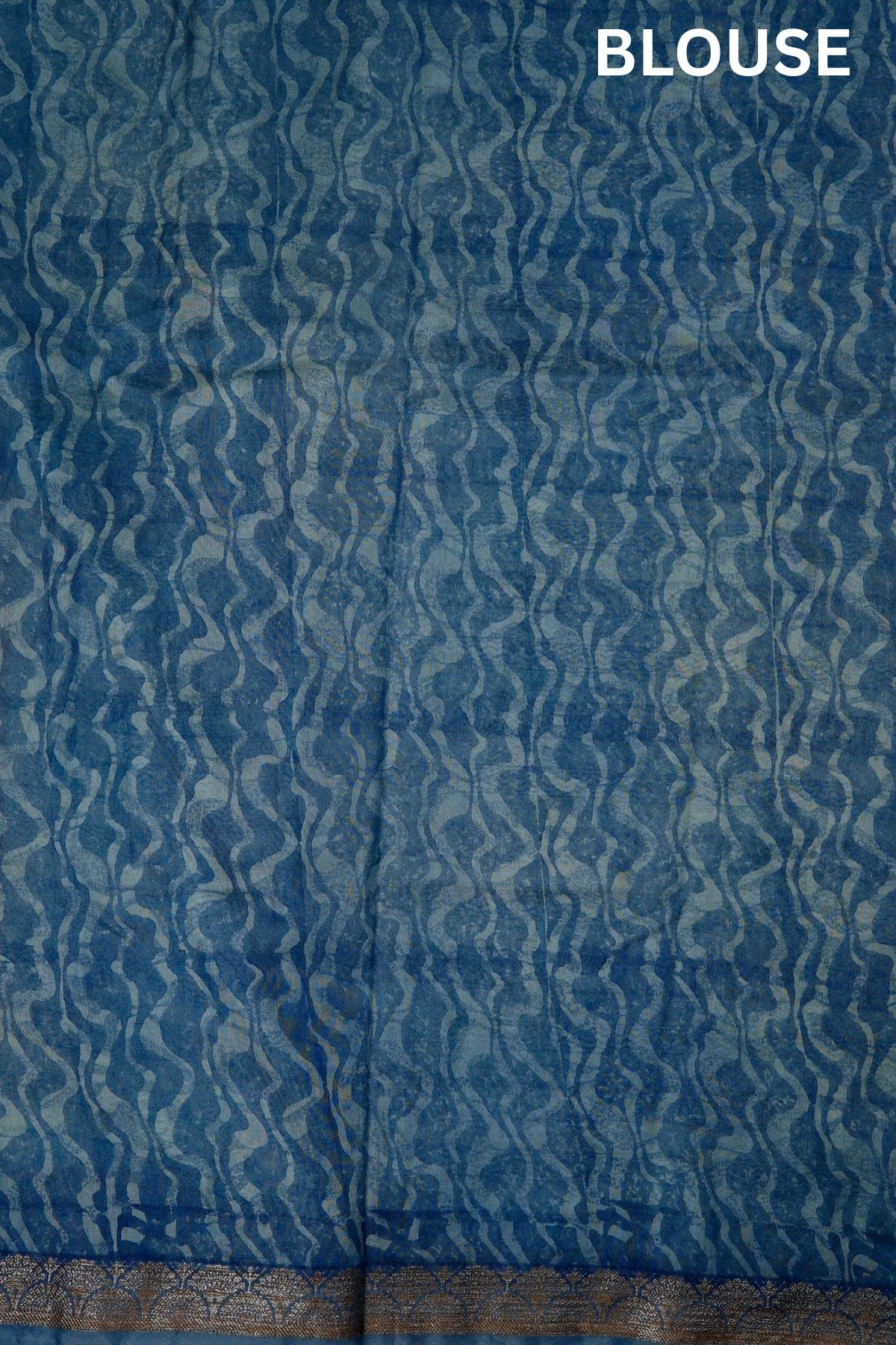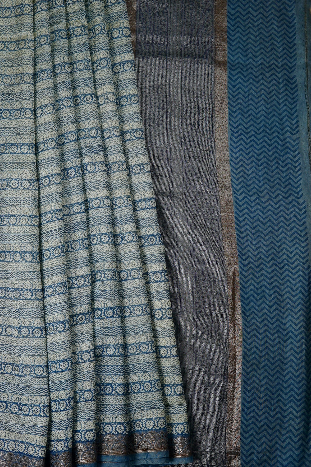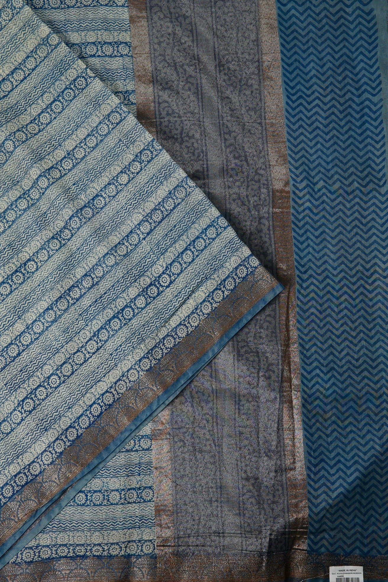 Previous NextThis chanderi cotton saree is a combination of cream with prussian blue shaded floral motifs in circular frames, woven along horizontal bands throughout the body.The border is a kodi visiri pattern woven in gold zari on a prussian blue shade. The pallu is very short with just a dense series of gold zari lines running vertically at the end. The saree has a prussian blue blouse with light blue waves running along its length and the same border.