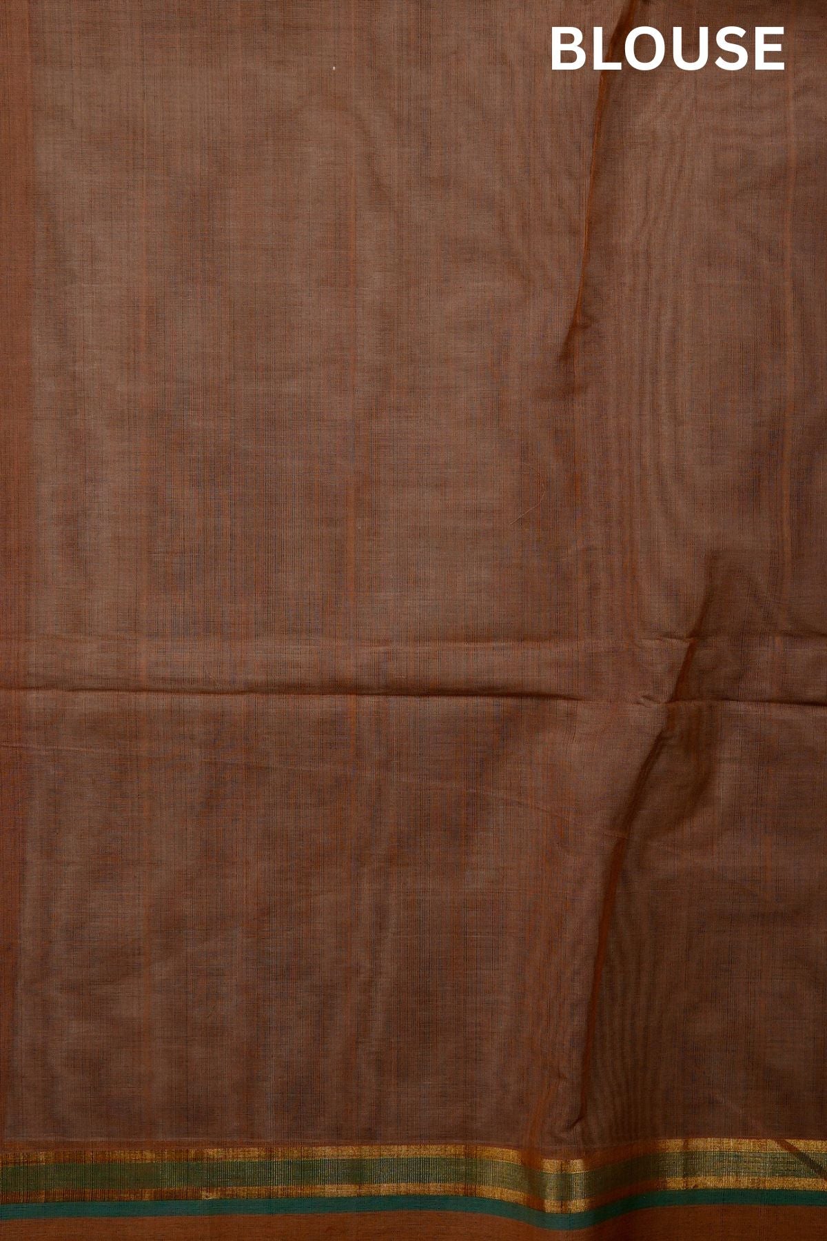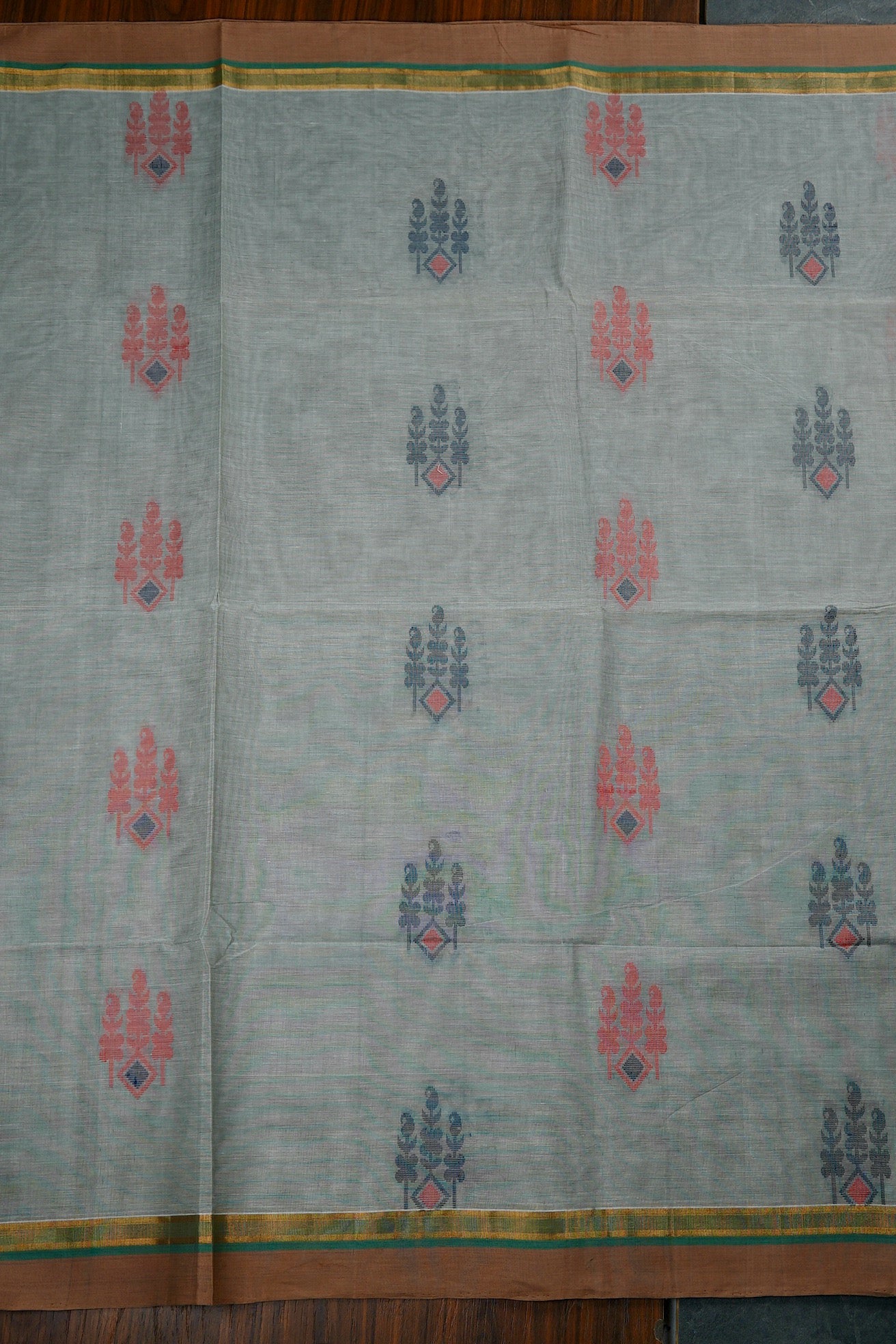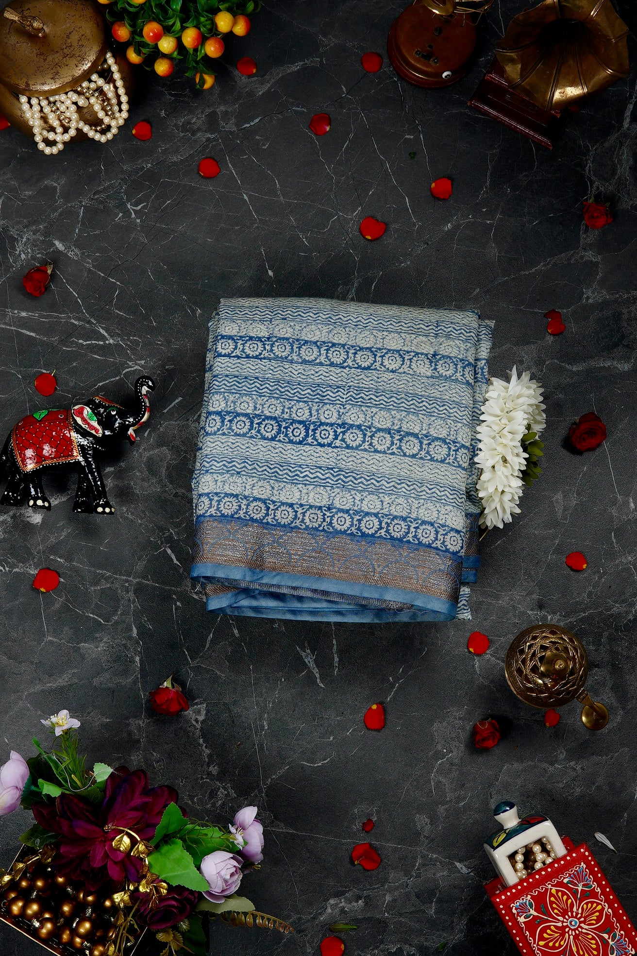 Previous NextThis chanderi cotton saree is a combination of cream with prussian blue shaded floral motifs in circular frames, woven along horizontal bands throughout the body.The border is a kodi visiri pattern woven in gold zari on a prussian blue shade. The pallu is very short with just a dense series of gold zari lines running vertically at the end. The saree has a prussian blue blouse with light blue waves running along its length and the same border.