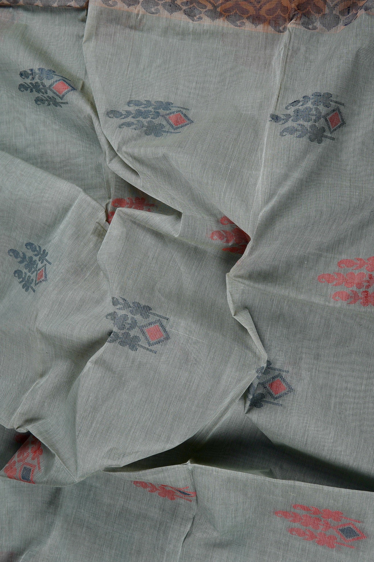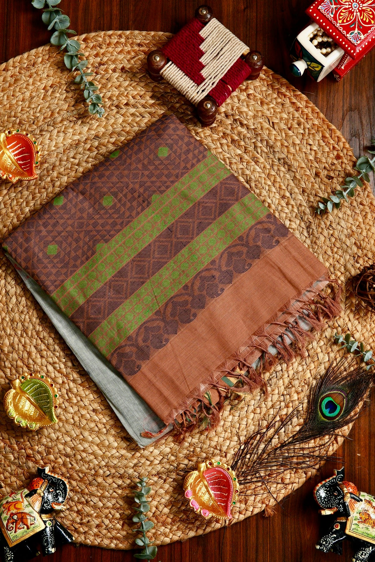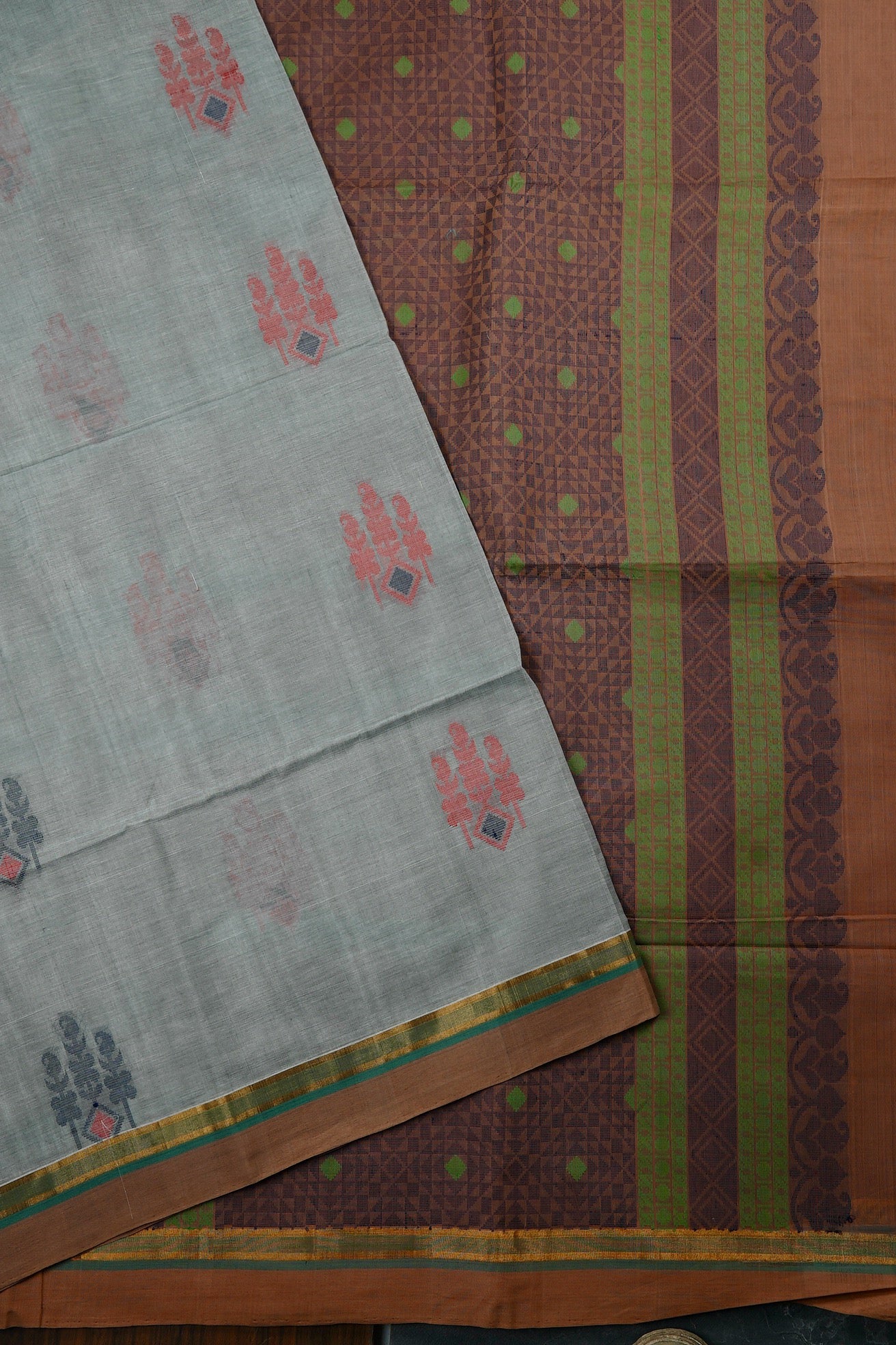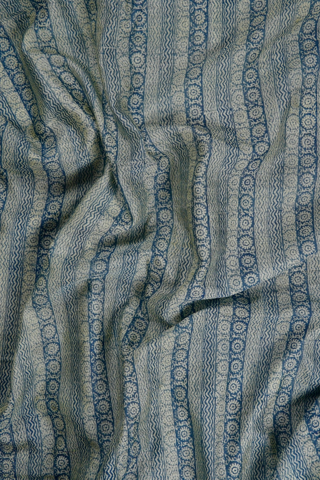 Previous NextThis chanderi cotton saree is a combination of cream with prussian blue shaded floral motifs in circular frames, woven along horizontal bands throughout the body.The border is a kodi visiri pattern woven in gold zari on a prussian blue shade. The pallu is very short with just a dense series of gold zari lines running vertically at the end. The saree has a prussian blue blouse with light blue waves running along its length and the same border.