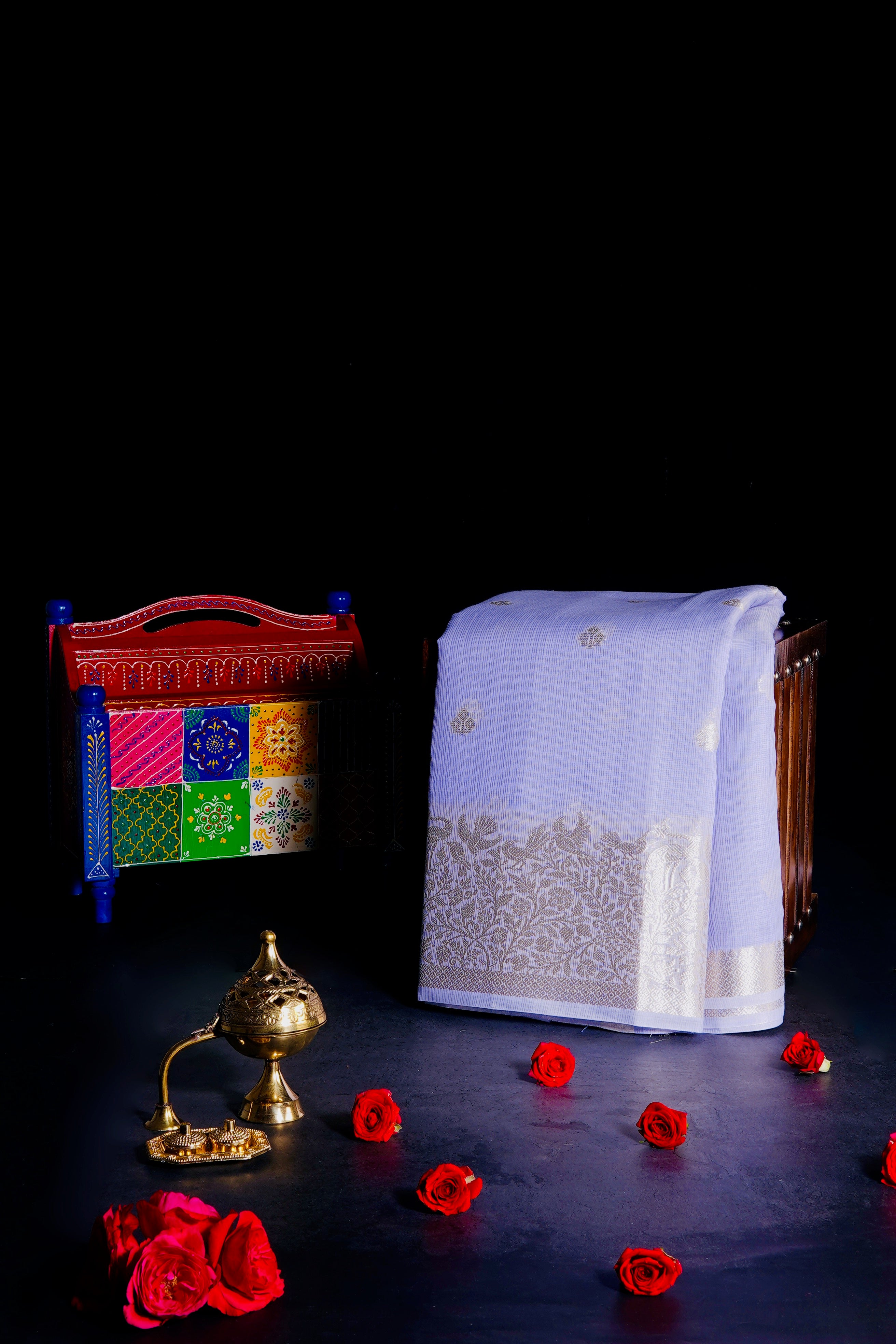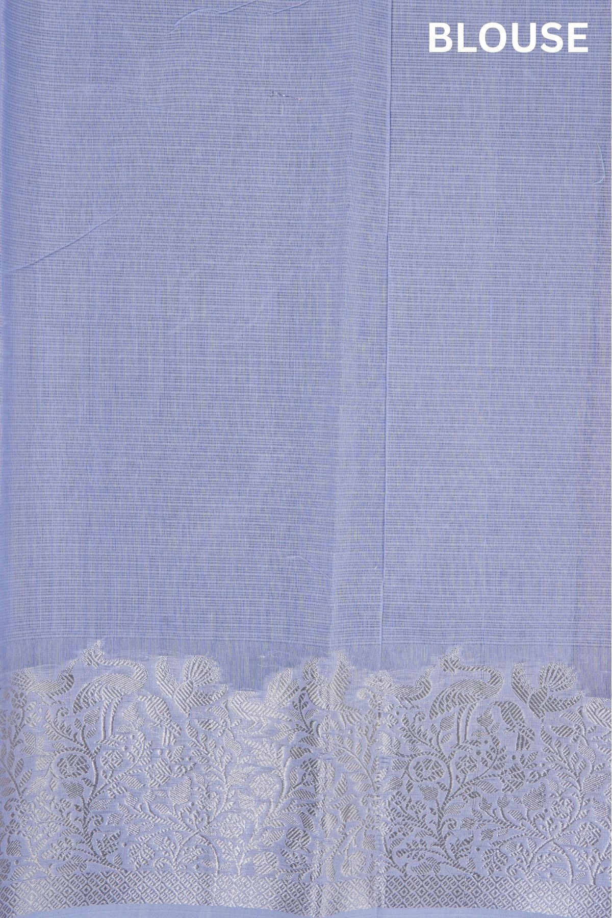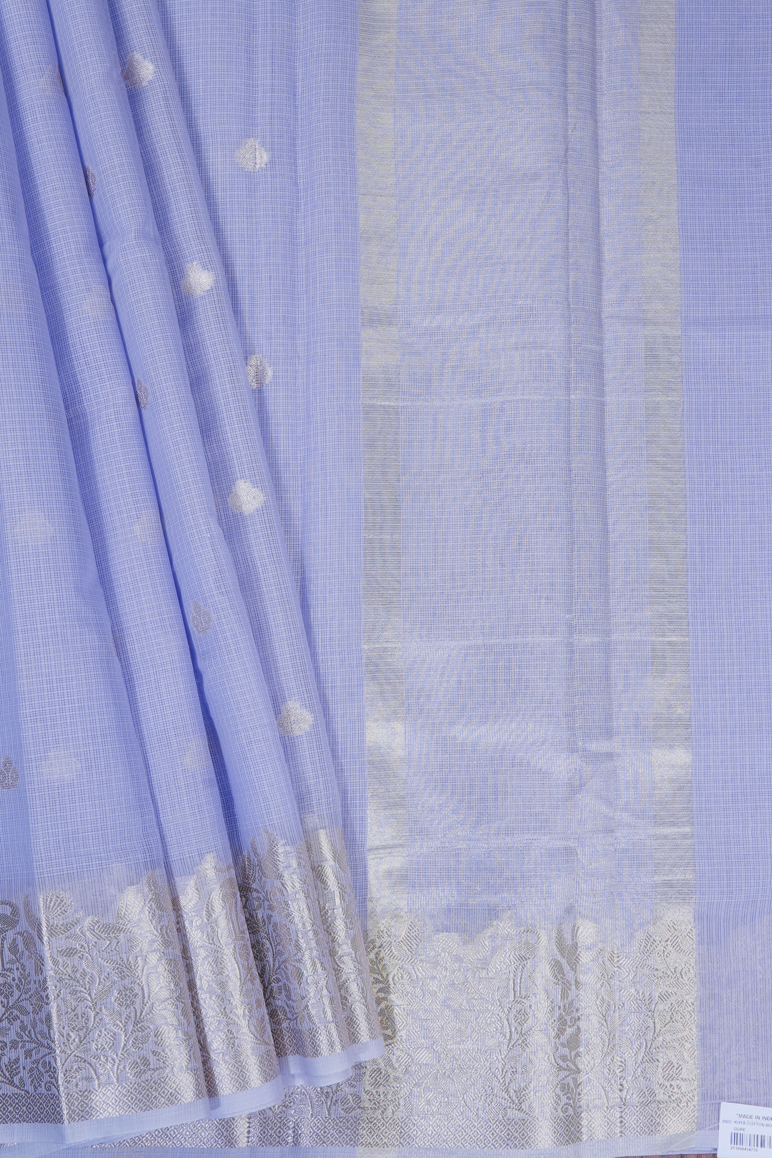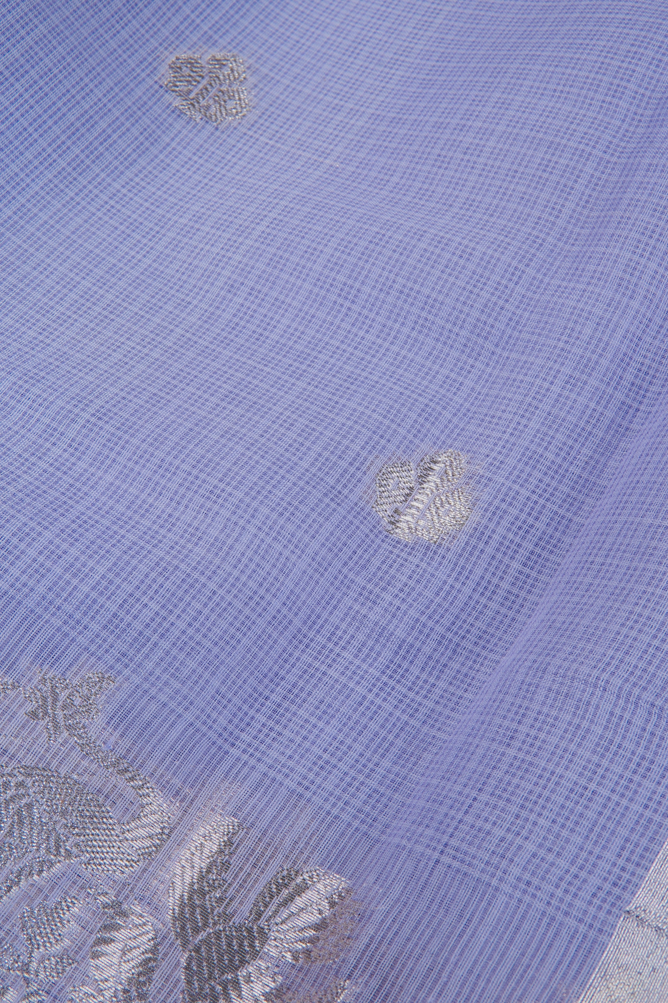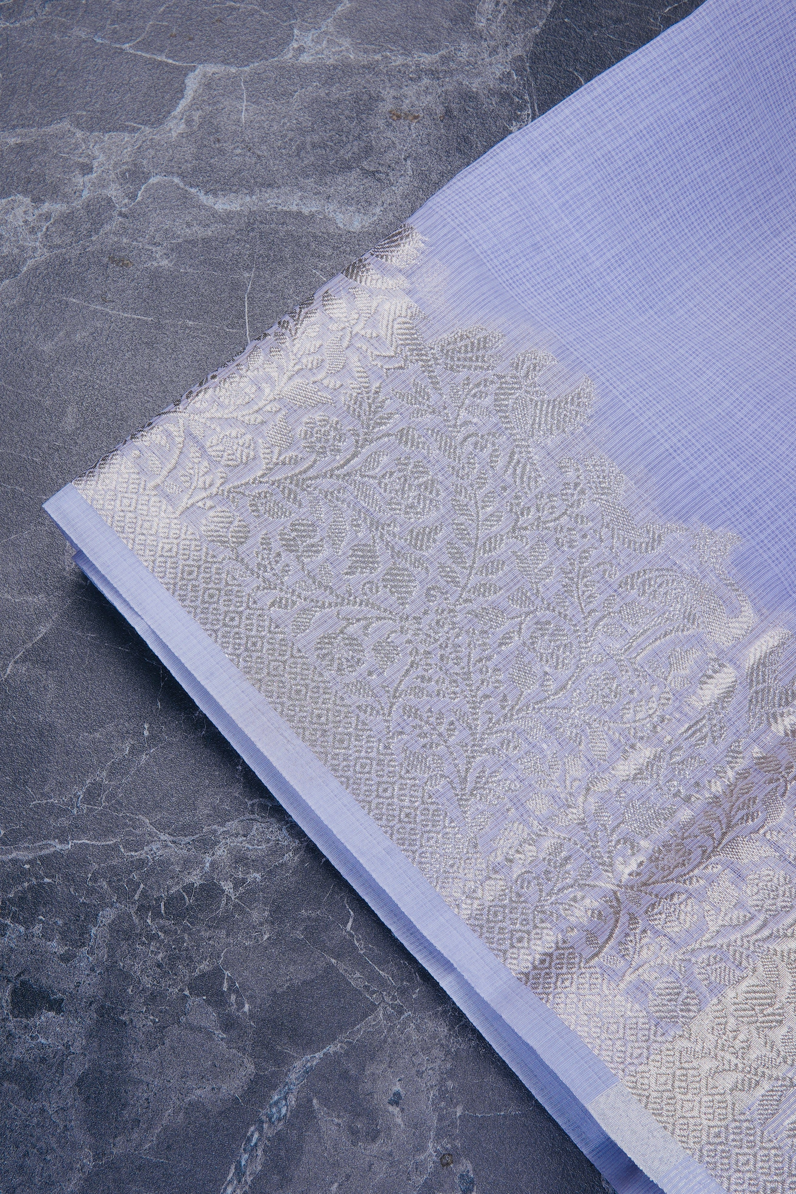 Previous NextLavender supernet saree with small floral bhuttas woven in silver zari on the body. The border is an expanse of floral and tree motifs with birds resting on the top, bordered by a thin band of diamond lattice pattern woven in silver zari. The saree has a short pallu with thin silver zari stripes bordered by bands of silver zari. The blouse is solid lavender with the same border.