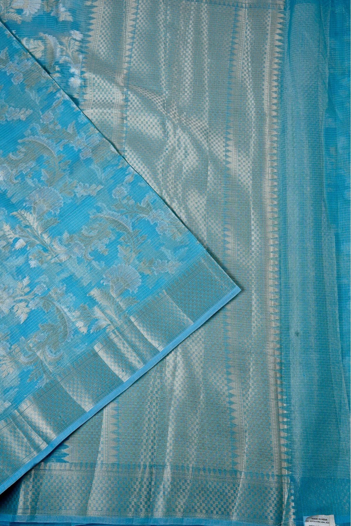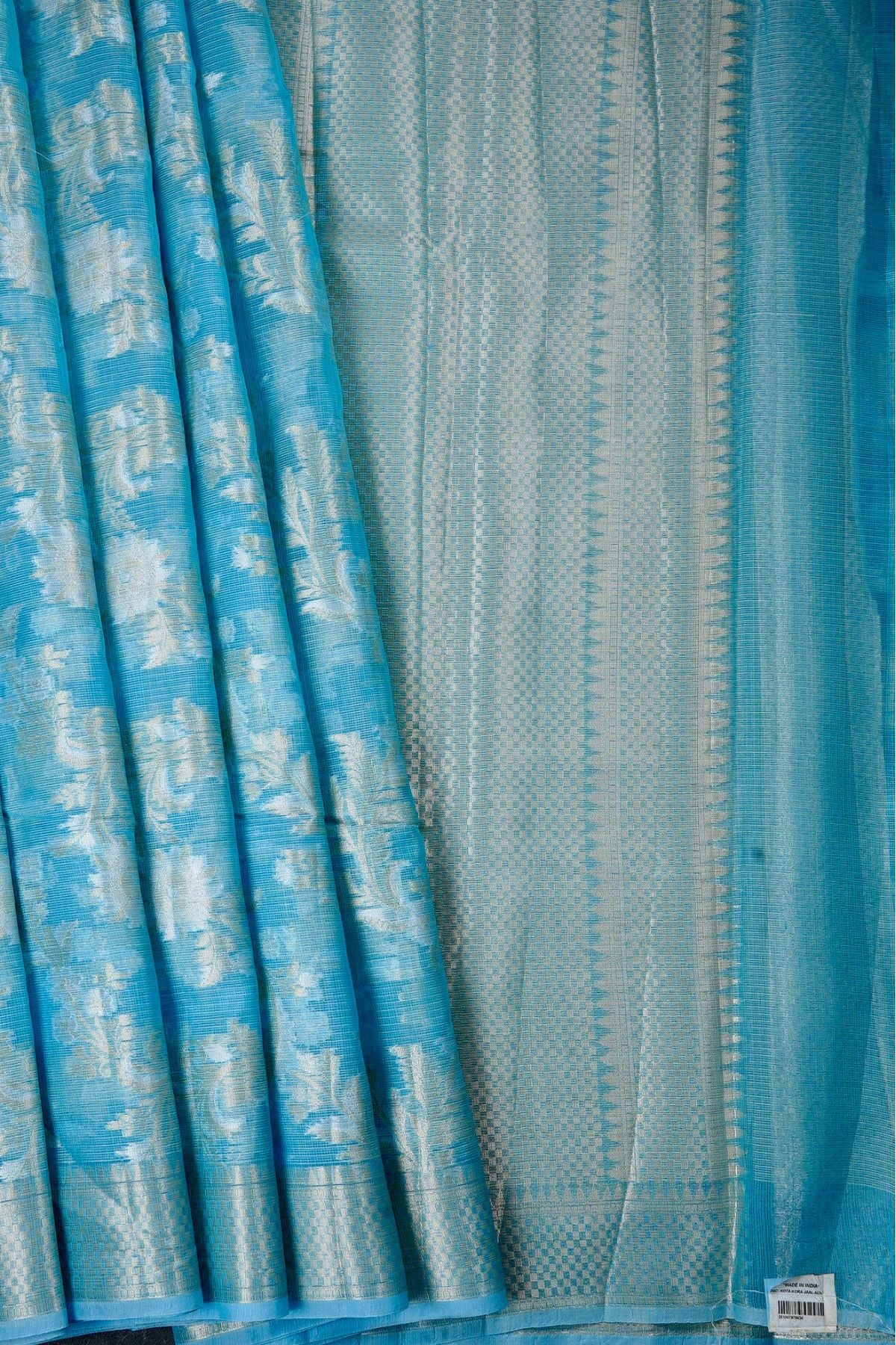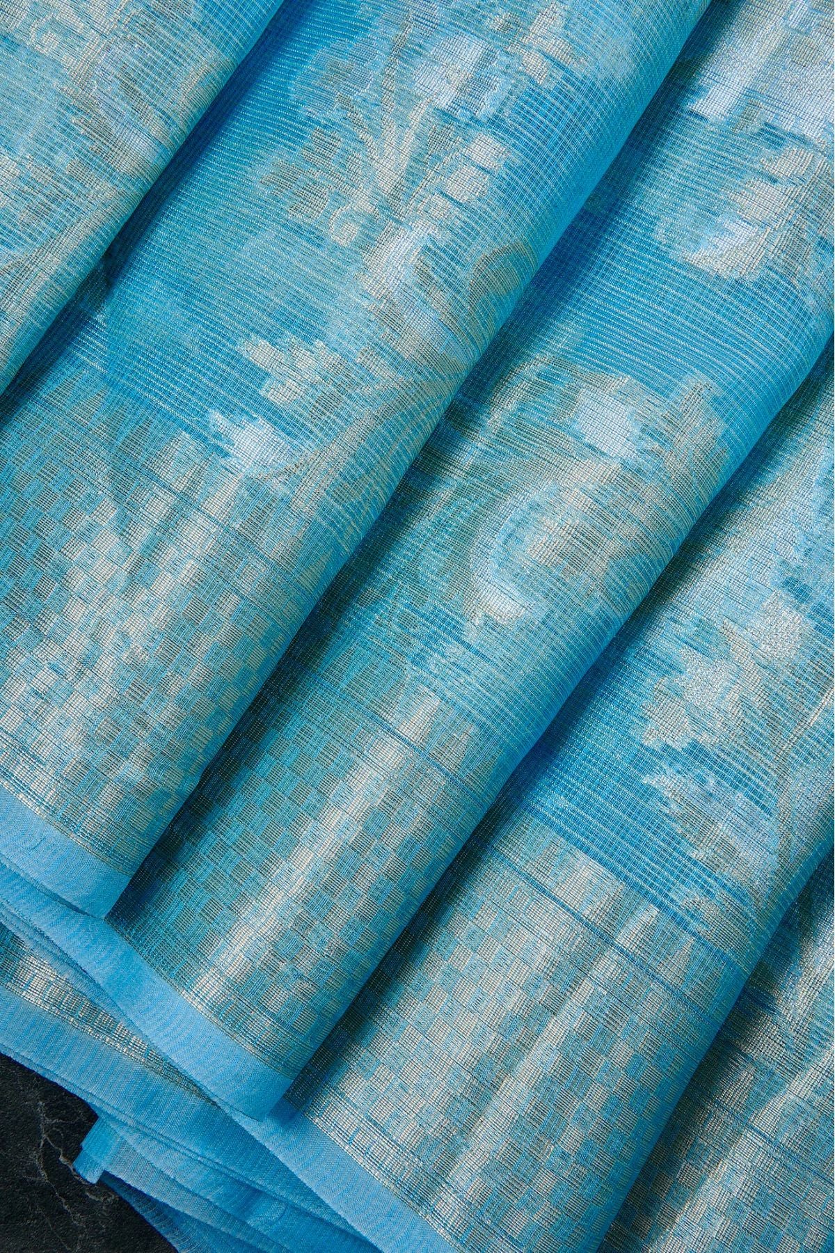 Previous NextLight blue semi tussar saree with subtle and elegant florals woven in gold and silver zari lining each other out, with a traditional kattam border woven in gold zari balancing history with contemporaneity. The pallu is a repetitive work of the border, filled with kattam pattern separated by bands of small triangles woven in gold zari. The saree has a blouse identical to the pallu with the same kattam border.