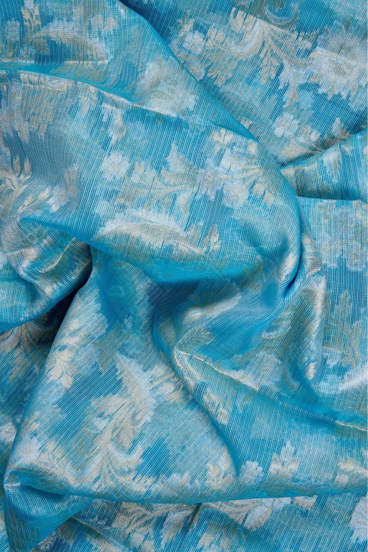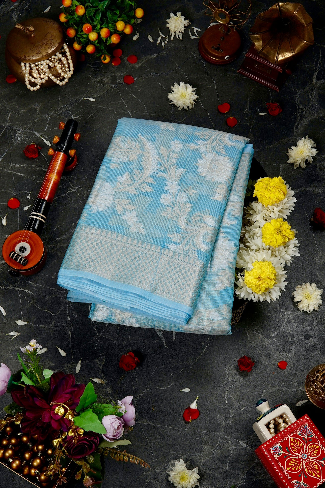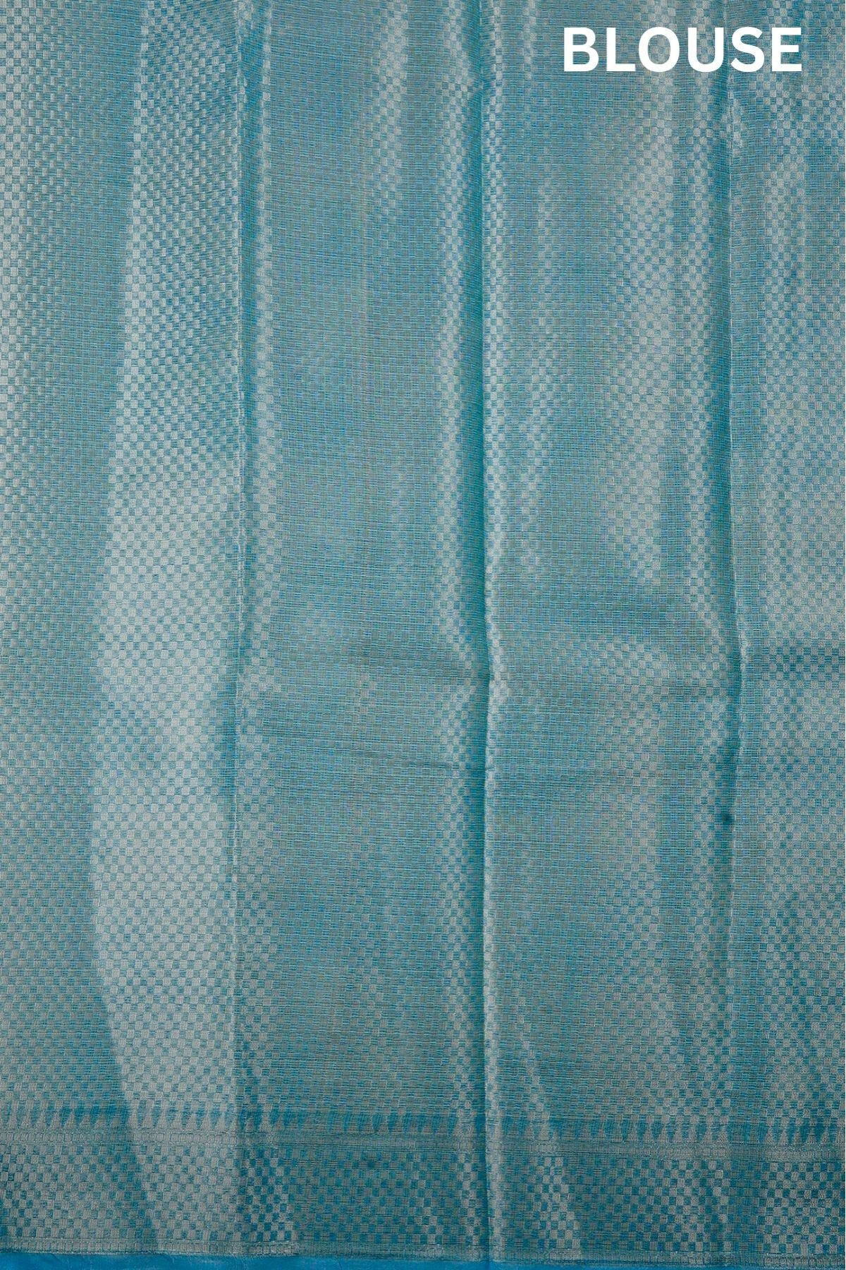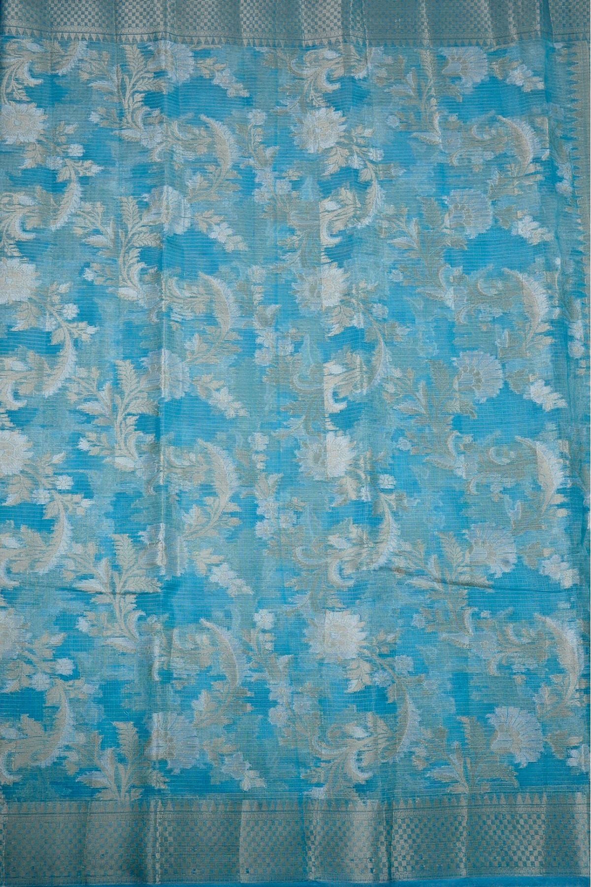 Previous NextLight blue semi tussar saree with subtle and elegant florals woven in gold and silver zari lining each other out, with a traditional kattam border woven in gold zari balancing history with contemporaneity. The pallu is a repetitive work of the border, filled with kattam pattern separated by bands of small triangles woven in gold zari. The saree has a blouse identical to the pallu with the same kattam border.