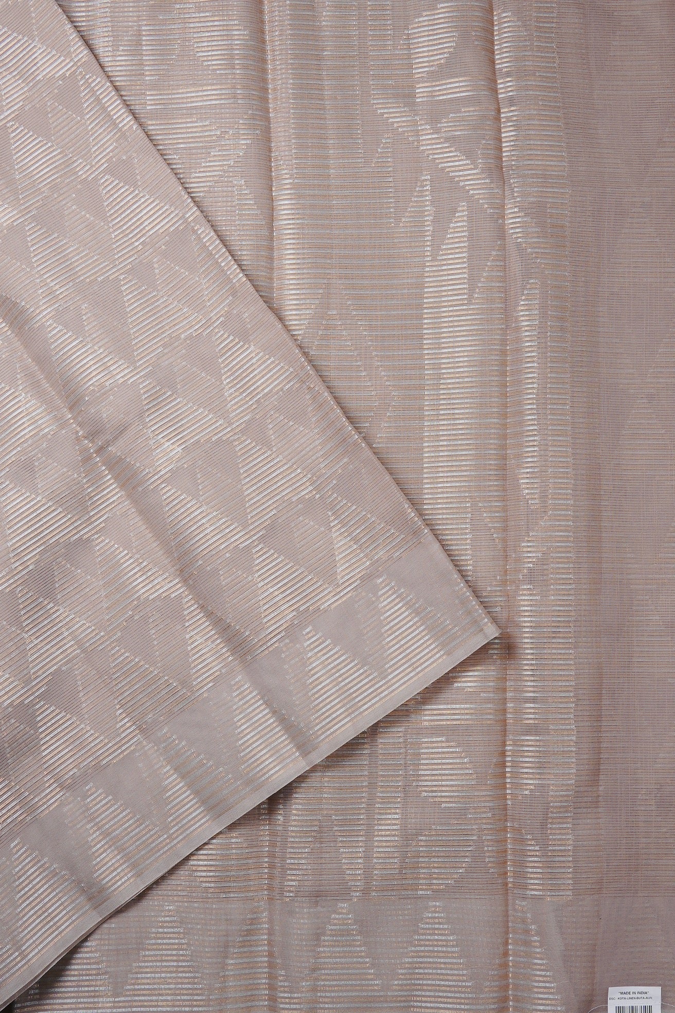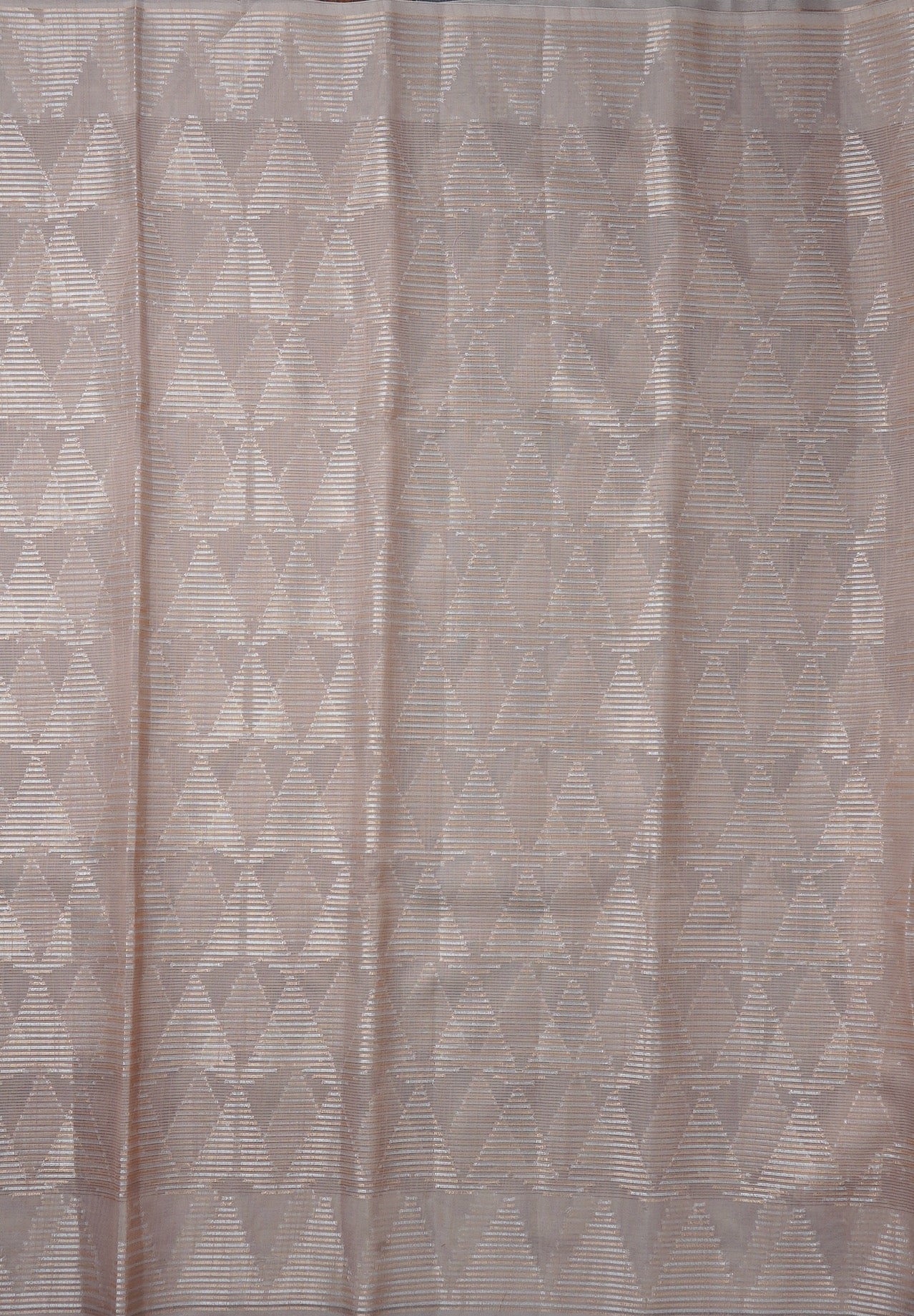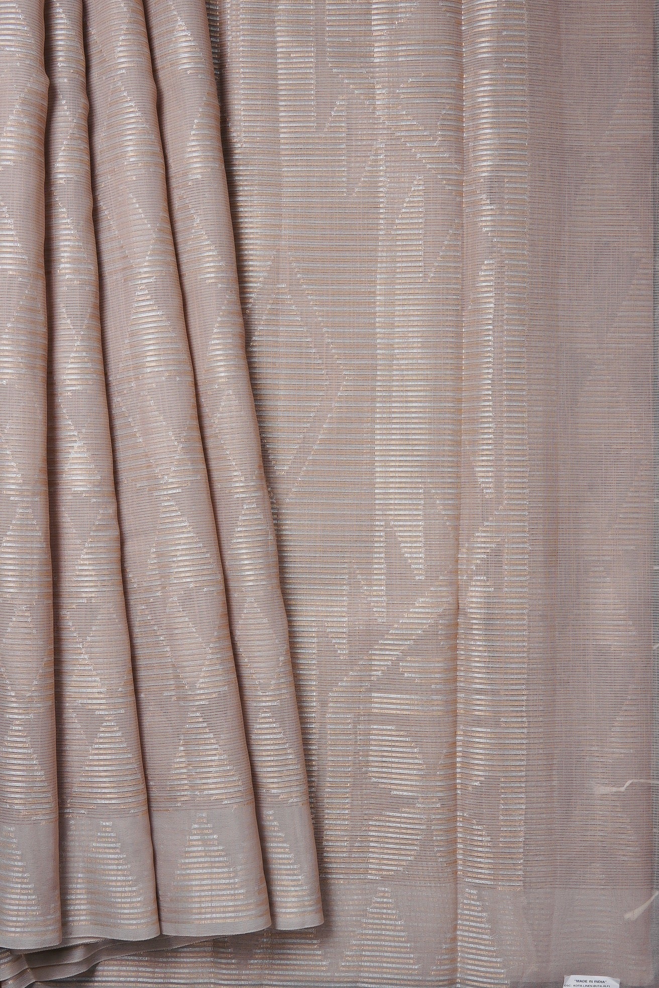 Light lilac semi silk cotton saree with broad triangular arrow motifs woven in gold and silver zari throughout the body. The pallu has a vast diamond motifs surrounded by floral motifs woven in zari. The saree has a light lilac blouse with broad diamond motifs filled with alternating gold and silver zari.