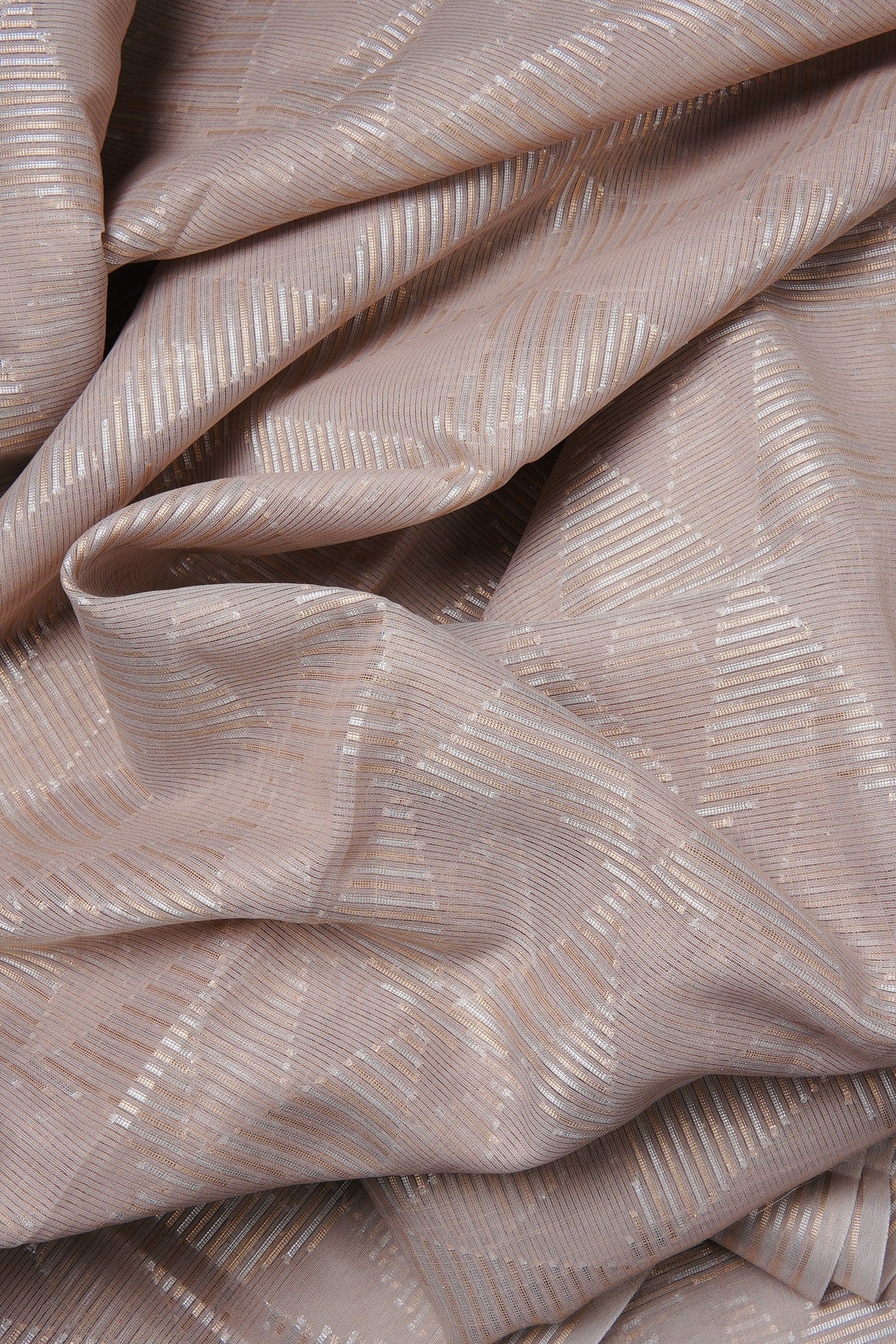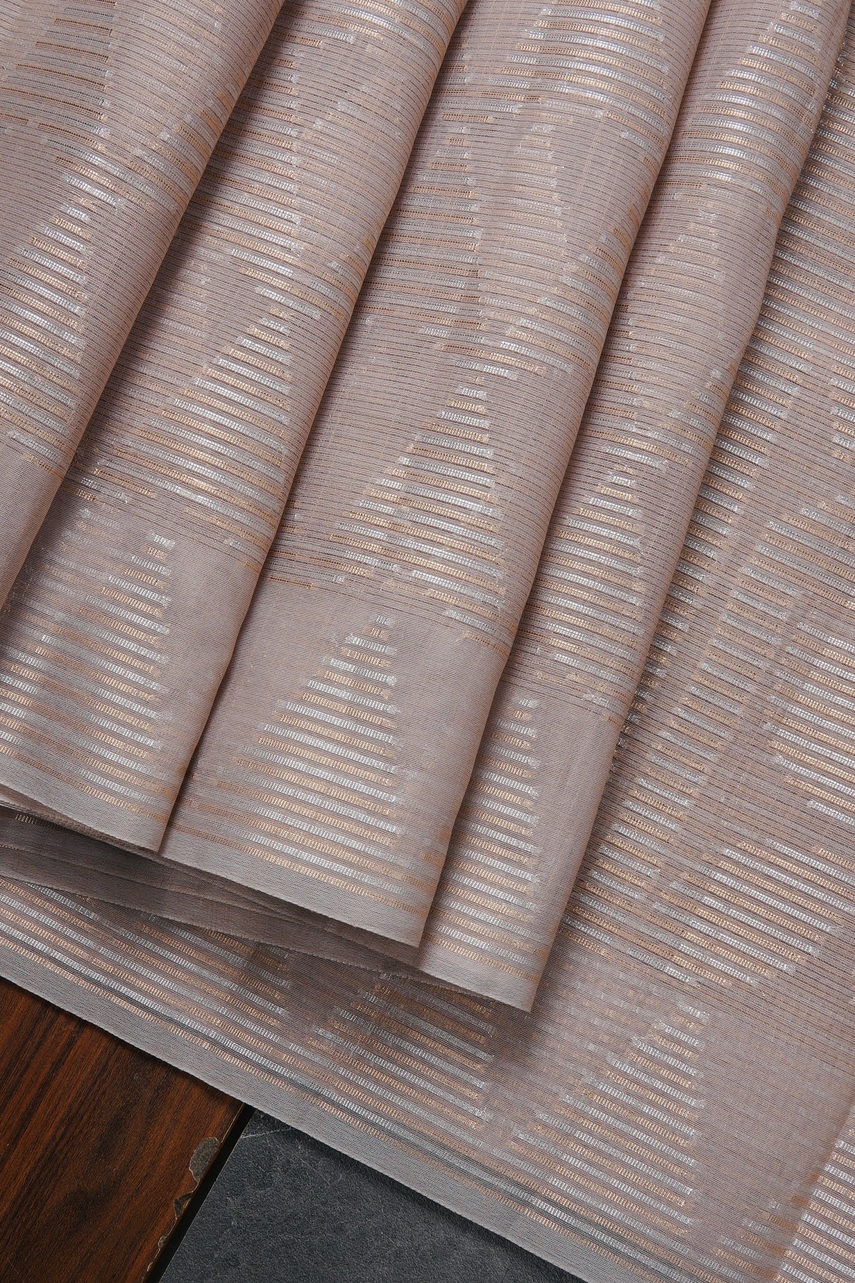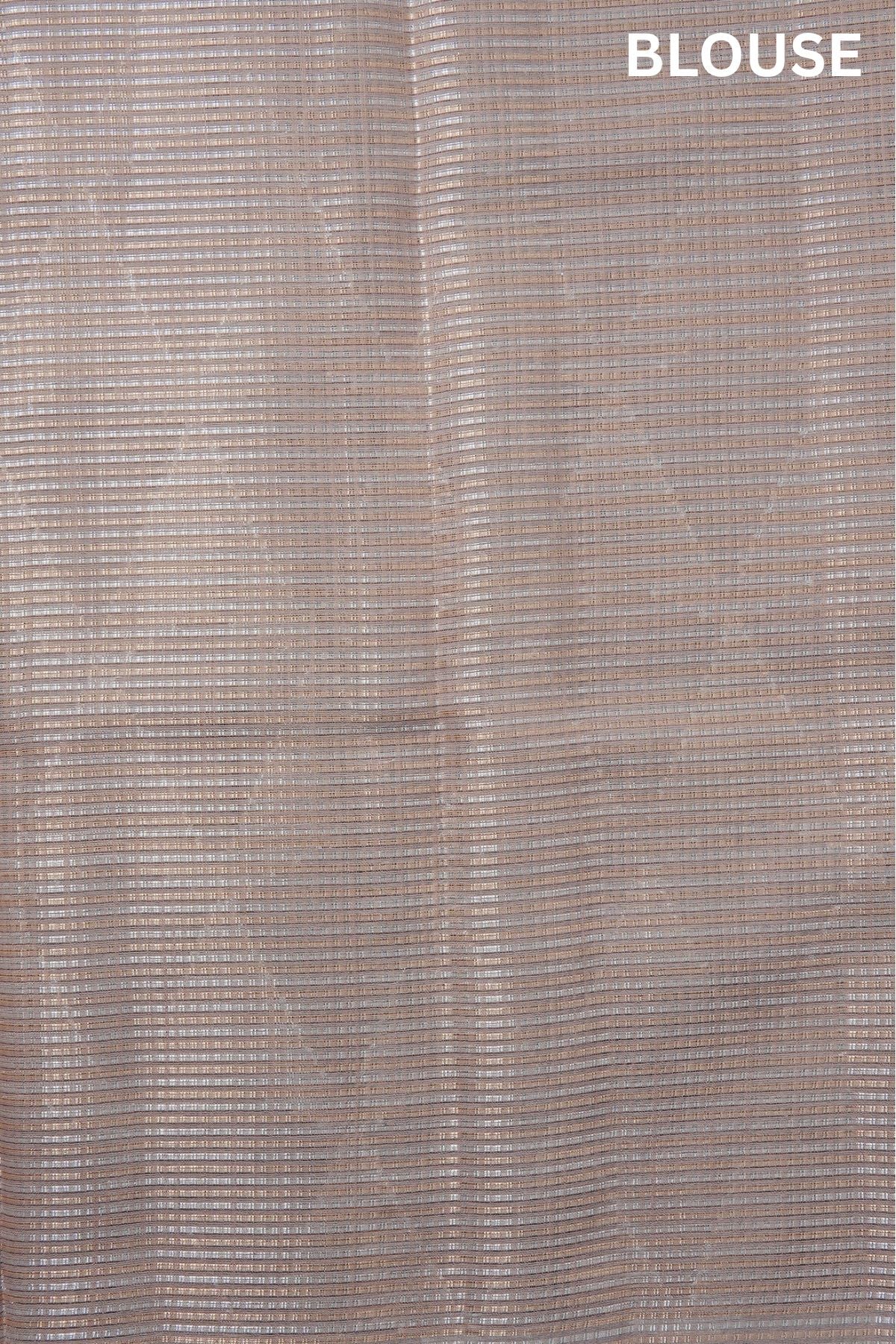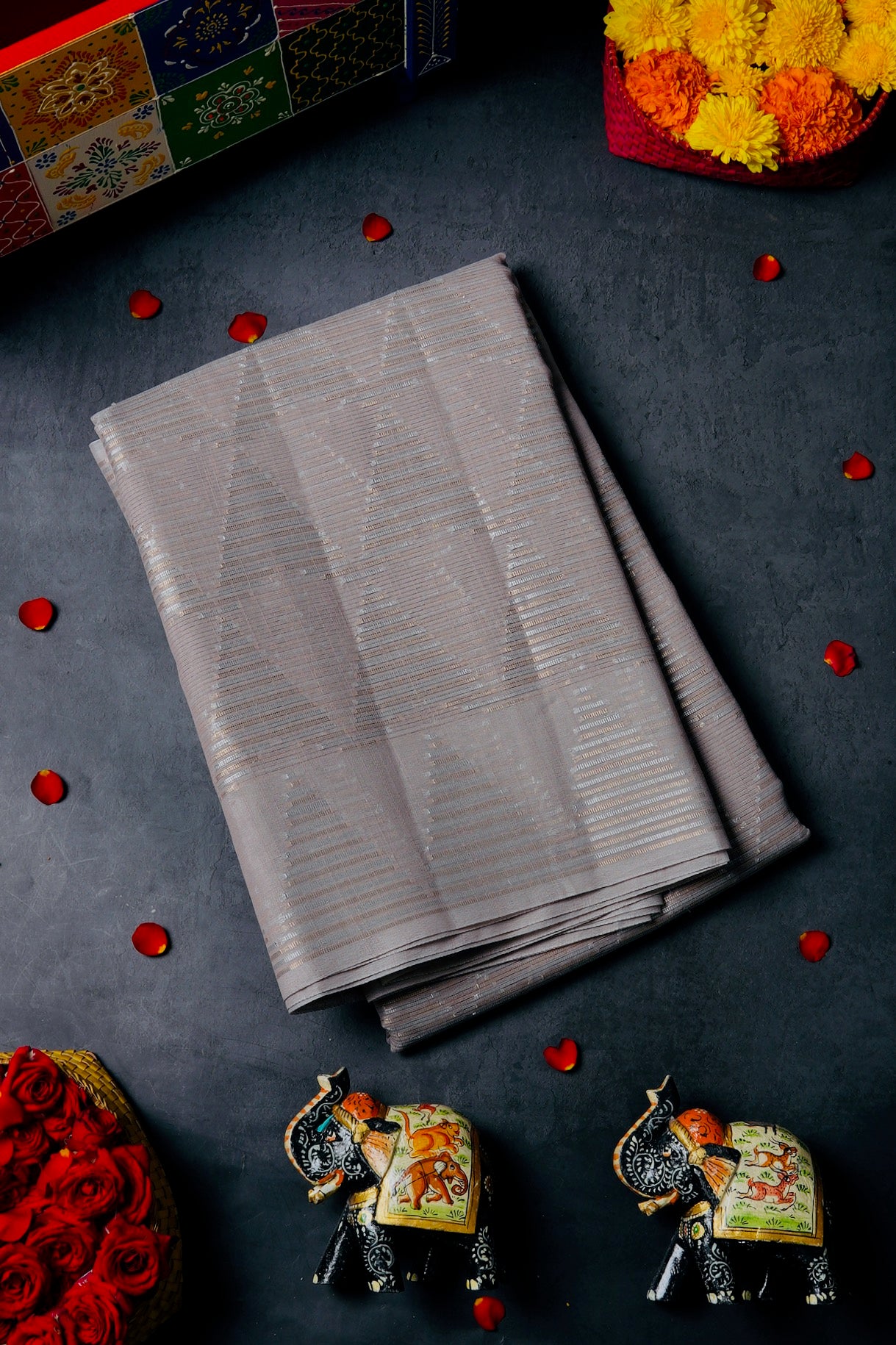 Light lilac semi silk cotton saree with broad triangular arrow motifs woven in gold and silver zari throughout the body. The pallu has a vast diamond motifs surrounded by floral motifs woven in zari. The saree has a light lilac blouse with broad diamond motifs filled with alternating gold and silver zari.