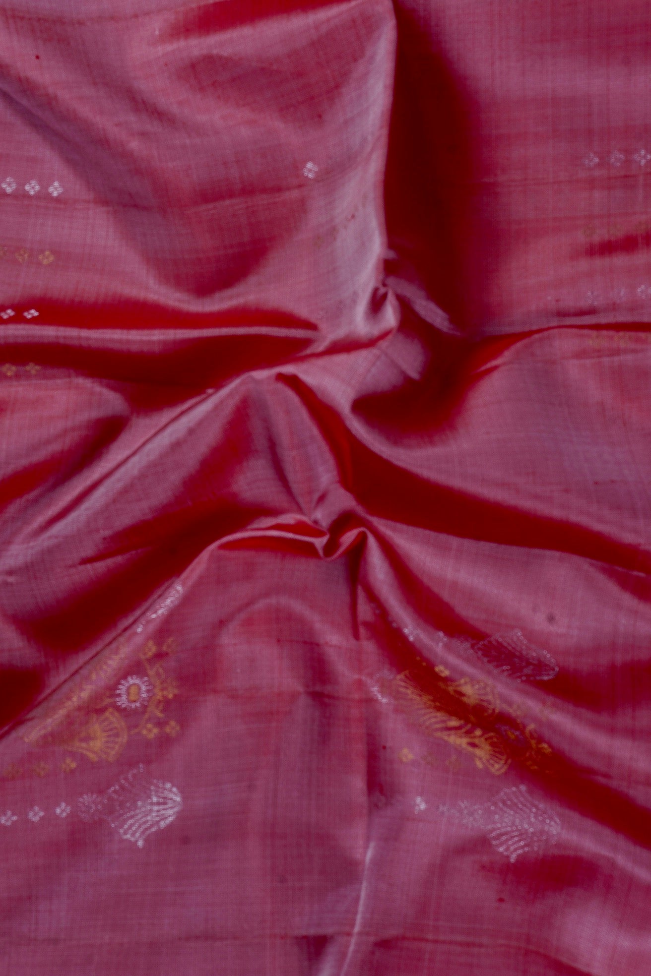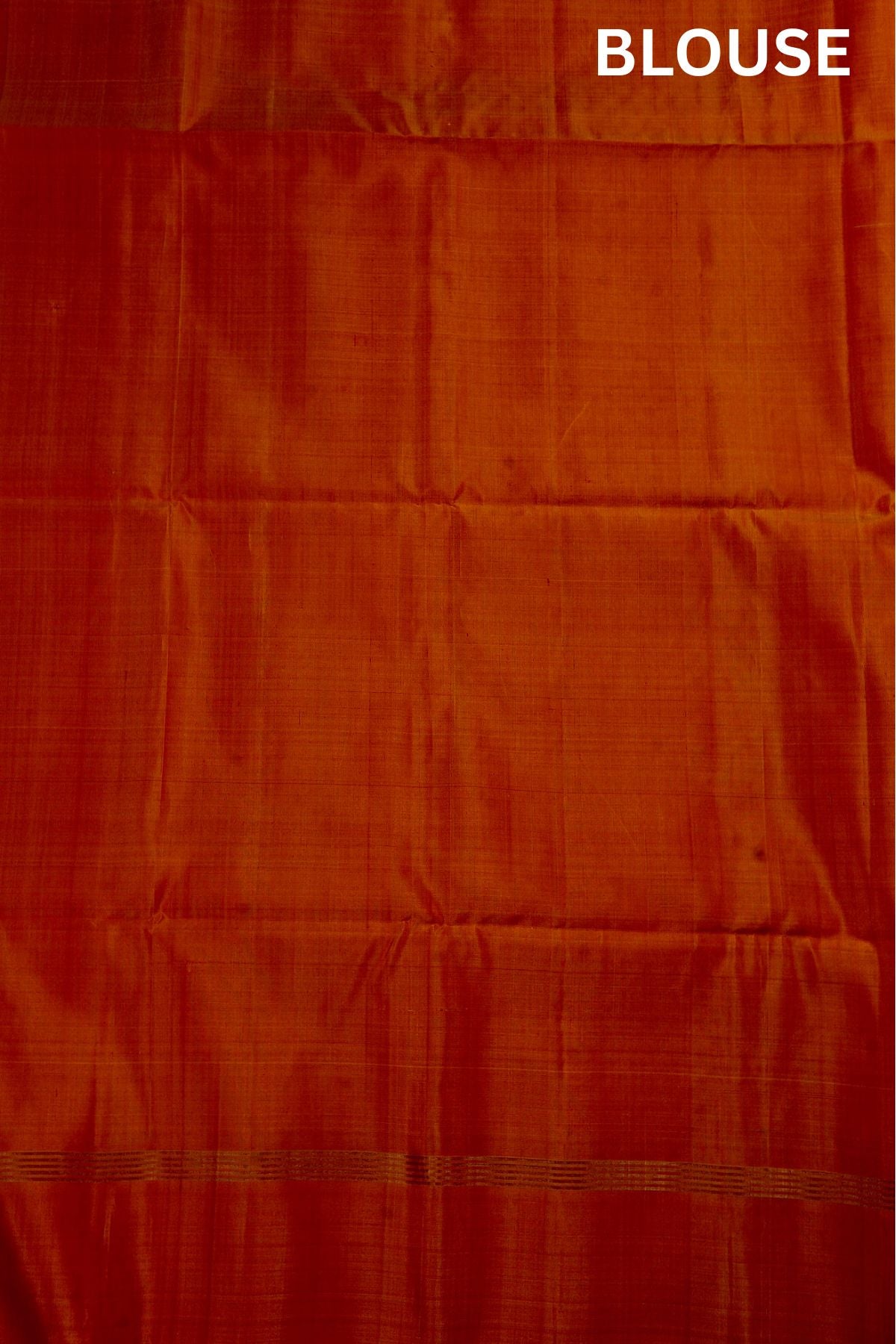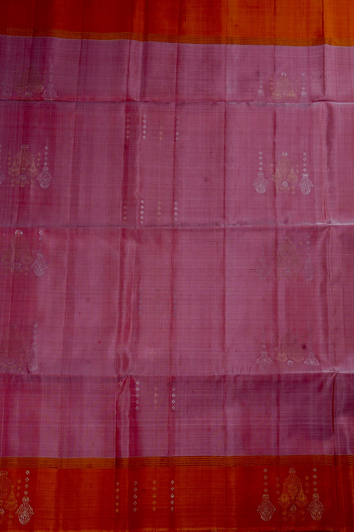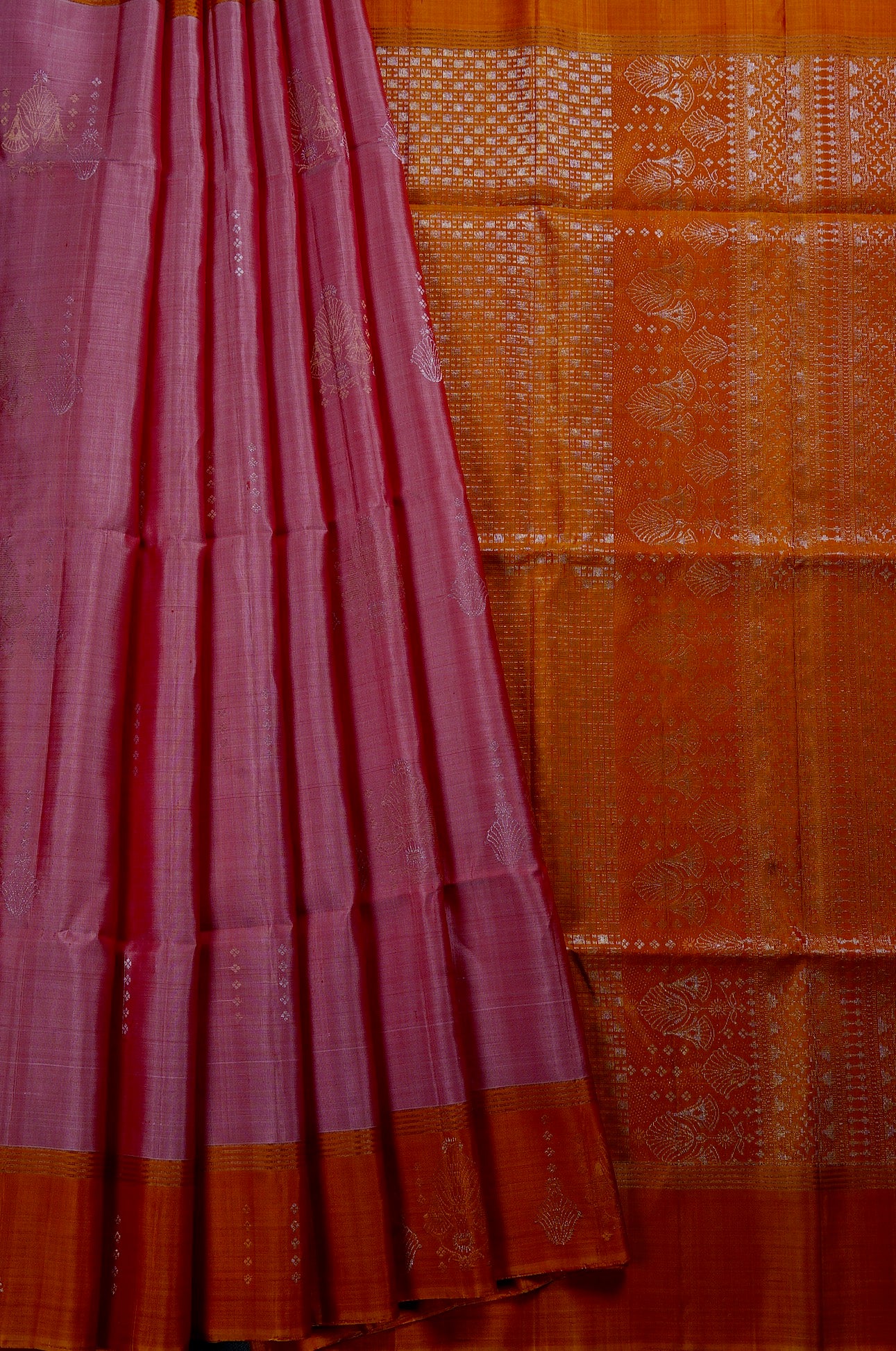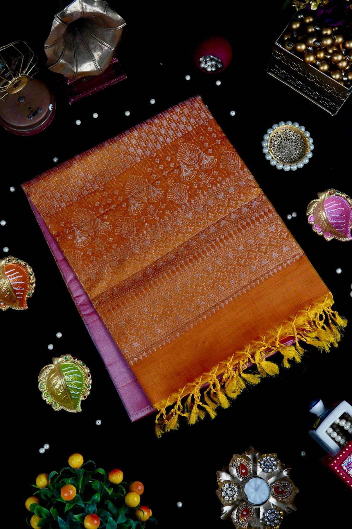 Previous NextA simple soft silk saree woven in mulberry threads, holding divine motifs resembling pleated flower petals hanging from a geometrically woven plant motif, with diamonds forming linear pattern woven in gold and silver zari, and a solid bright orange border. The pallu has a bright orange base, filled with silver zari checks, followed by the floral hanging motifs woven in opposite directions and bands of stylised diamond frames. The saree has a solid bright orange saree.
