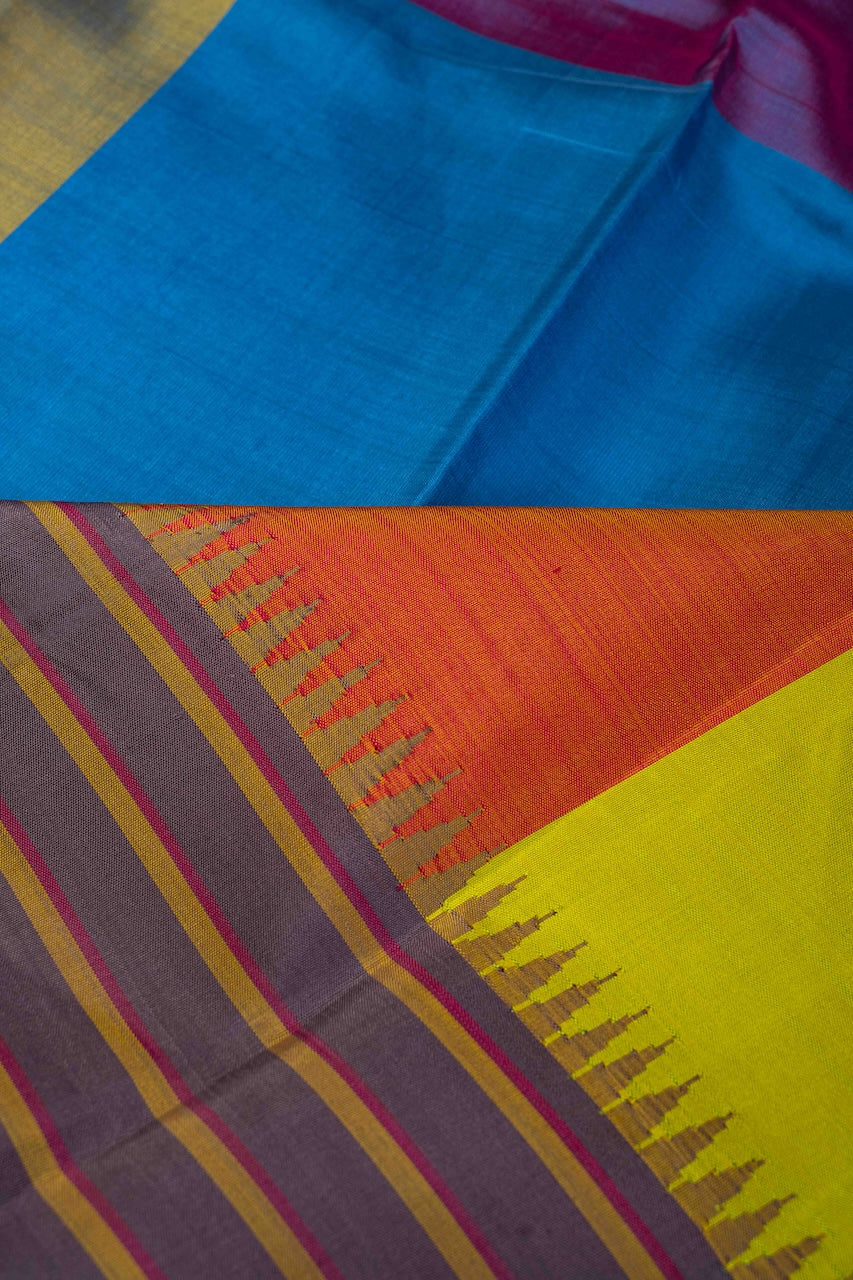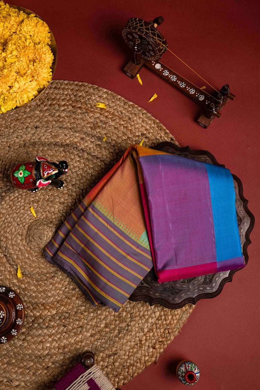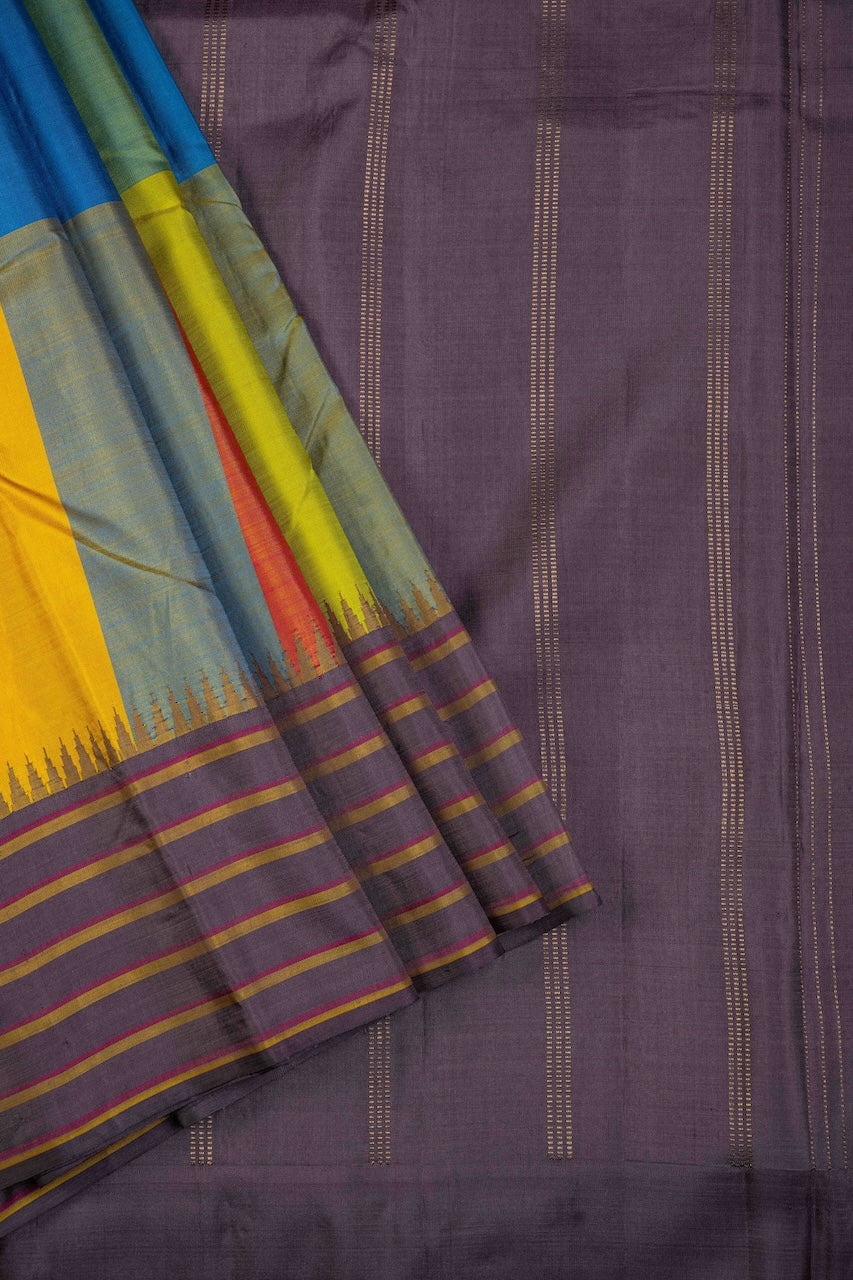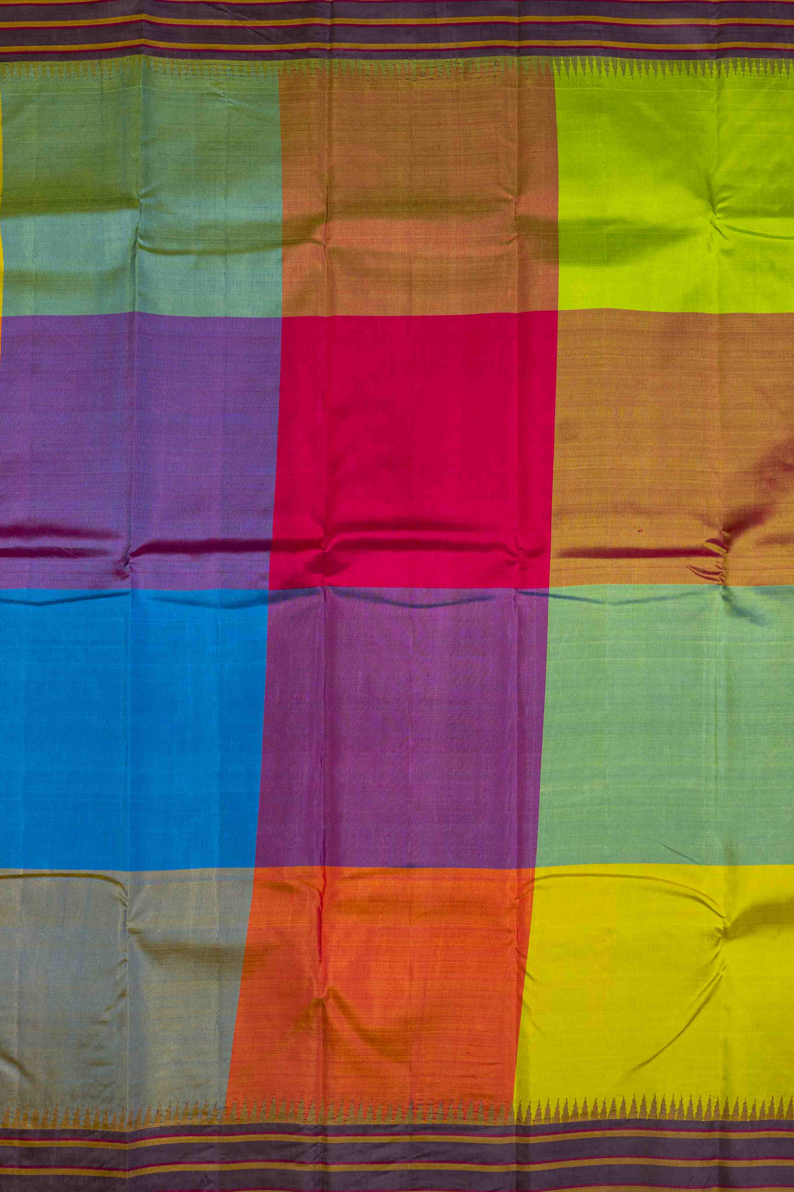 Previous NextMulticoloured kanchipuram silk saree with colourful box patterns traversing the body, paired with a grey Temple-rek border.