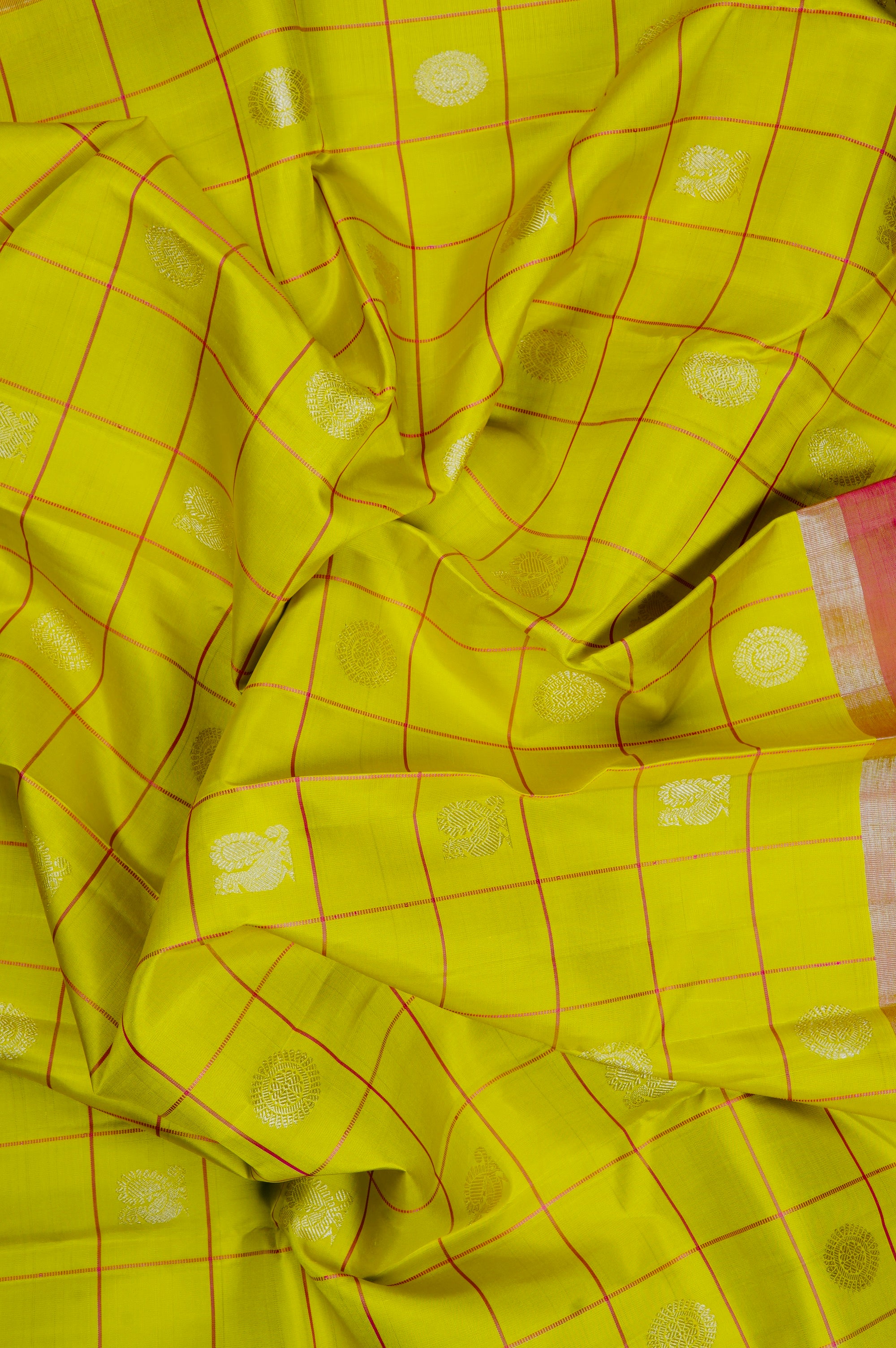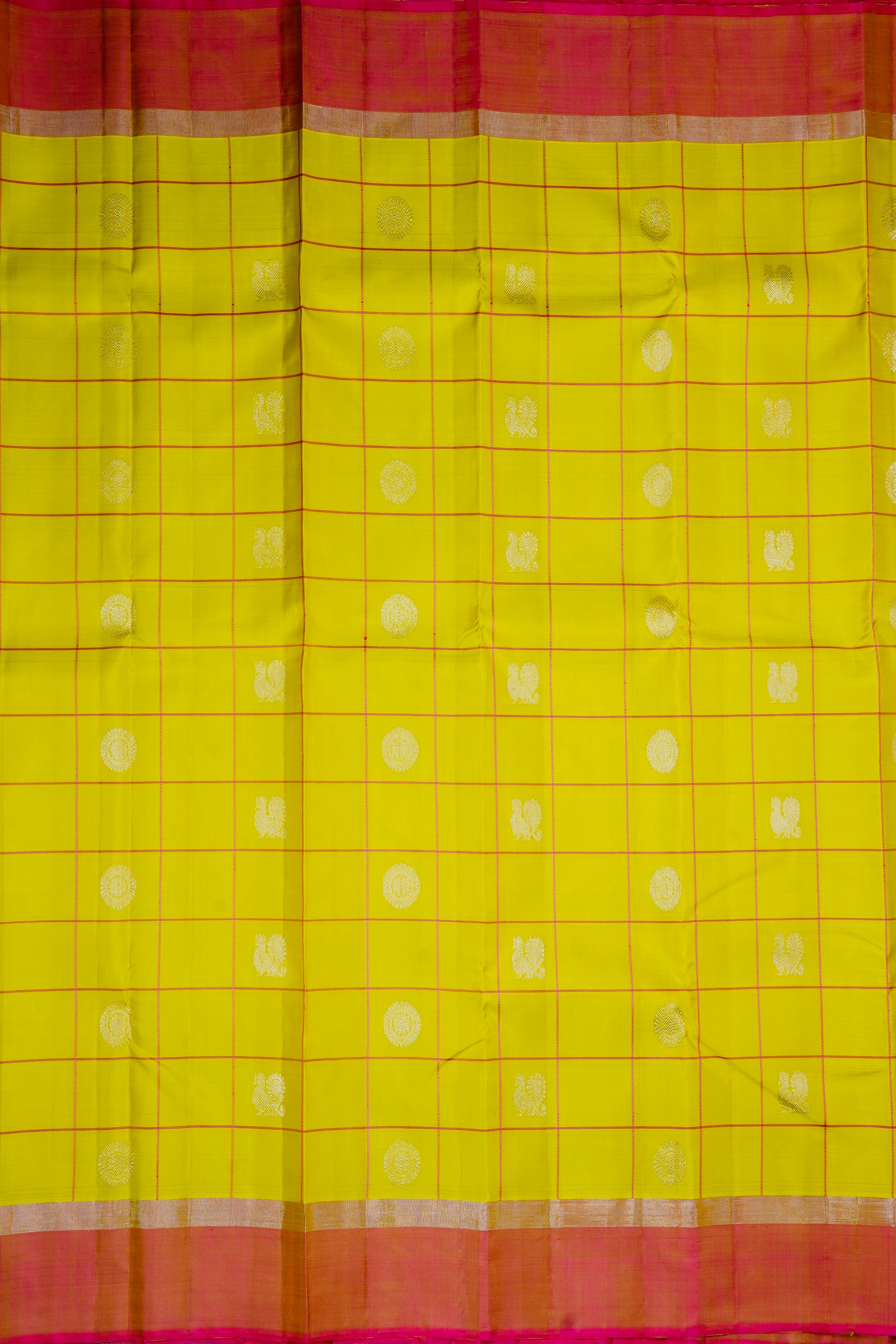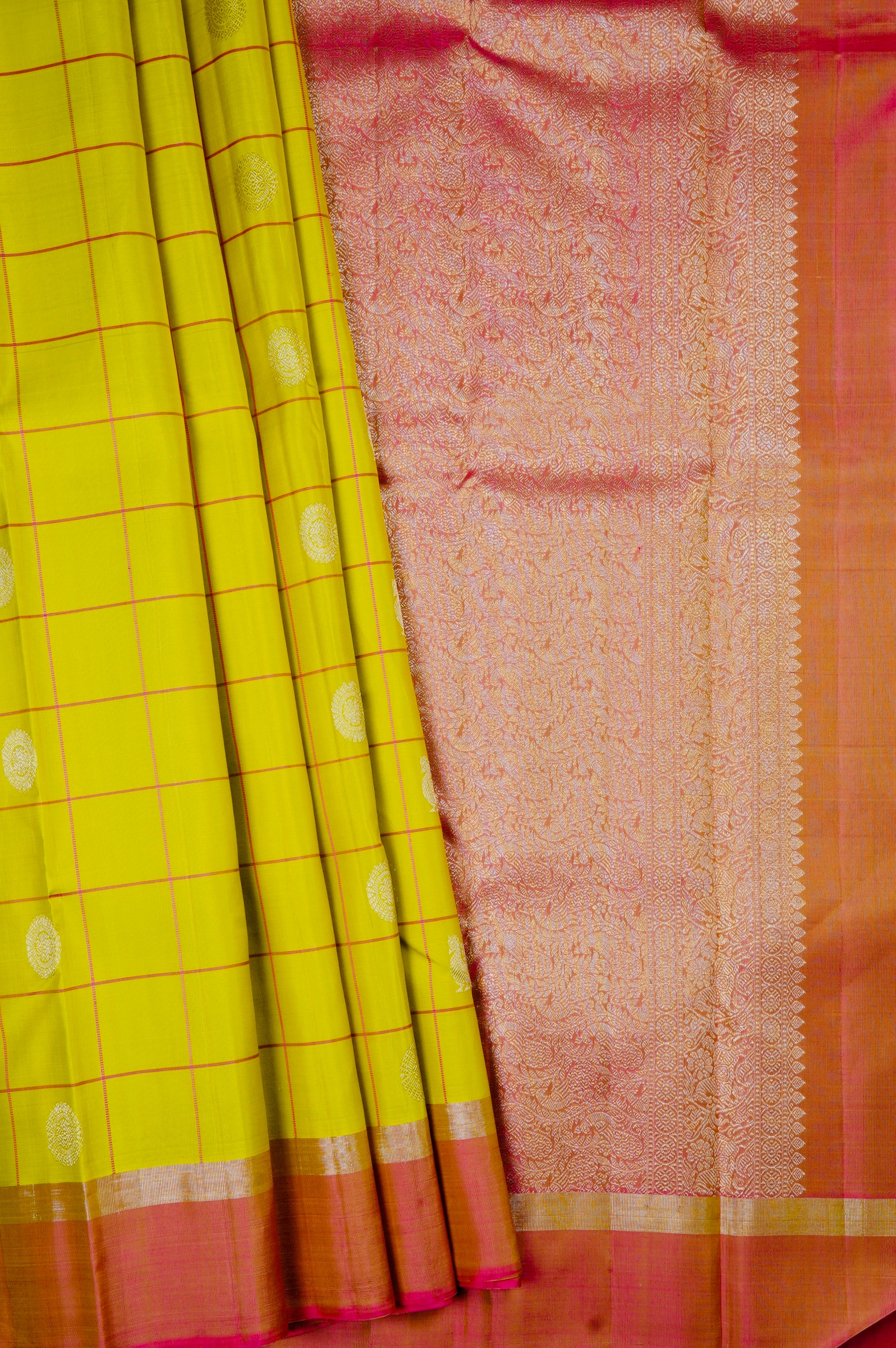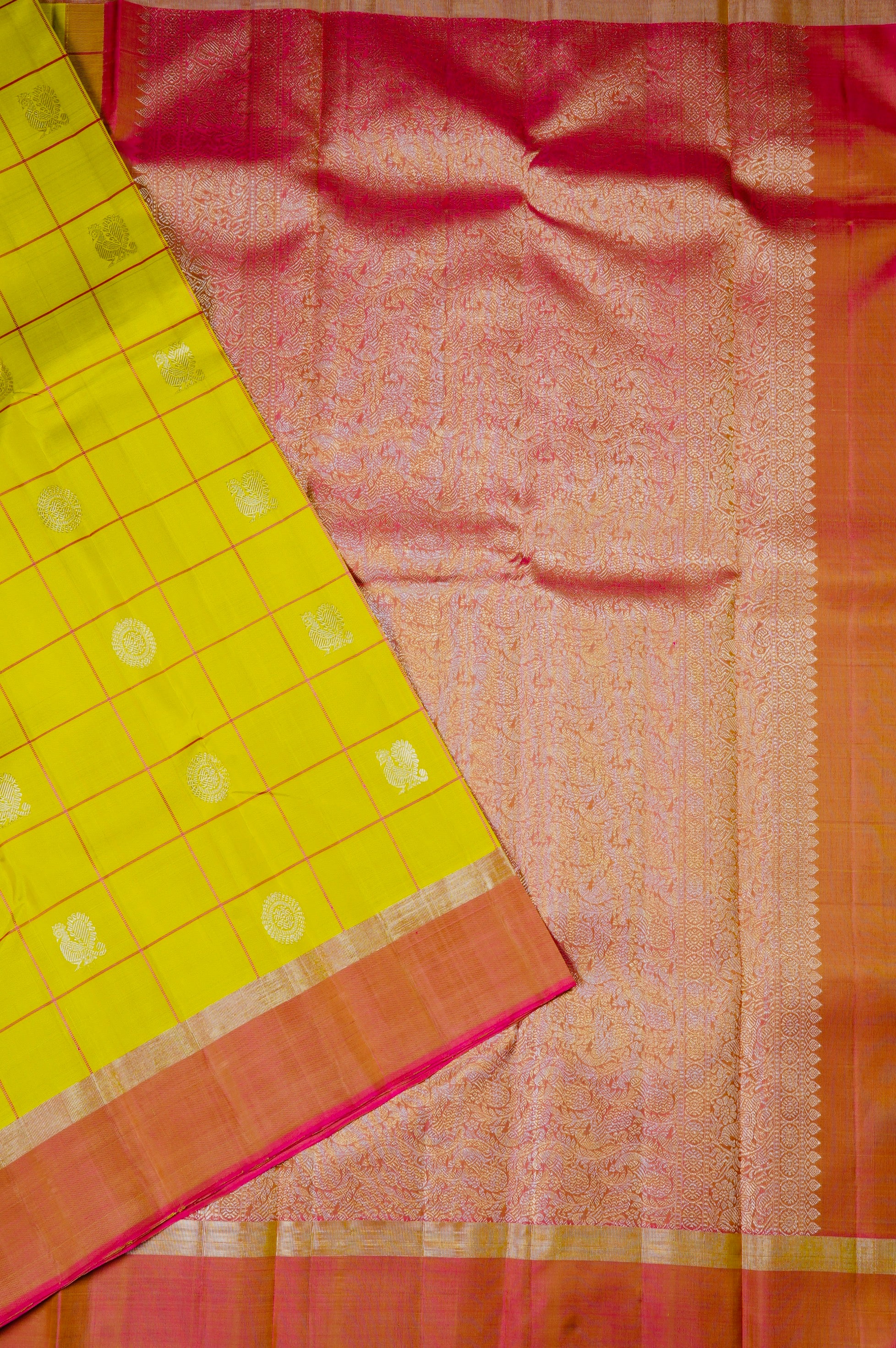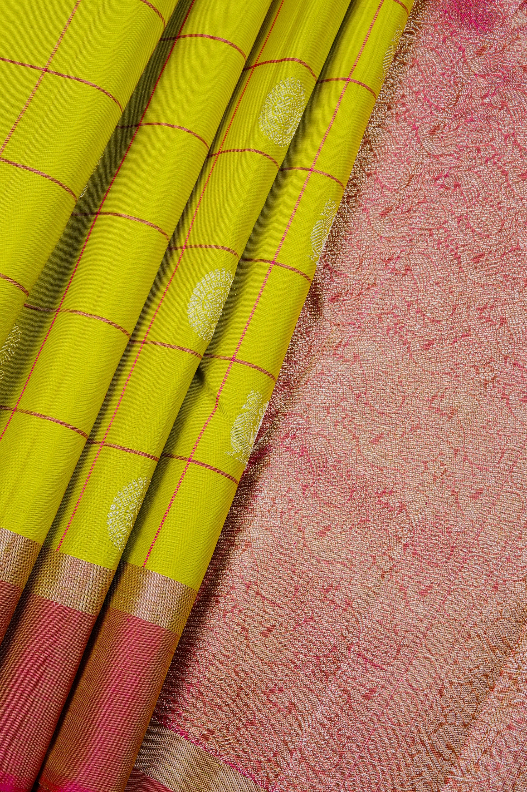 Mustard flower kanchipuram silk saree with bright pink checks, holding circular mandala motifs and peacock motifs woven in silver zari throughout the body. The border starts with a band of silver zari followed by a band of bright pink with a zari undertone. The pallu has dual shade base of bright pink and gold zari filled with intricate floral kodi motifs, followed by a band of horse motifs surrounded by floral patterns woven in silver zari. The saree has a dual shade blouse of pink and gold with the same border.