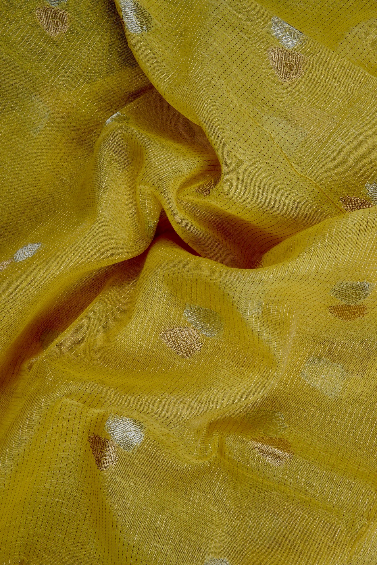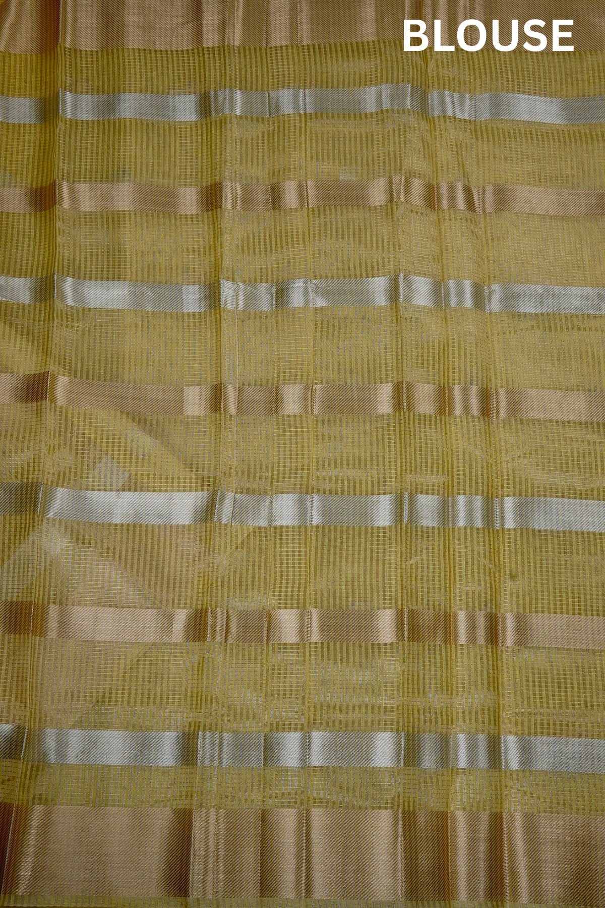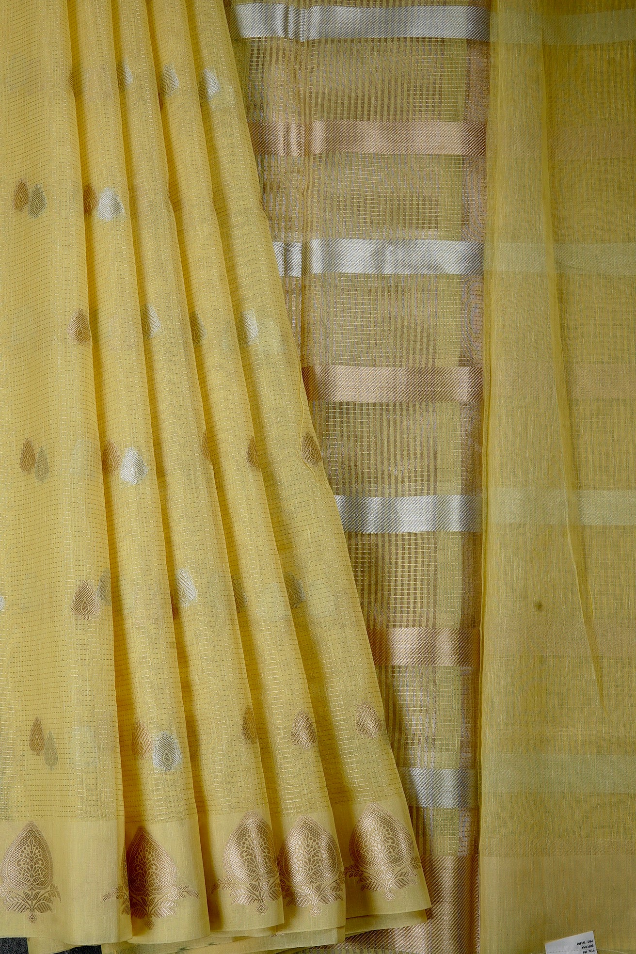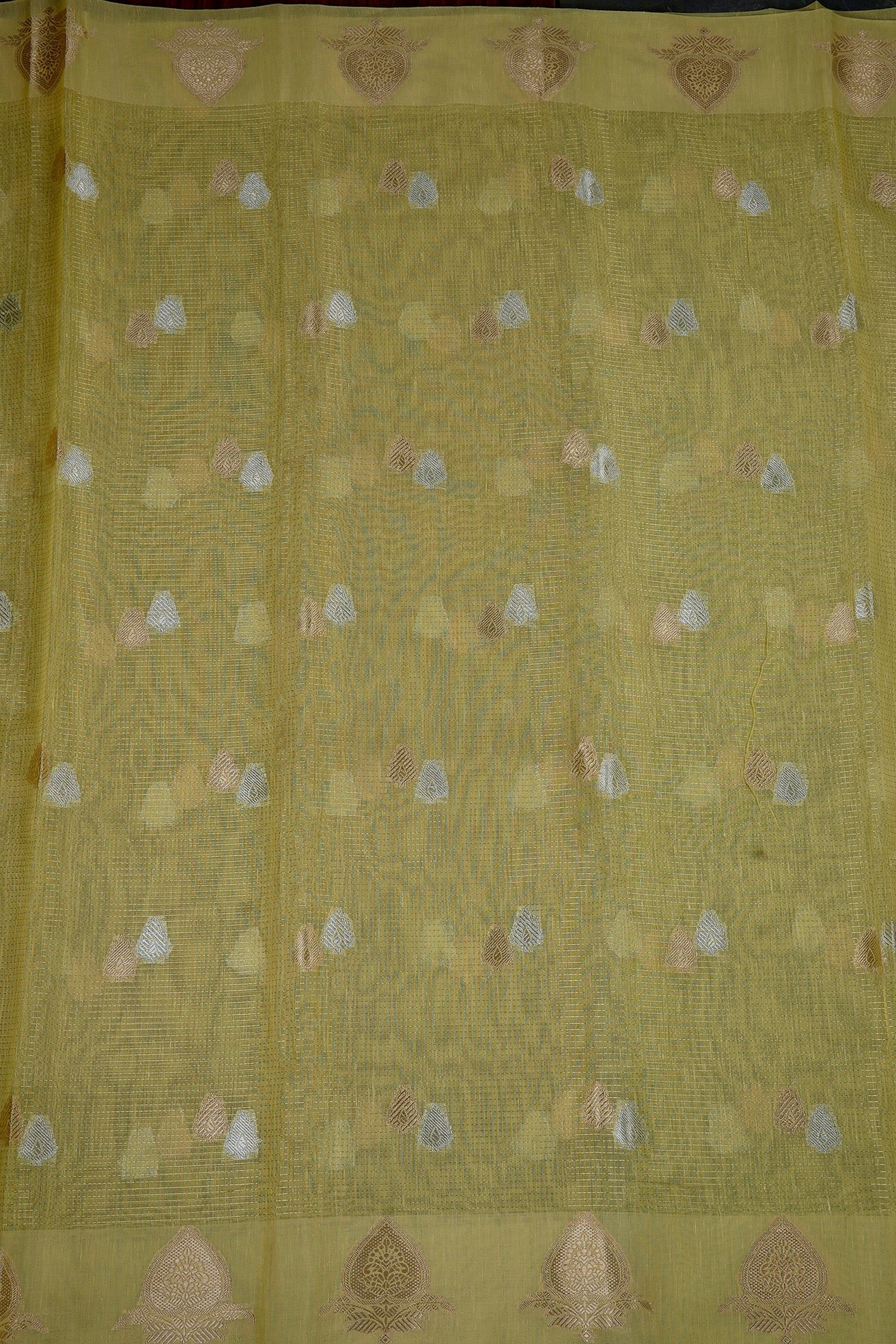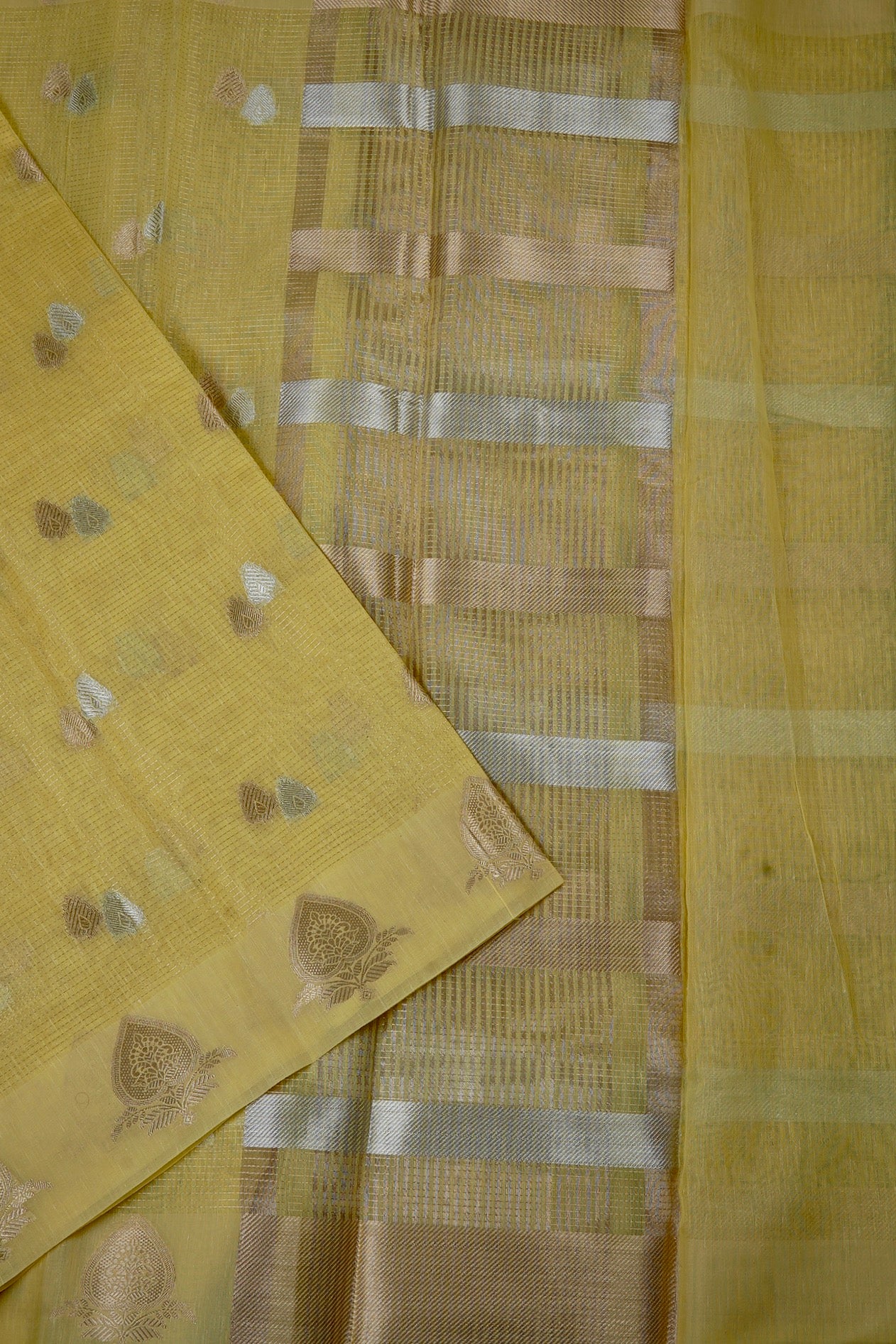 Previous NextA pastel green semi silk cotton vision in a mild mustard shade, filled with double petal shaped bhuttas woven in gold and silver zari. The border holds bold and elegant plant motifs stylised by traditional design elements, woven in gold. The pallu is a simple series of alternating gold and yellow zari bands woven horizontally along the saree. The blouse is identical to the pallu of the saree.