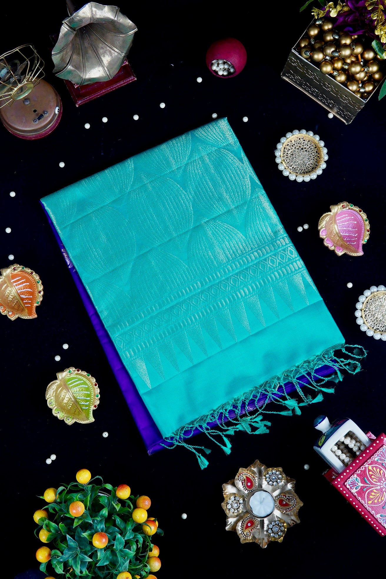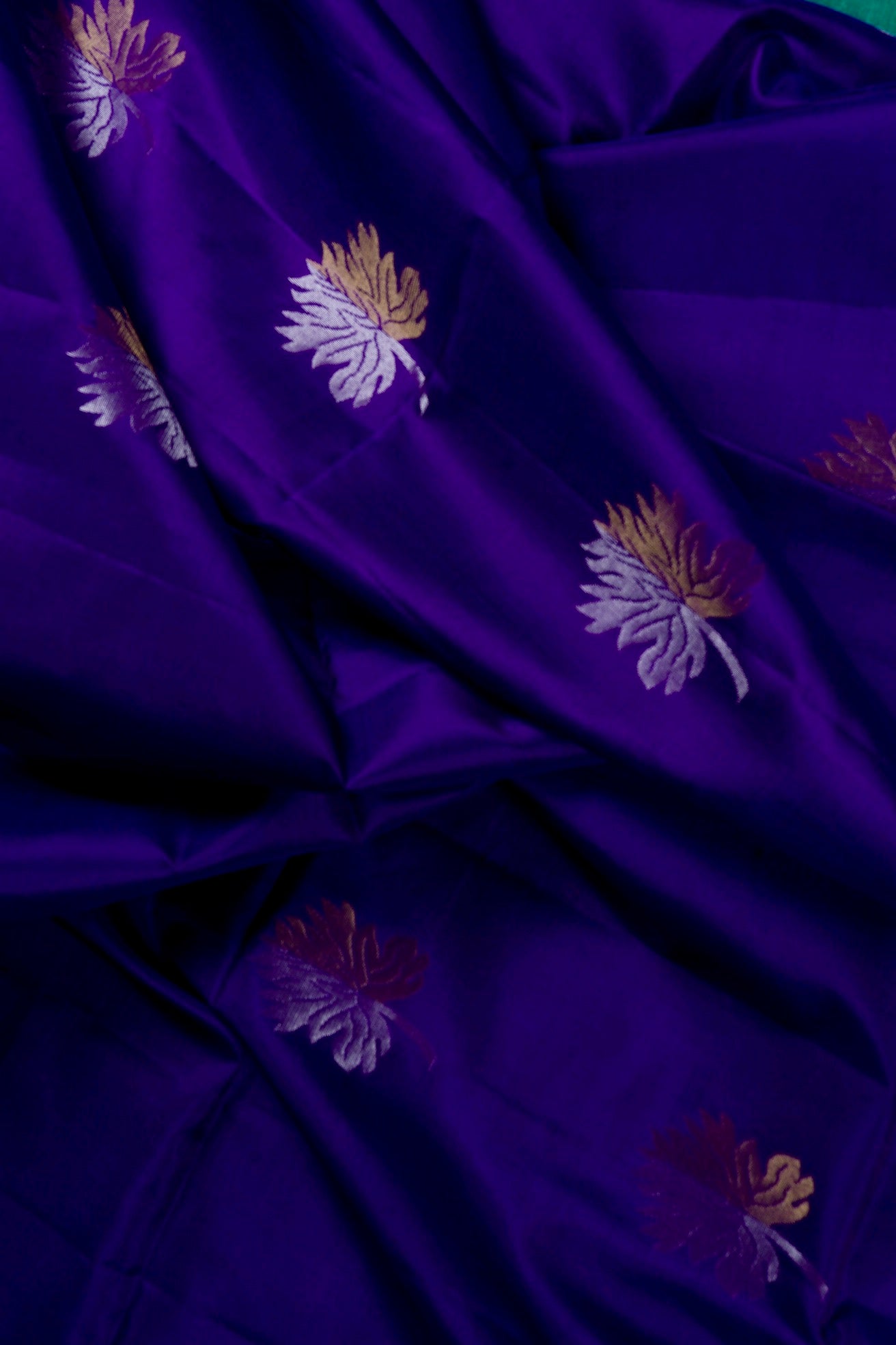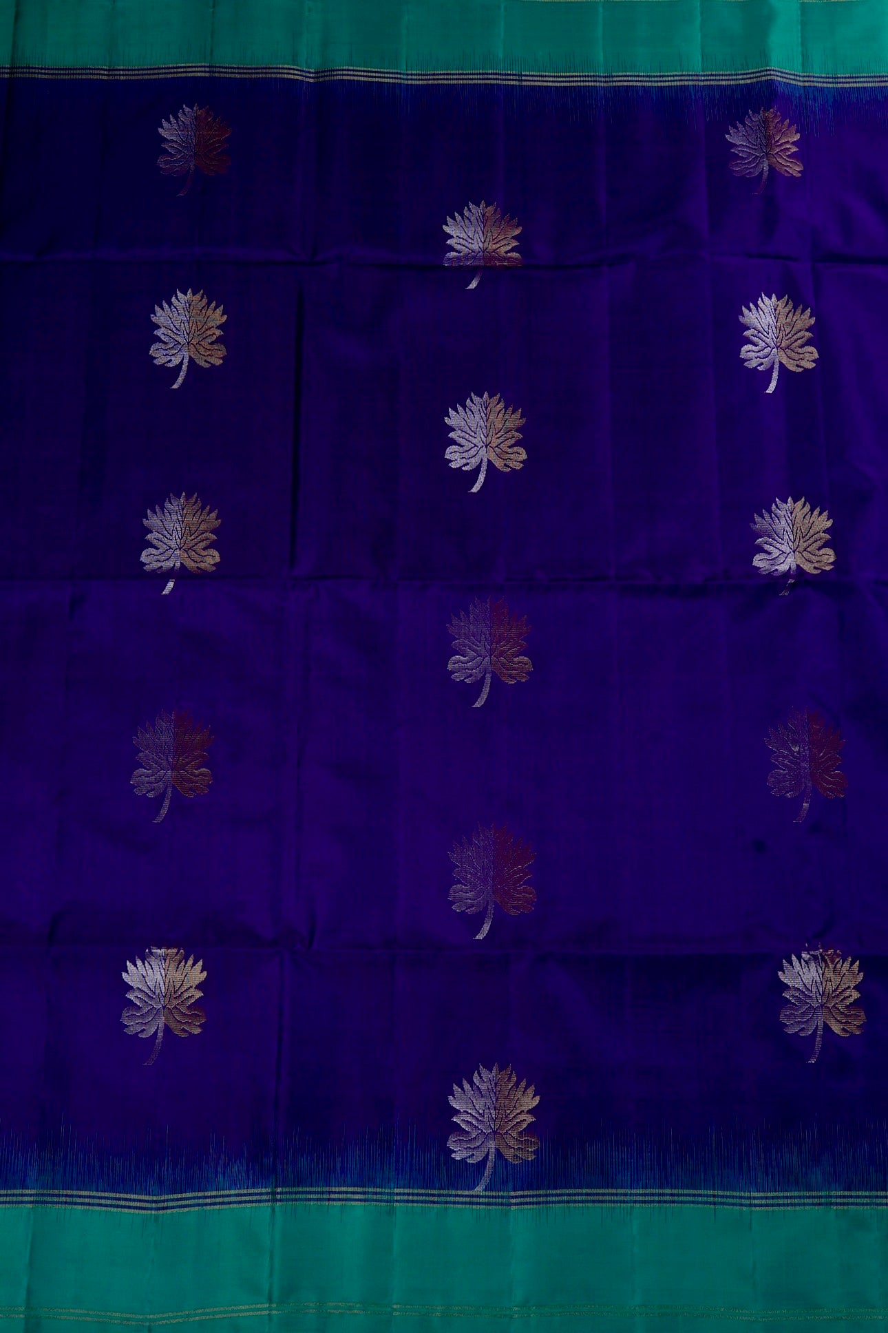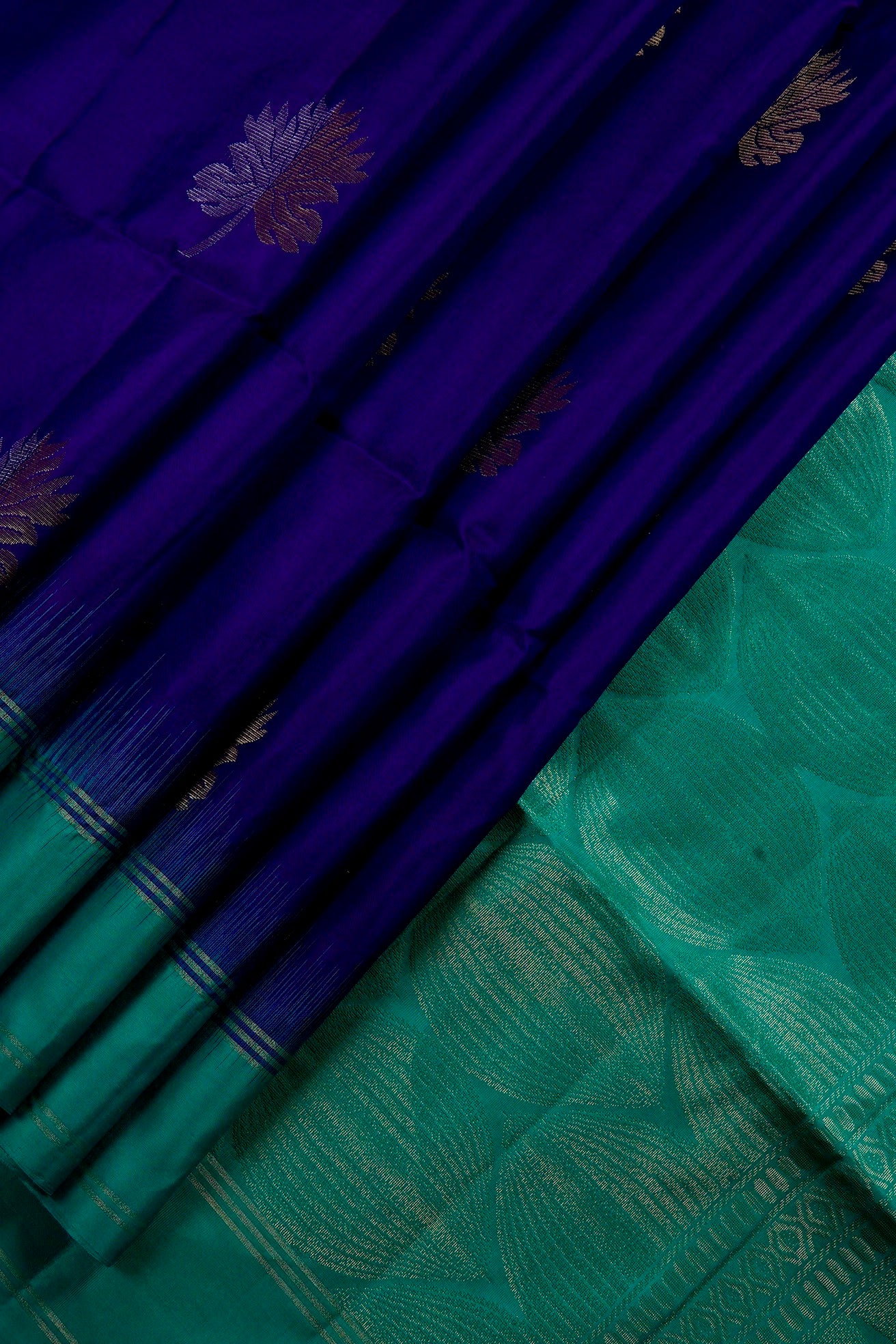 Previous NextA navy blue soft silk royalty holding withering autumn flowers woven in gold and copper zari throughout the body, giving it a fusion feel between a a fall vibe on a winter base. The border is a solid band in teal. The pallu has a teal base, filled with intricately almost invisible scalloping pattern woven in gold zari, ending with small bands of border, reflecting its beauty when the light hits the right angle. The saree has a solid teal blouse.