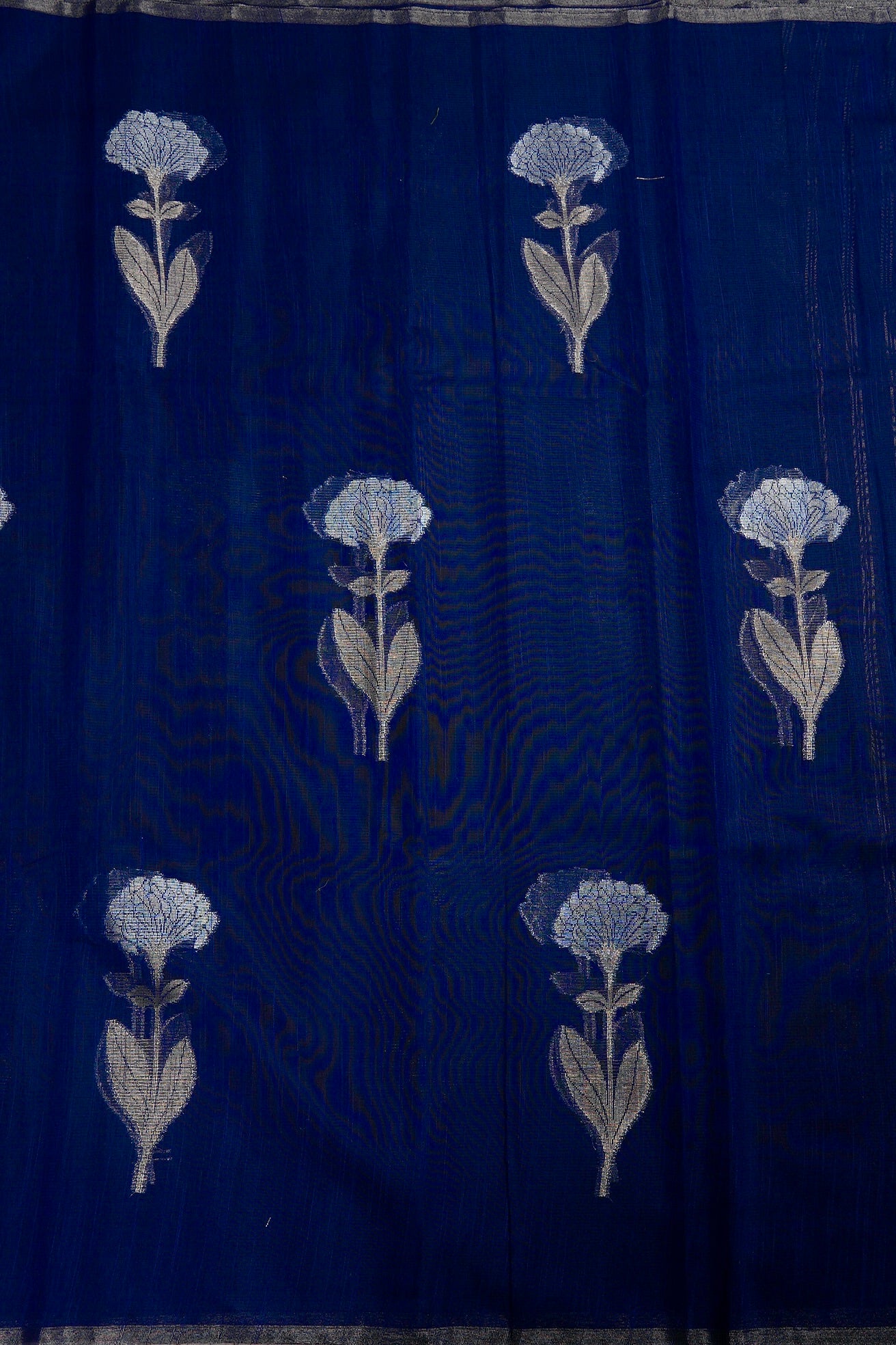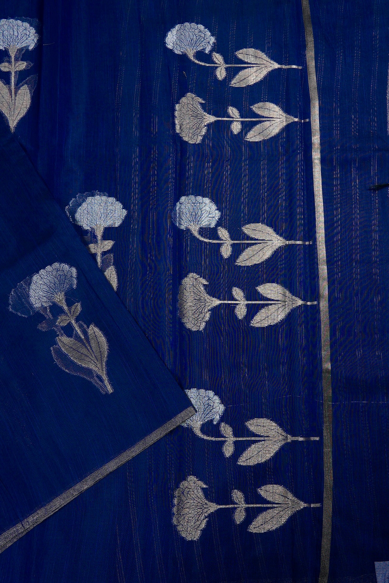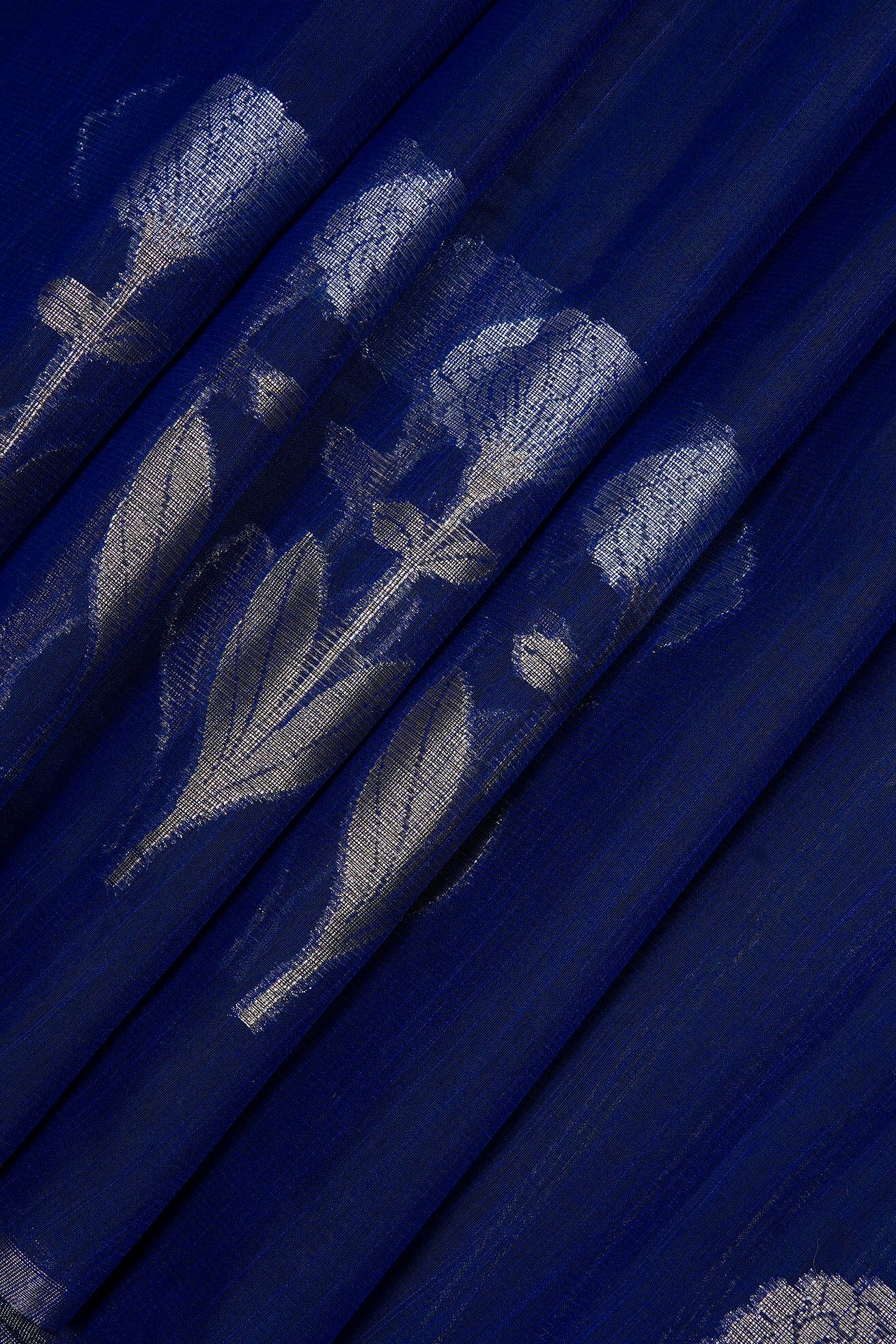 Previous NextElectric navy blue supernet saree featuring intricate marigold floral patterns woven in shimmering silver zari. The body is framed by a clean, minimalist silver band border, leading to a pallu rich with blooming silver marigolds. Completing the ensemble is a matching navy blue blouse adorned with elegant vertical silver zari stripes.