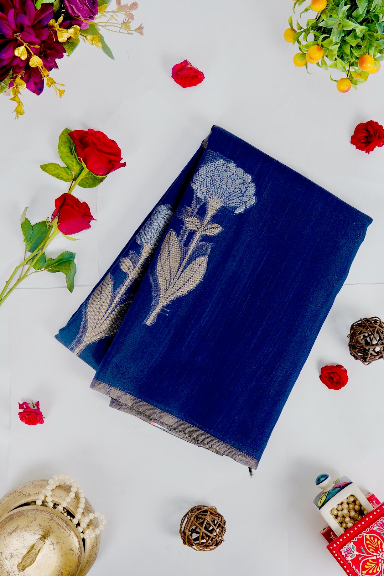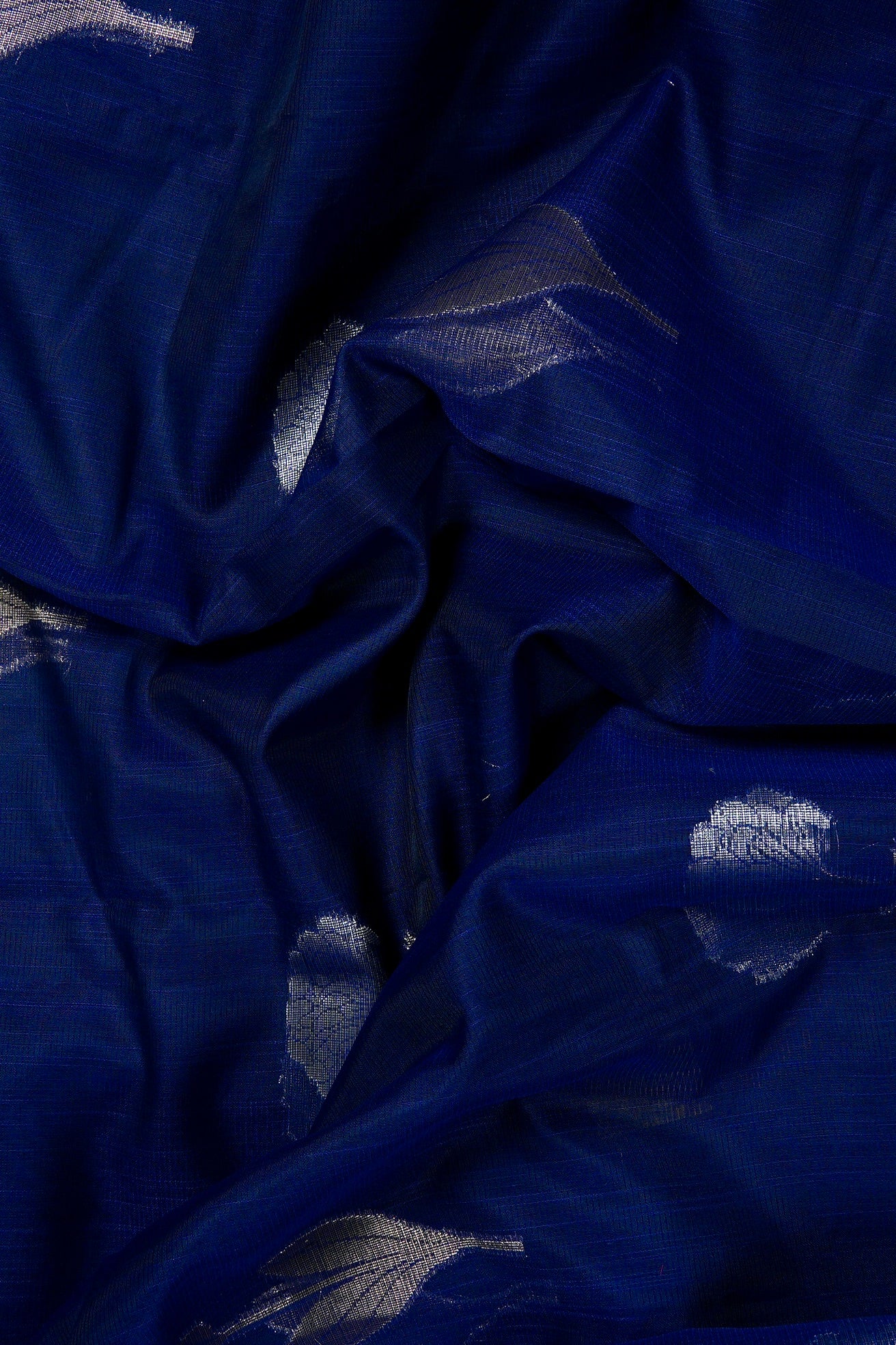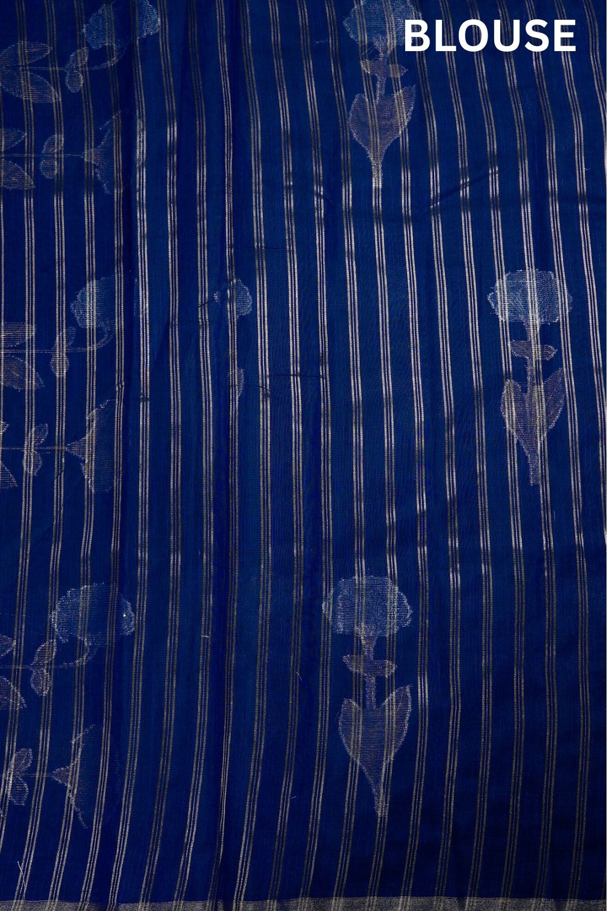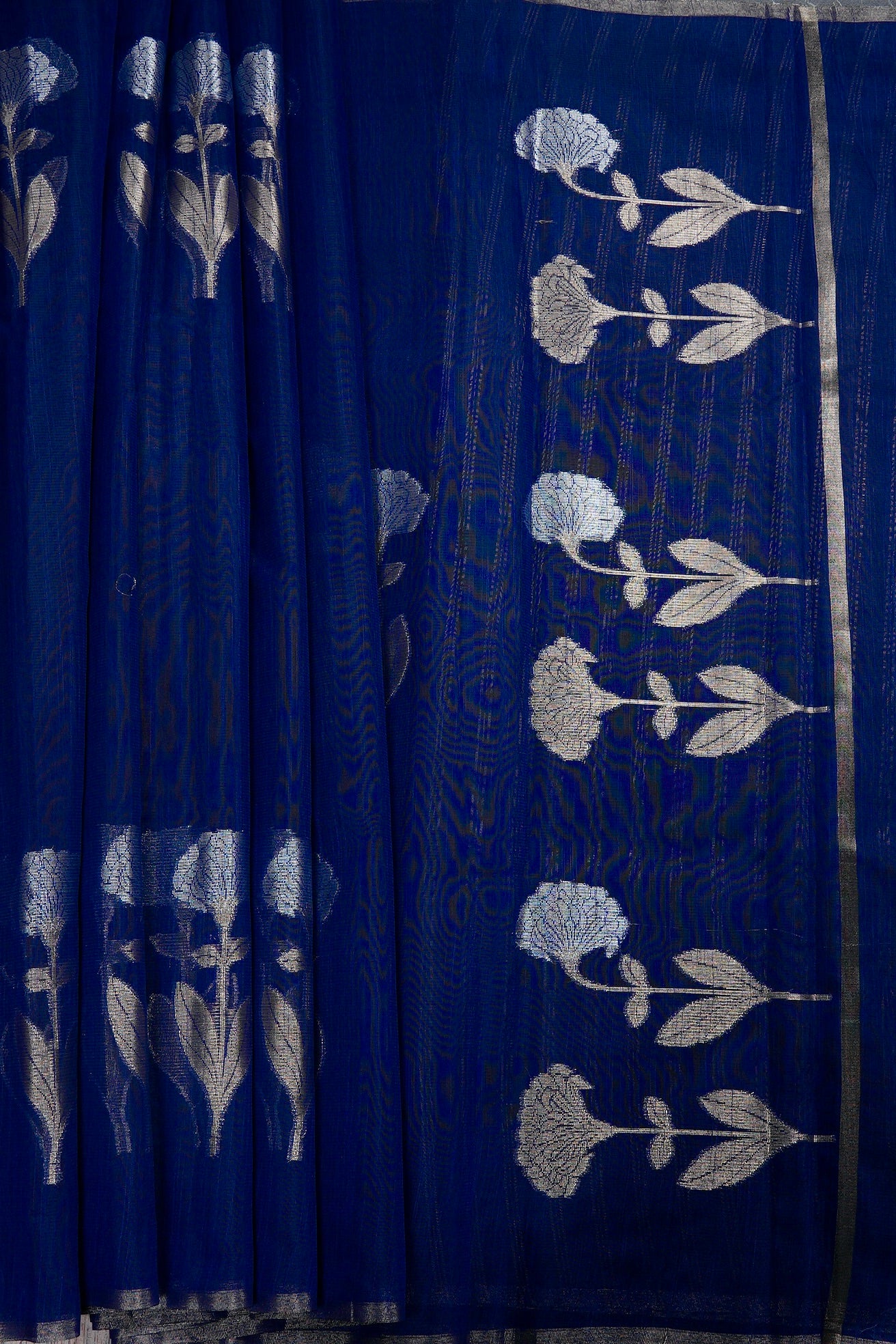 Previous NextElectric navy blue supernet saree featuring intricate marigold floral patterns woven in shimmering silver zari. The body is framed by a clean, minimalist silver band border, leading to a pallu rich with blooming silver marigolds. Completing the ensemble is a matching navy blue blouse adorned with elegant vertical silver zari stripes.