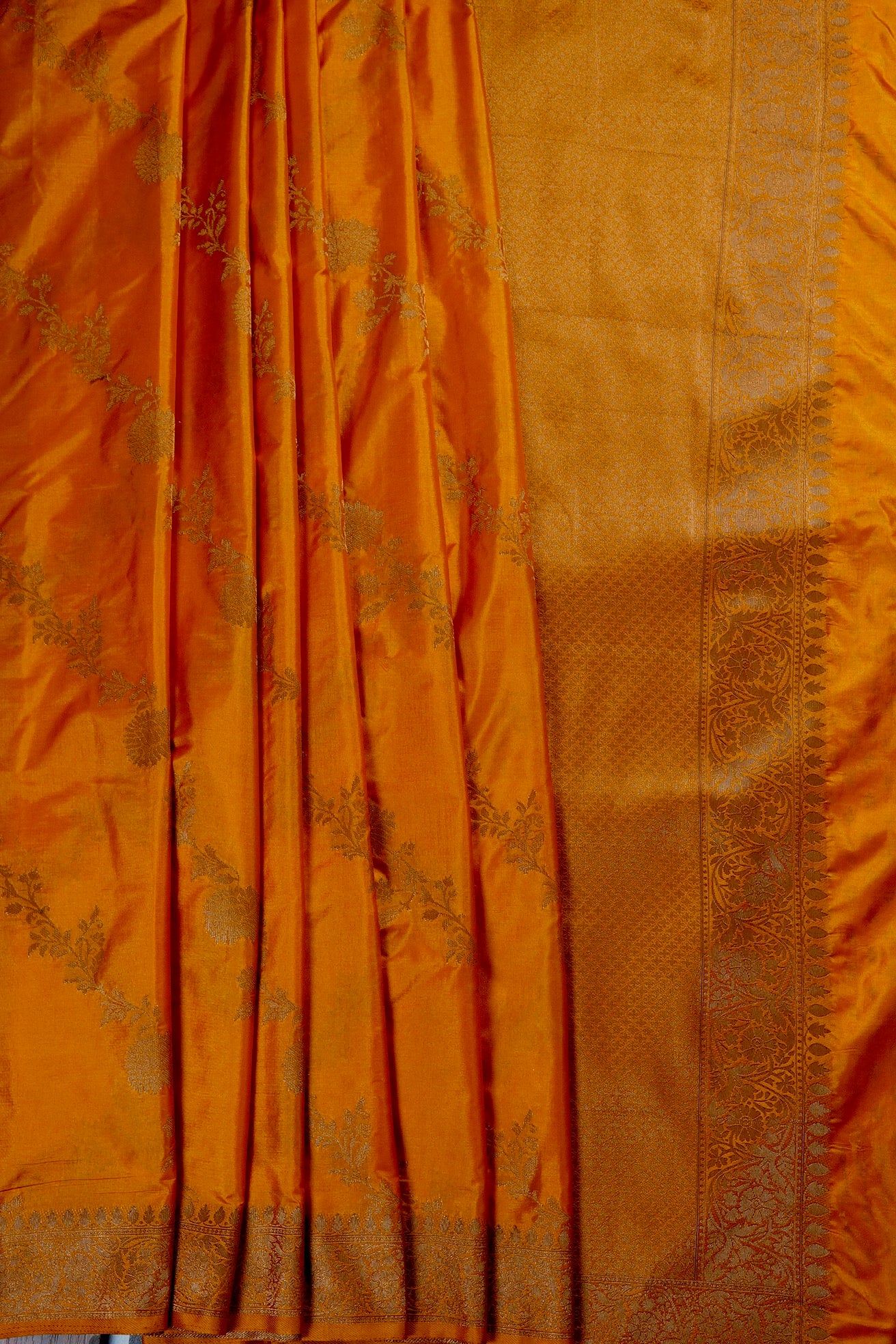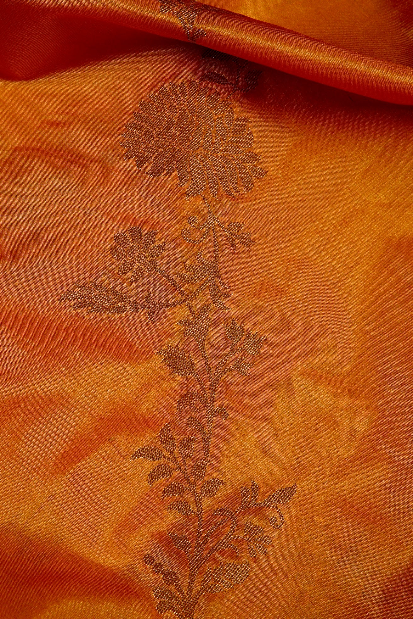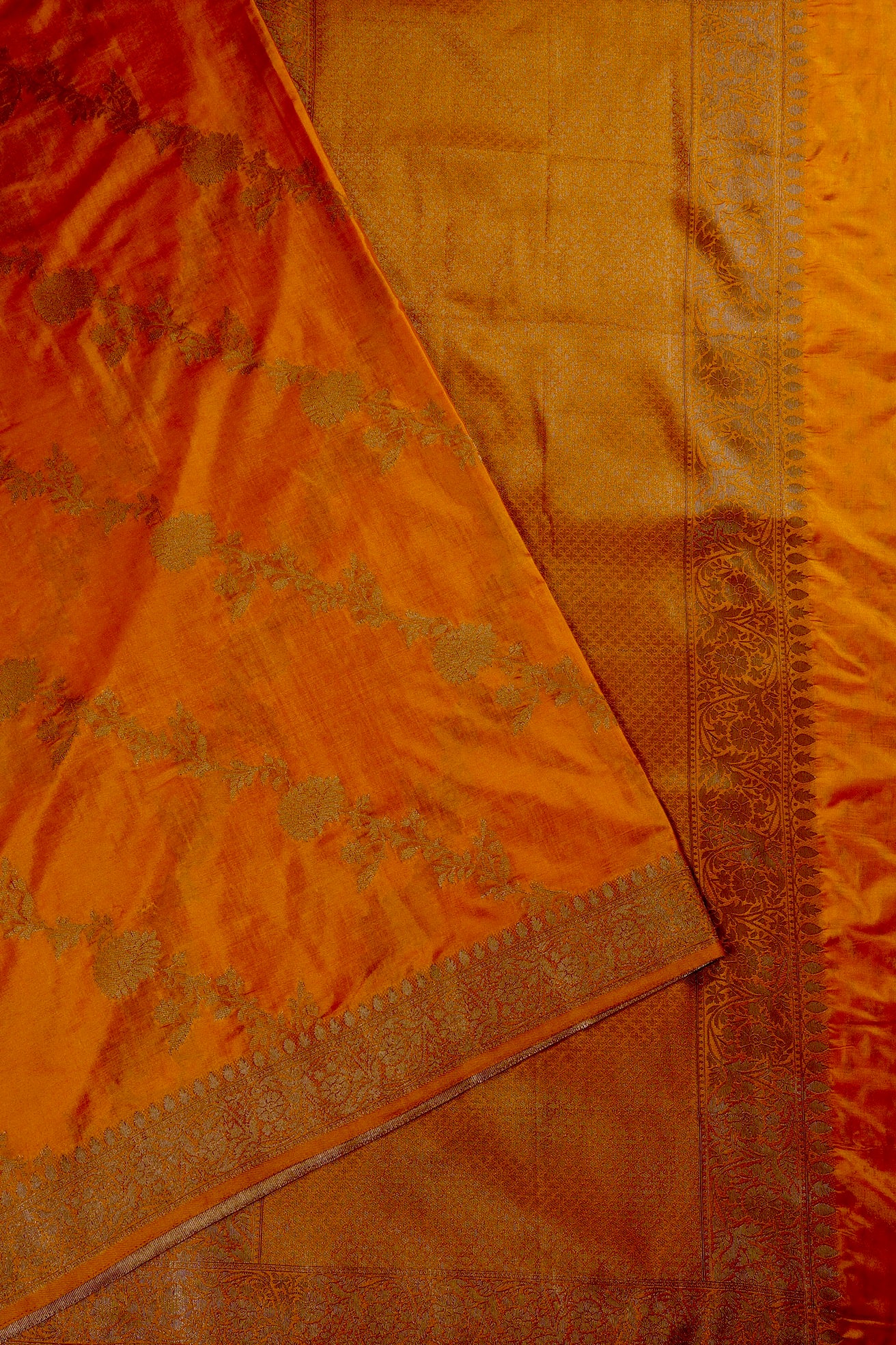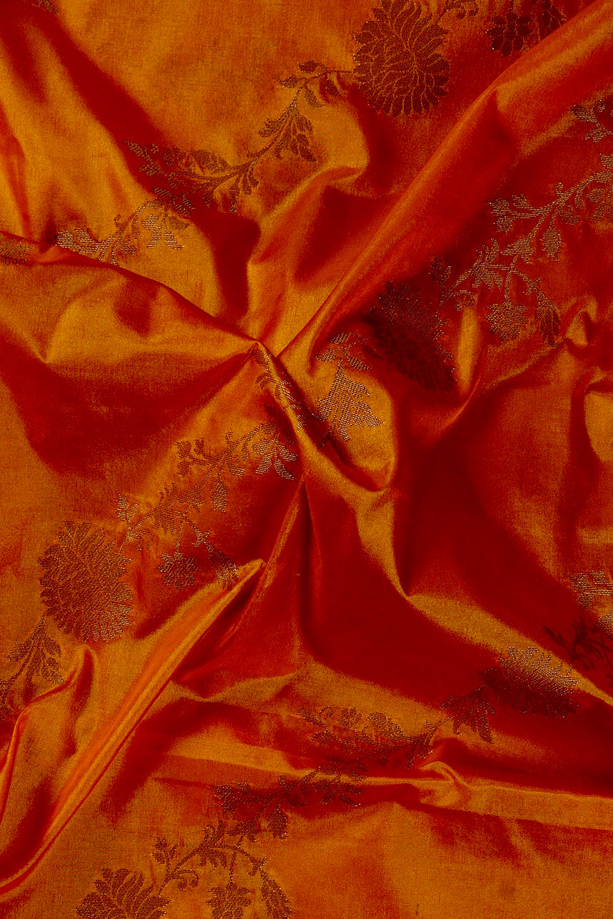 Previous NextAn orange semi tussar saree with thick vine pattern flowing diagonally through the body in gold, and a complementing border holding intricately woven floral vines in gold. The pallu is filled with small floral patterns sophistically woven in gold, looking like the golden hour at the perfect lighting. The saree has an orange blouse with small diamonds and the same border.