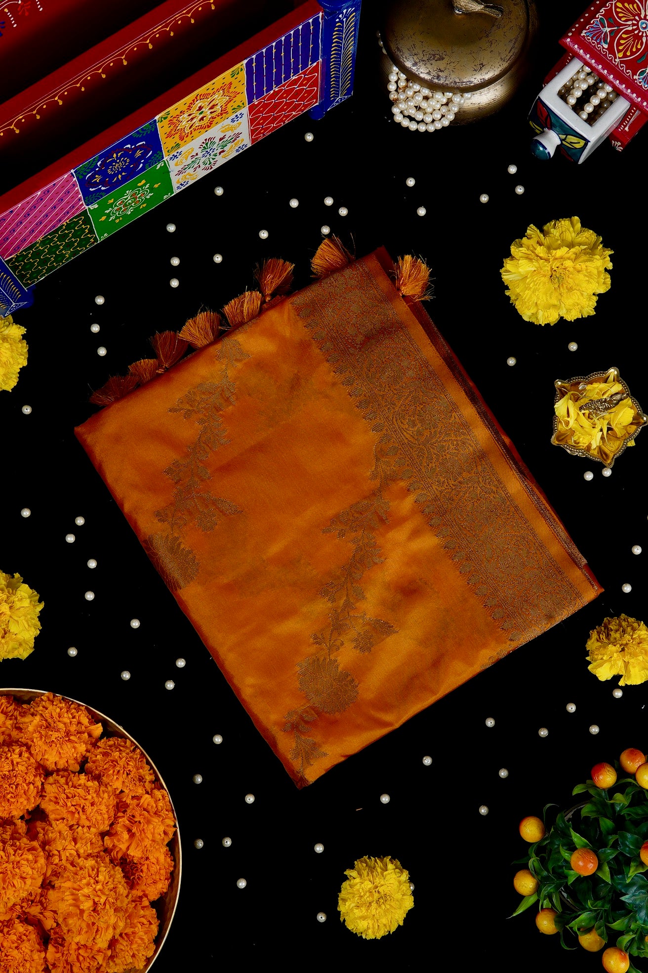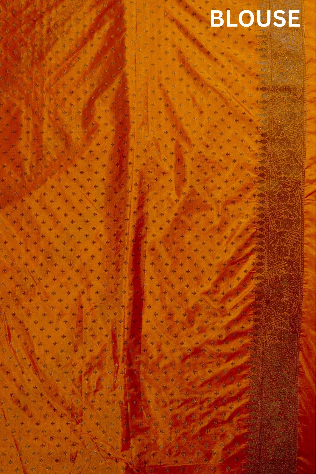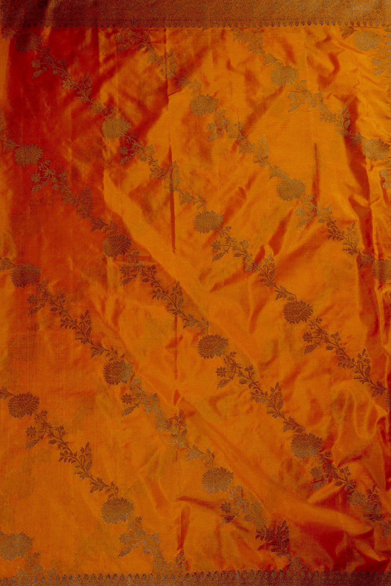 Previous NextAn orange semi tussar saree with thick vine pattern flowing diagonally through the body in gold, and a complementing border holding intricately woven floral vines in gold. The pallu is filled with small floral patterns sophistically woven in gold, looking like the golden hour at the perfect lighting. The saree has an orange blouse with small diamonds and the same border.