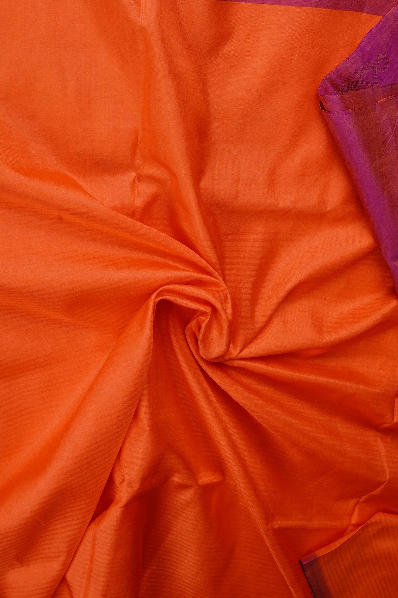 Previous NextA solid orange soft silk saree with a long deep pink border, leading to the pallu with a detailed floral motif woven in gold zari. The pallu has a purple base with a contemporary floral pattern inspired by zentangle designs woven in zari, ending with a band of small feather motifs. The saree has a solid purple blouse.