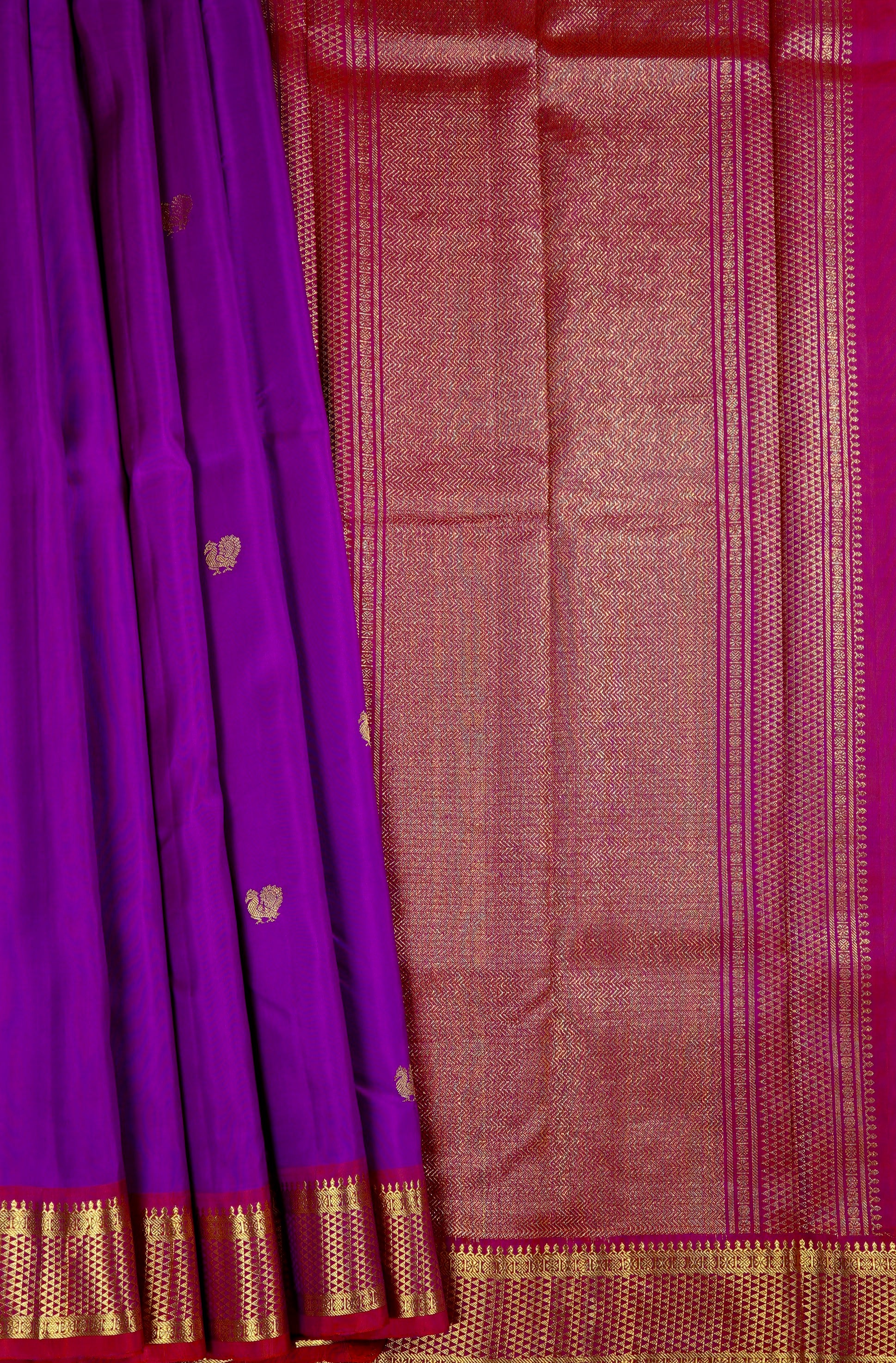 Previous NextA royal Kanchipuram vision in purple graced by small Annapakshi motifs all over the body woven in gold zari, with a carmine border filled with the traditional triangular grid pattern woven in gold zari. The pallu is an intricate expanse of dense neli patterns woven in gold zari almost hiding the base shade of carmine. The saree has a carmine blouse with the same border.