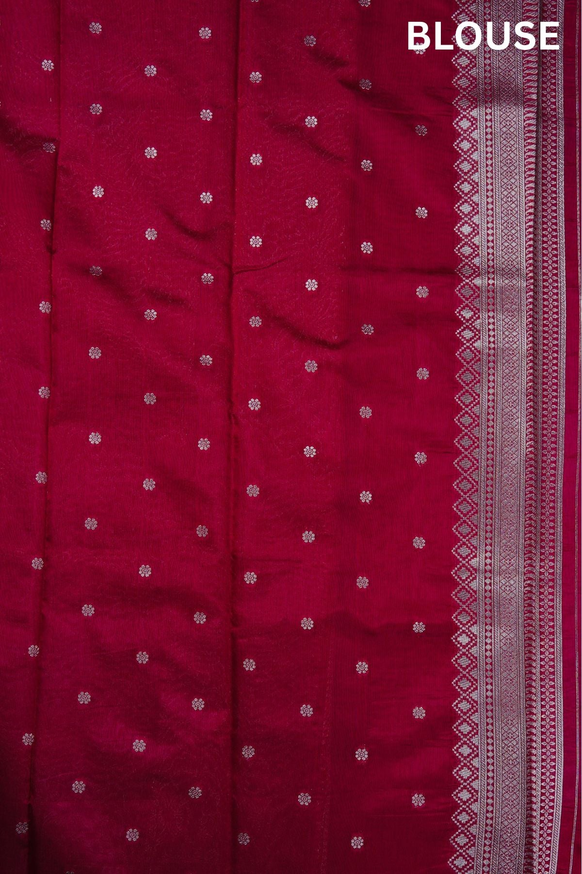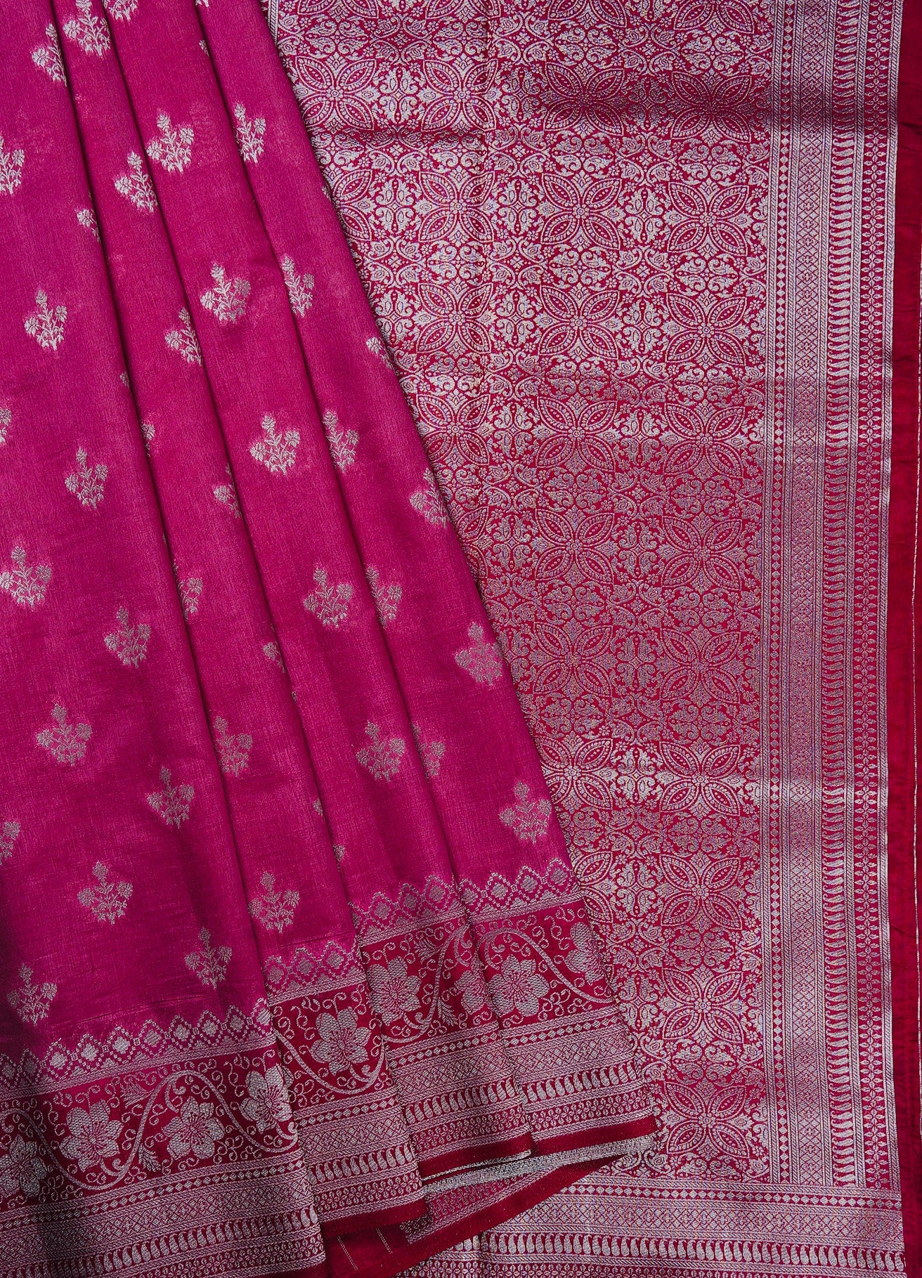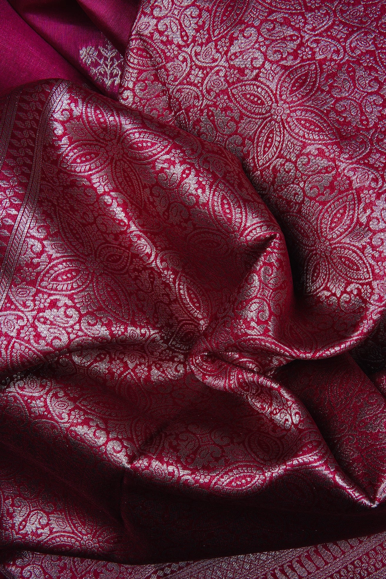 Rouge semi tussar saree with branched plant motifs woven in silver zari. The border starts off with a continuous diamond pattern, followed by a band of kodi patterns, diamond grids, mango bhuttas and floral motifs woven in silver zari. The pallu is a rich expanse of numerous intricate motifs with large motifs showing four connected petals forming a flower amongst the other smaller patterns woven in silver zari on a dark red base. The saree has a dark red blouse with small flower motifs and the same border woven in silver zari.