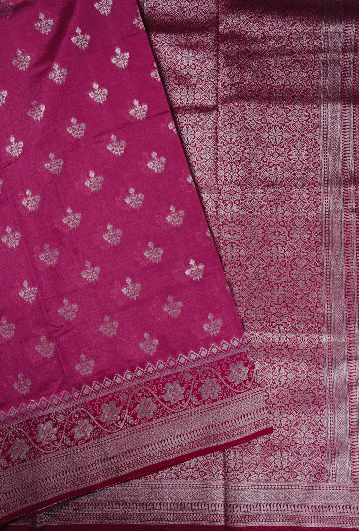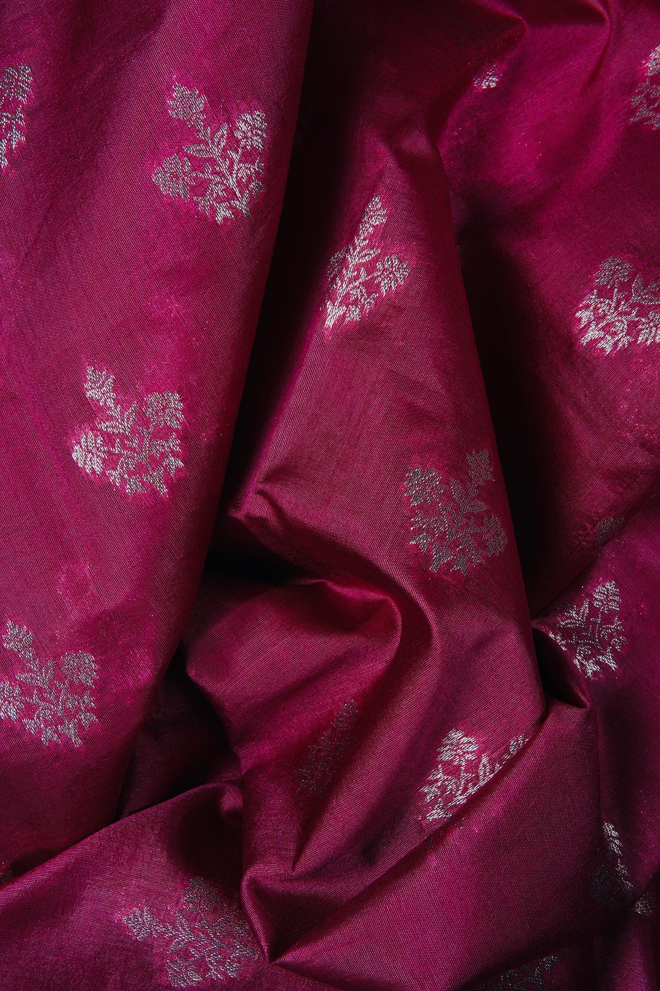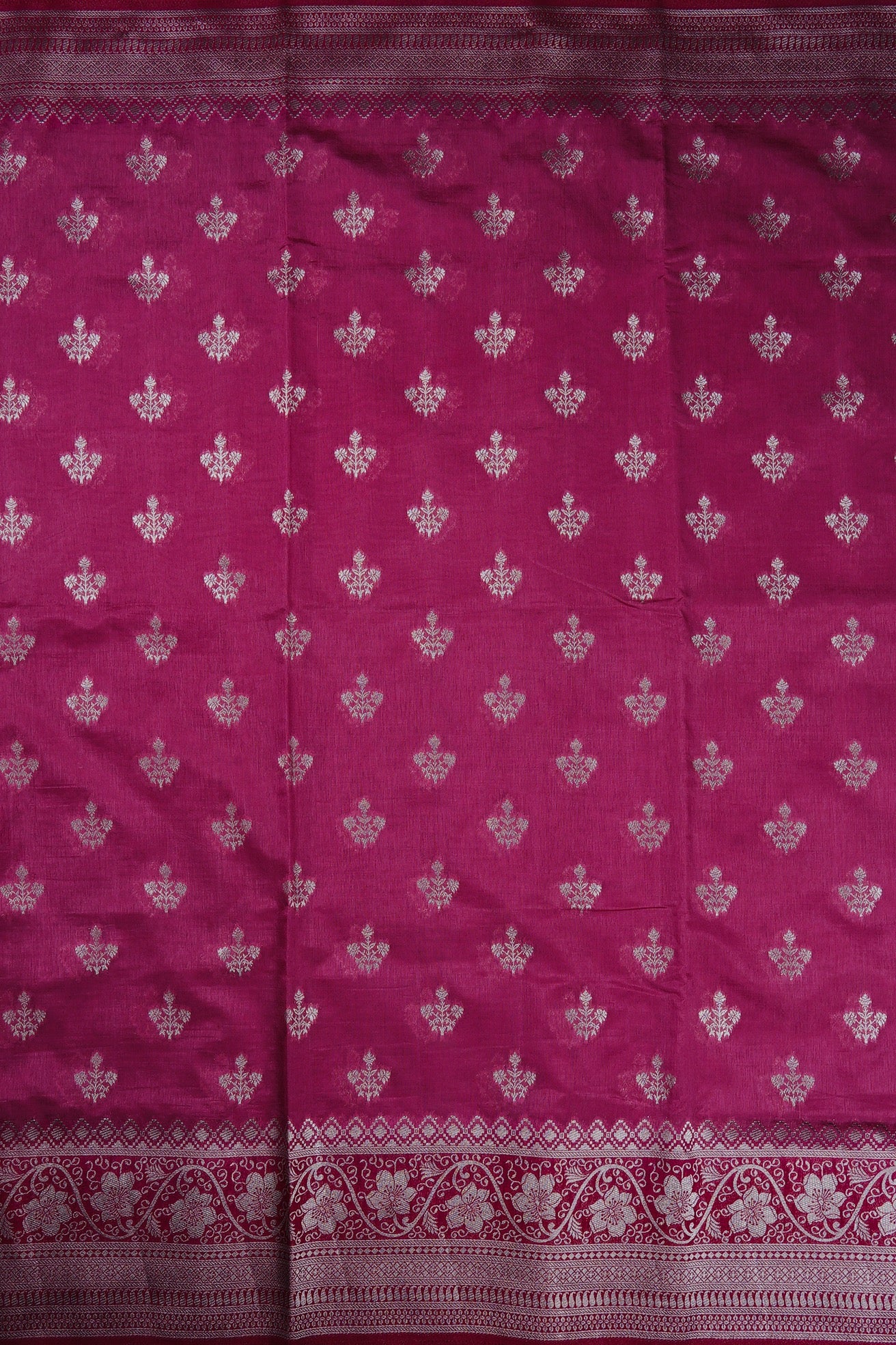 Rouge semi tussar saree with branched plant motifs woven in silver zari. The border starts off with a continuous diamond pattern, followed by a band of kodi patterns, diamond grids, mango bhuttas and floral motifs woven in silver zari. The pallu is a rich expanse of numerous intricate motifs with large motifs showing four connected petals forming a flower amongst the other smaller patterns woven in silver zari on a dark red base. The saree has a dark red blouse with small flower motifs and the same border woven in silver zari.