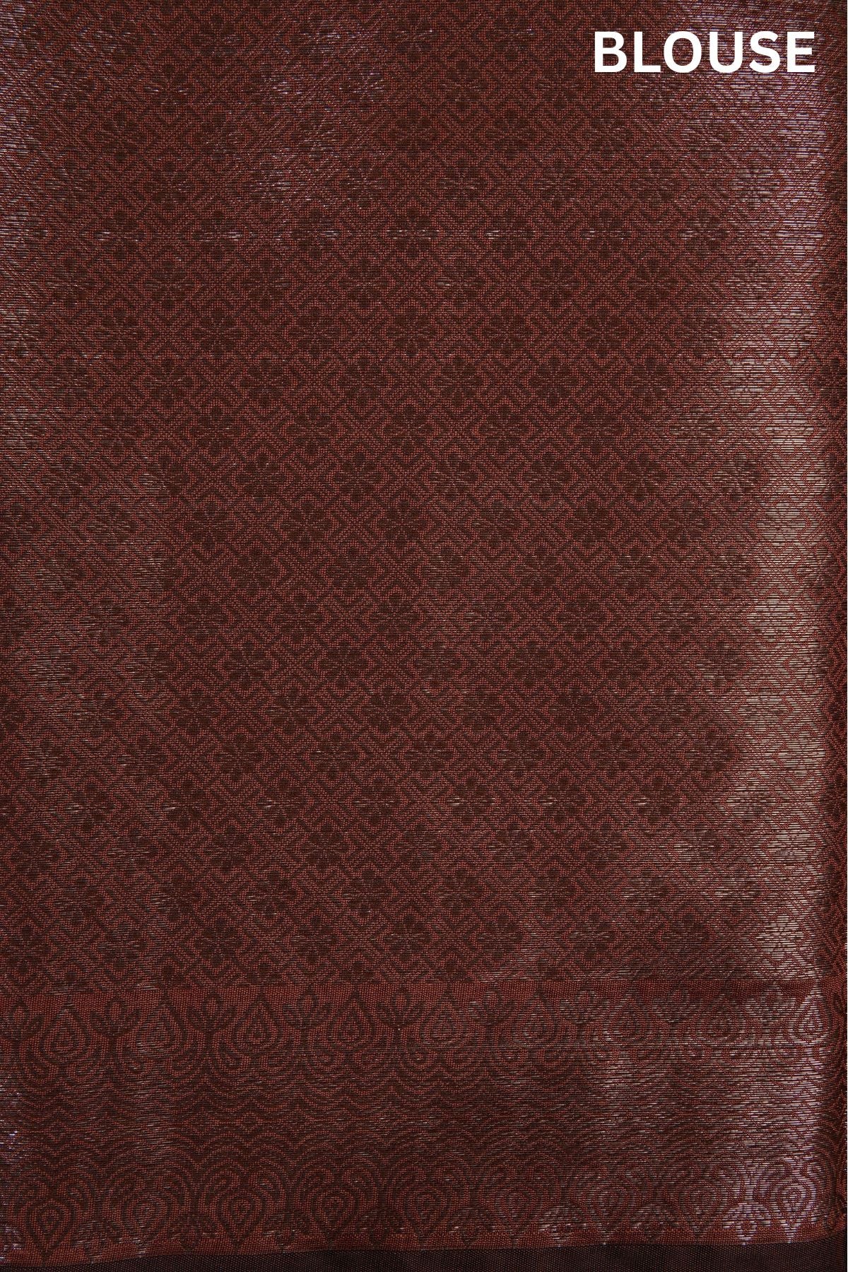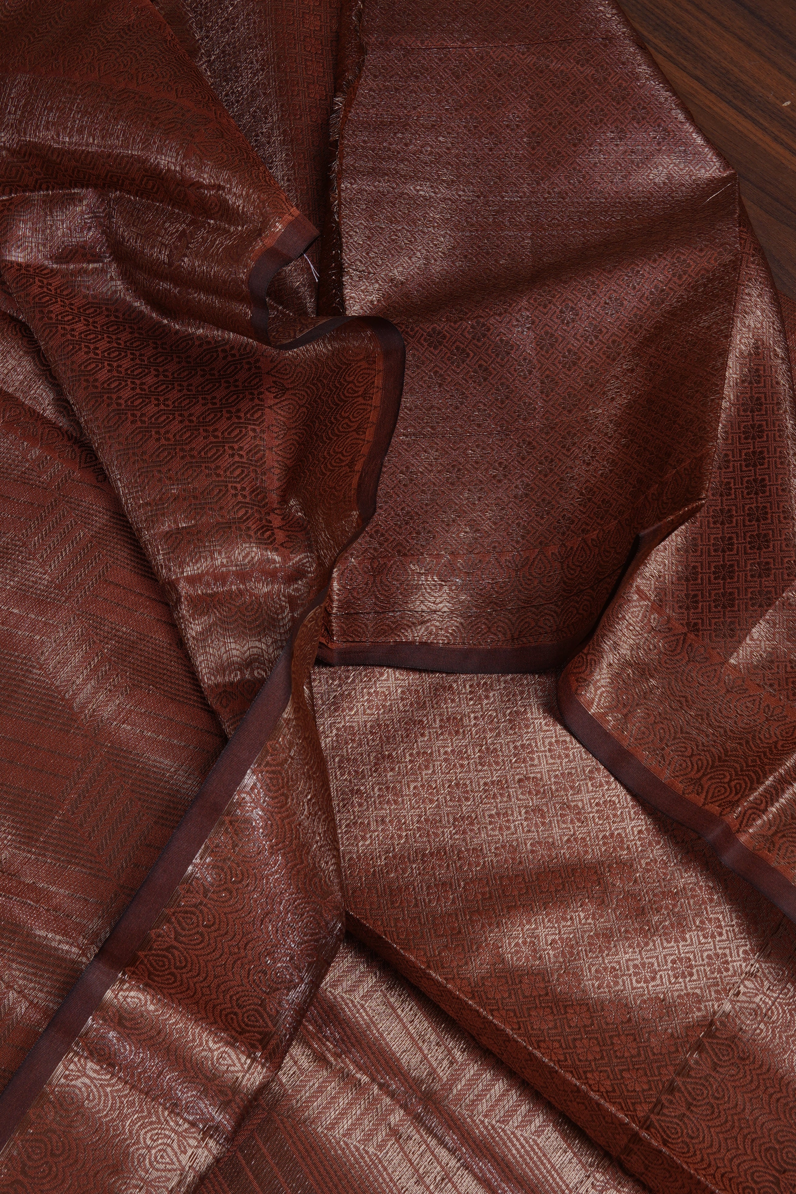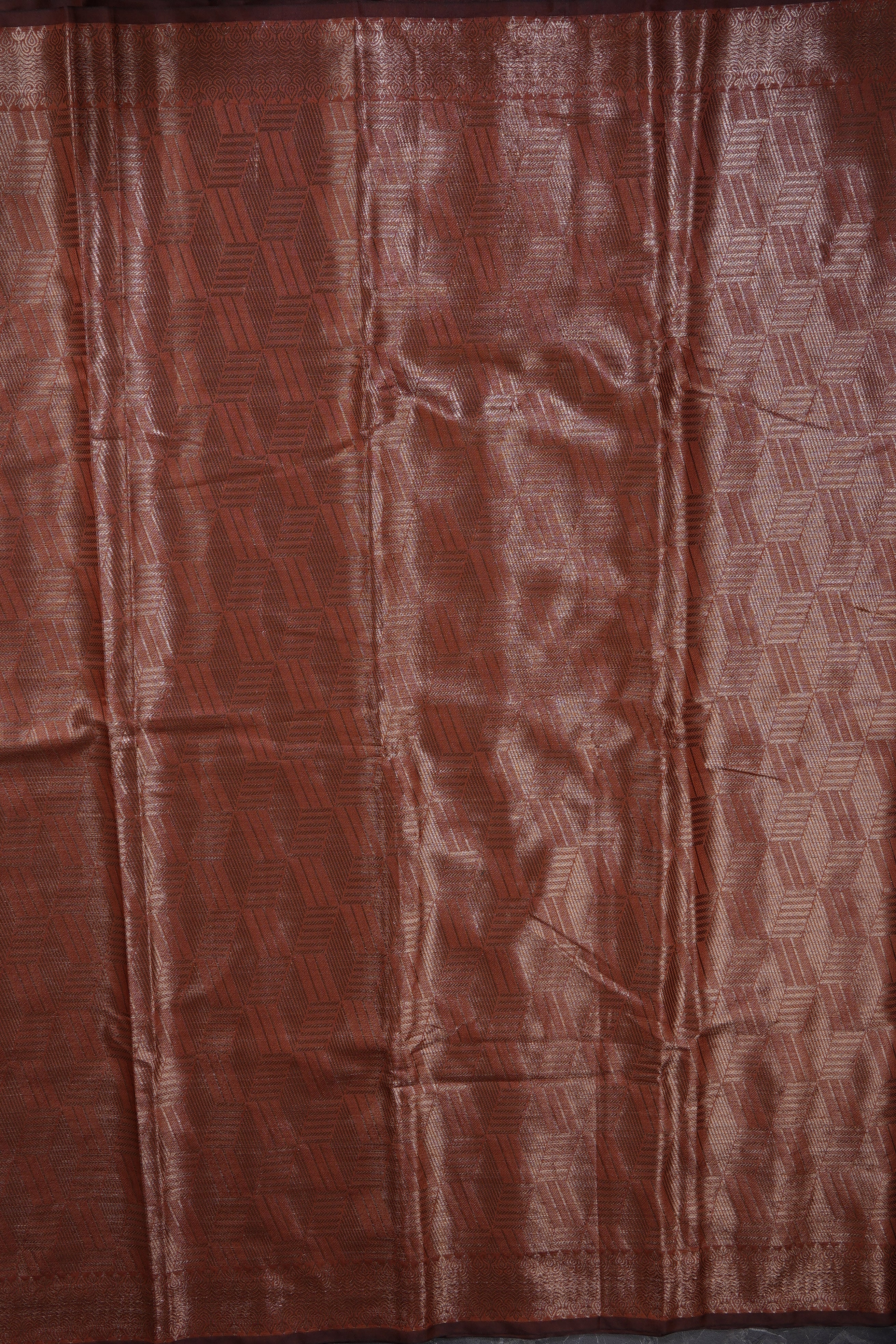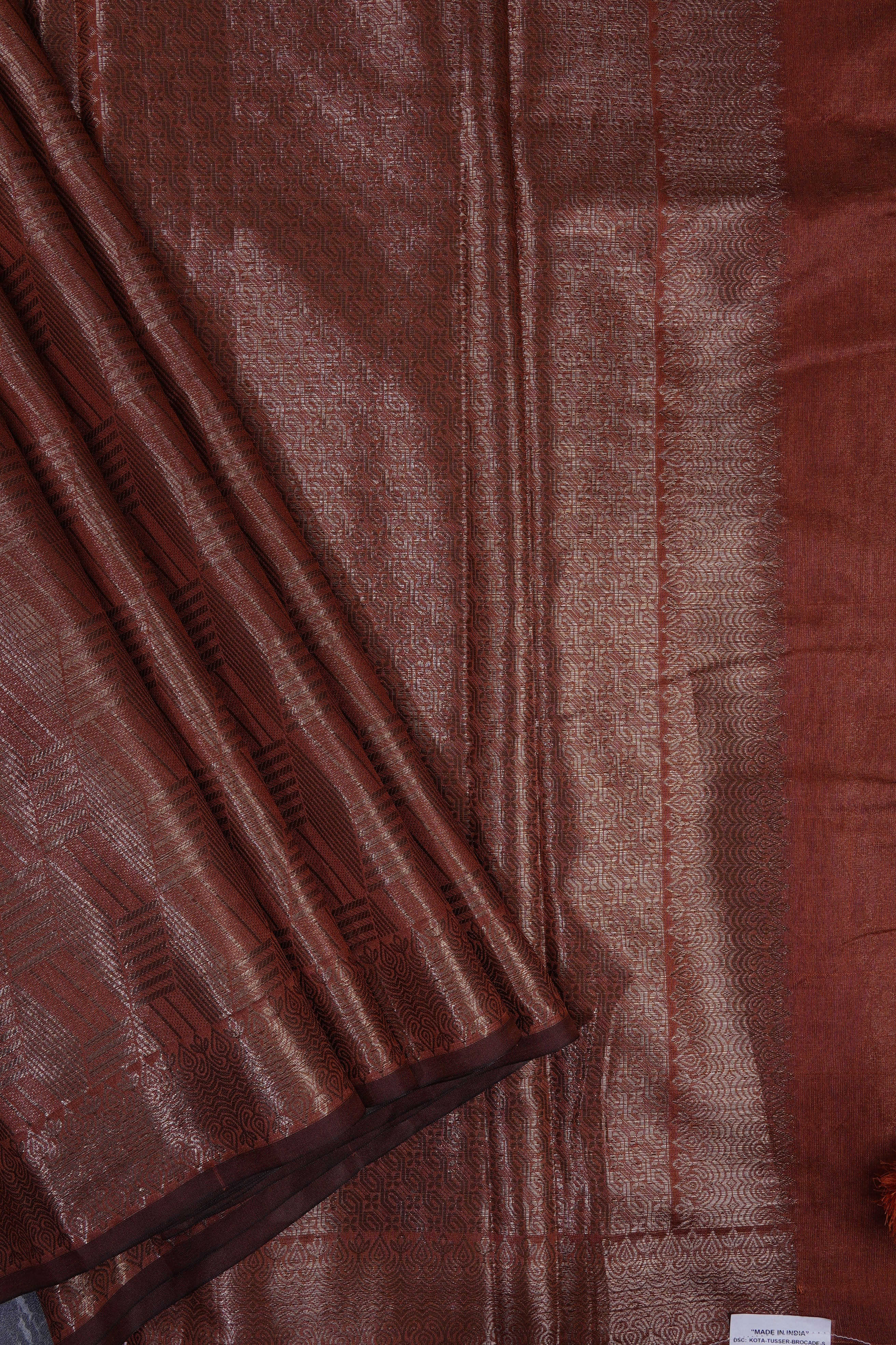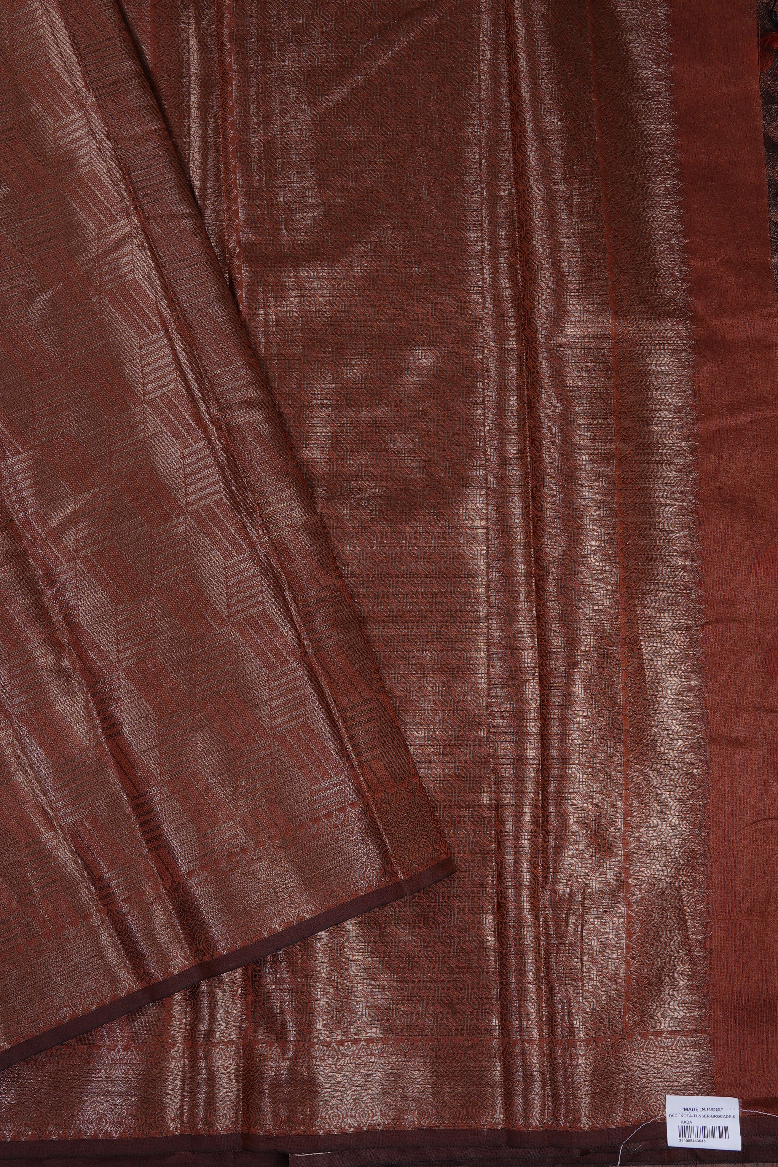 Previous NextSienna semi tussar zari type saree with the body adorned with bold chevron-inspired geometric motifs and interlocking angular patterns. The border ha flowy and continuous floral motifs woven in zari. The pallu has an intricate lattice pattern with floral motifs highlighted in zari, framed by ornate creeper borders from the body. The saree has a sienna blouse with diamond frames enclosing small floral bhuttas and the same border.