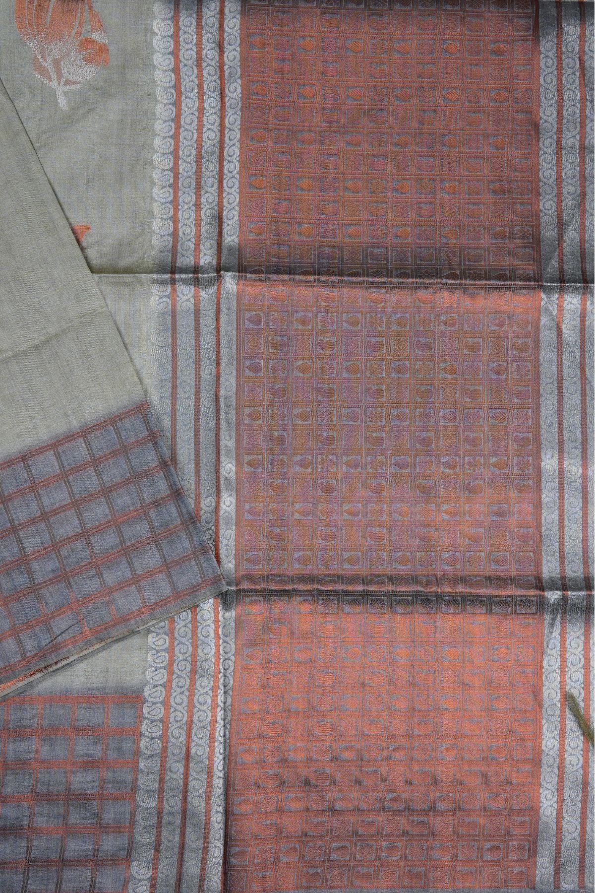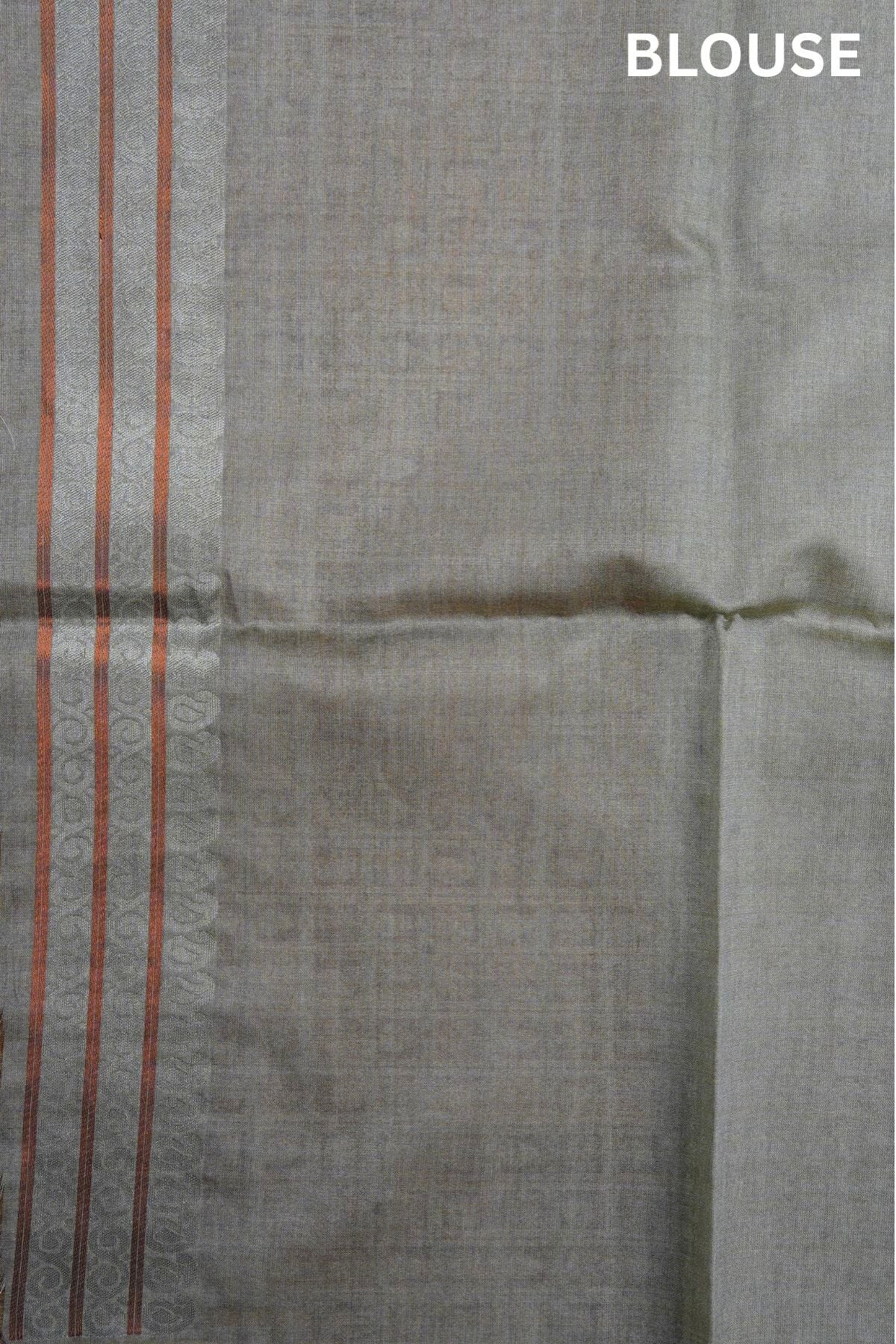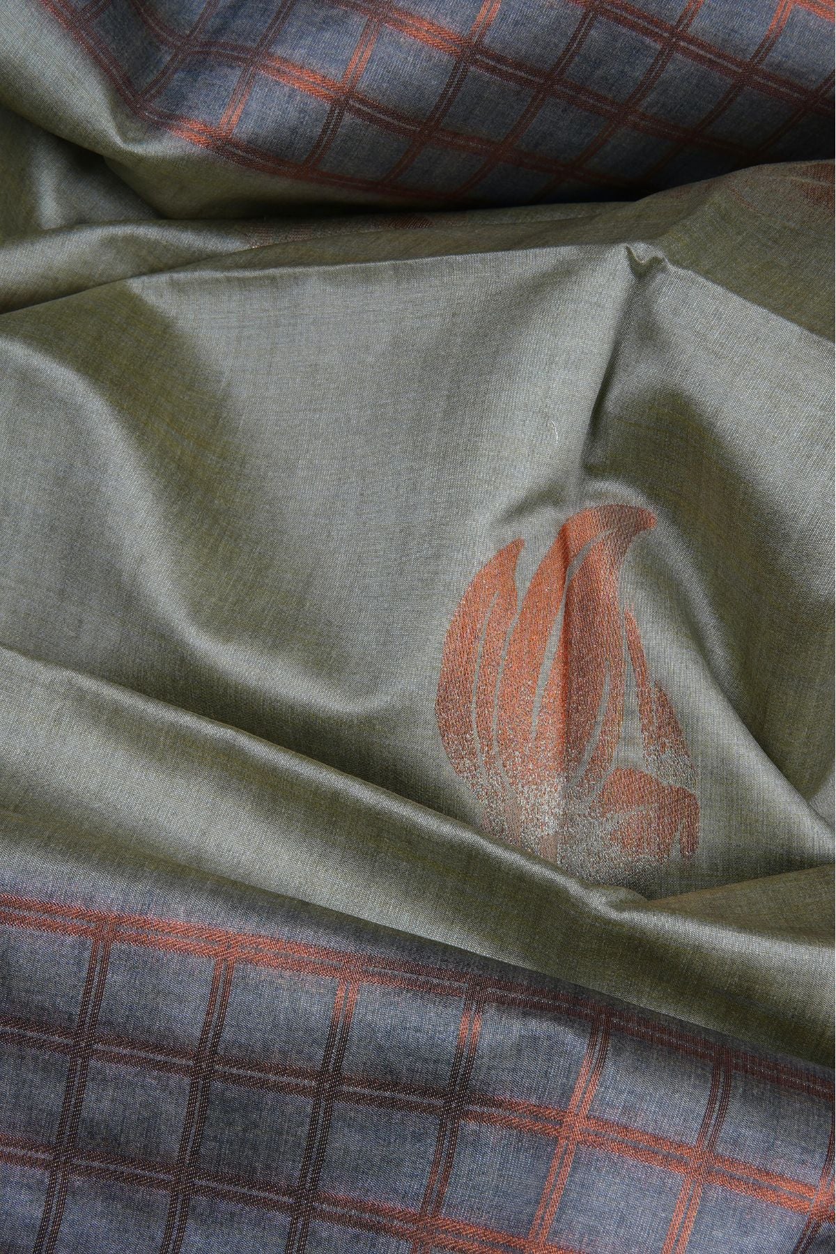 Previous NextA silver gray semi tusser zari type saree with stylised leaf motifs woven in copper zari. The saree gradates into a dusty grey border with copper checks woven throughout. It has a rich pallu with continuous checks, each box enclosing small chakram bhuttas and mango bhuttas alternatively woven in copper zari, bordered by arrays of waves woven in silver zari. The blouse is a plain dusty gray blouse with thin strips of bhutaas and lines woven in silver and copper zari at the border.