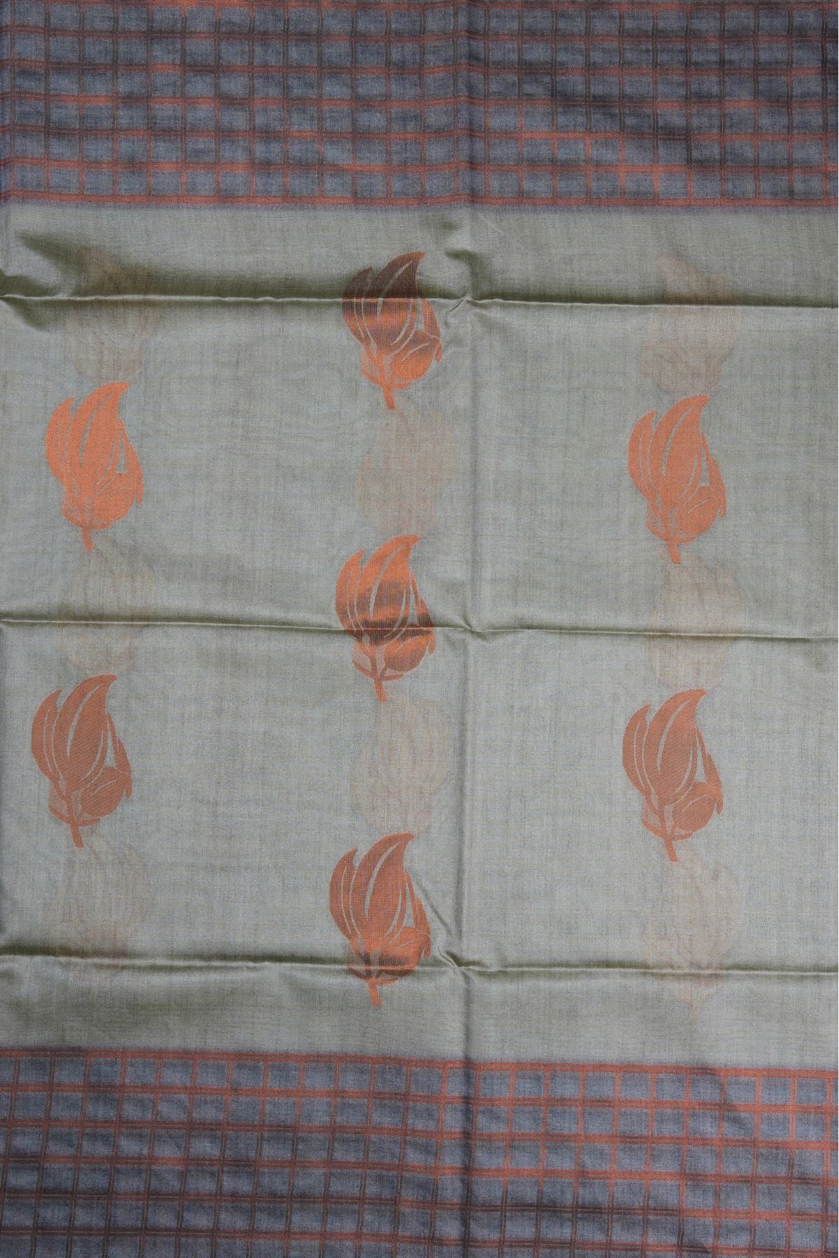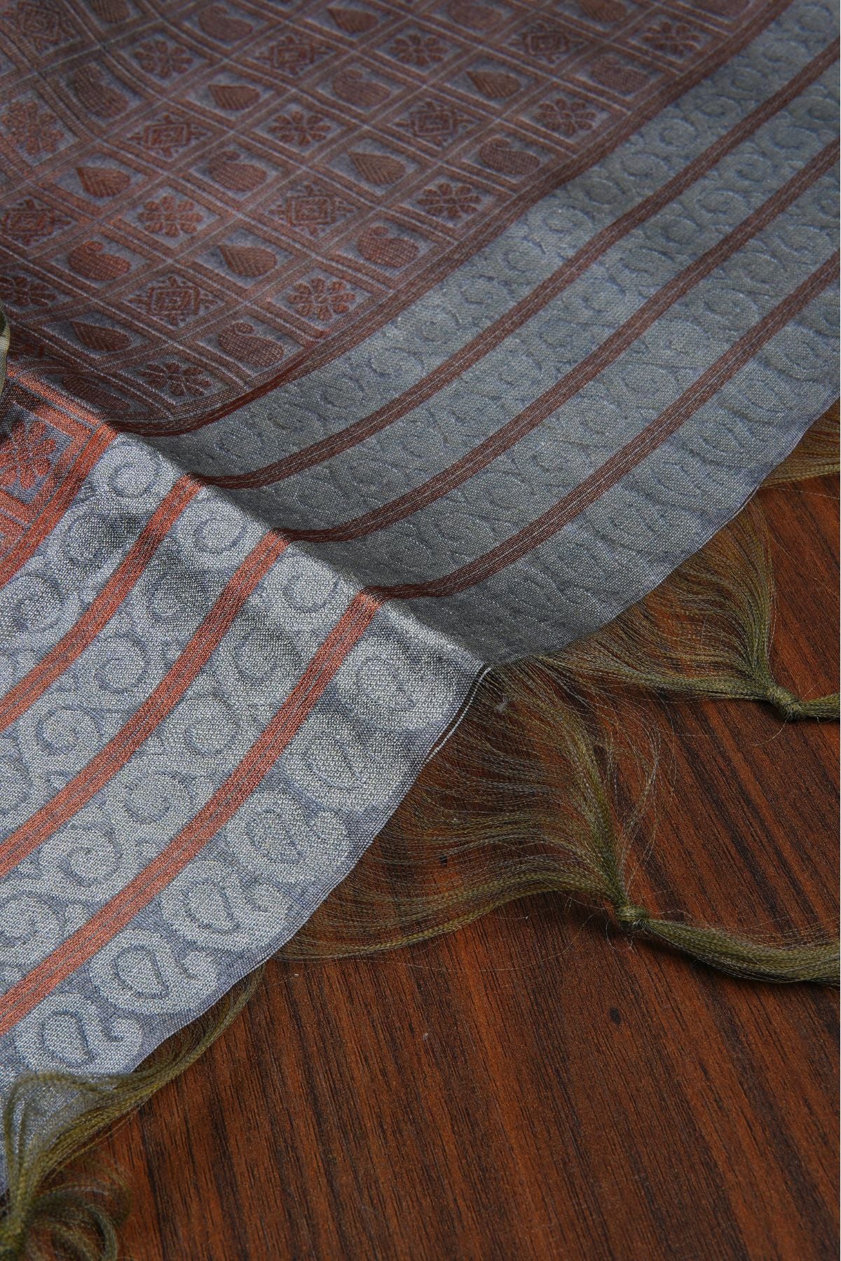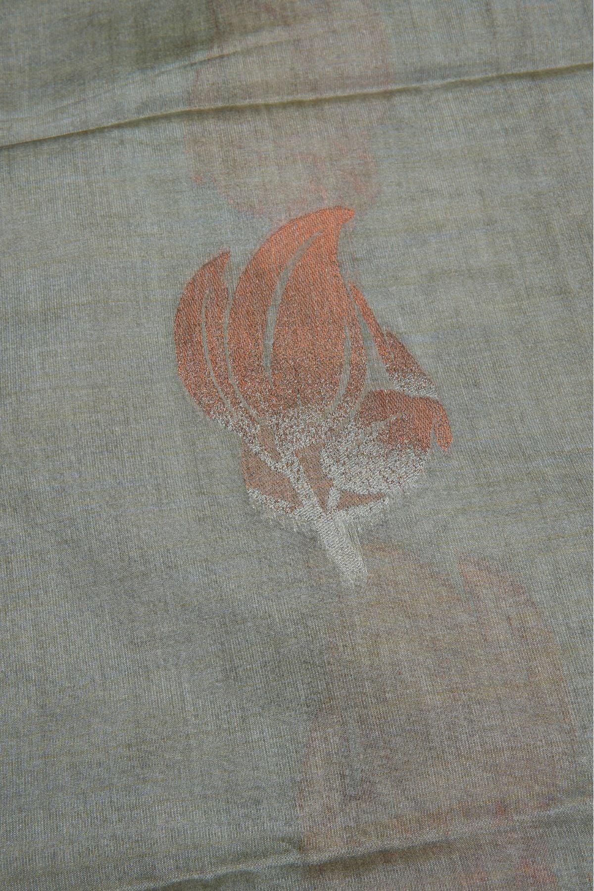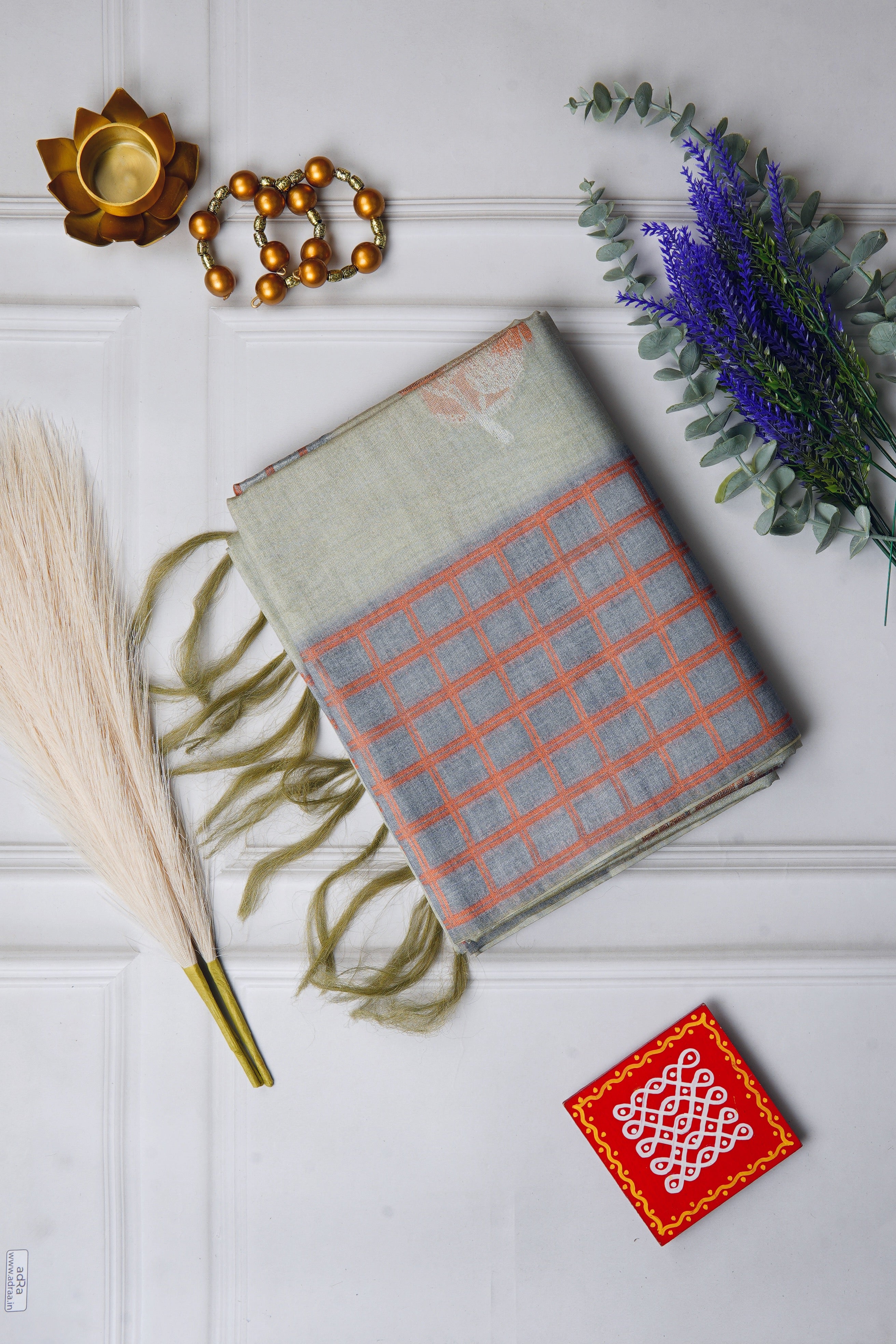 Previous NextA silver gray semi tusser zari type saree with stylised leaf motifs woven in copper zari. The saree gradates into a dusty grey border with copper checks woven throughout. It has a rich pallu with continuous checks, each box enclosing small chakram bhuttas and mango bhuttas alternatively woven in copper zari, bordered by arrays of waves woven in silver zari. The blouse is a plain dusty gray blouse with thin strips of bhutaas and lines woven in silver and copper zari at the border.